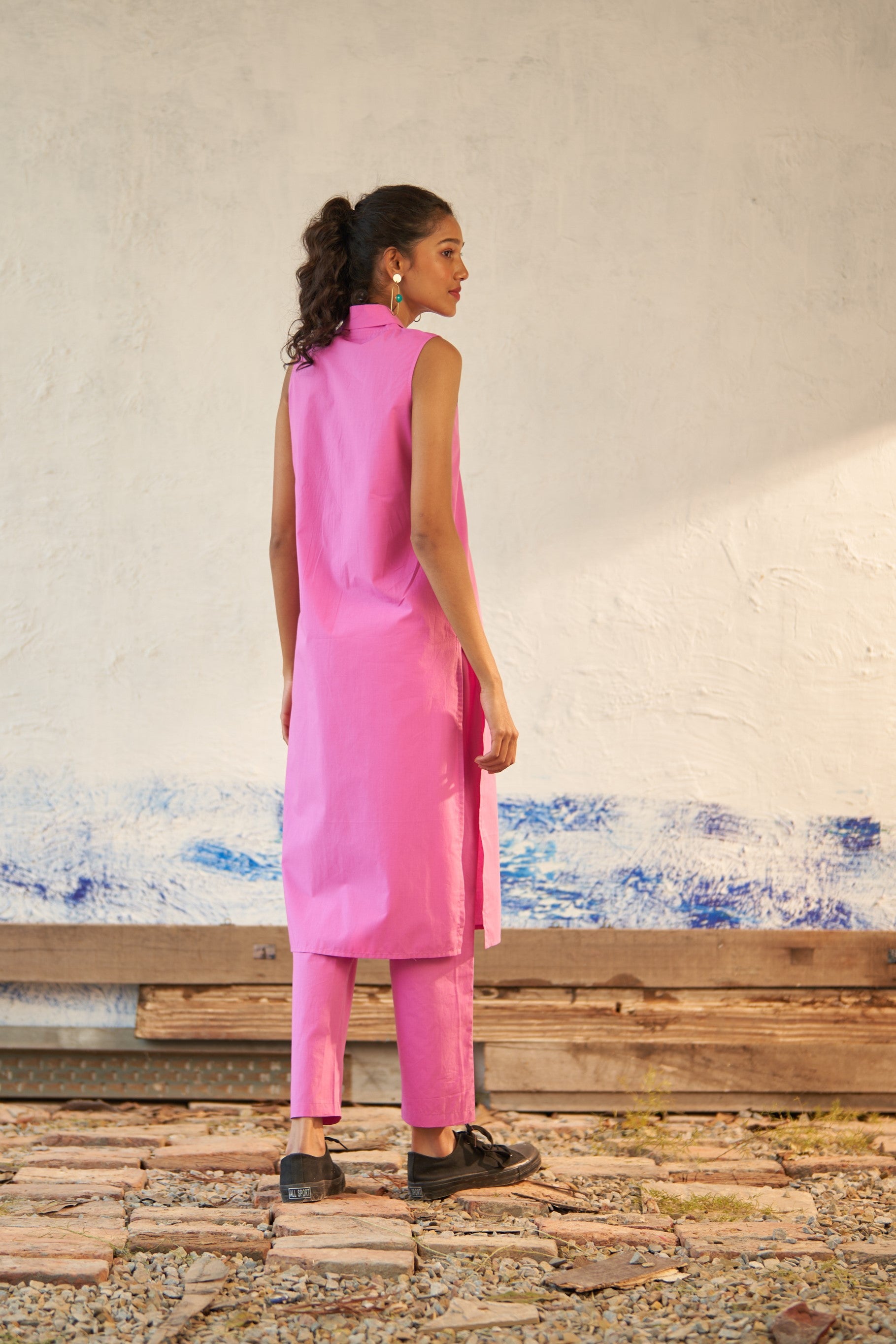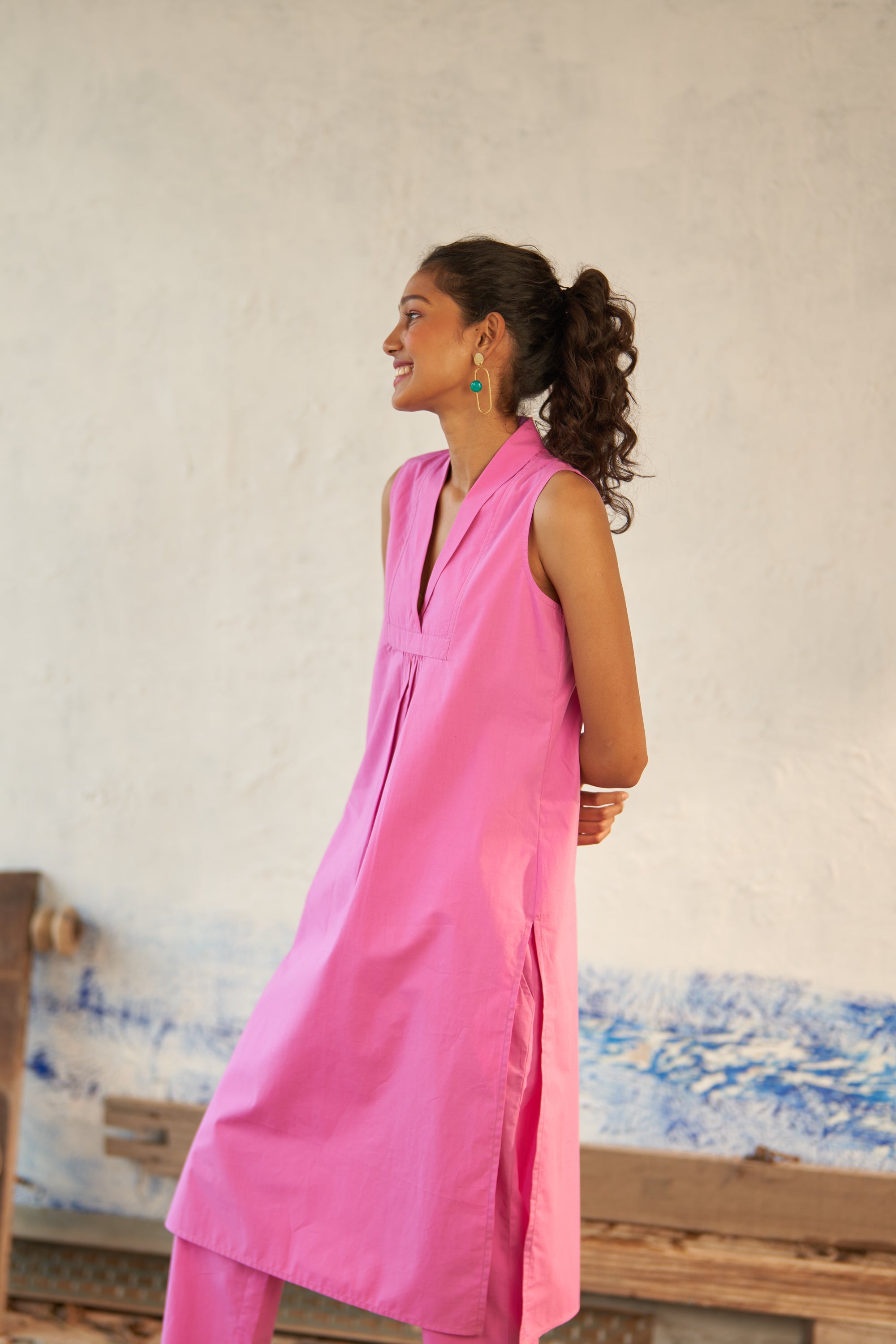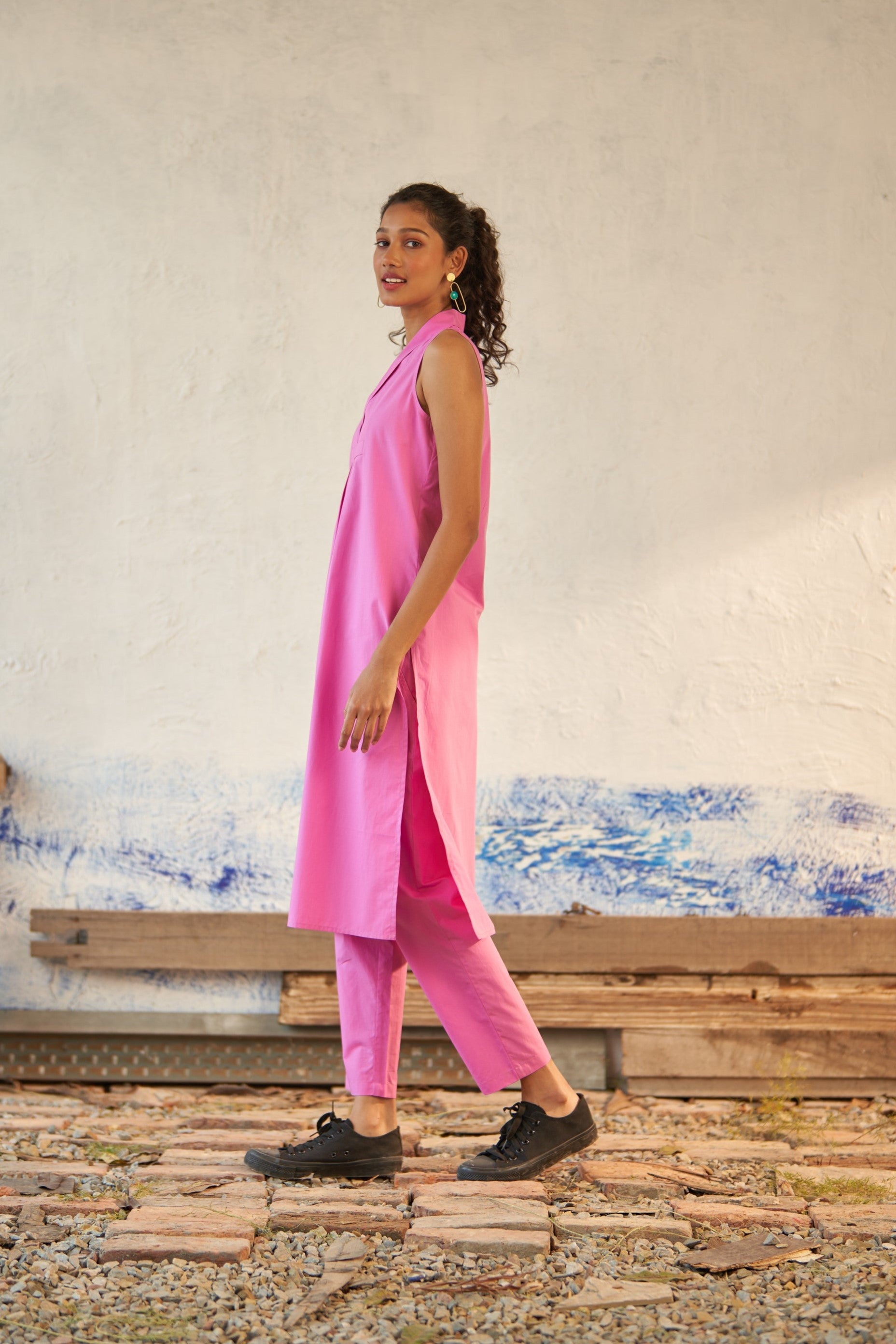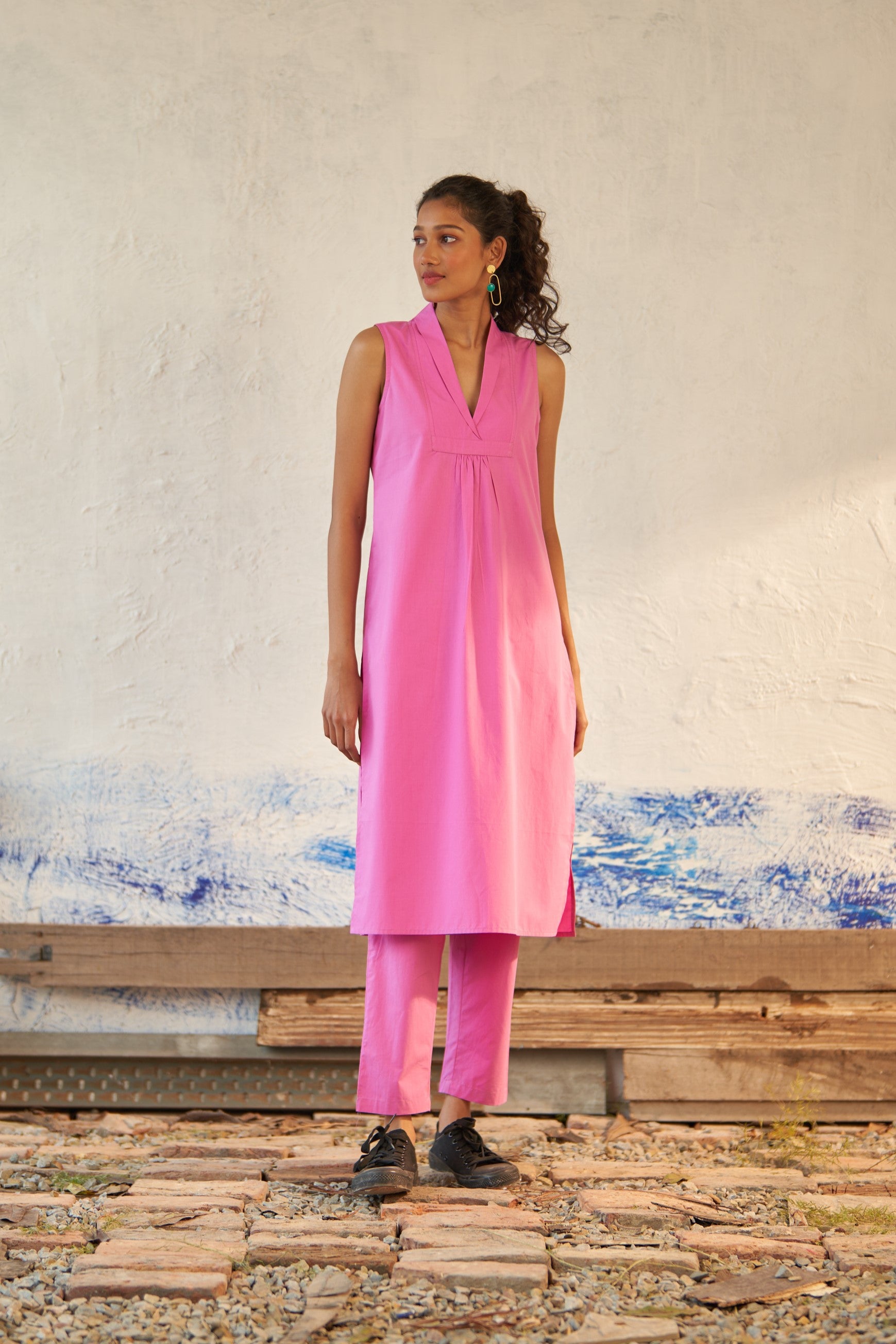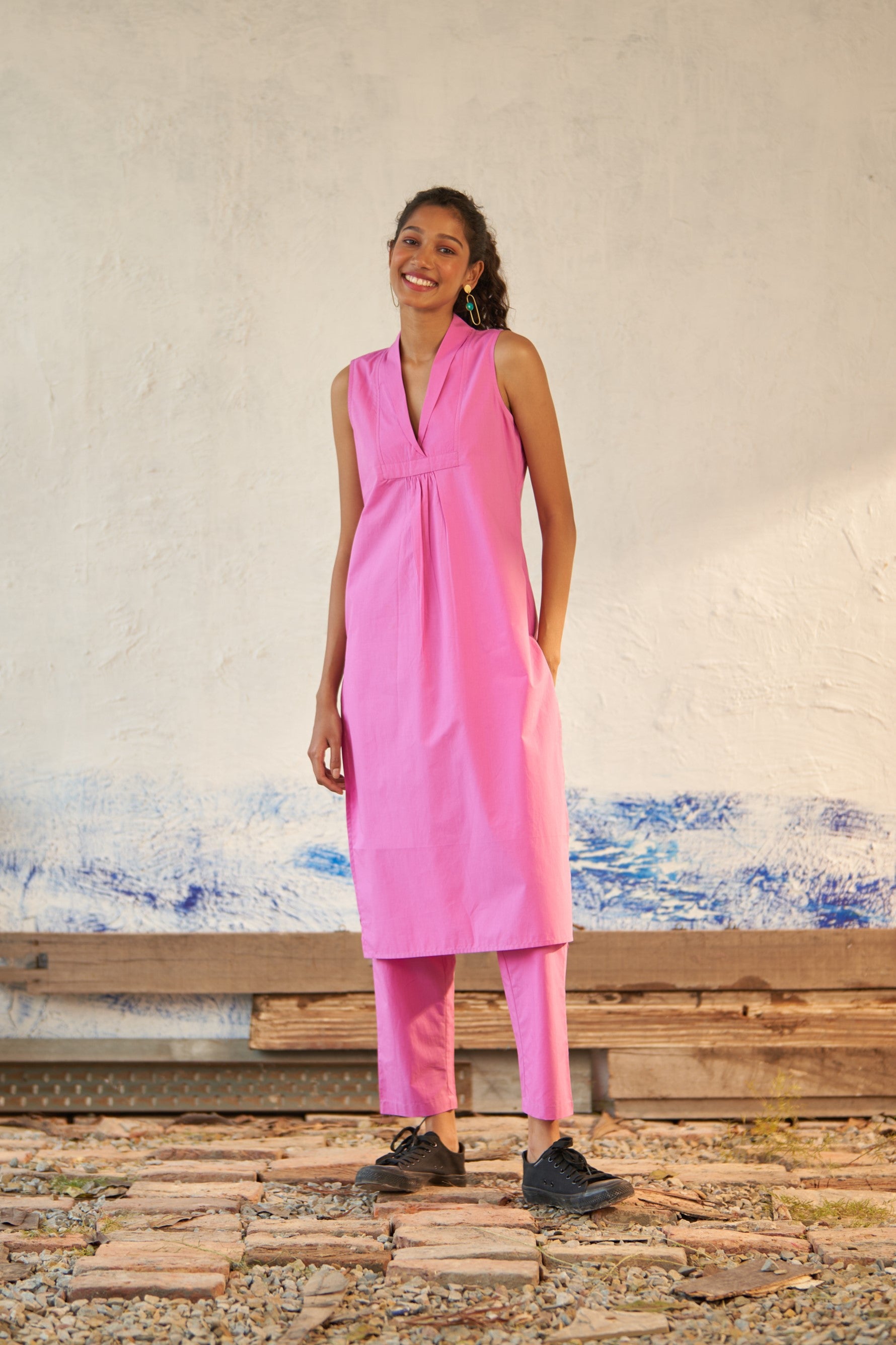 Feel sophisticated in our sleeveless Kurta with a stylish folded collar that creates a V neckline with minimal gathers. Crafted in textured cotton in a brownish-pink hue, the dress is tailored in a straight line, offering a slim fit. It is paired with matching straight pants.