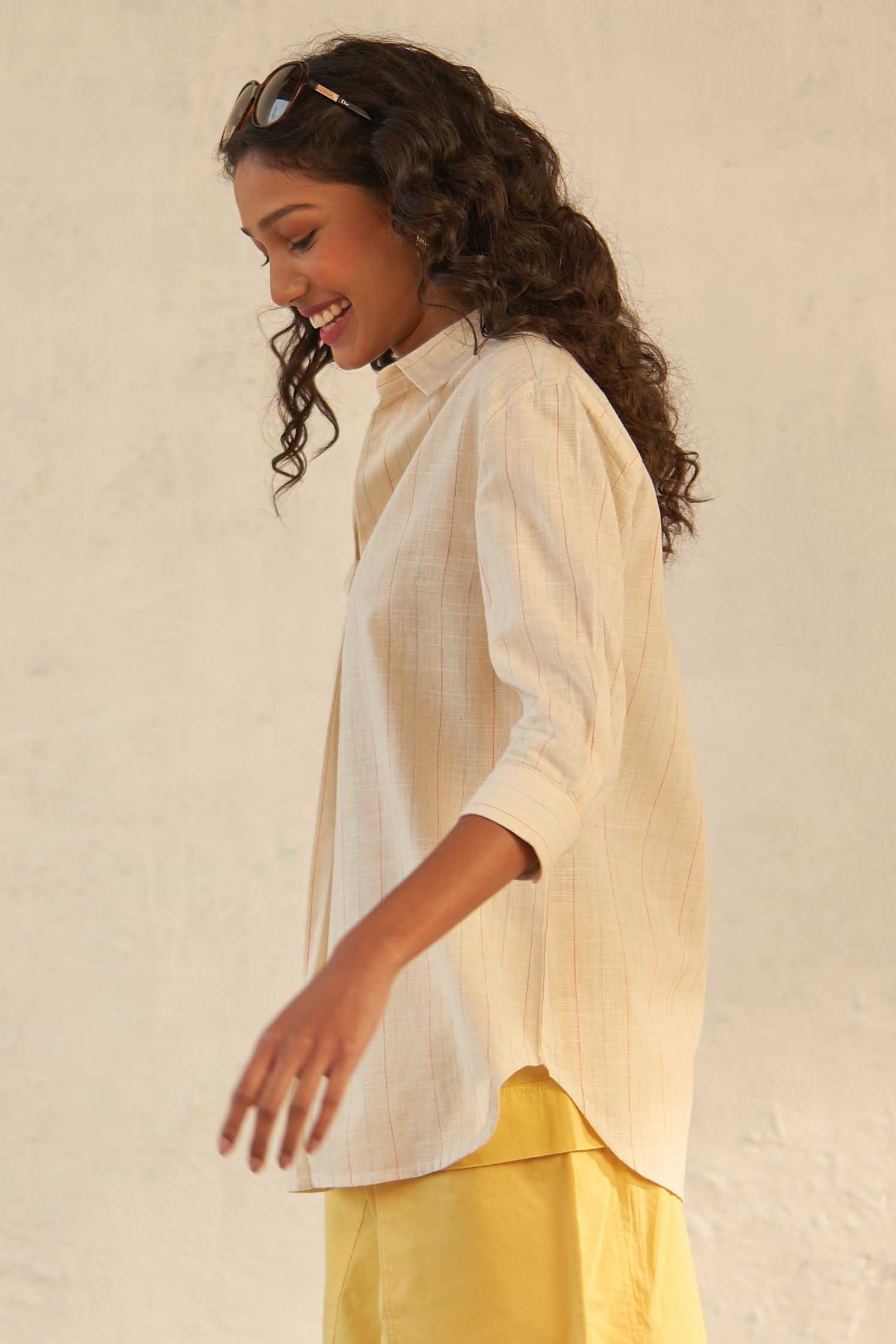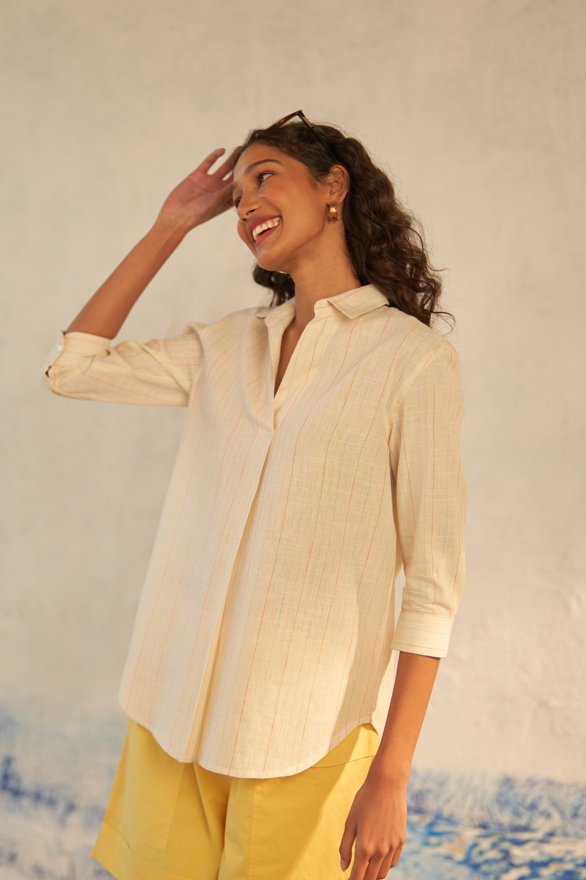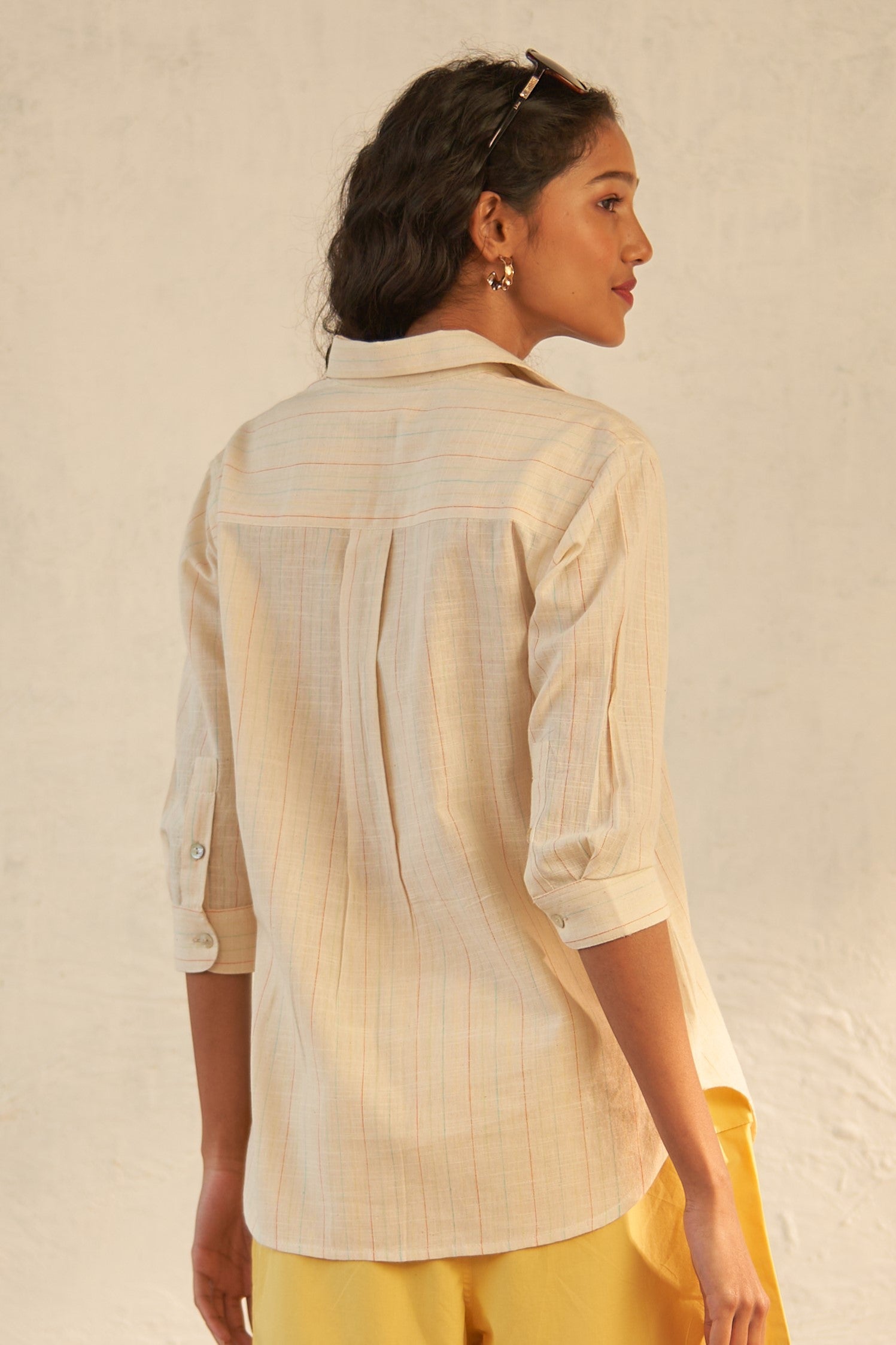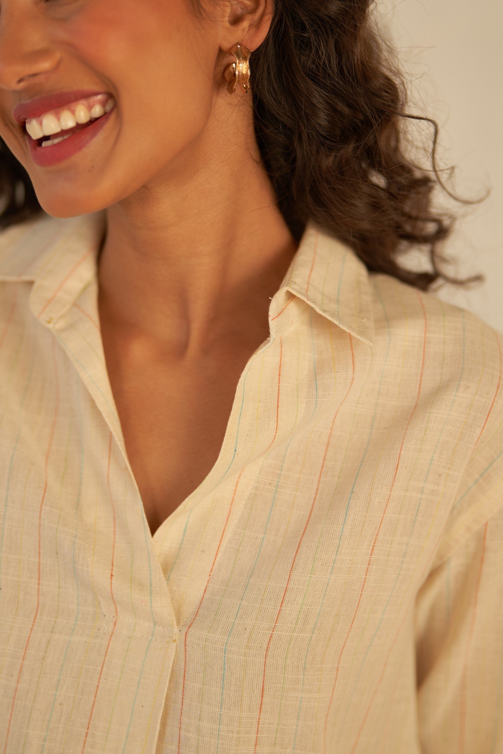This tailored silhouette, featuring a unique front box pleat detail, exudes sophistication and modernity, making it perfect for stepping out into beautiful weather. Crafted from textured cotton, its off-white color with subtle multicolor stripes offers a breezy silhouette that adds an intriguing touch for any outing.