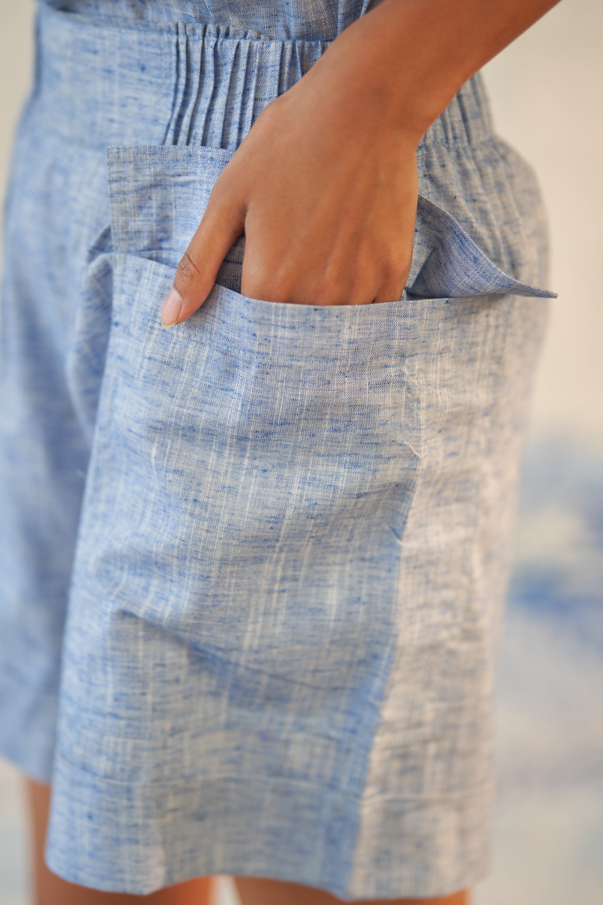 Step into casual comfort with these loose shorts, designed for ease with a half elastic waistband and practical flap pockets. Crafted from textured cotton in a delightful blue dash pattern, they offer a pleasing aesthetic and relaxed appeal.