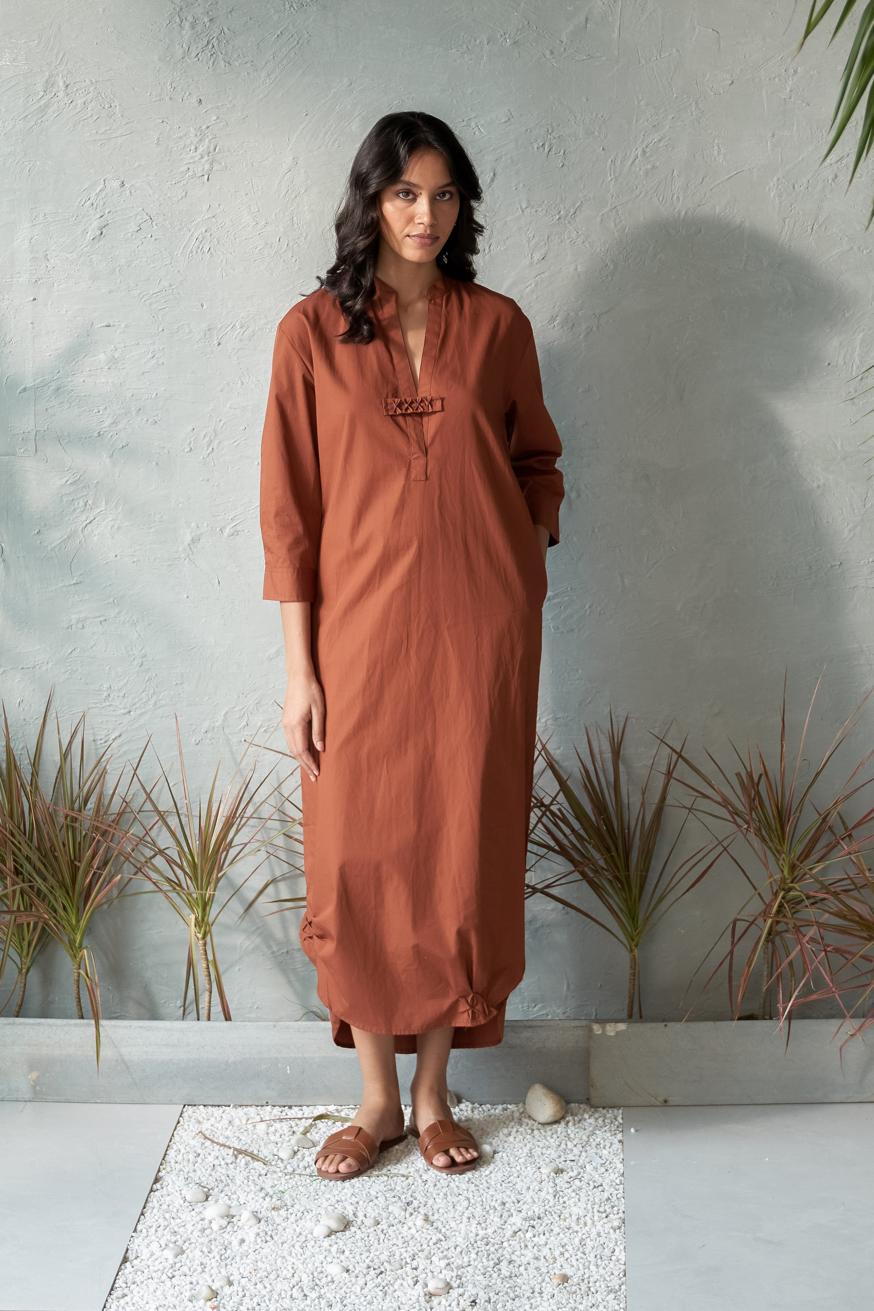 Embrace sophisticated style with our brown cut in a straight fit that exudes classic elegance. The U hemline offers a modern twist, while the smocking detailing at the bottom adds a unique, textured finish. Crafted from high-quality fabric, this dress provides both comfort and a flattering silhouette, perfect for various occasions. Whether you're heading to a casual outing or a semi-formal event, this versatile dress can be styled with heels for a polished look or with flats for a more relaxed vibe.