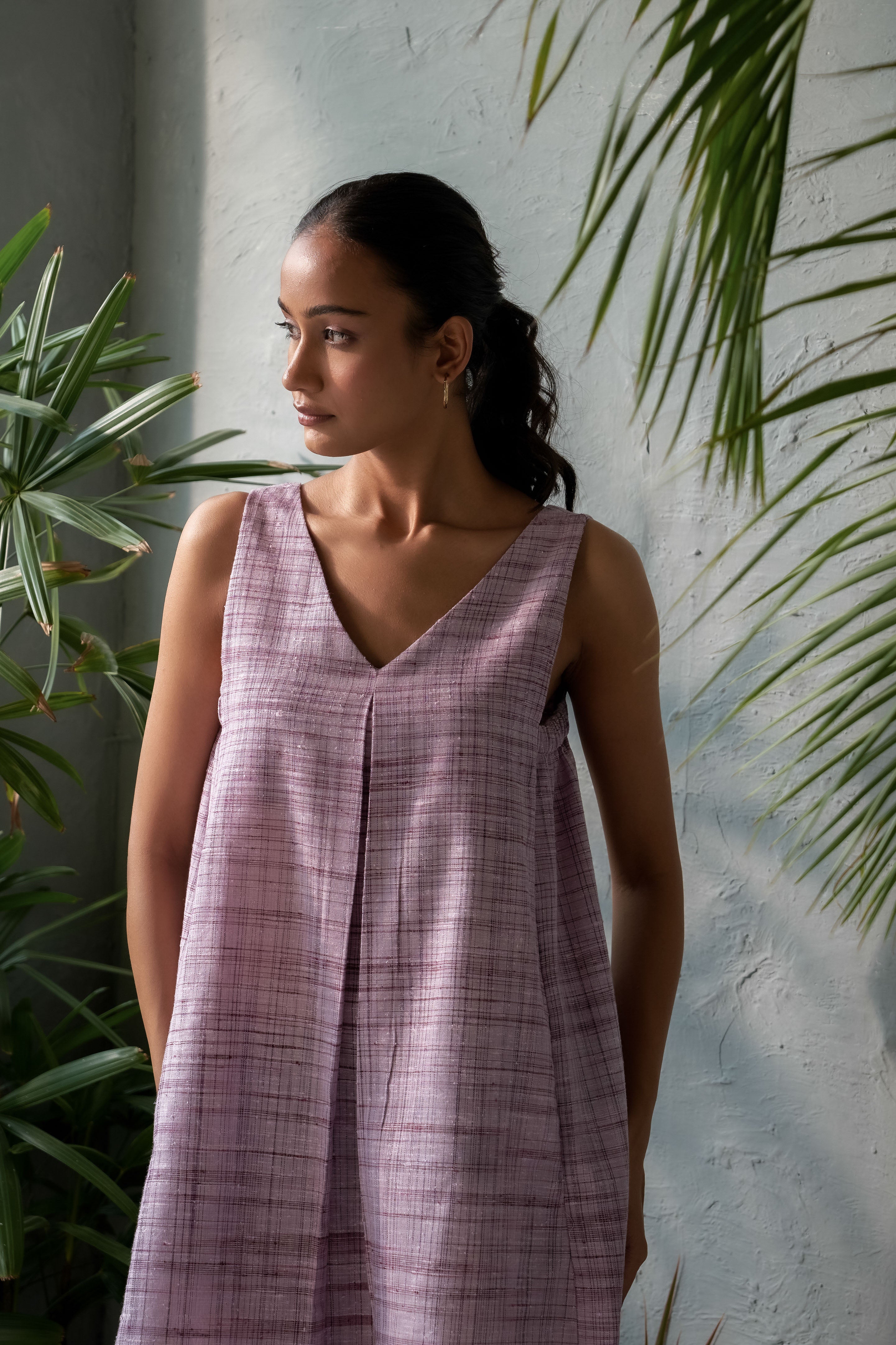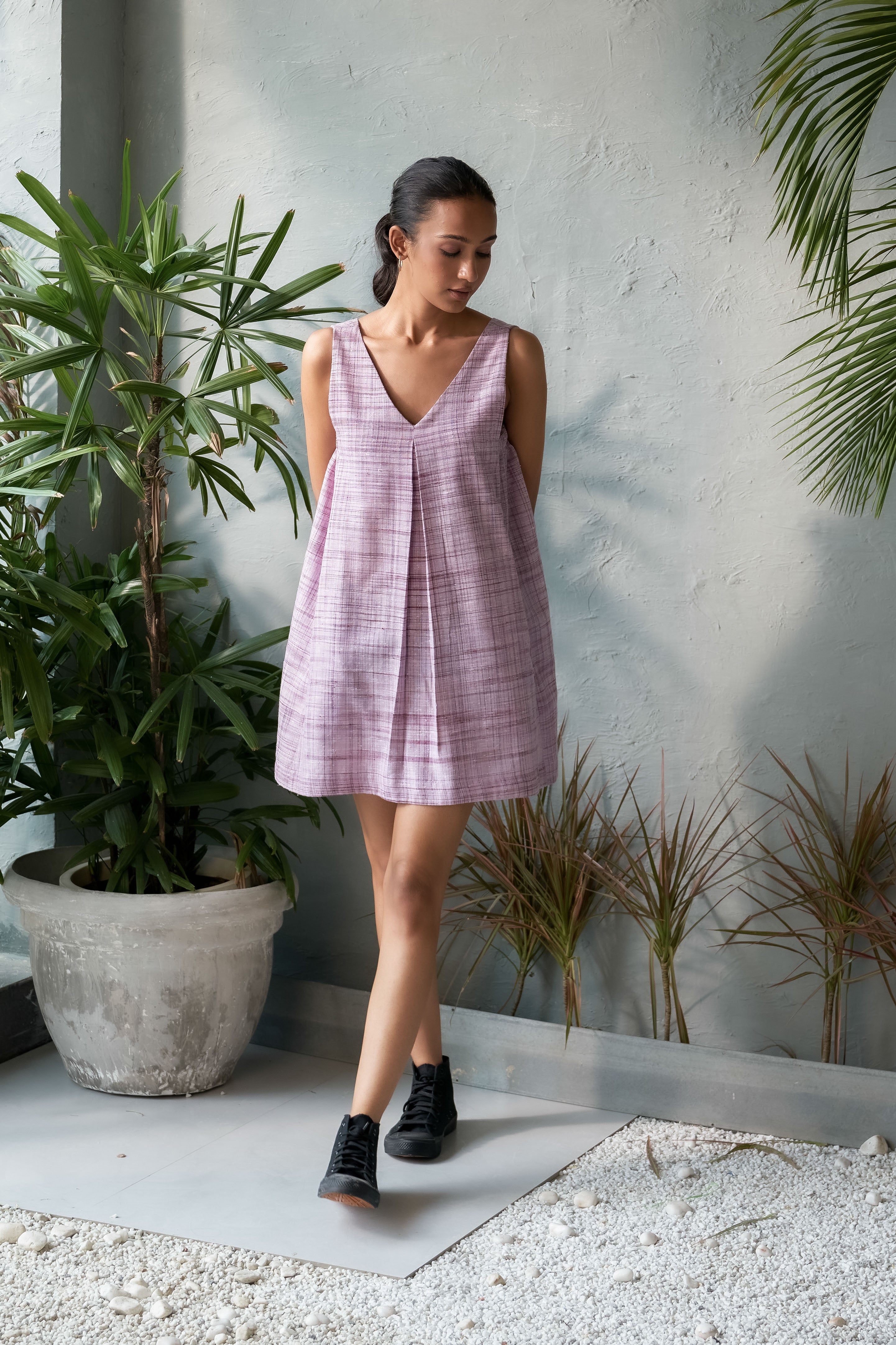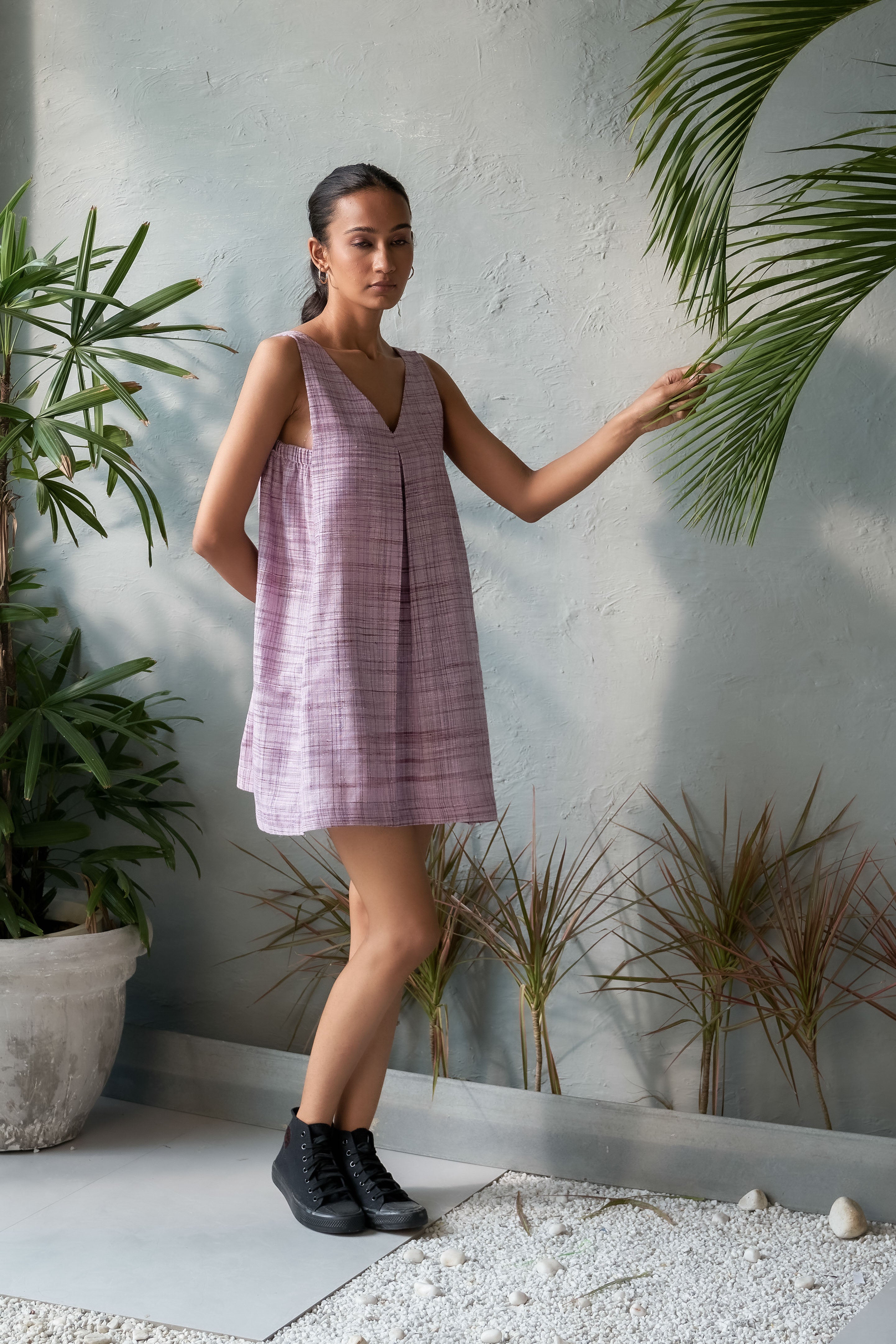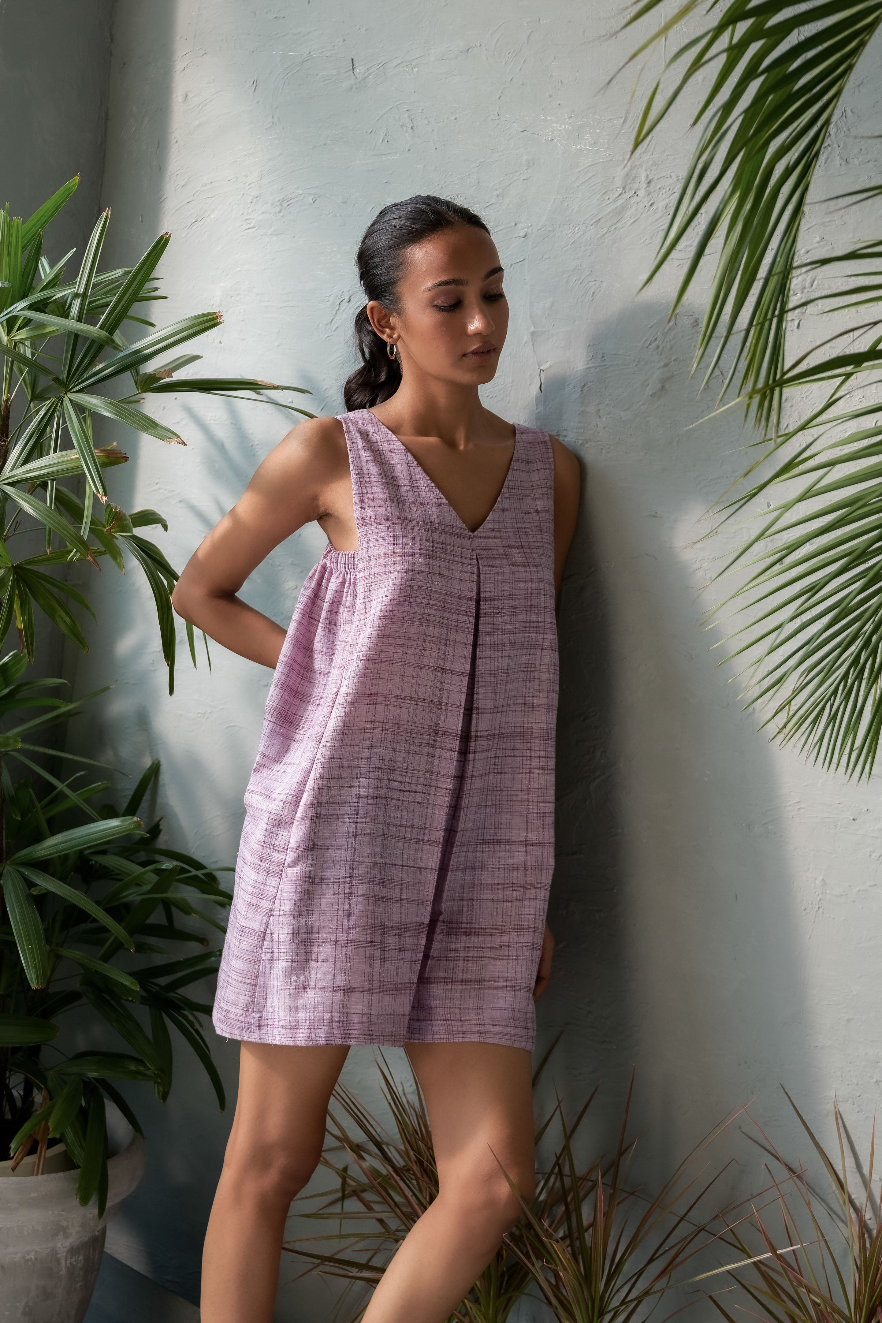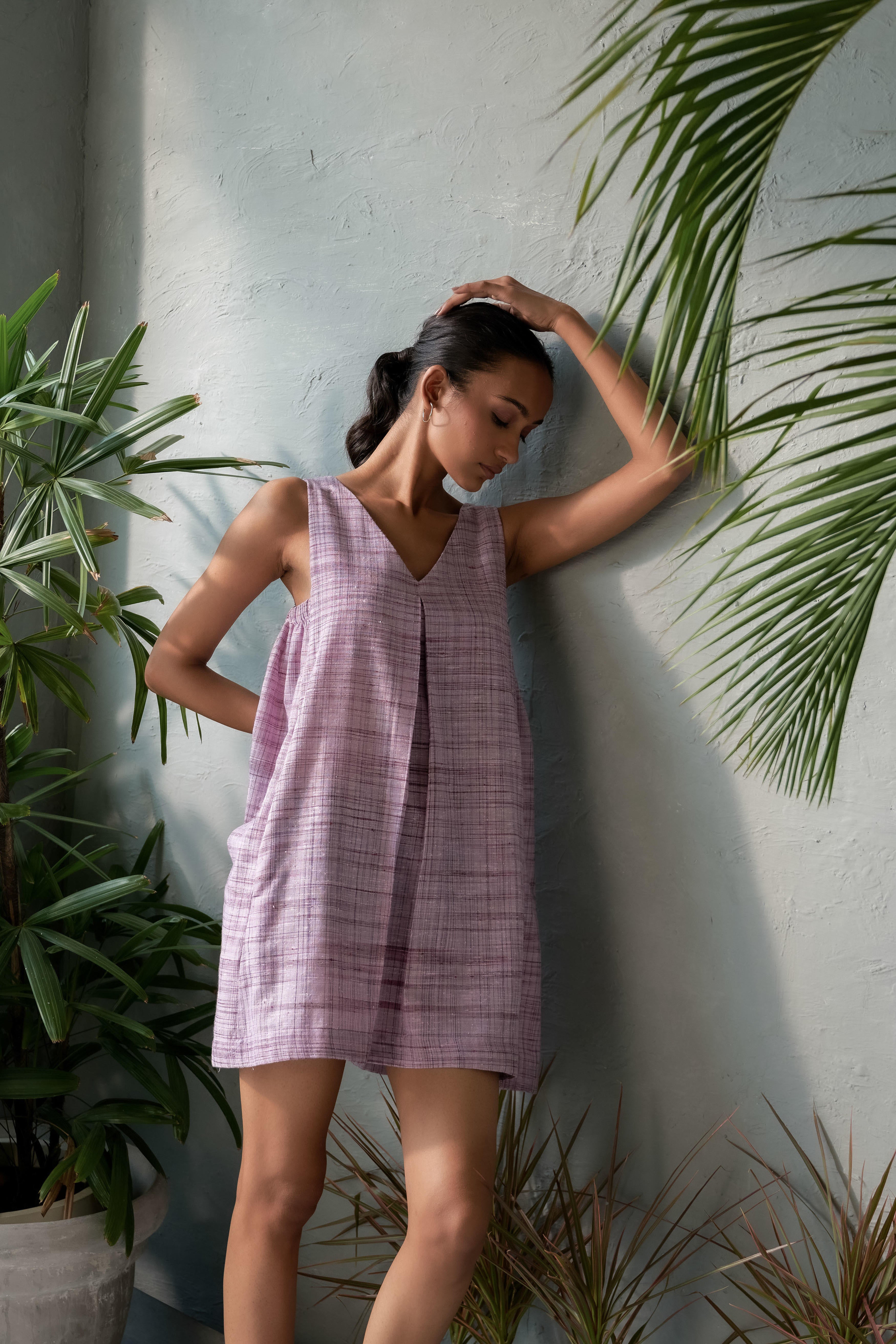 Step into effortless elegance with our Short A-Line Dress featuring a flattering V-neckline at both the front and back. Designed with side elastic for added comfort and flexibility, this dress provides a perfect fit that enhances your silhouette. Crafted from lightweight textured cotton fabric in a beautiful light purple color, it’s perfect for casual outings or dressier occasions. The A-line shape offers a flattering flow, making this dress a versatile addition to your wardrobe