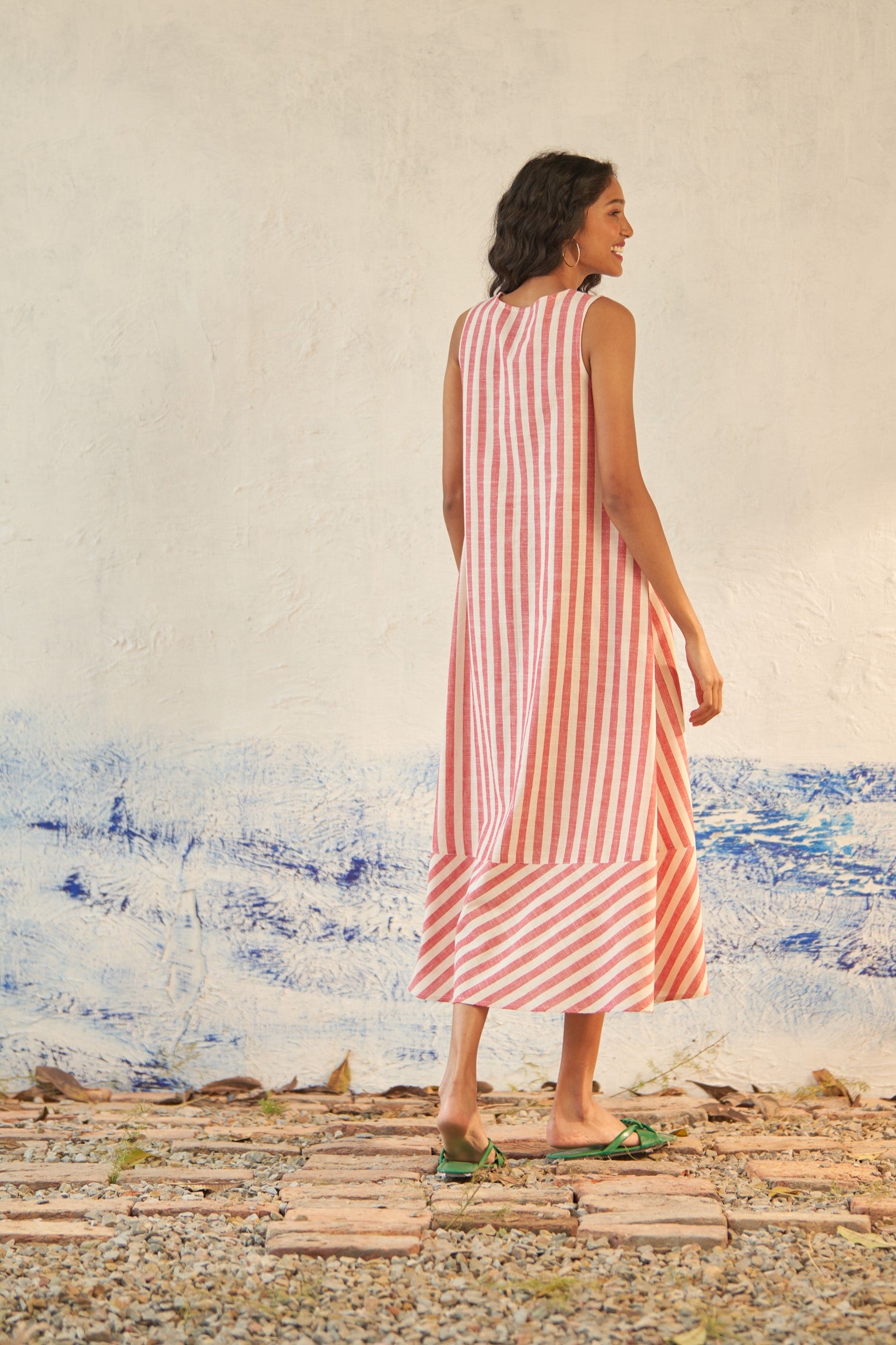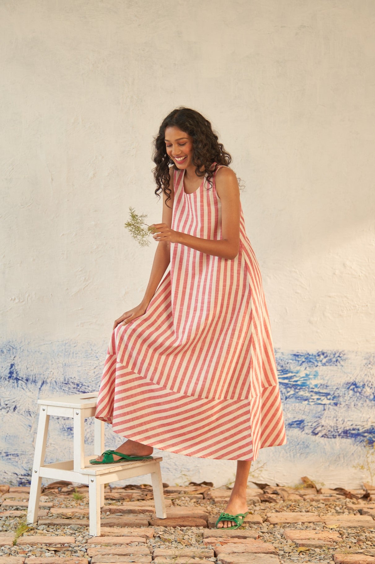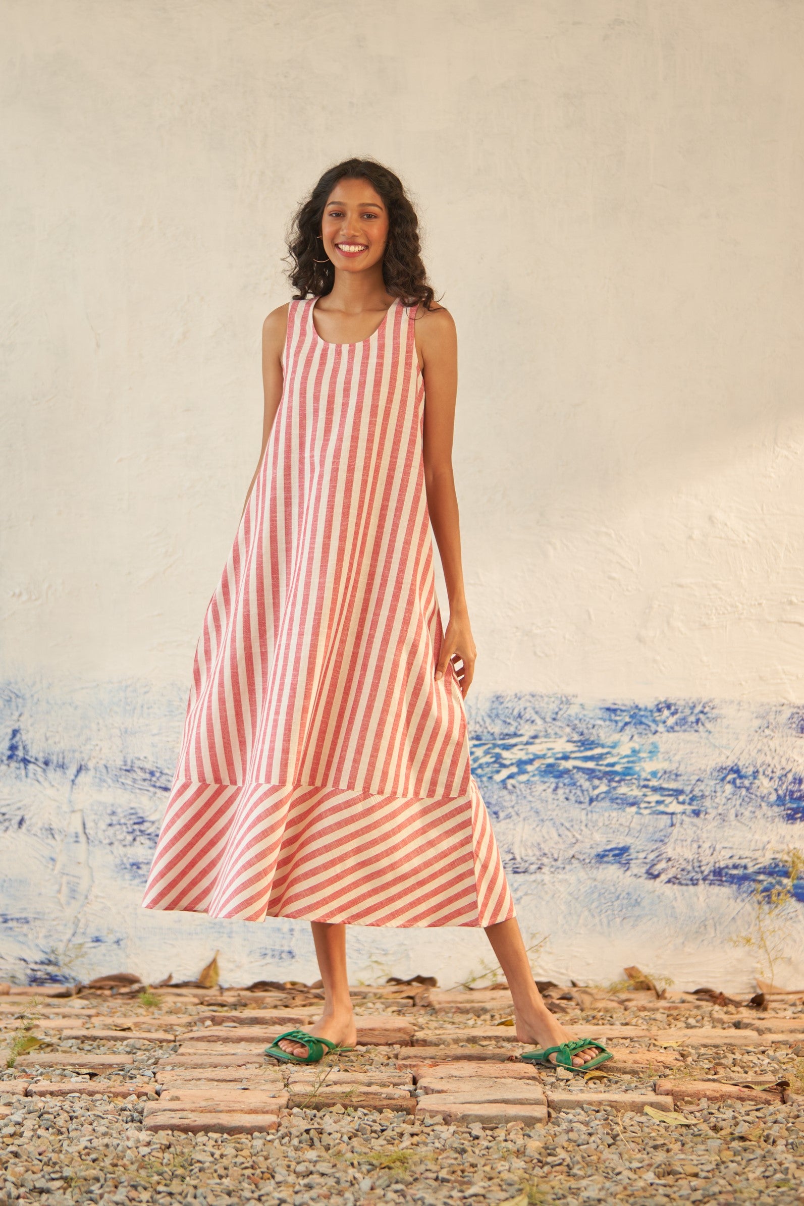 This striped dress is cut to gently fall through the frame, featuring a scoop neck and a curved hem. Diagonal lines at the bottom tier provide a subtle point of difference. Sleeveless with a voluminous flare, this dress allows you to sway gracefully as you step out to enjoy a cup of latte.