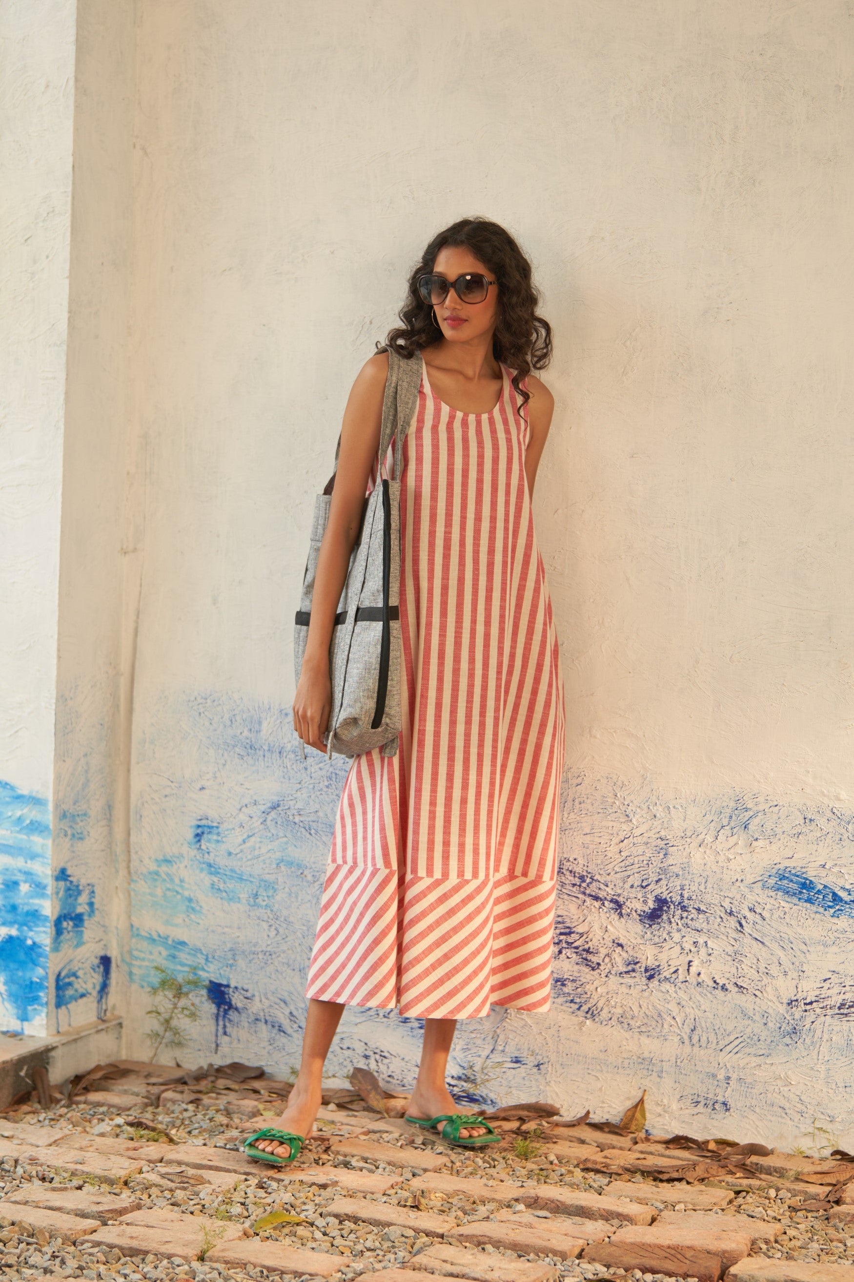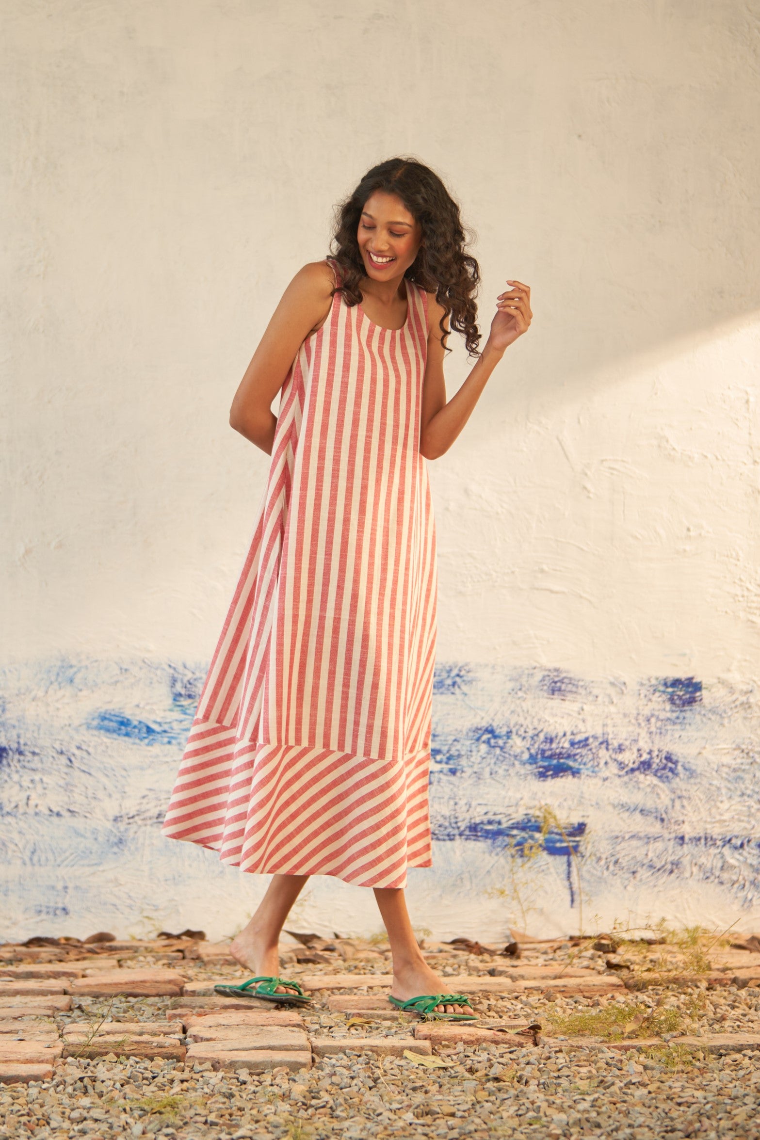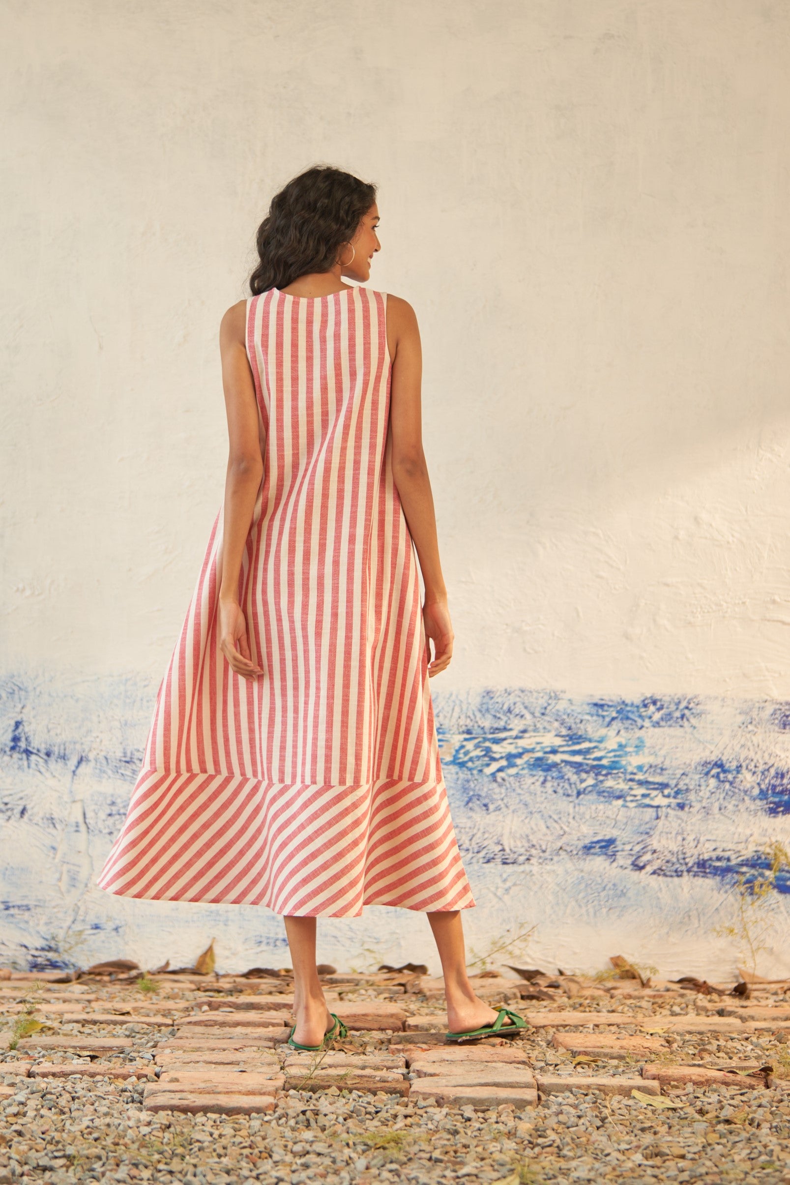 This striped dress is cut to gently fall through the frame, featuring a scoop neck and a curved hem. Diagonal lines at the bottom tier provide a subtle point of difference. Sleeveless with a voluminous flare, this dress allows you to sway gracefully as you step out to enjoy a cup of latte.