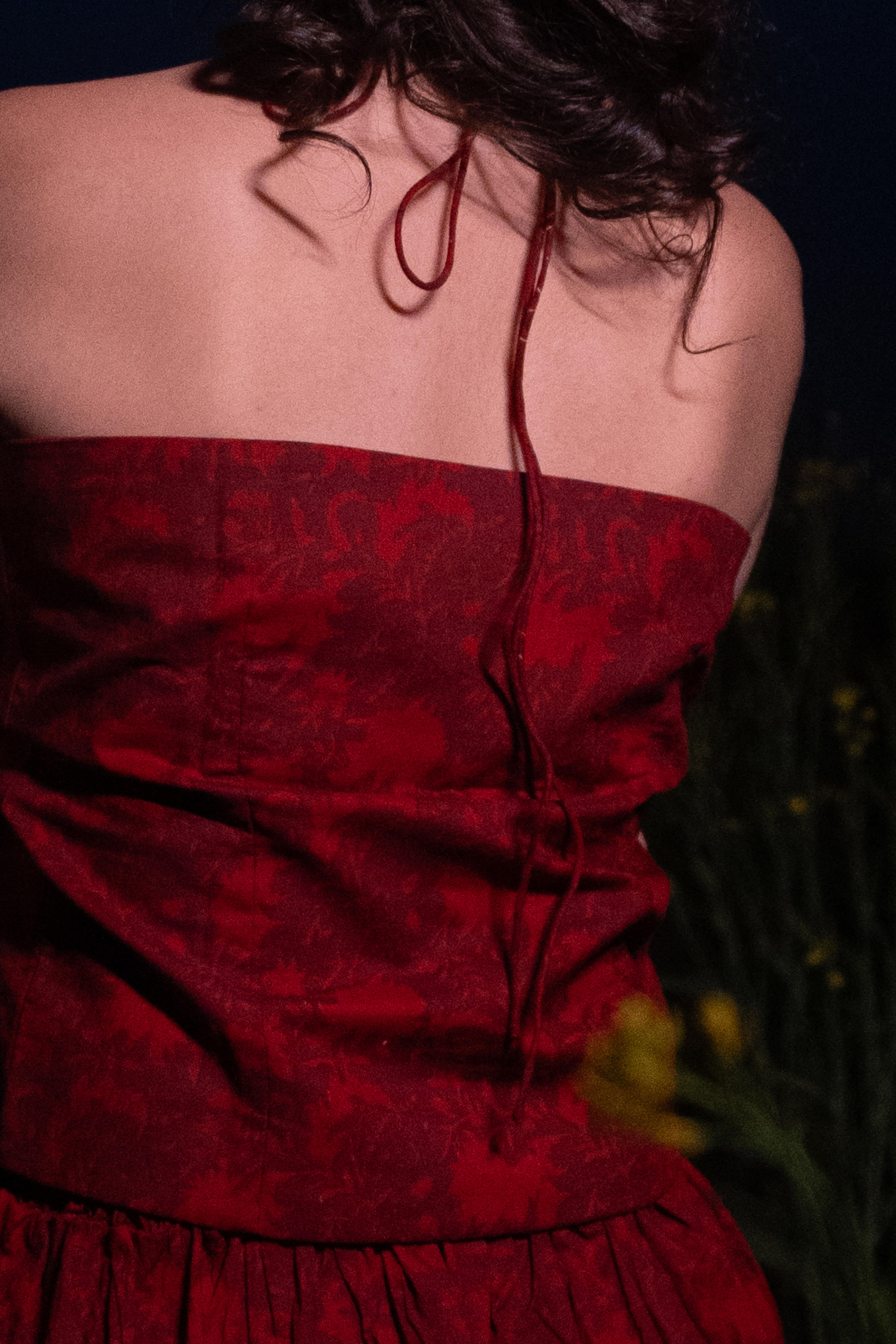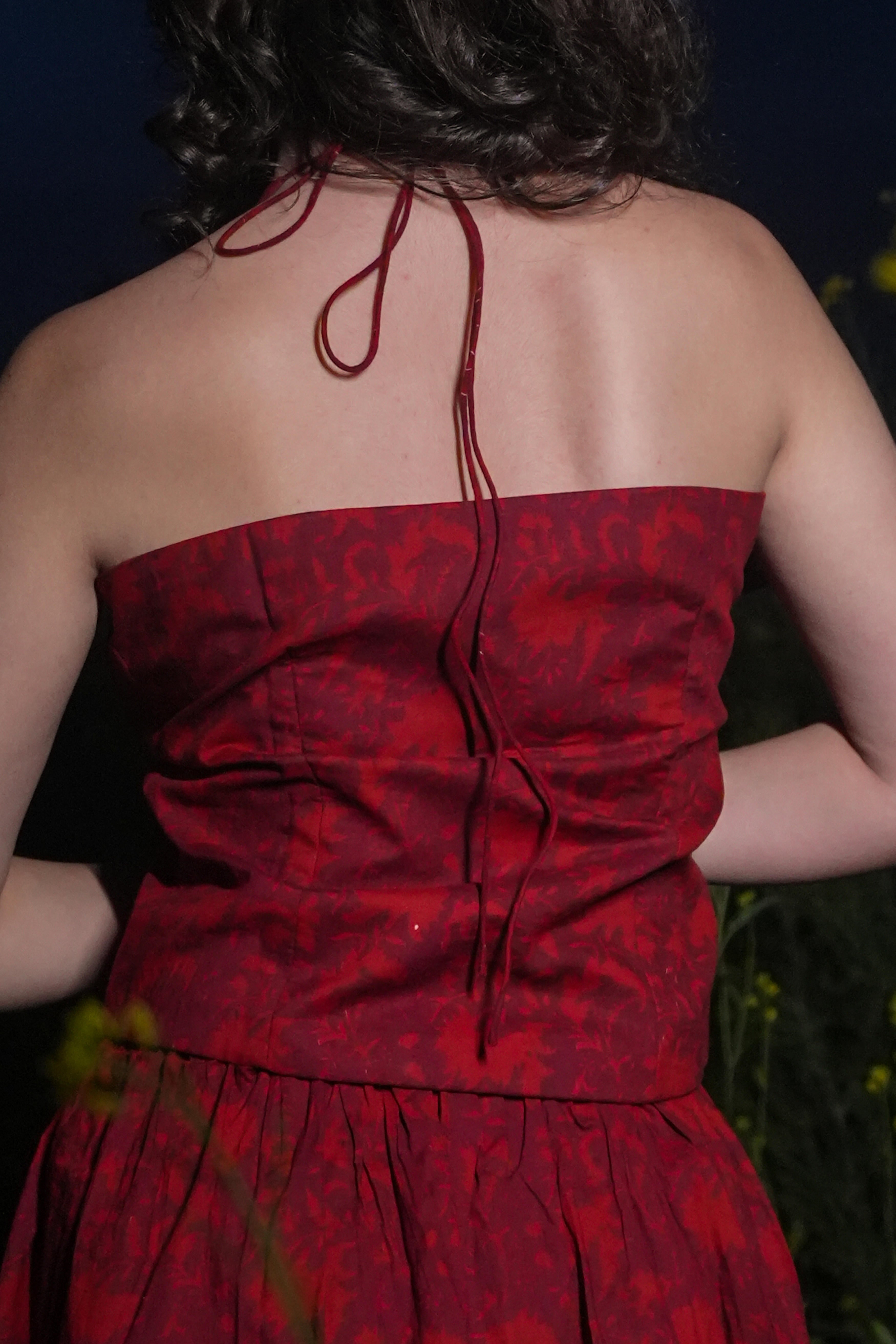 The Crim Waistcoat is a subtle statement in deep crimson, designed to feel as easy as it looks bold. A halter cut opens up the shoulders, while the front is shaped with gentle seams and an angled hem that follows the body in a relaxed, composed way. Finished with a slim button front and fine back ties, it slips seamlessly into your rotation — worn as a matching set for long, clean lines or on its own as a quietly confident top.