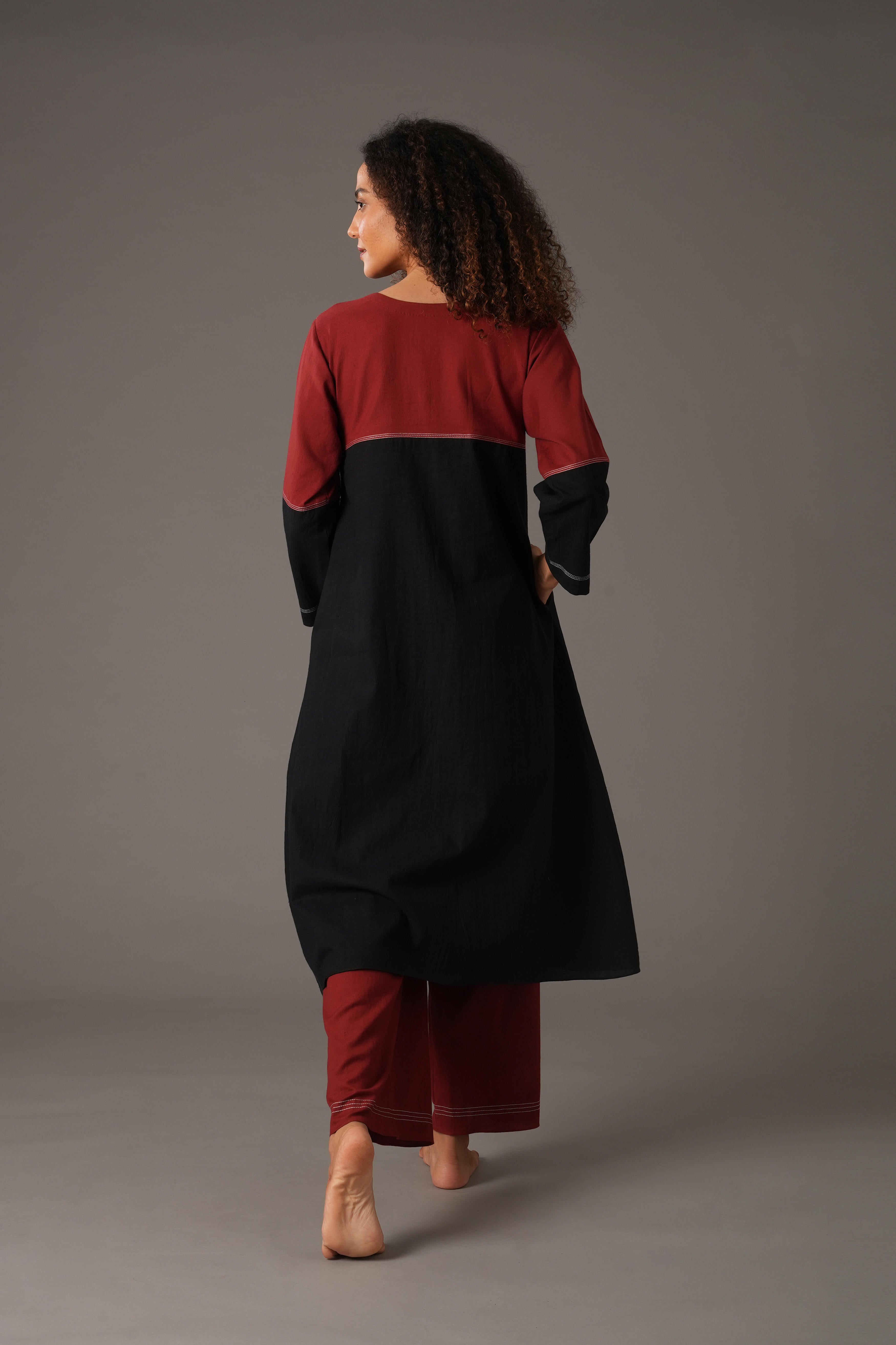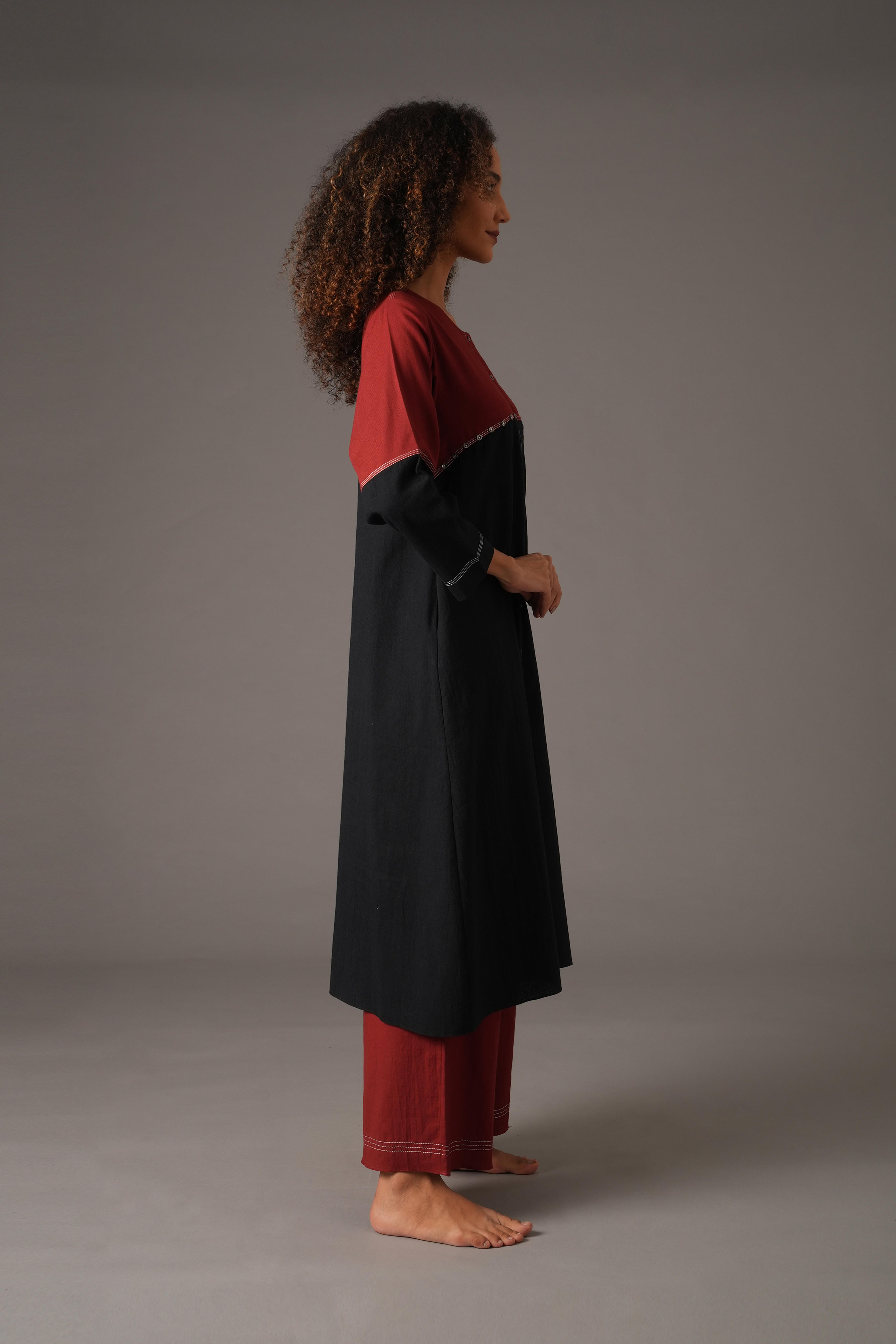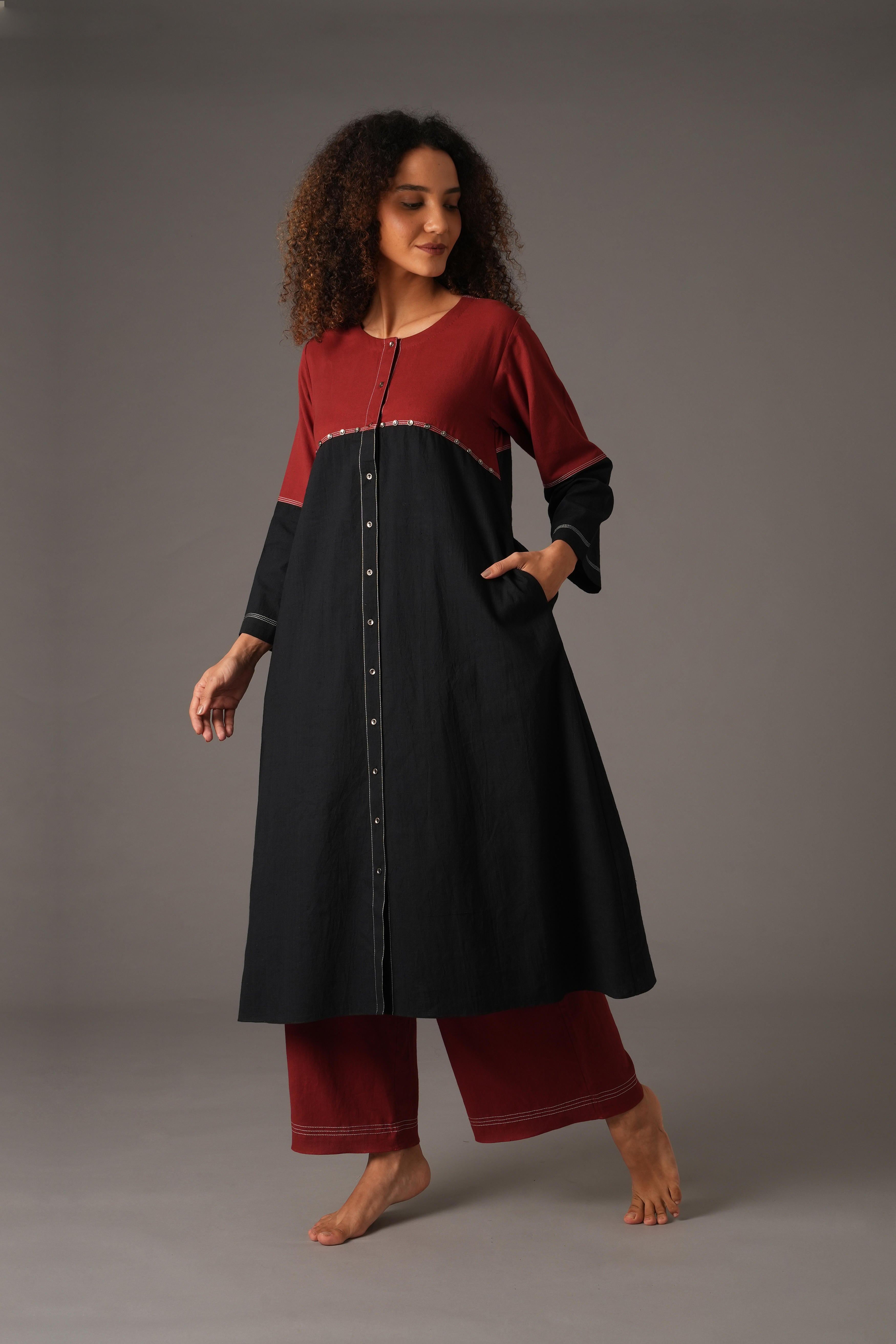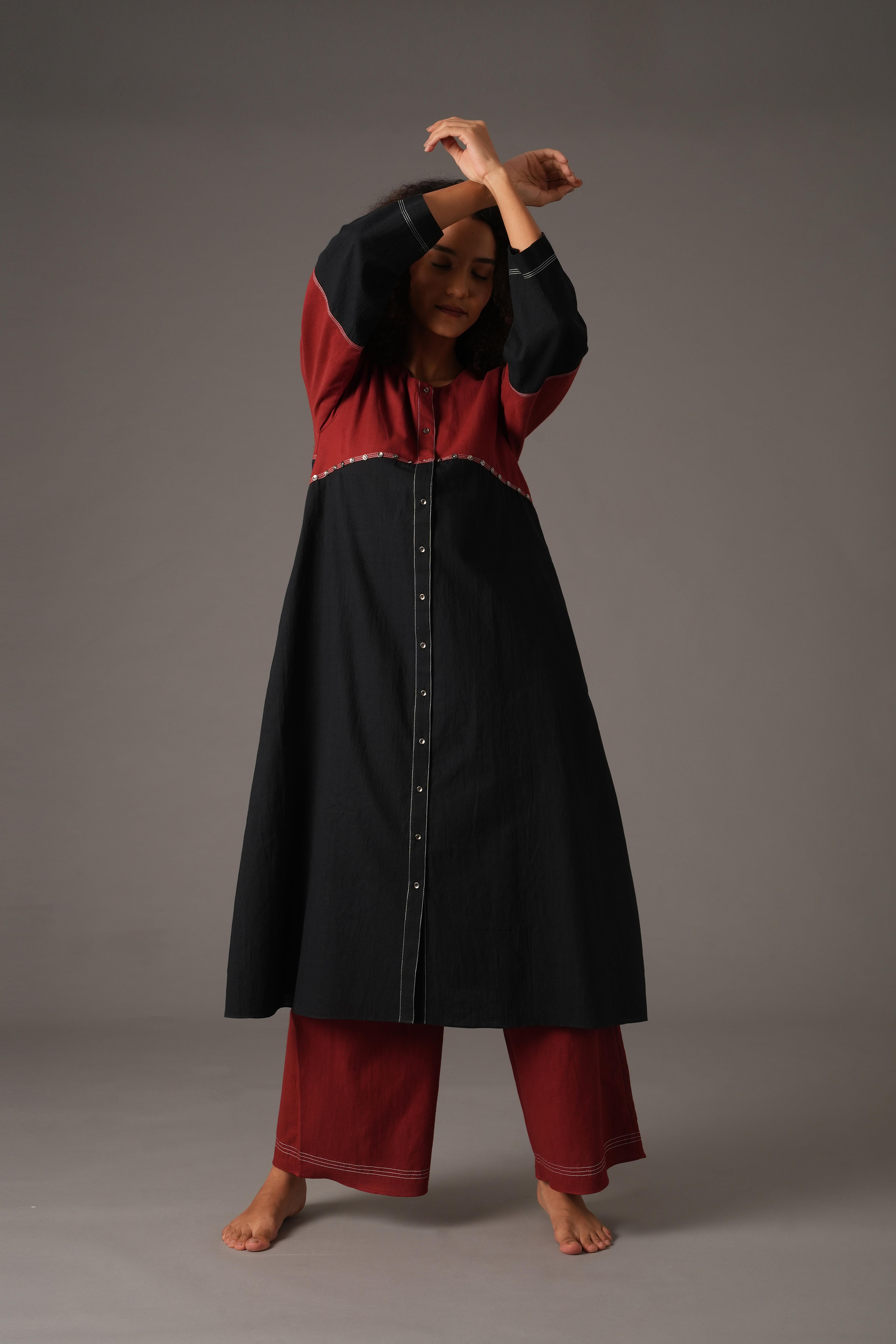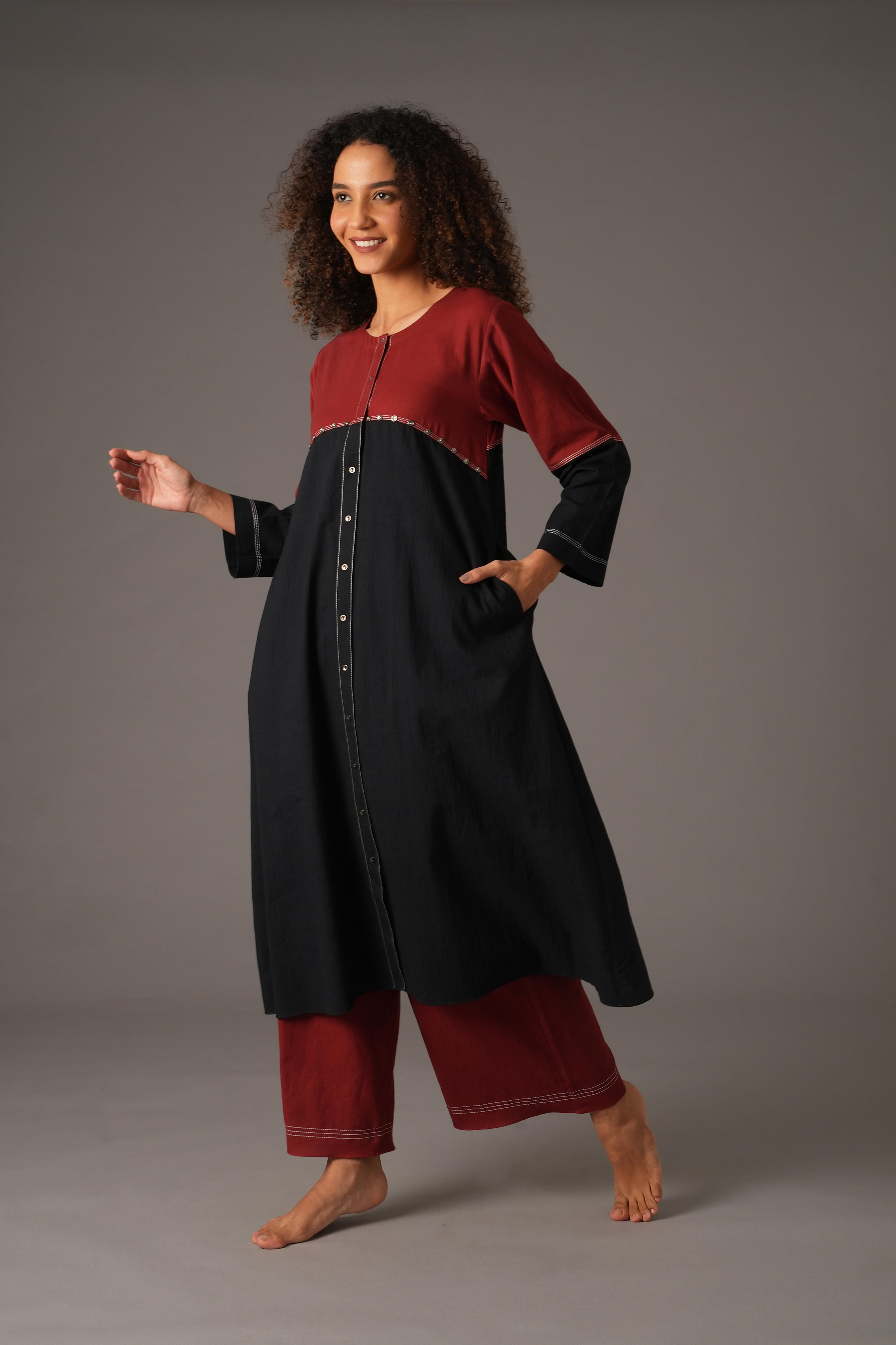 Elevate your everyday elegance with this Handwoven Cotton Dress in a striking Red & Black colour combination. Made from breathable and eco-friendly handwoven cotton, this piece combines traditional charm with modern simplicity. Designed with a full length of 44 inches and 19-inch long sleeves, it features a round neckline for a clean silhouette. The front is adorned with detailed embroidery work and a row of full metal buttons, adding texture and sophistication to the look. The regular fit ensures all-day comfort while giving you a flattering shape that works for both casual and semi-formal occasions. Perfect to wear as a standalone statement piece, this dress reflects the beauty of artisanal craftsmanship in a minimalist style. Our model, standing 5'8", is wearing a size S.