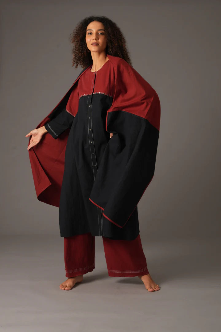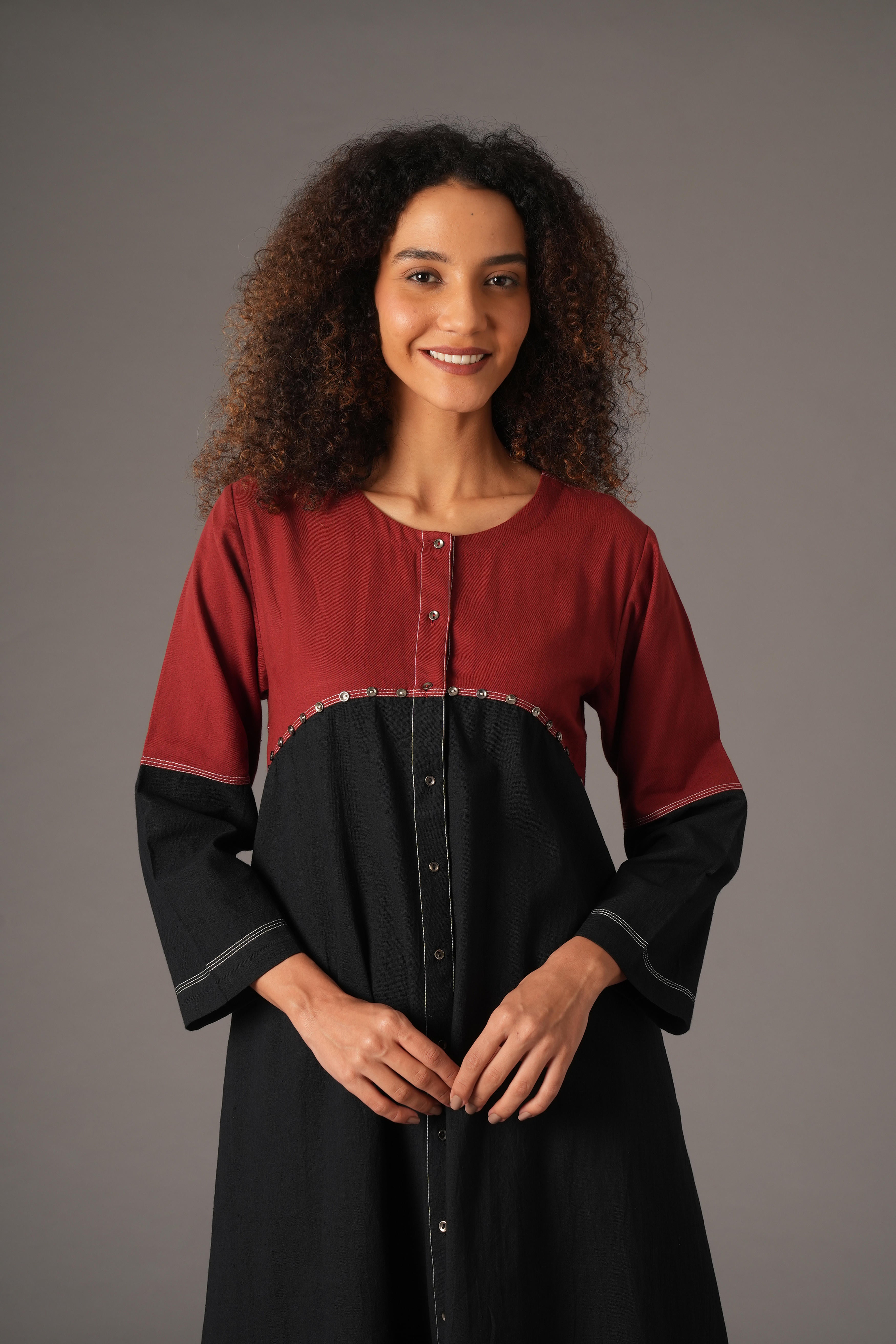 Discover timeless elegance with this stunning 3-piece Handwoven Cotton Set in a bold Red & Black colour palette. Thoughtfully crafted for both comfort and style, this set includes a dress, apnat (pants), and scarf, making it a versatile addition to your wardrobe. The dress is designed with a flattering 44-inch full length, round neckline, and 19-inch long sleeves for a graceful silhouette. The highlight lies in the exquisite front embroidery work paired with a line of metal buttons that add a refined traditional touch. Its regular fit ensures a comfortable yet tailored appearance for day-long wear. Complementing the outfit, the scarf spans 82 inches in length and 25 inches in width, offering the perfect layering piece to complete your ethnic ensemble. Whether you're dressing for a celebration, a cultural event, or everyday elegance, this outfit blends heritage craftsmanship with contemporary appeal. Our model is 5'8" tall and is wearing a size S.