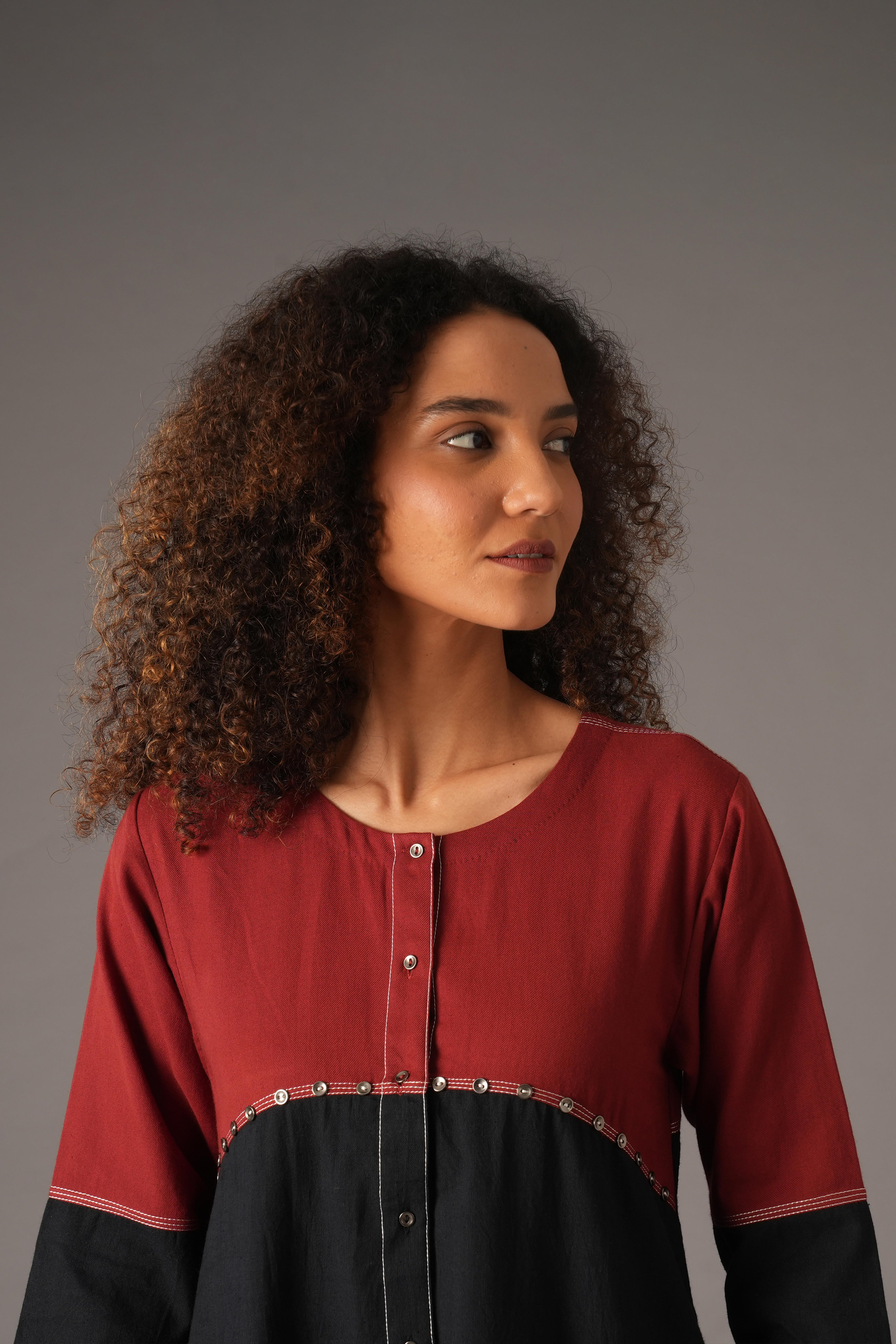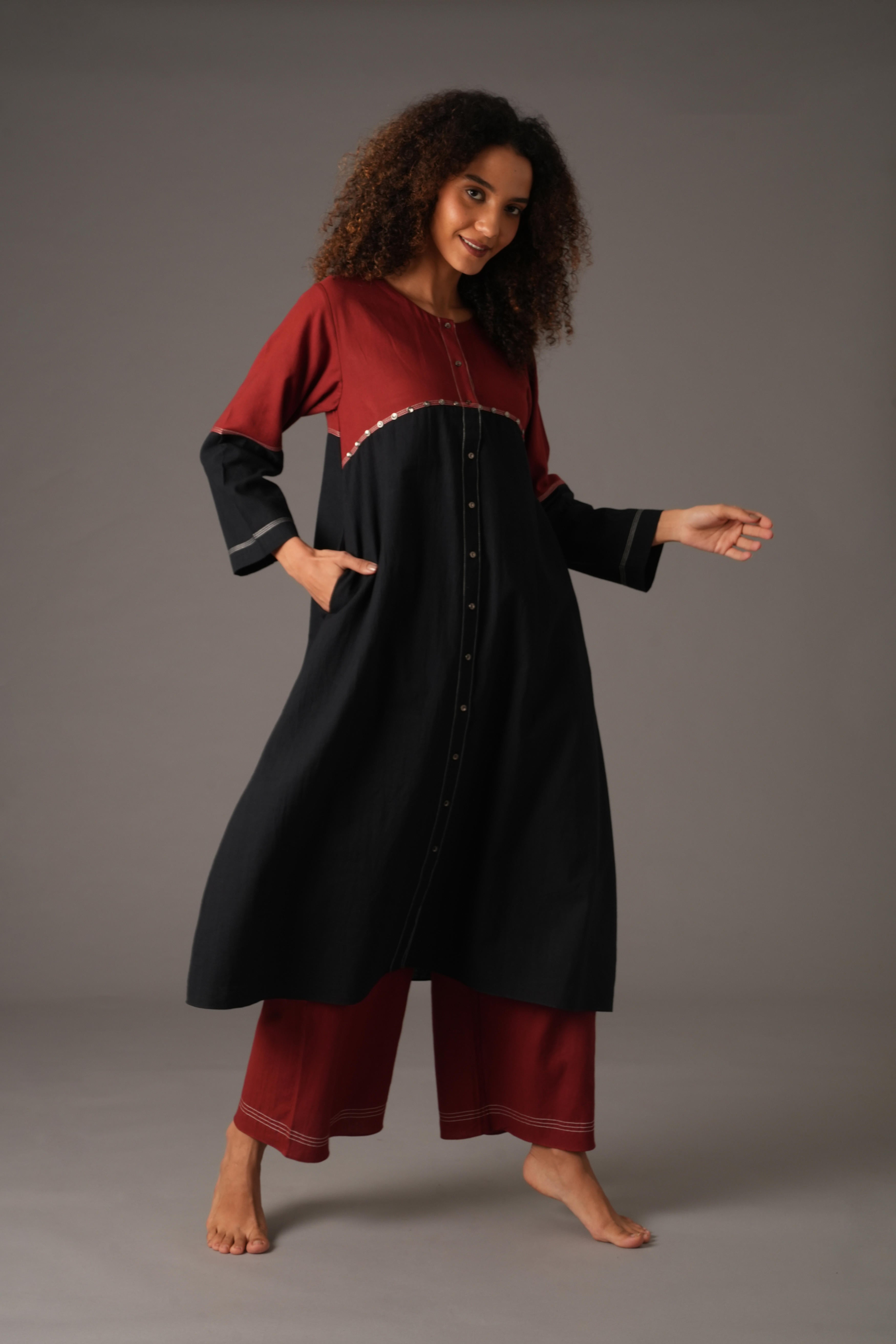 Step into effortless style with this elegant 2-piece Handwoven Cotton Set in rich Red & Black tones. Designed for comfort and crafted with care, the set features a beautifully embroidered dress and matching pants, making it a standout addition to your ethnic wardrobe. The dress is cut to a 44-inch full length with 19-inch long sleeves and a classic round neckline, offering a structured yet breathable fit. It features intricate front embroidery work complemented by a line of full metal buttons, adding a traditional touch to this contemporary silhouette. Tailored in a regular fit, it flatters all body types while ensuring comfort throughout the day. Paired with comfortable handwoven pants, this set is perfect for festive occasions, casual get-togethers, or cultural events where grace and ease matter most. Our model, with a height of 5'8", is wearing a size S.