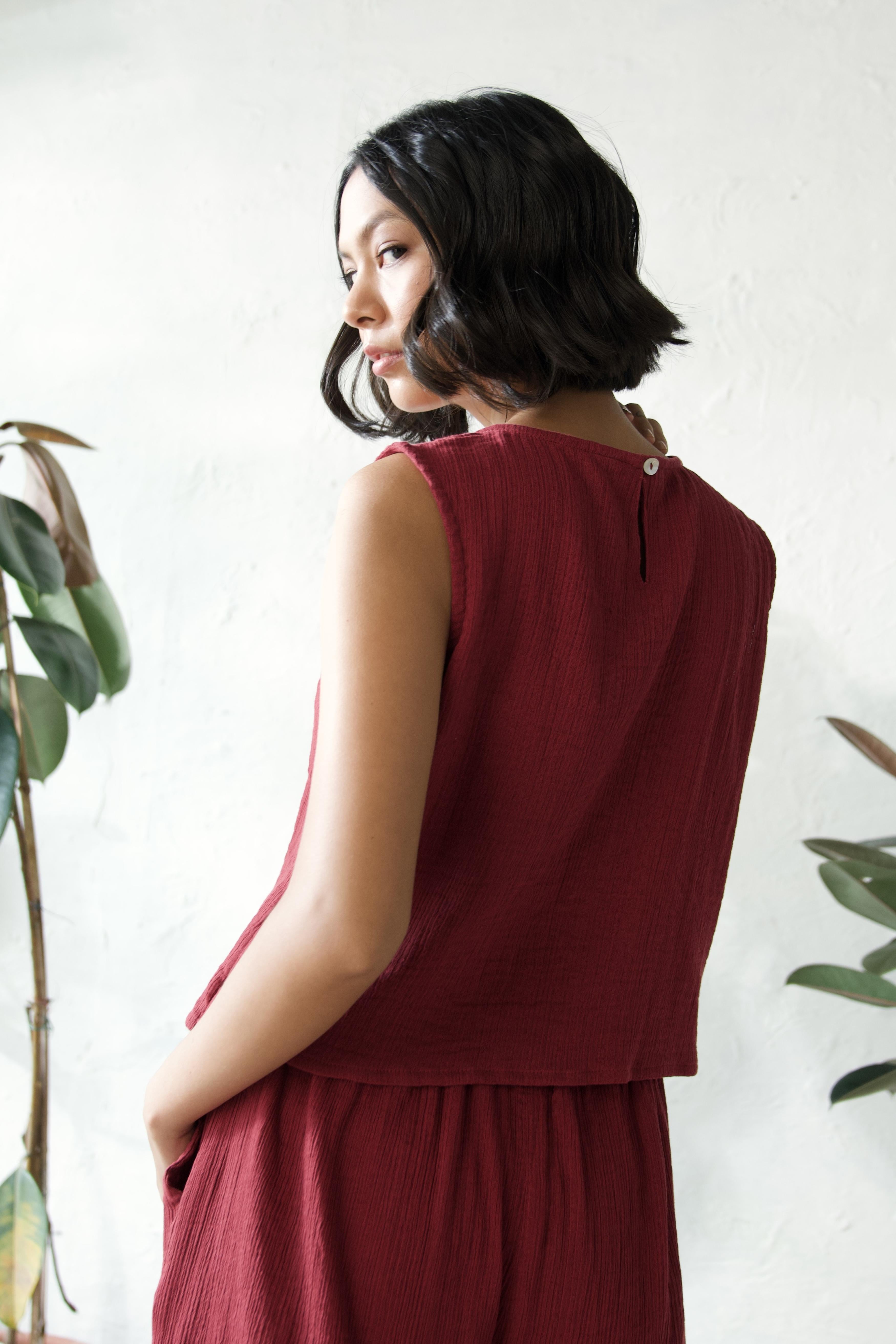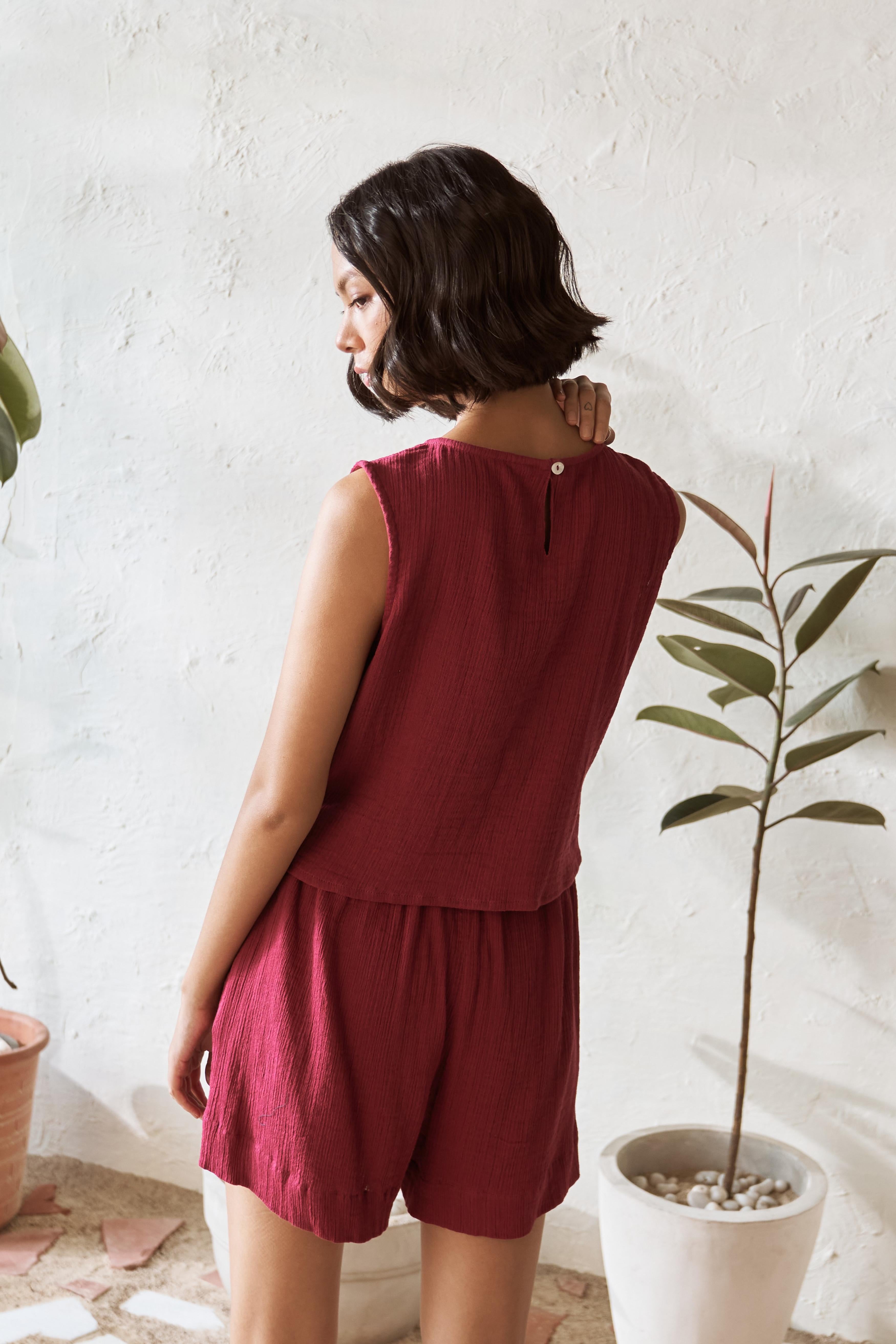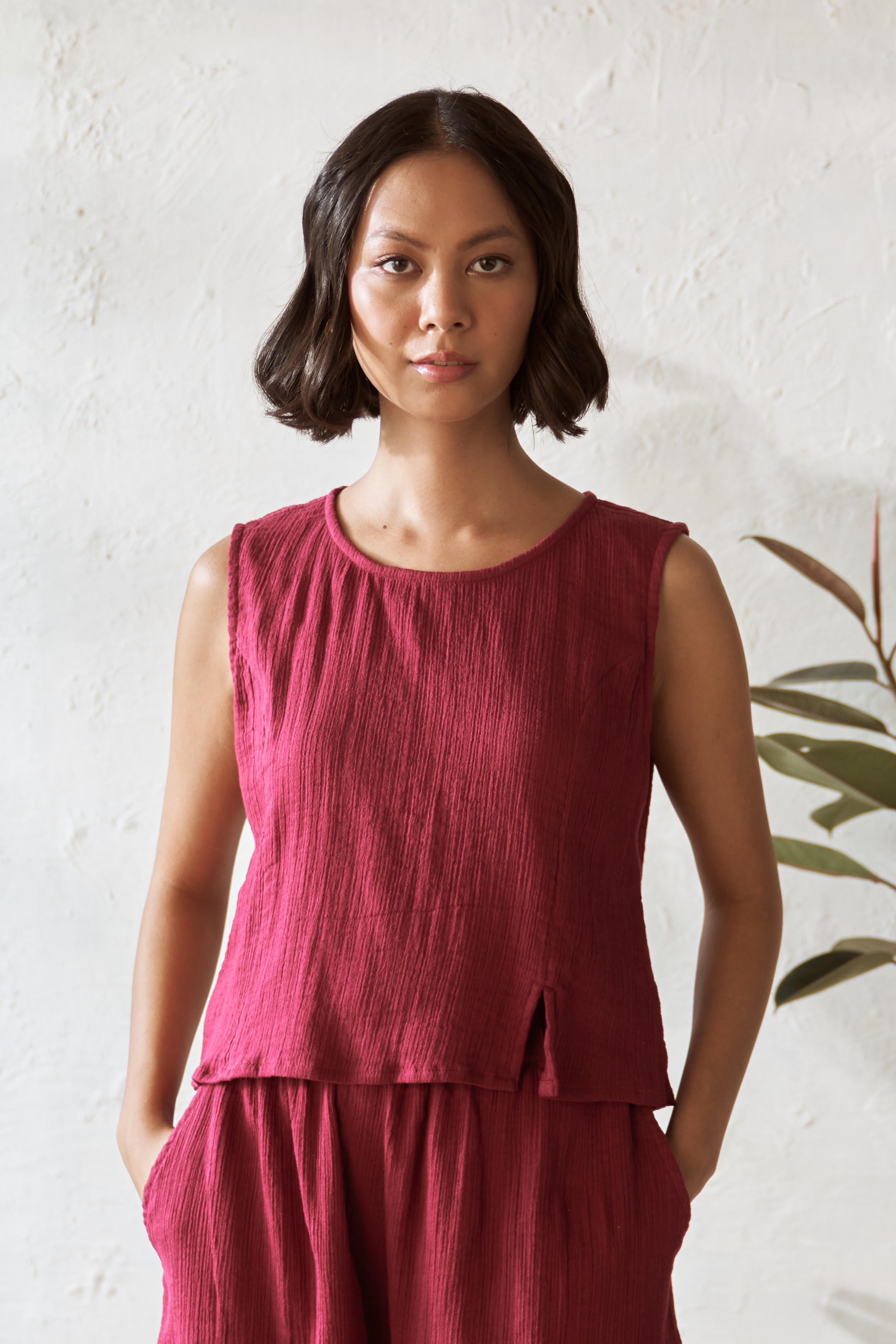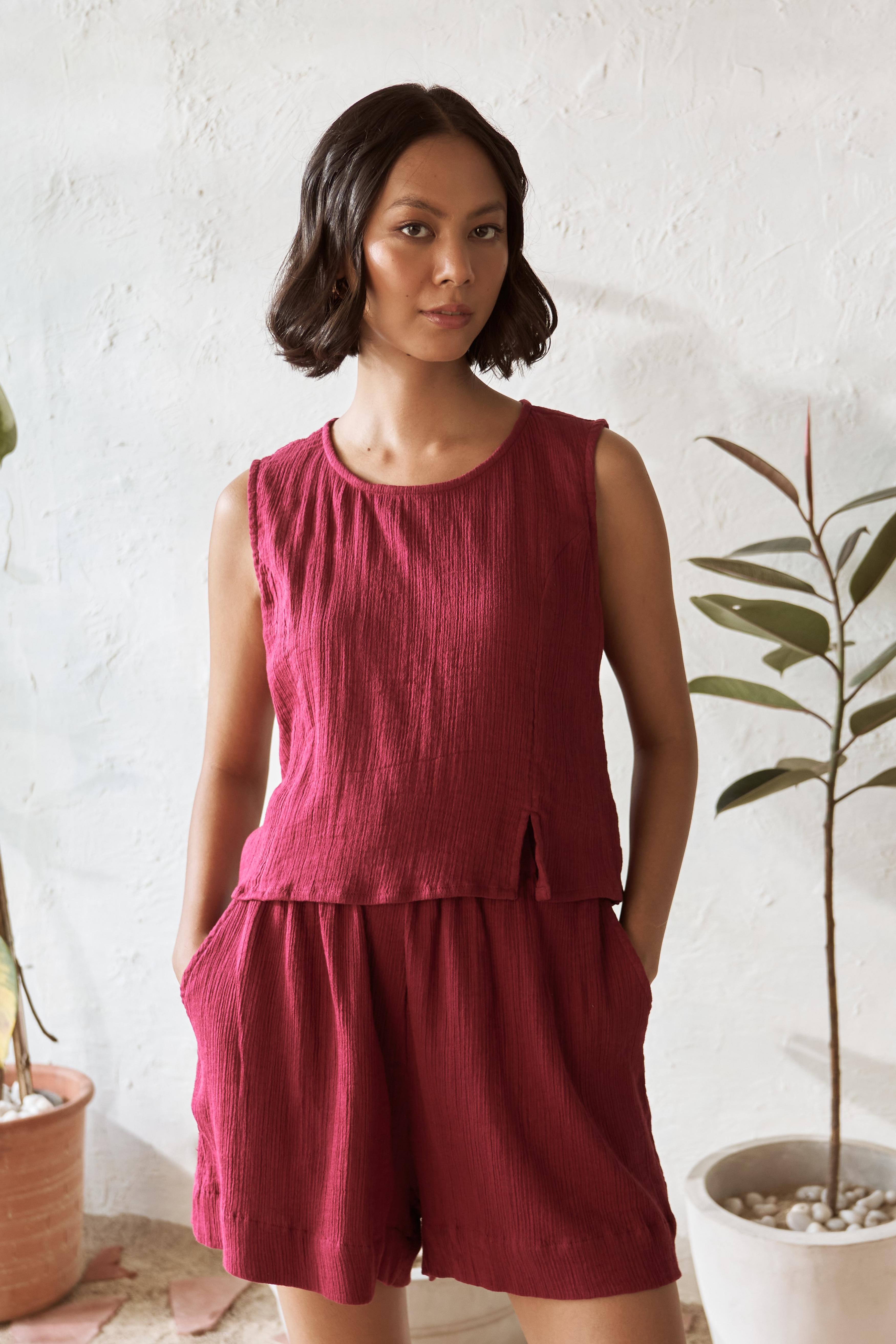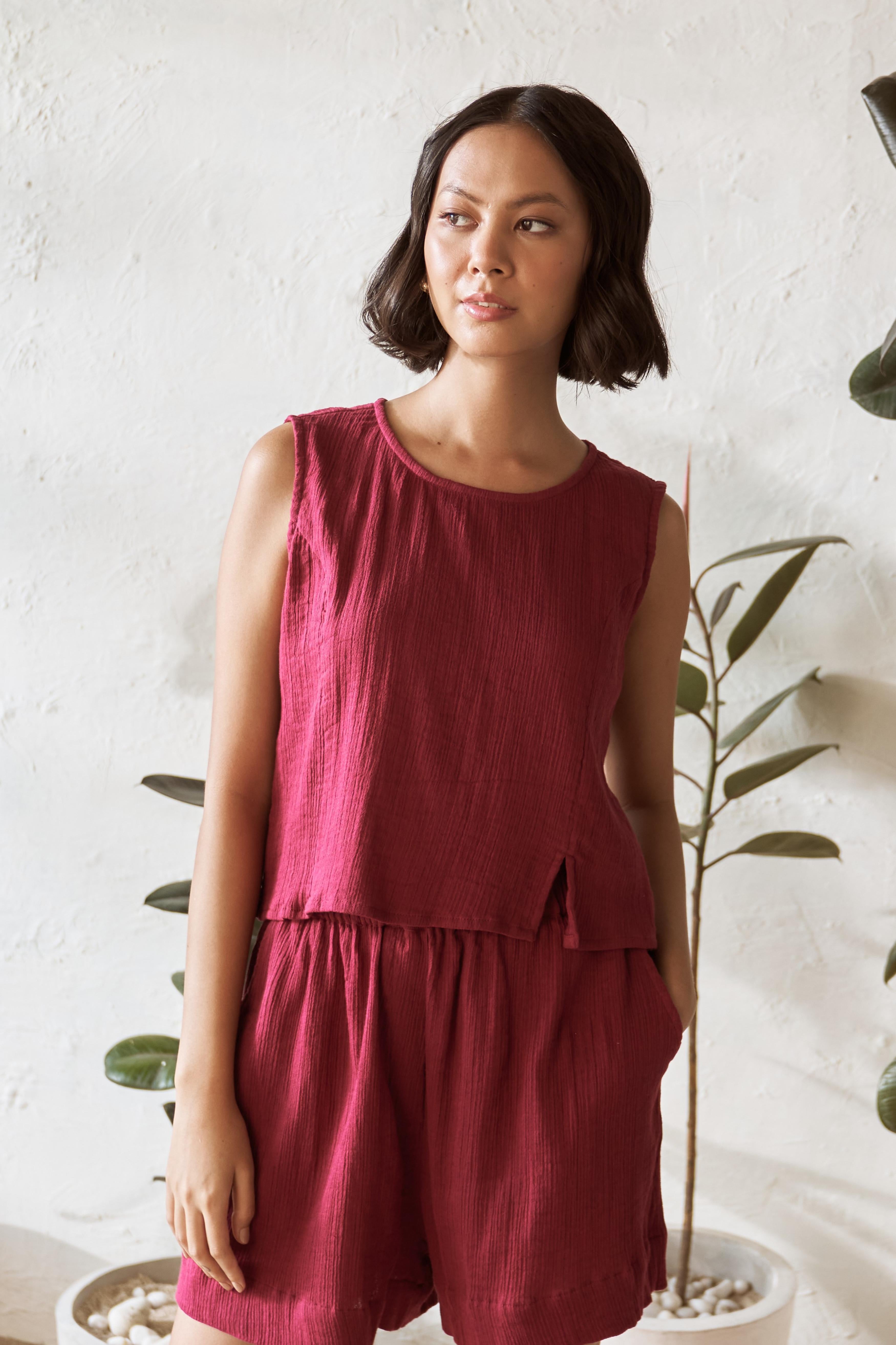 Radiate confidence in our chic sleeveless cotton top in a striking Crimson hue. The round neckline and subtle front slit bring a touch of elegance. This top is perfect for making a bold statement while staying effortlessly comfortable. Pair it with our matching shorts for a coordinated, standout look.
