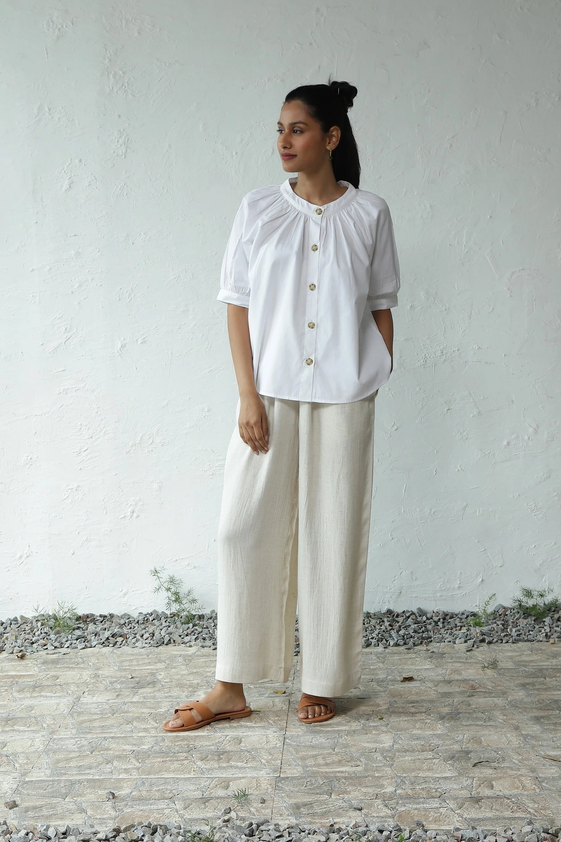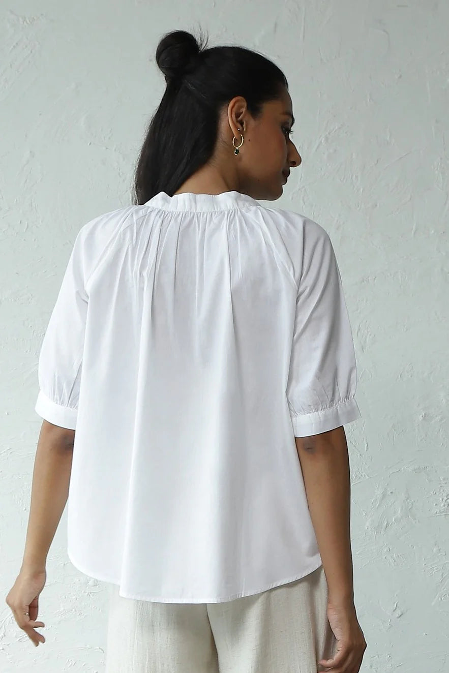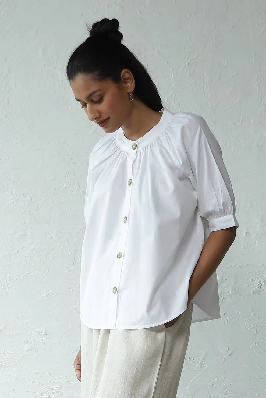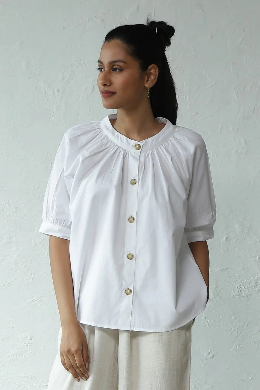 Urban Elegance' Gathered Round Neck Top - Perfect for City Travel. Elevate your wardrobe with this elegantly crafted piece. Made from crisp cotton poplin, it boasts a breezy silhouette accentuated by gentle gathers around the neckline. The front placket, adorned with marble pattern buttons, enhances versatility, allowing it to be styled as an open shirt as well. This top pairs effortlessly with shorts, skirts, or trousers of your choice. For an evergreen look, we've styled it with our light denim flared pants - ideal for exploring the city in style.