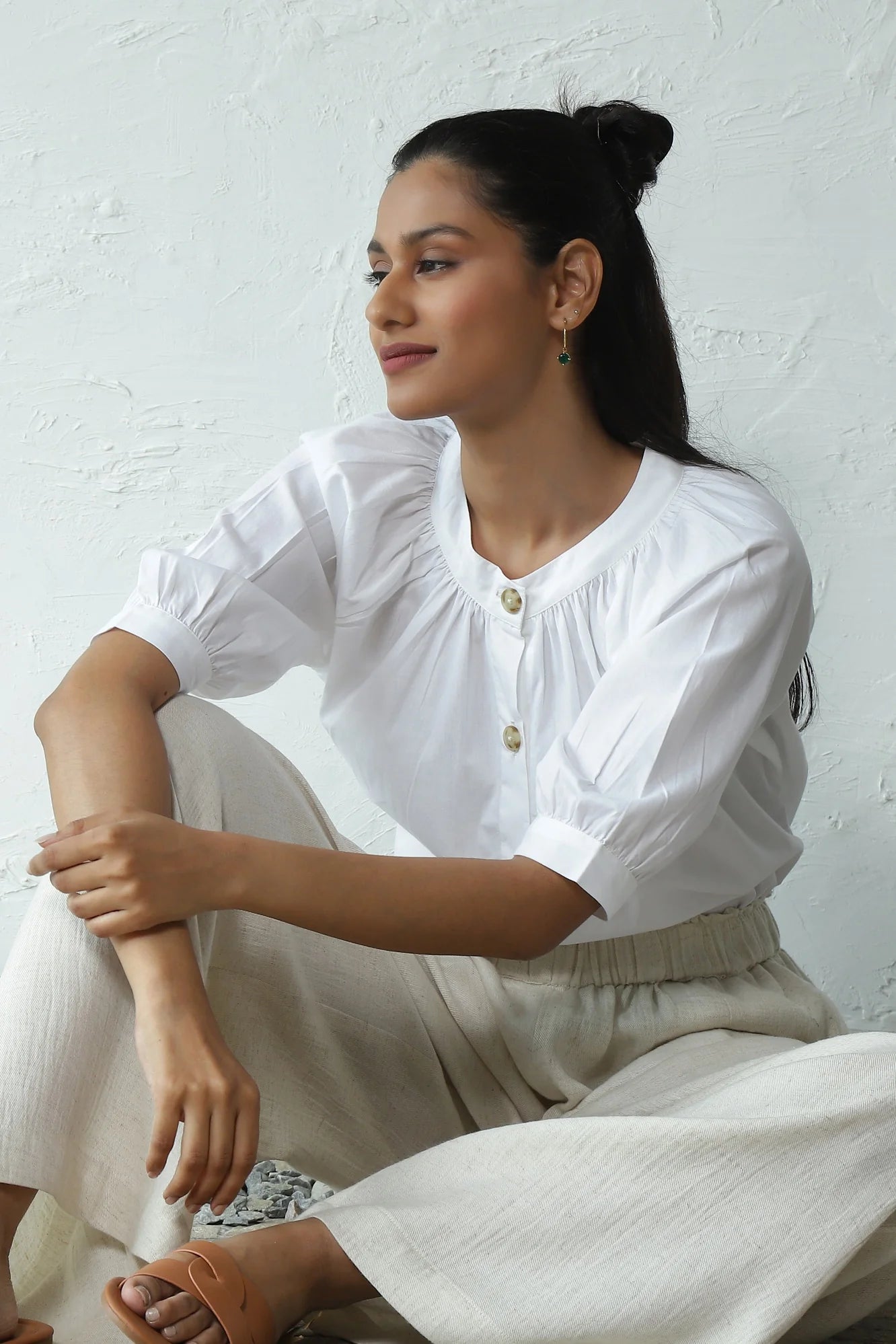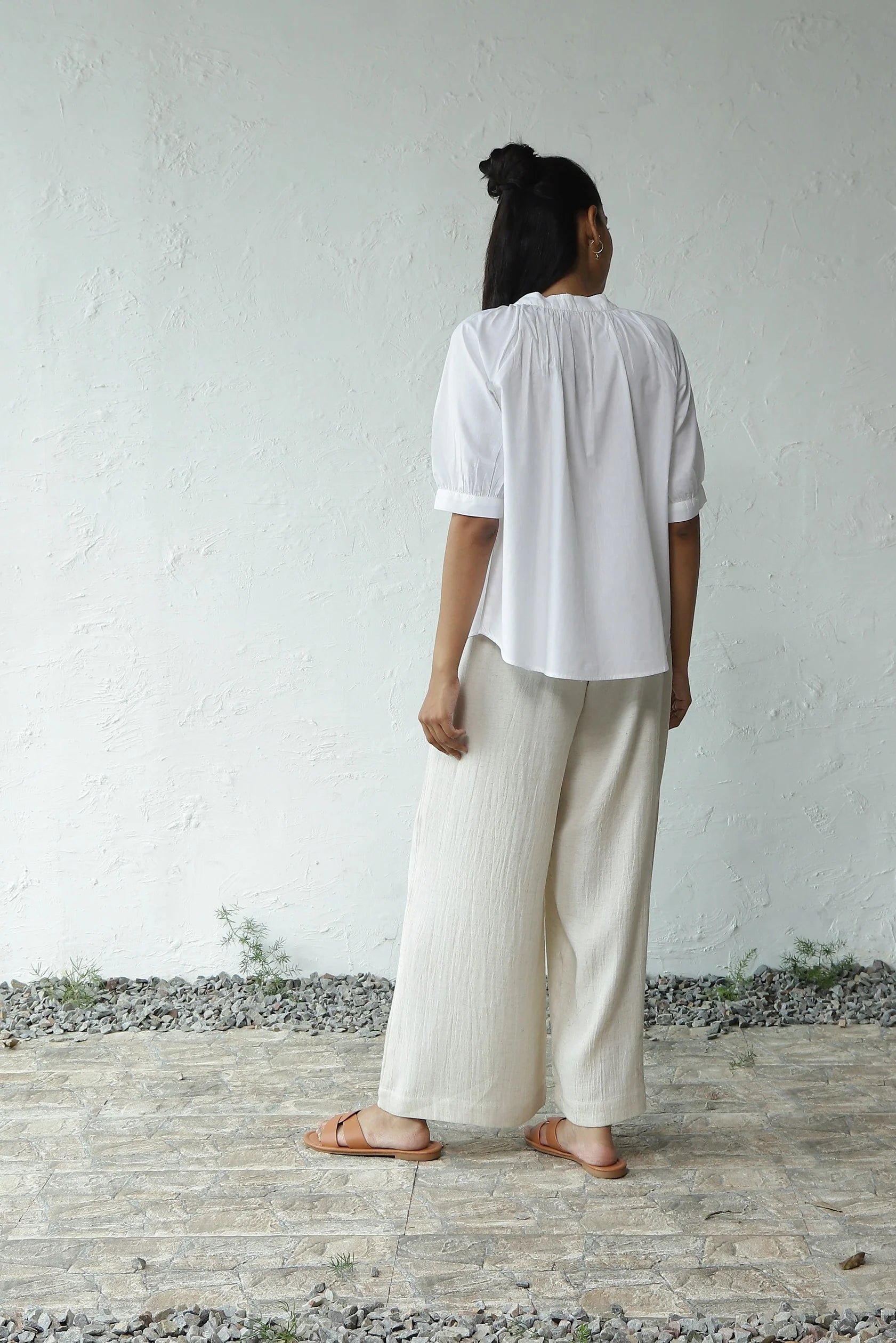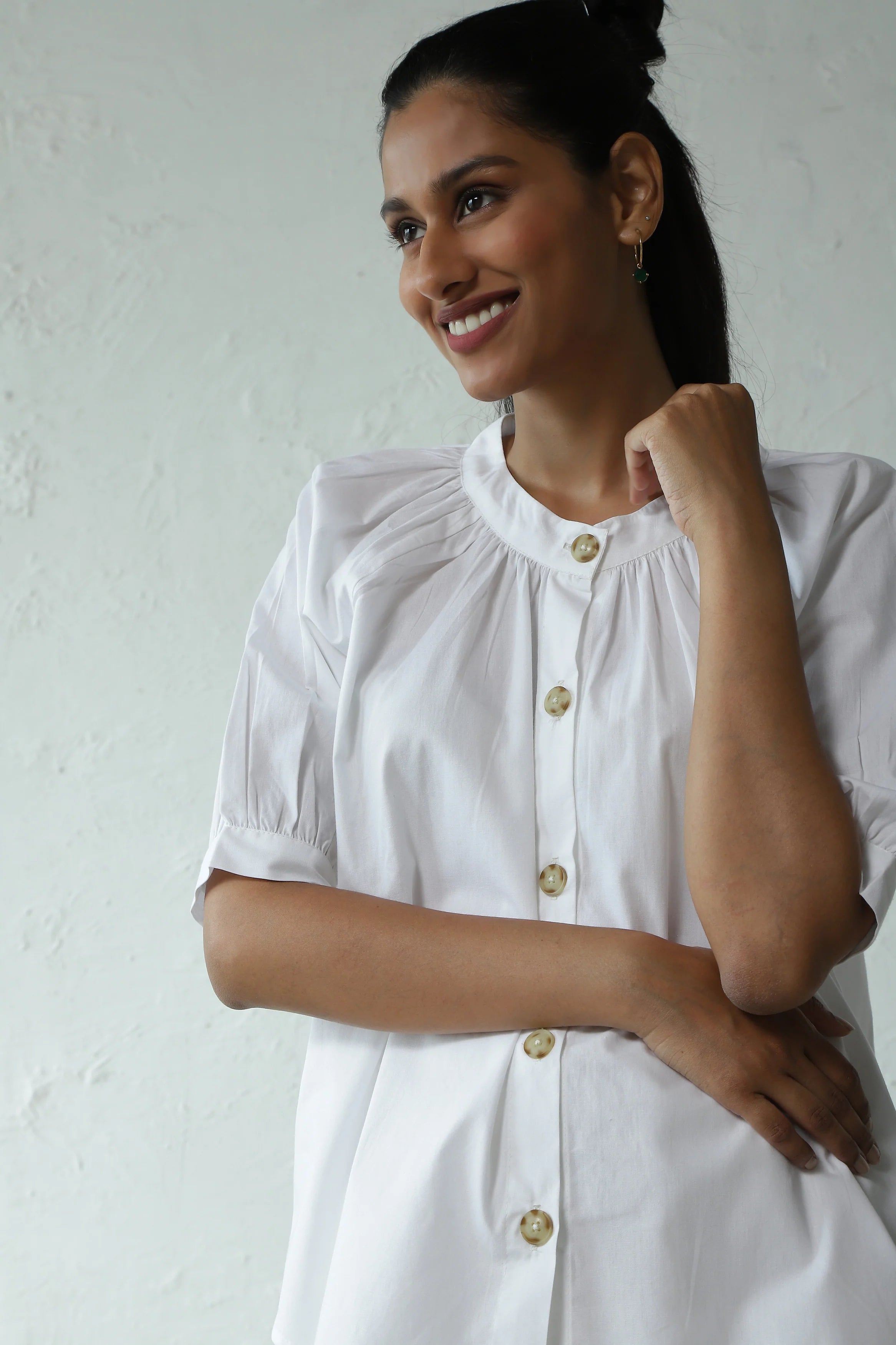 Urban Elegance' Gathered Round Neck Top - Perfect for City Travel. Elevate your wardrobe with this elegantly crafted piece. Made from crisp cotton poplin, it boasts a breezy silhouette accentuated by gentle gathers around the neckline. The front placket, adorned with marble pattern buttons, enhances versatility, allowing it to be styled as an open shirt as well. This top pairs effortlessly with shorts, skirts, or trousers of your choice. For an evergreen look, we've styled it with our light denim flared pants - ideal for exploring the city in style.