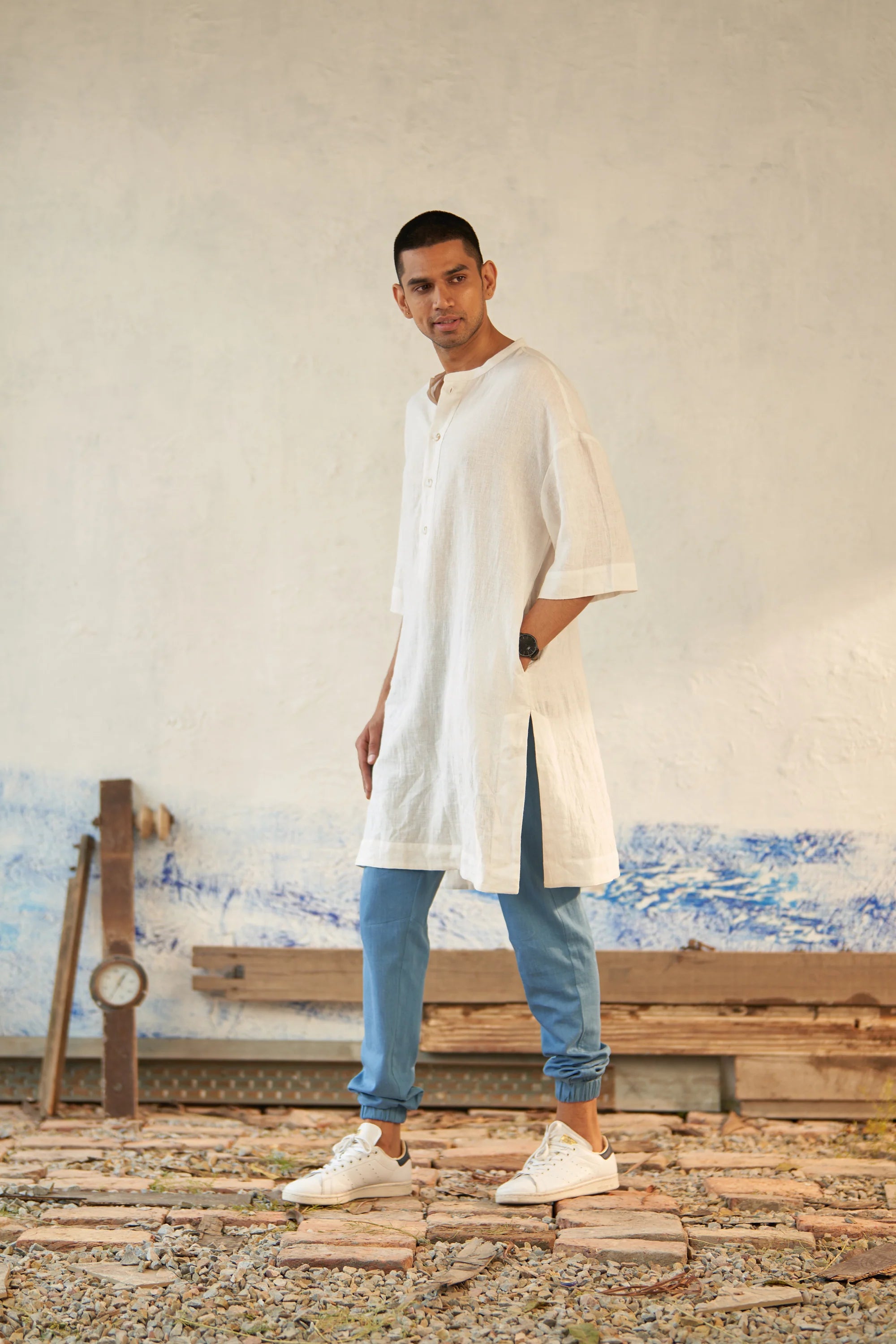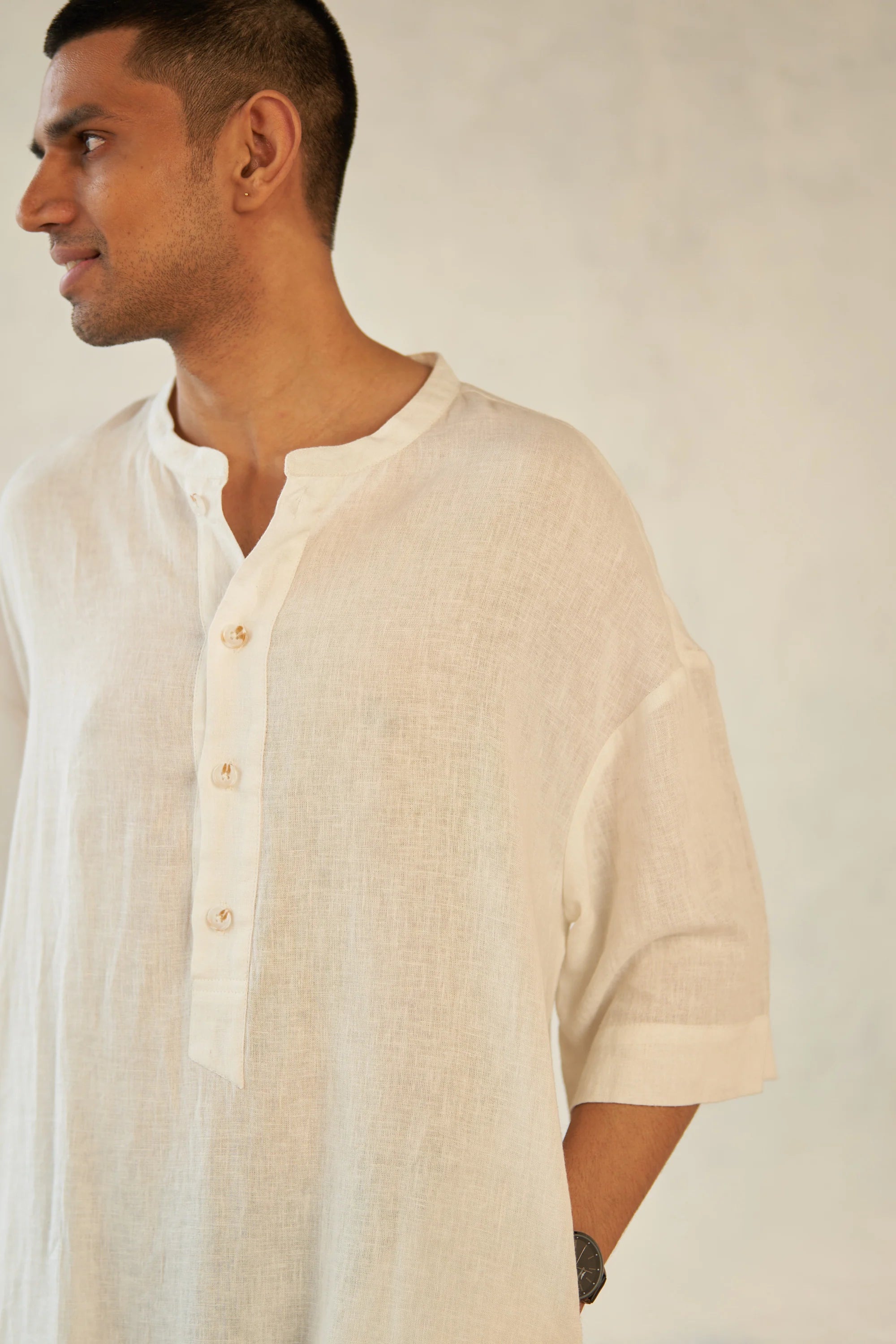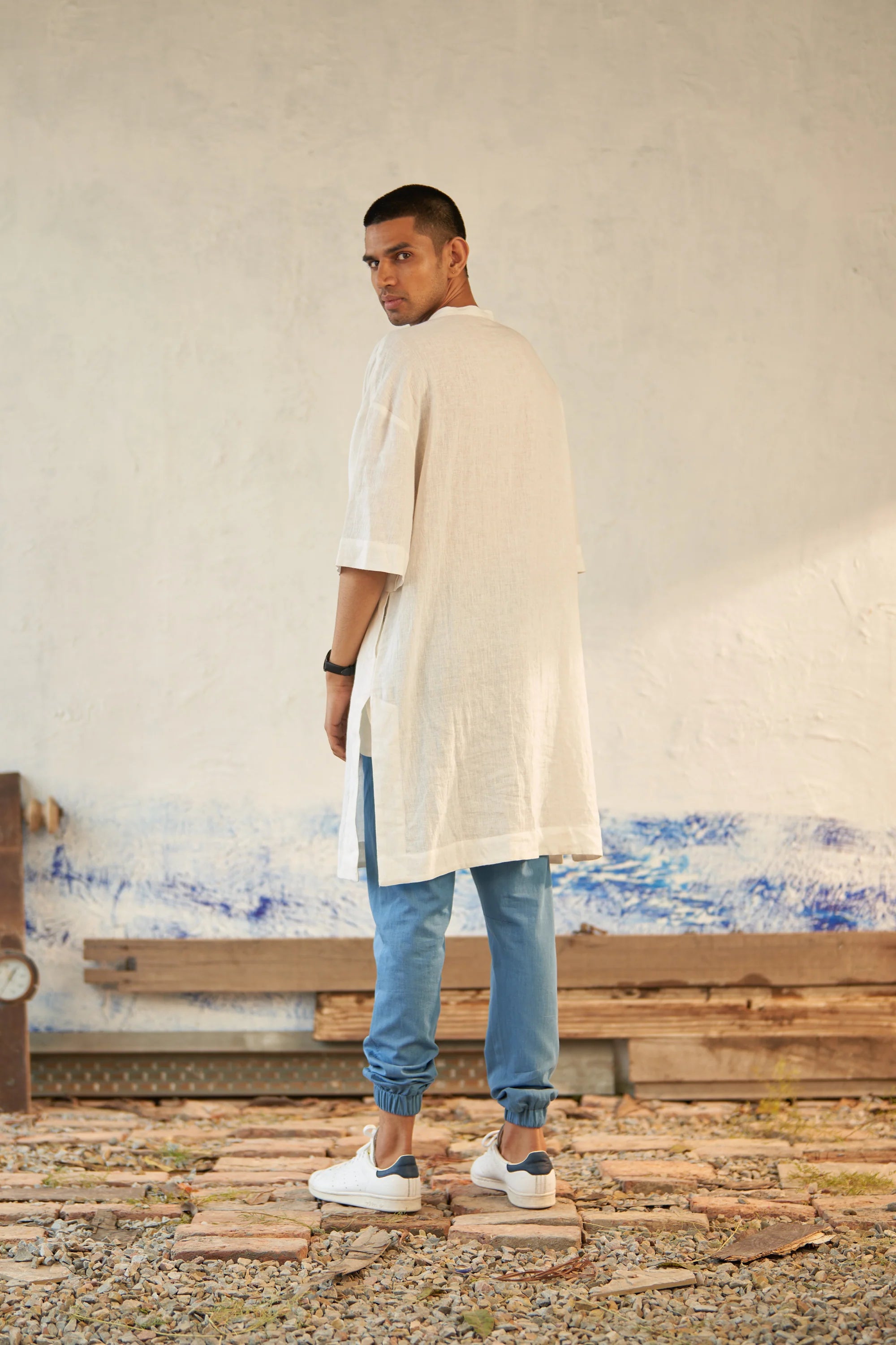 As easy as it could get, a white kurta in the most comfortable and easy silhouette possible. Canoopi's take on a standard white kurta for the perfect spontaneous option for any outing. Crafted from textured flex fabric, it infuses a modern ruggedness into the traditional outfit. It boast a broad, elongated front placket with a diagonal finish, adorned with big buttons for a contemporary touch. Pair it with joggers or pyjamas for a versatile mix.
