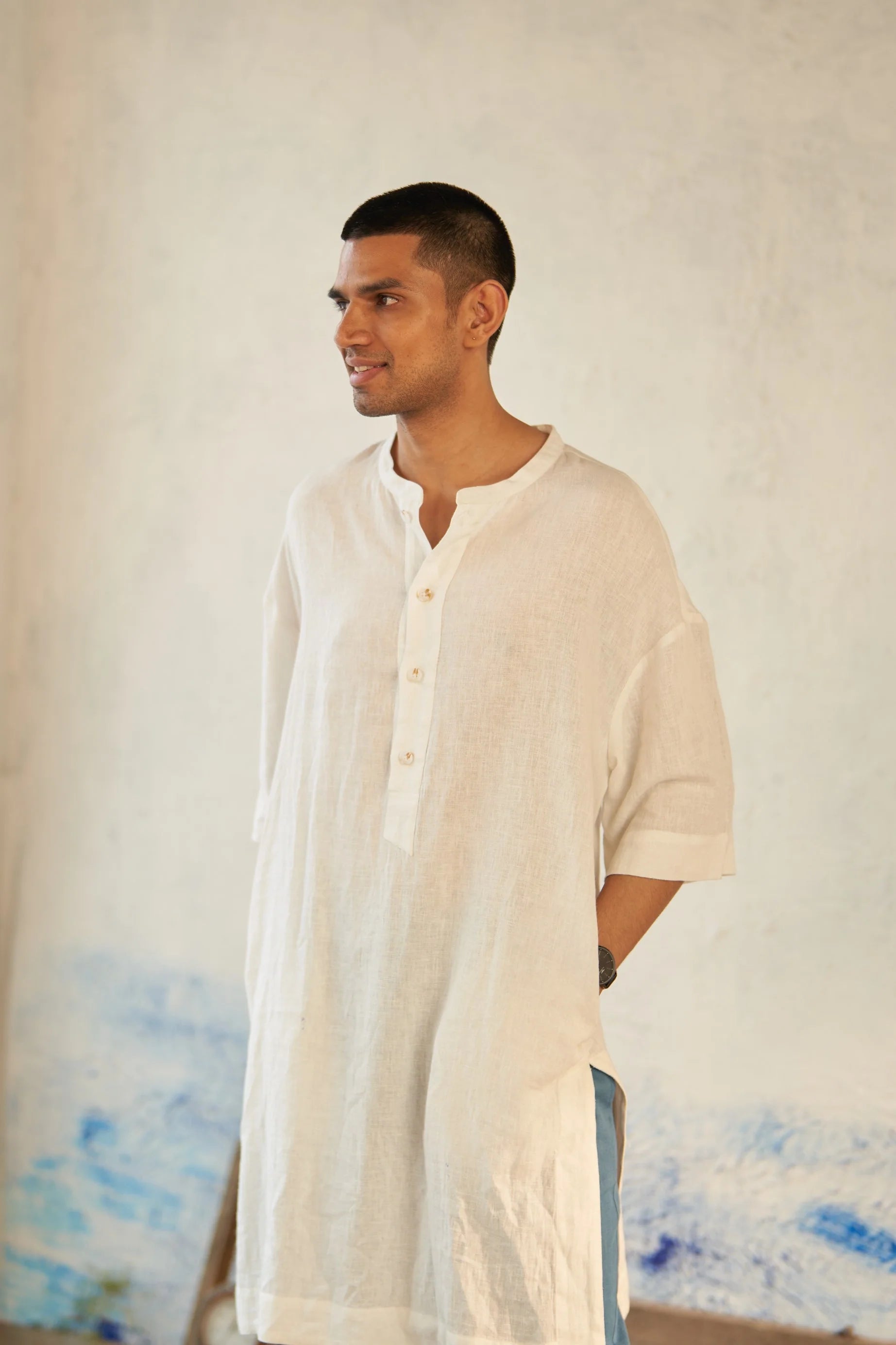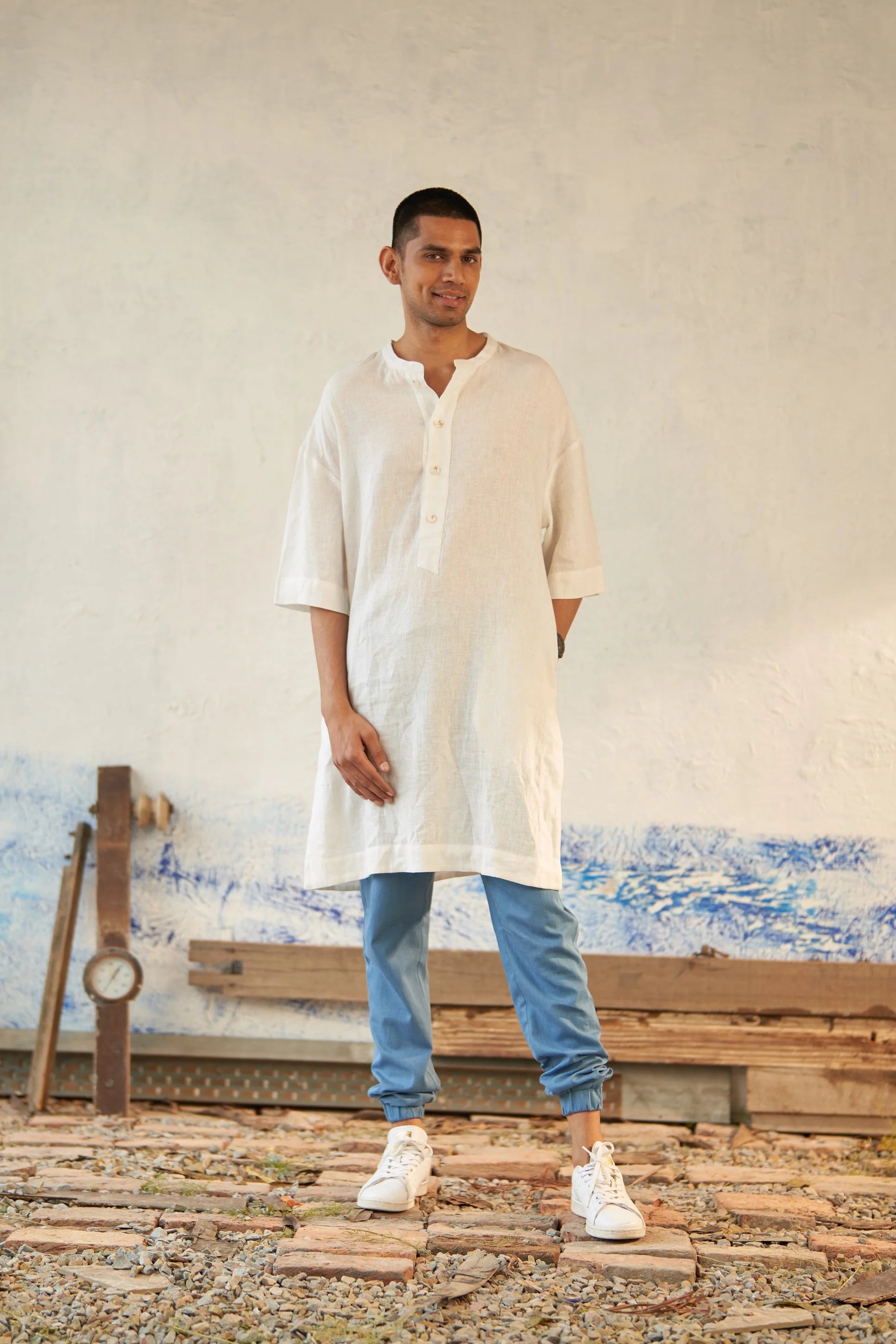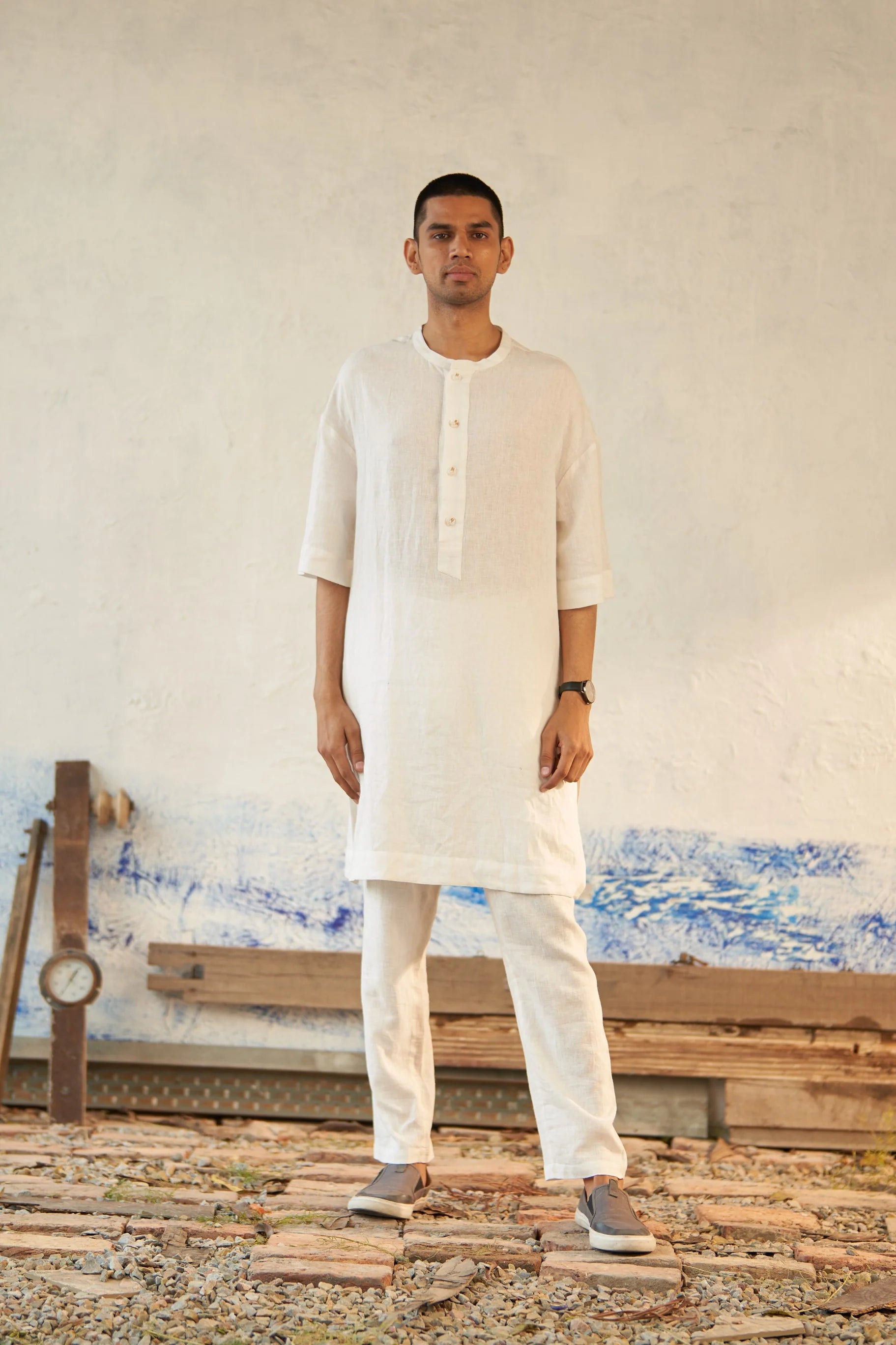 As easy as it could get, a white kurta in the most comfortable and easy silhouette possible. Canoopi's take on a standard white kurta for the perfect spontaneous option for any outing. Crafted from textured flex fabric, it infuses a modern ruggedness into the traditional outfit. It boast a broad, elongated front placket with a diagonal finish, adorned with big buttons for a contemporary touch. Pair it with joggers or pyjamas for a versatile mix.