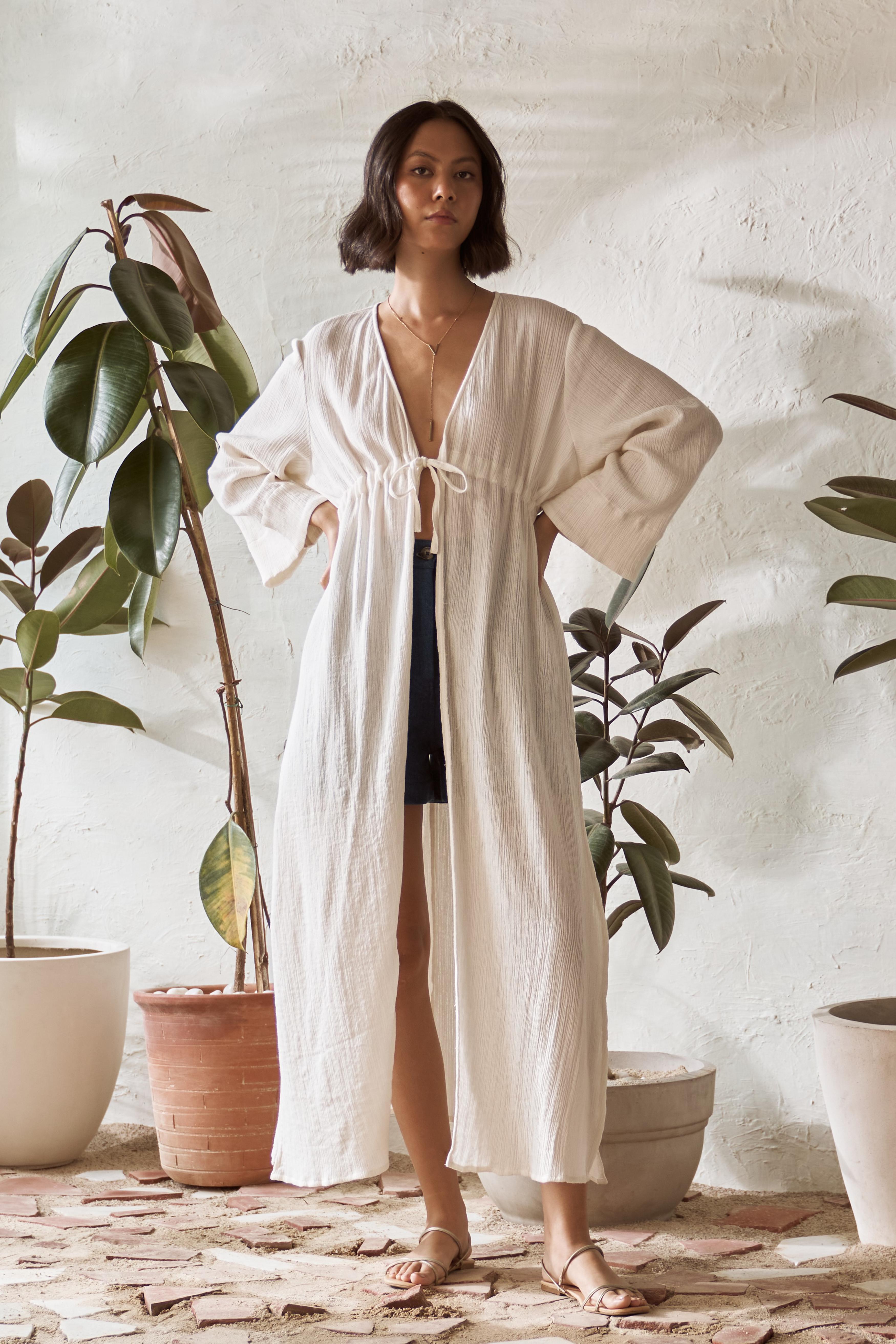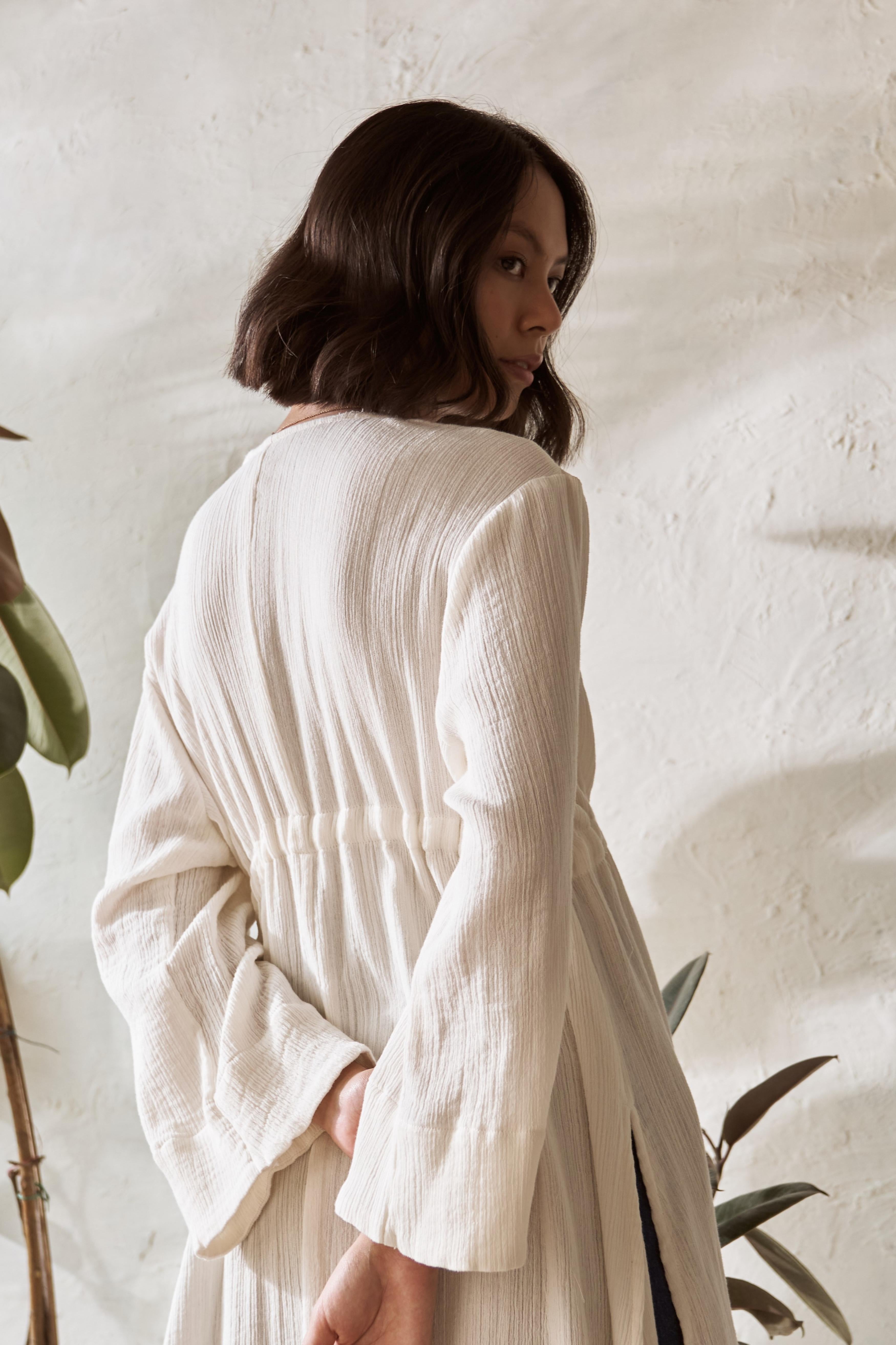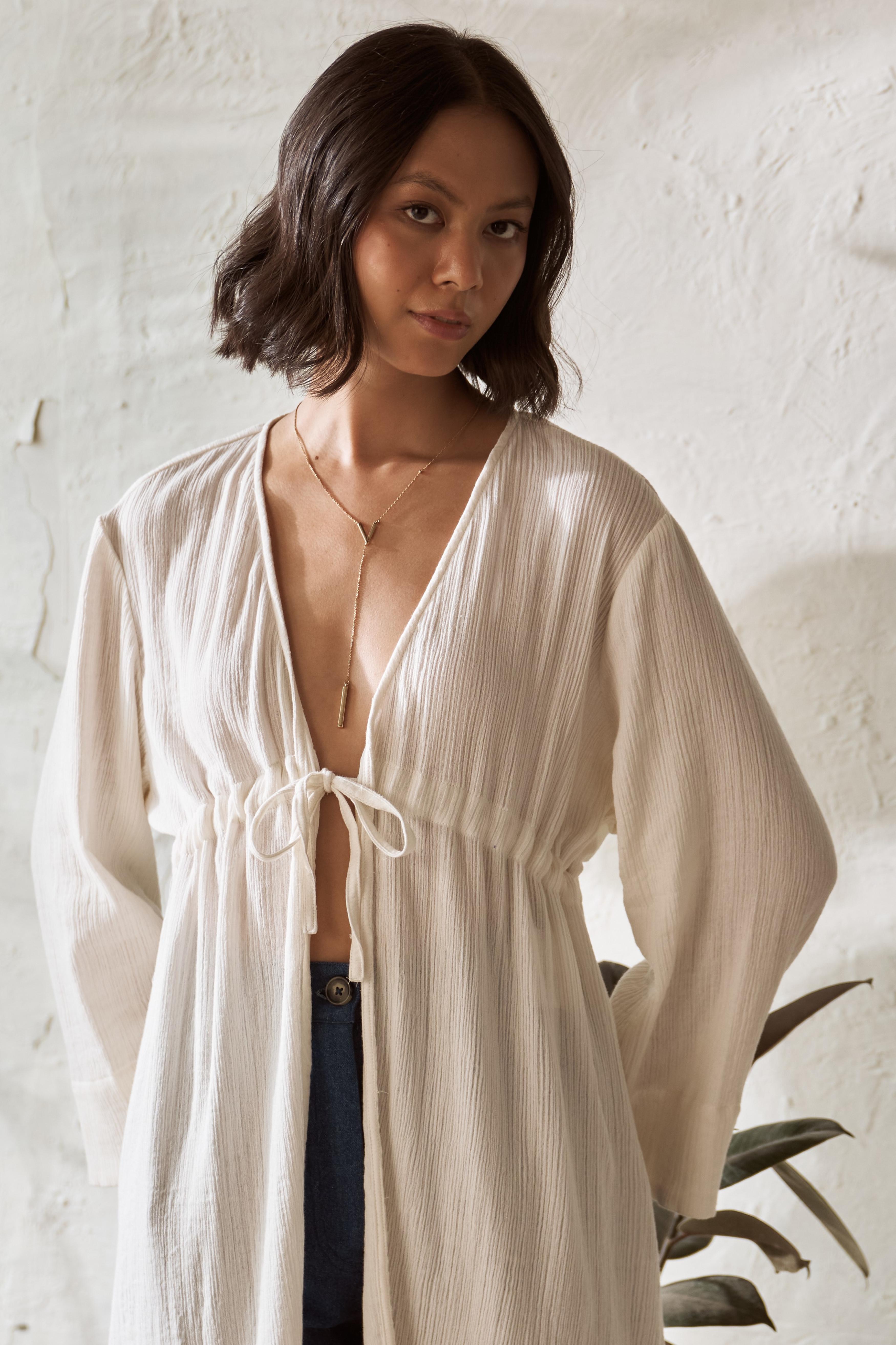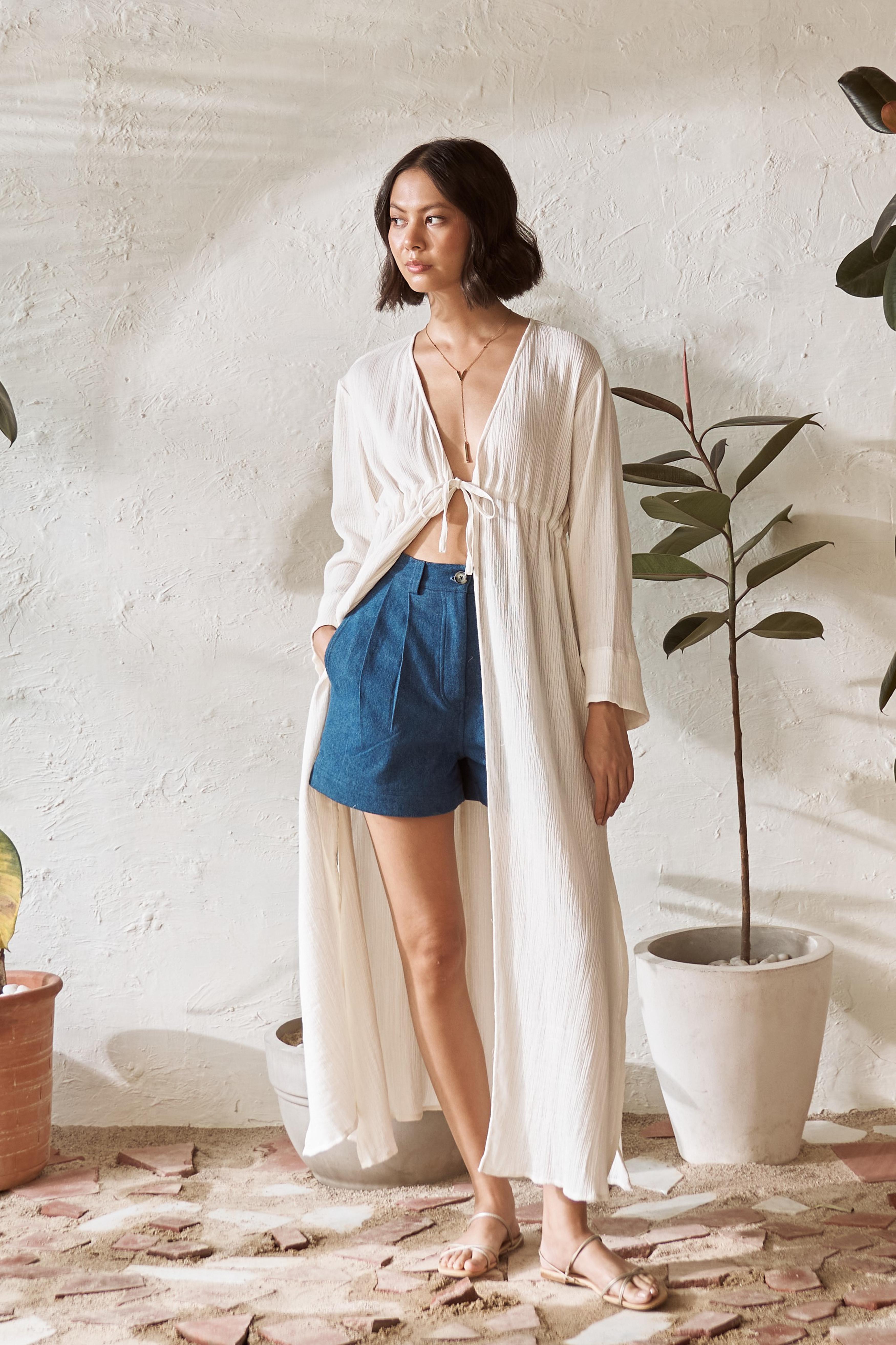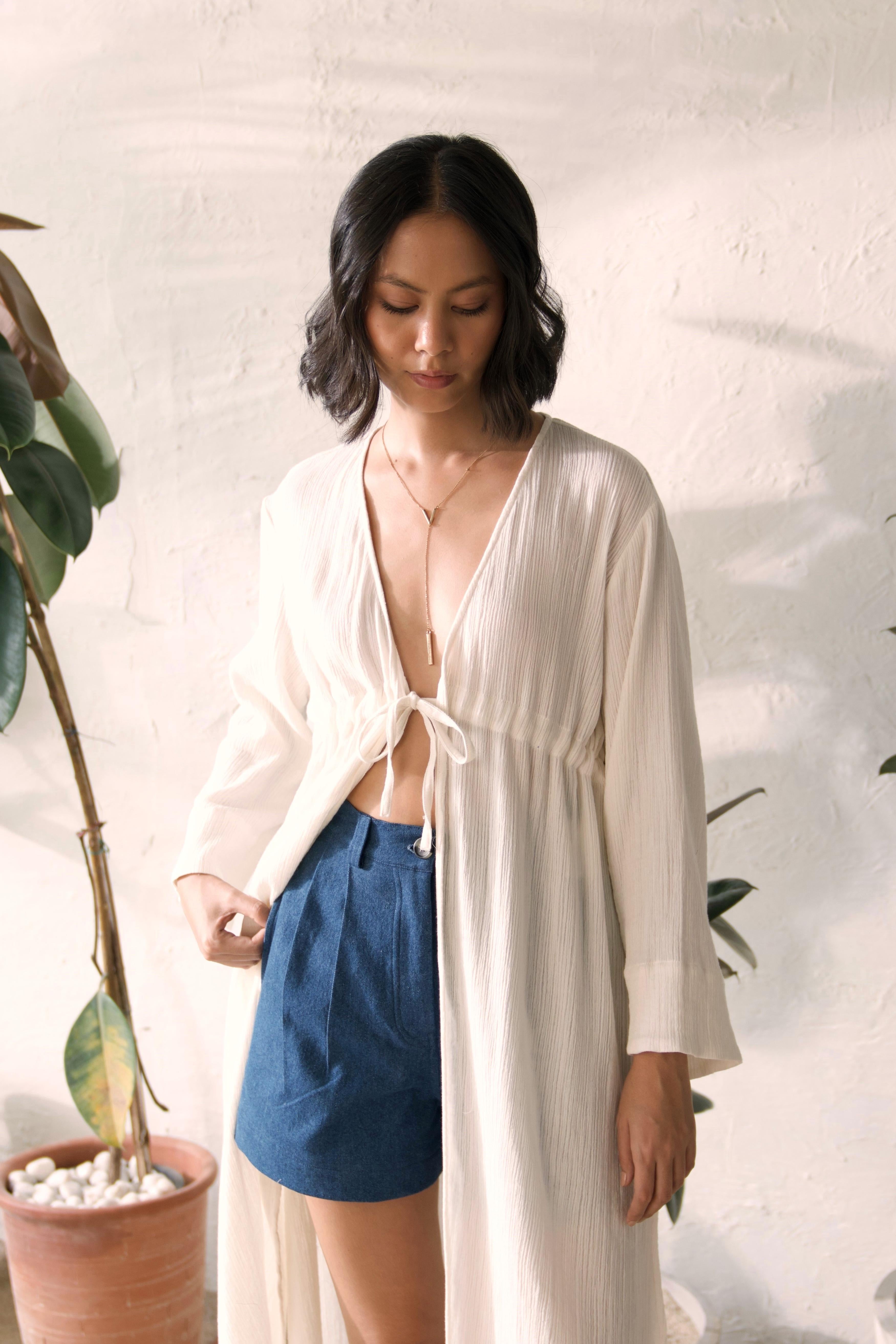 The Dandelion Overlay in pearl white, a chic and versatile long piece designed to elevate any outfit. With a drawstring under the bust for a flattering lengthening effect and playful fringed sleeves for a trendy touch, this overlay effortlessly complements shorts or a short dress. Ideal for both casual and more sophisticated looks, the Dandelion Overlay enhances your body's proportions while adding a fashionable flair. Perfect for any event, this elegant piece ensures you stand out in style.