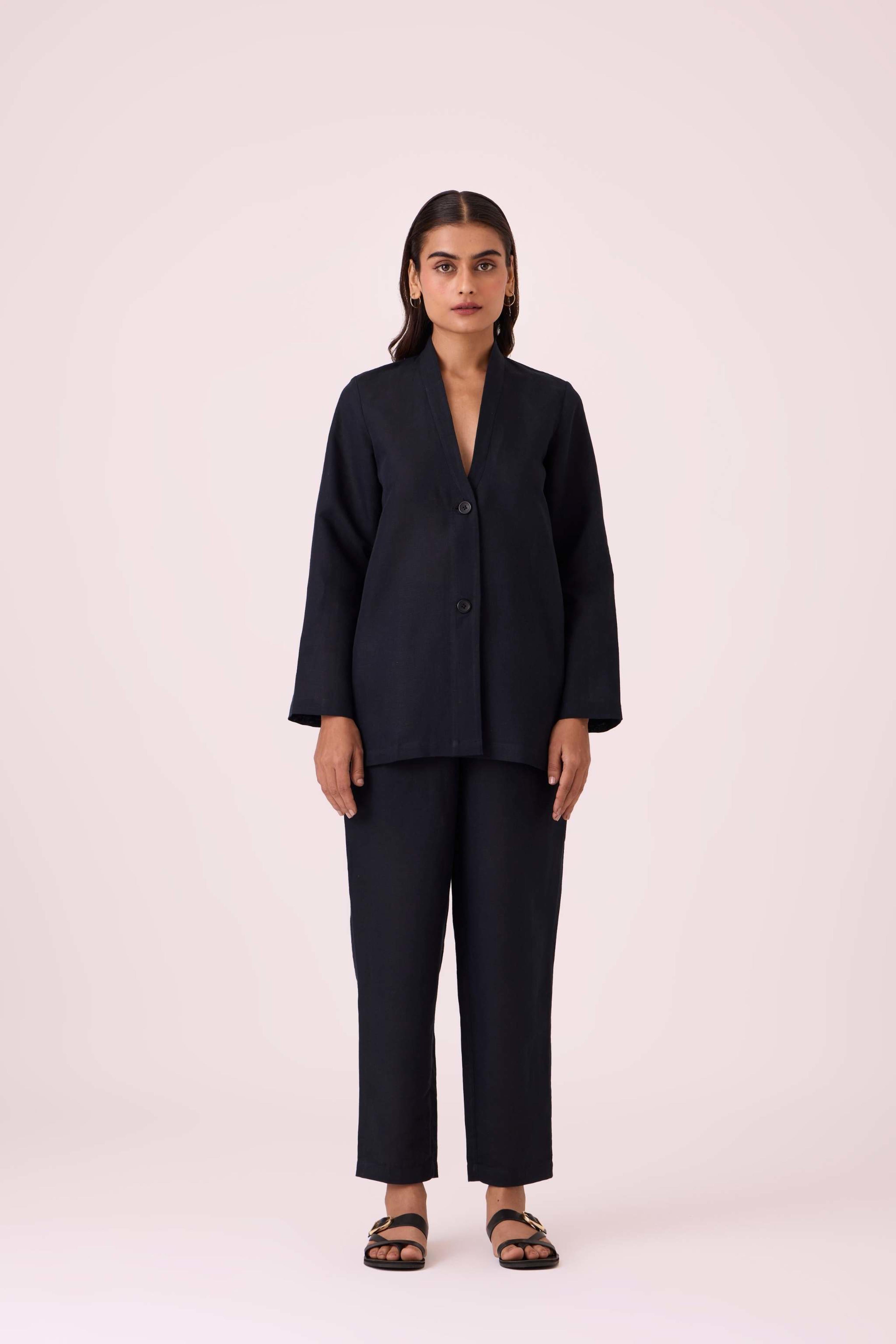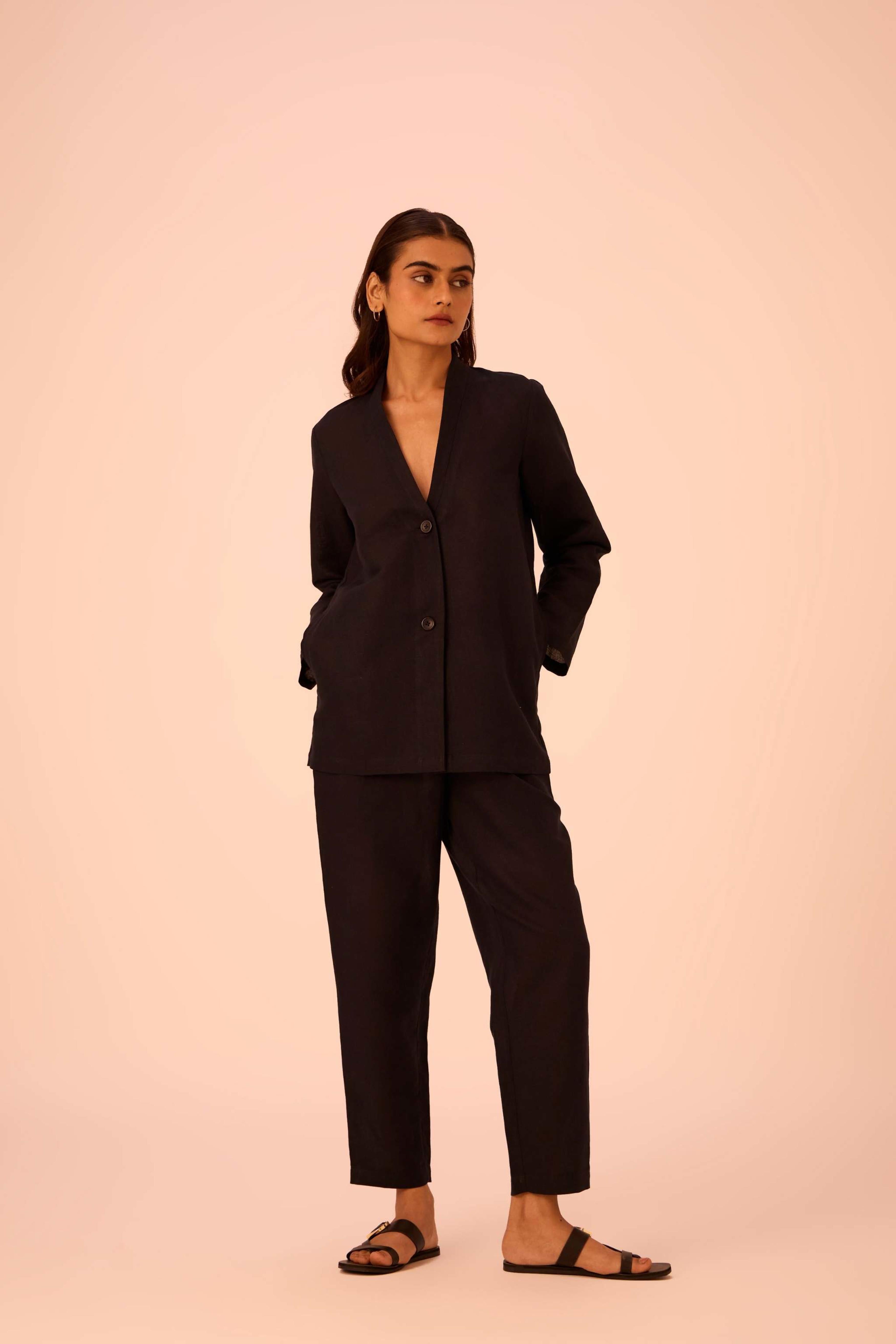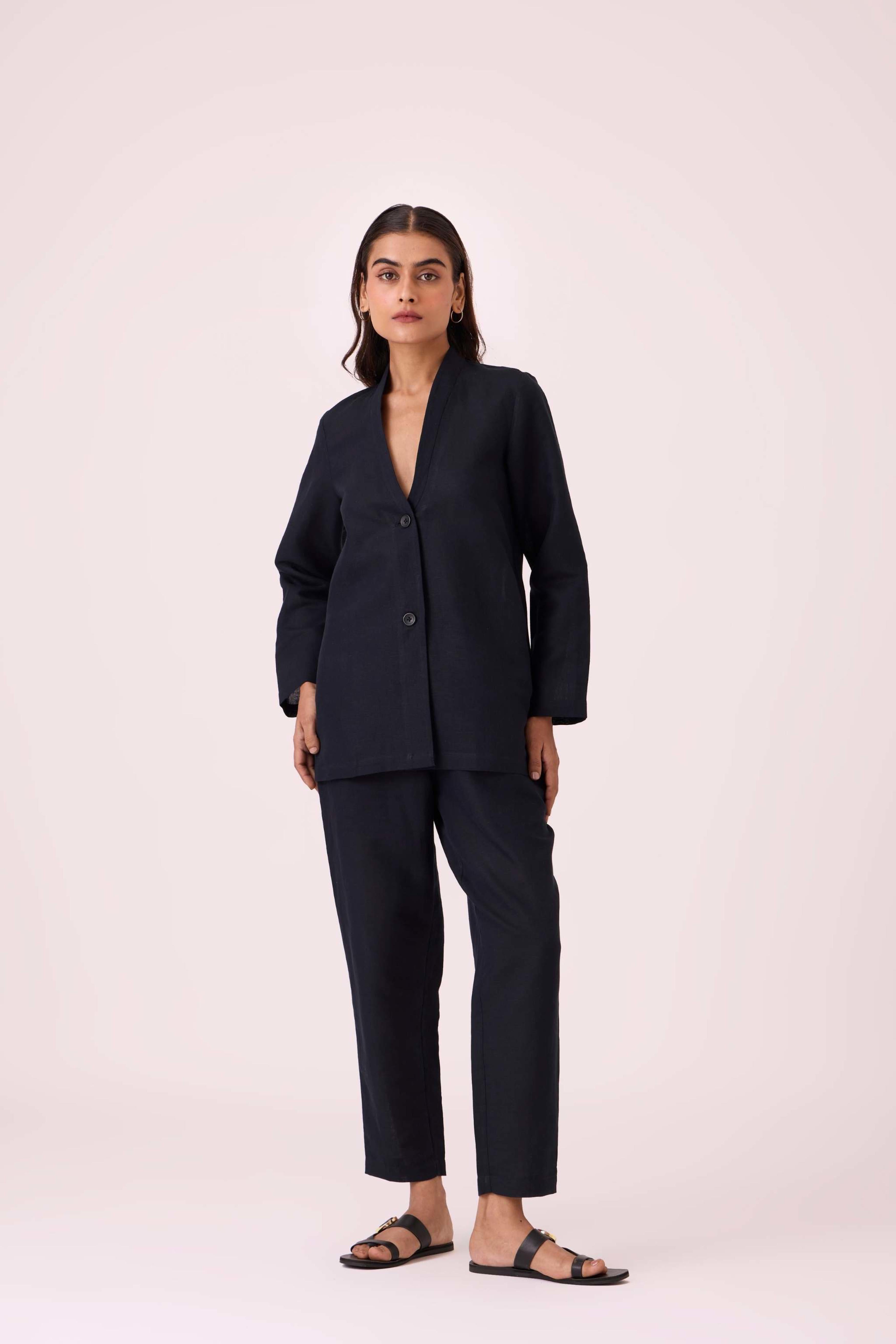 This polished, *single-breasted jacket* has a *regular fit* and a distinctive *V-neck* without a lapel. It features a *high-neck collar with a neck dart* for a refined silhouette. The jacket has *full sleeves* and practical *in-seam pockets*. It's perfect for a *layered look*, and *matching pants are available*. The model, Chhavi, is 5'6" and is wearing a size XS.