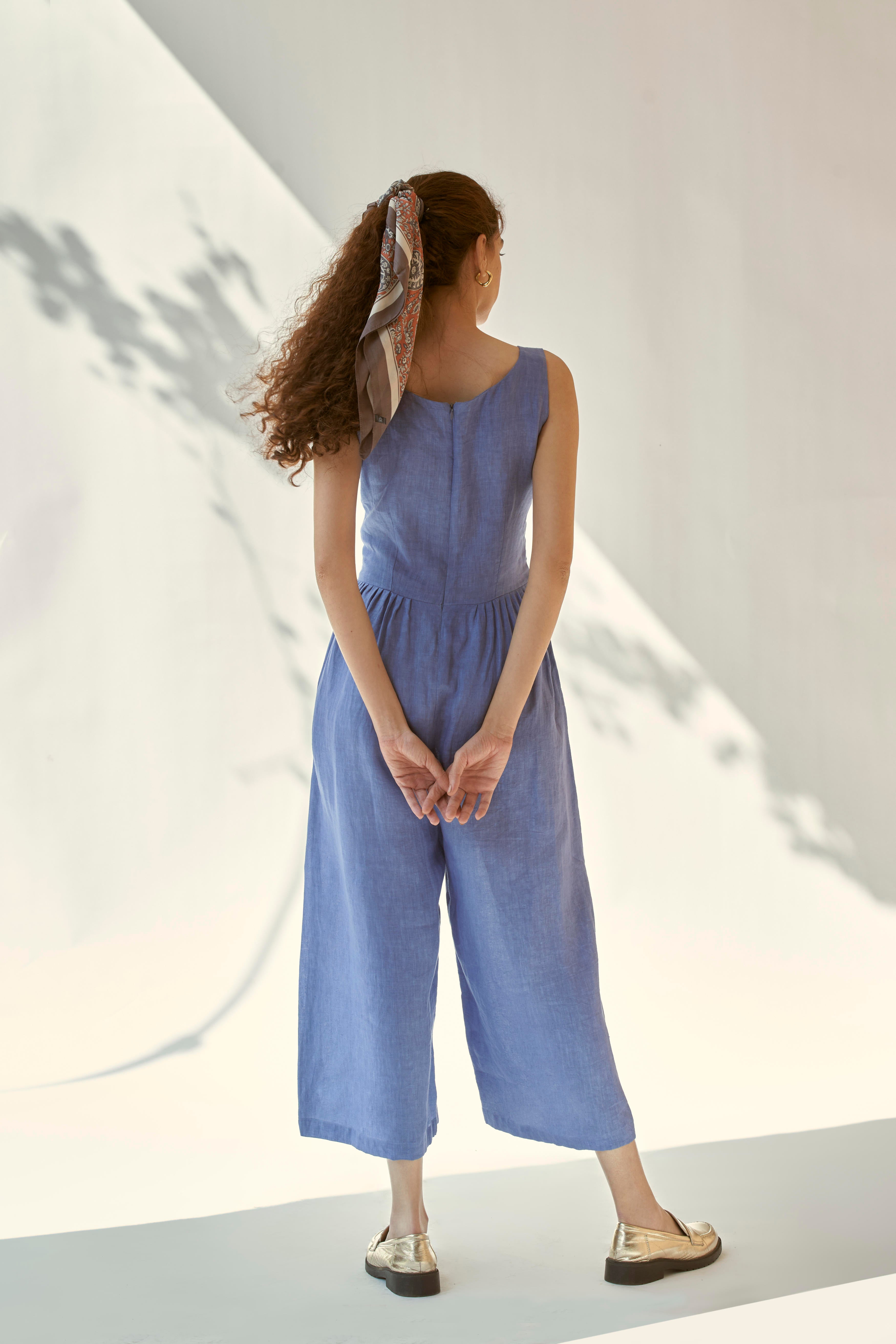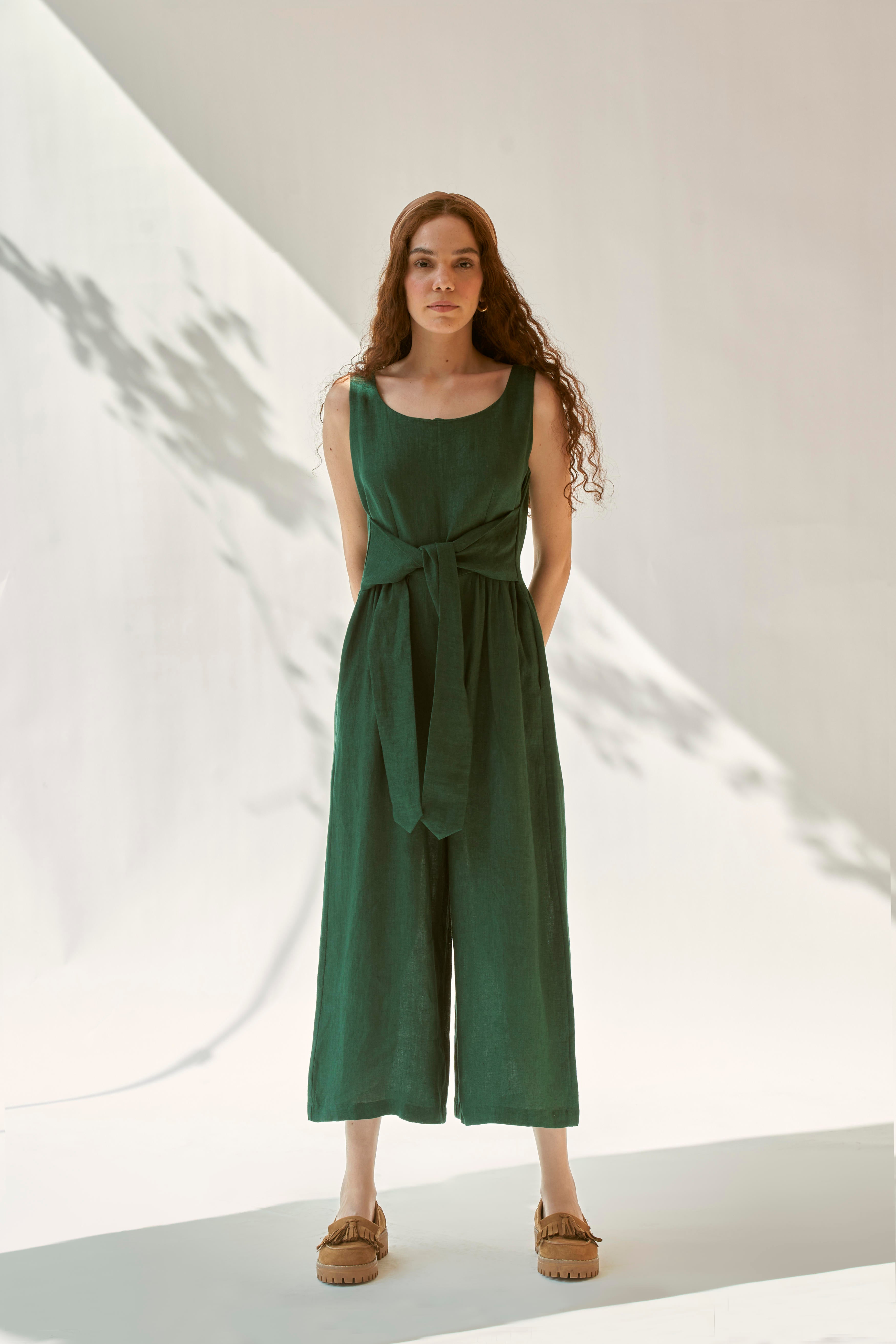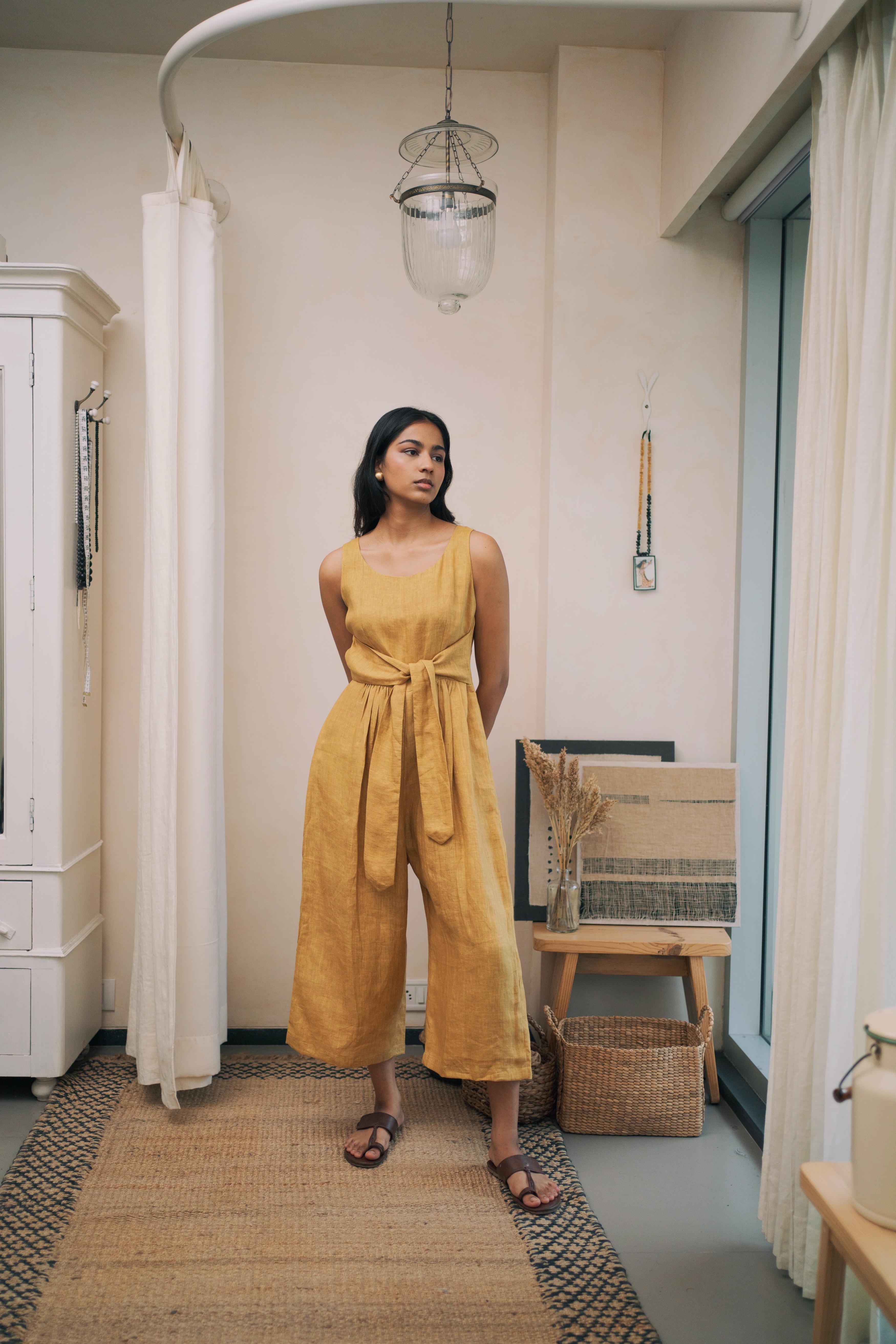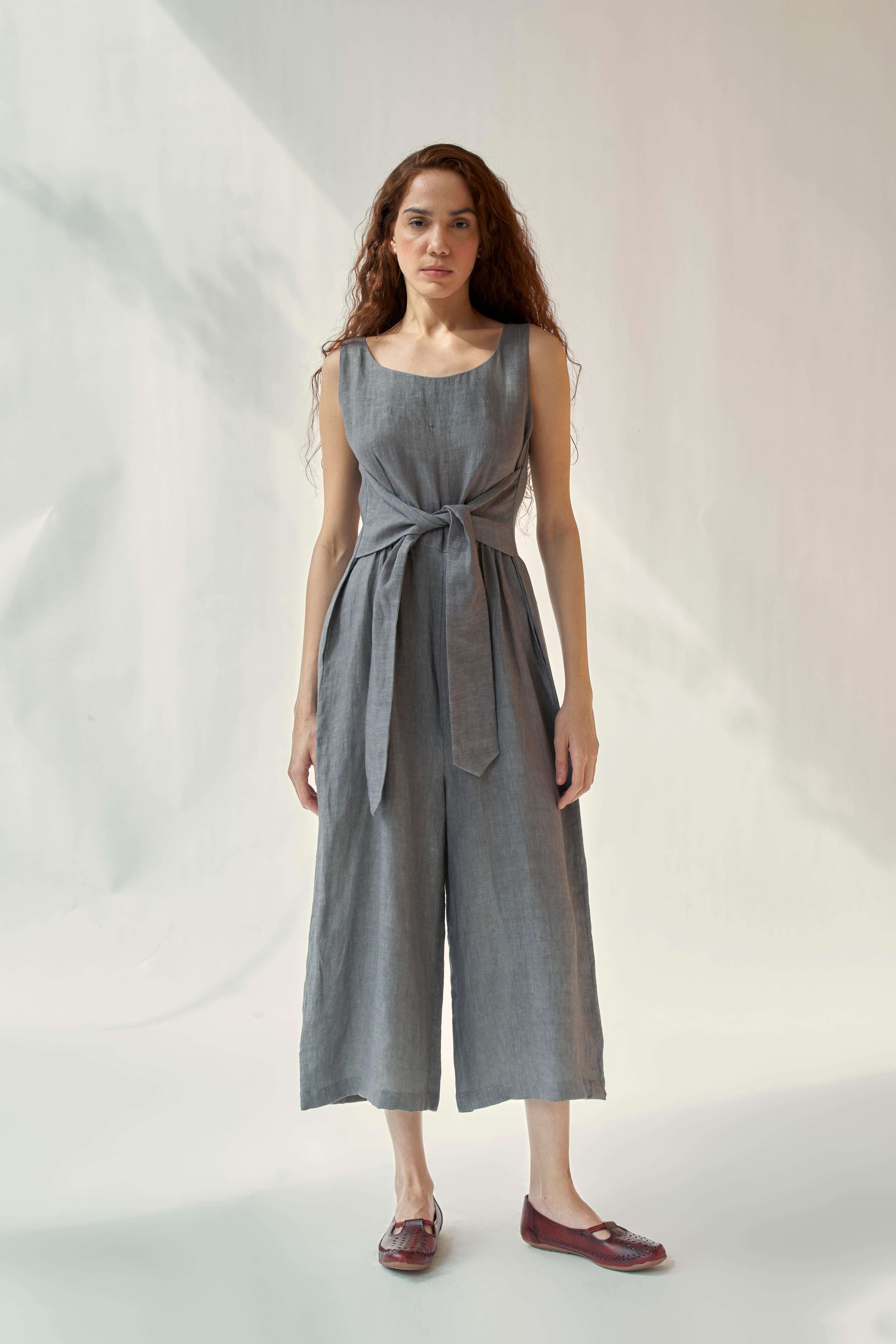 A beautiful new addition to our jumpsuit collection ‘Beyond Basic’ is a timeless & minimalistic linen jumpsuit with a tie up front. Sleeveless & wide-legged. Side pocket concealed zip at the back for added convenience.