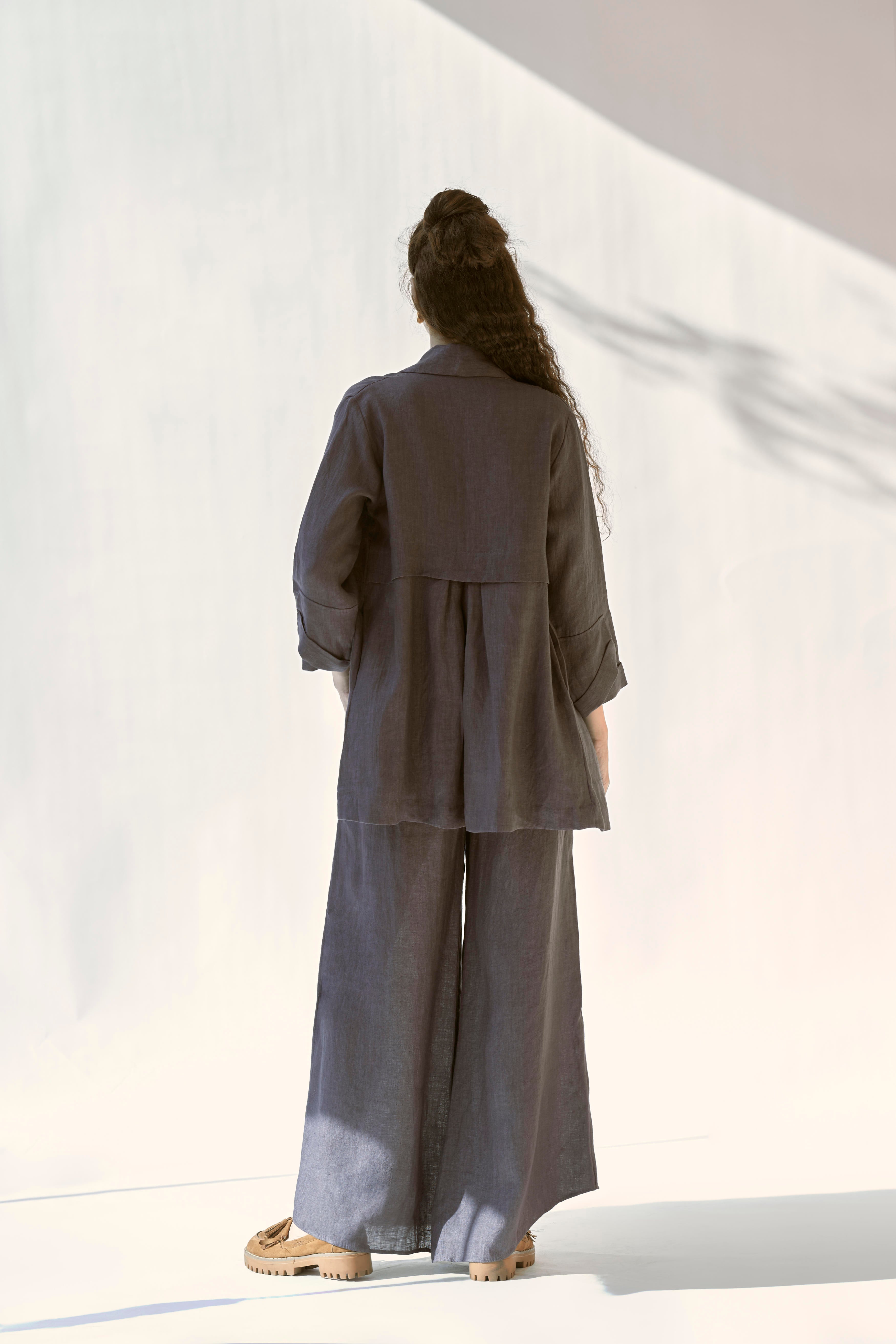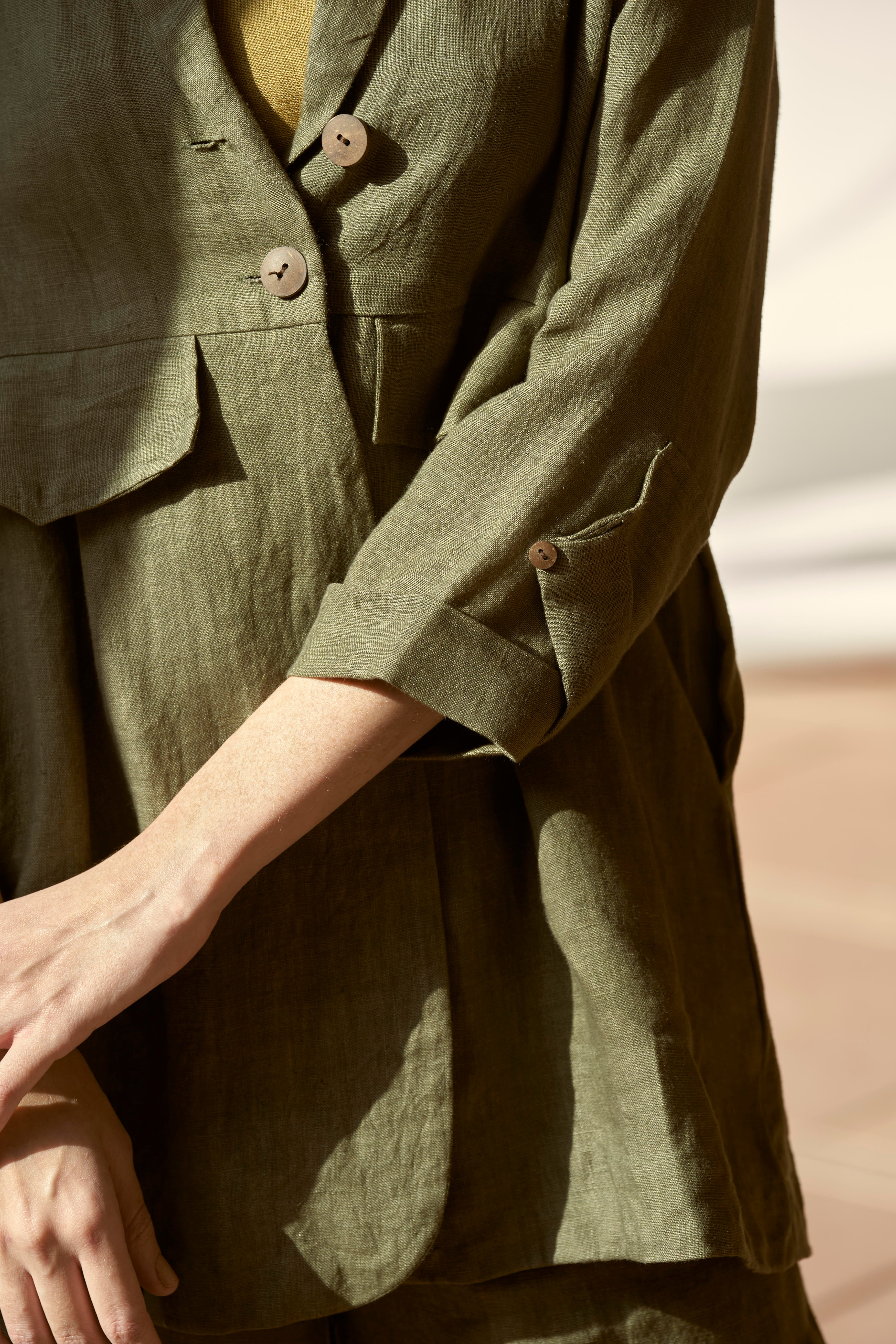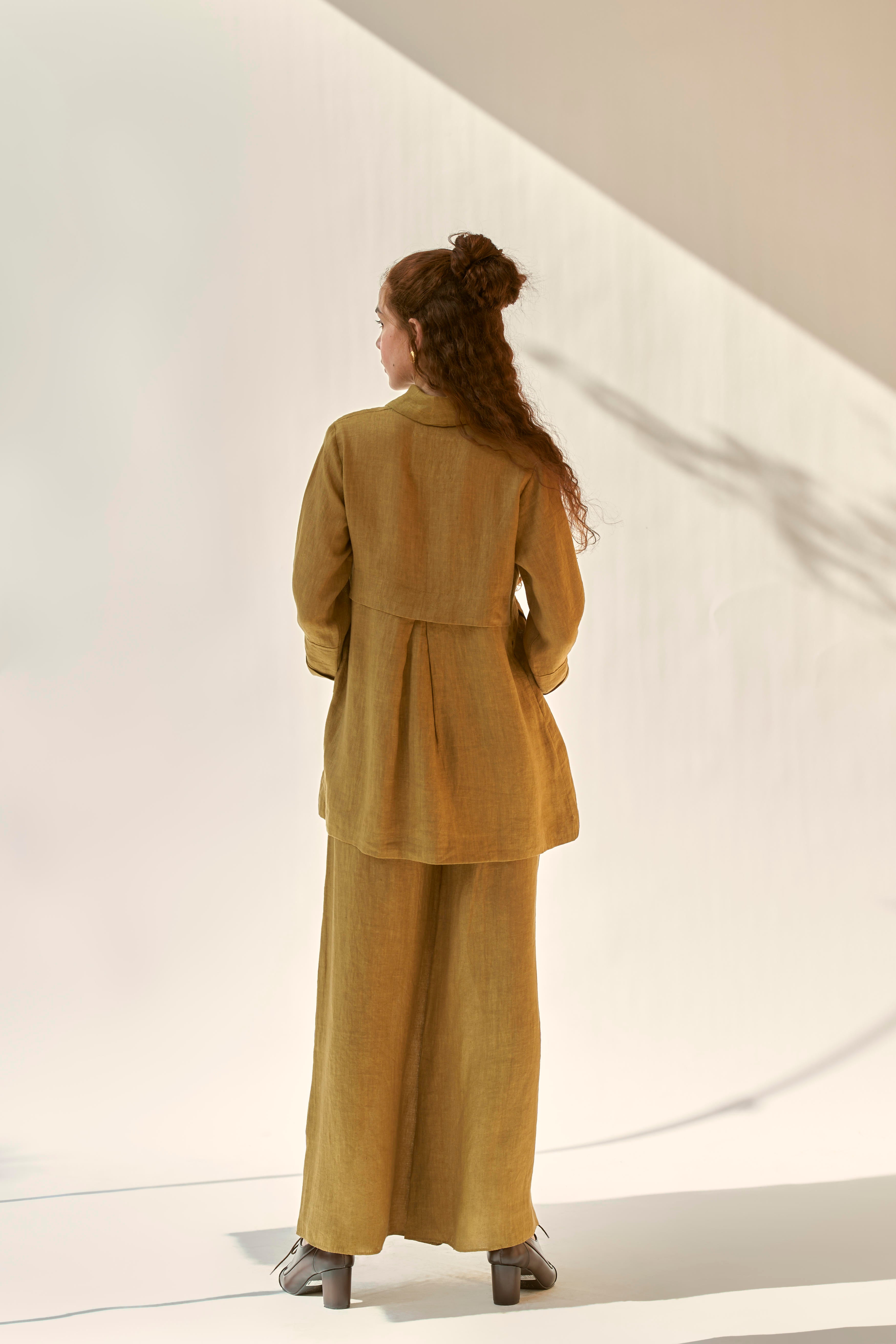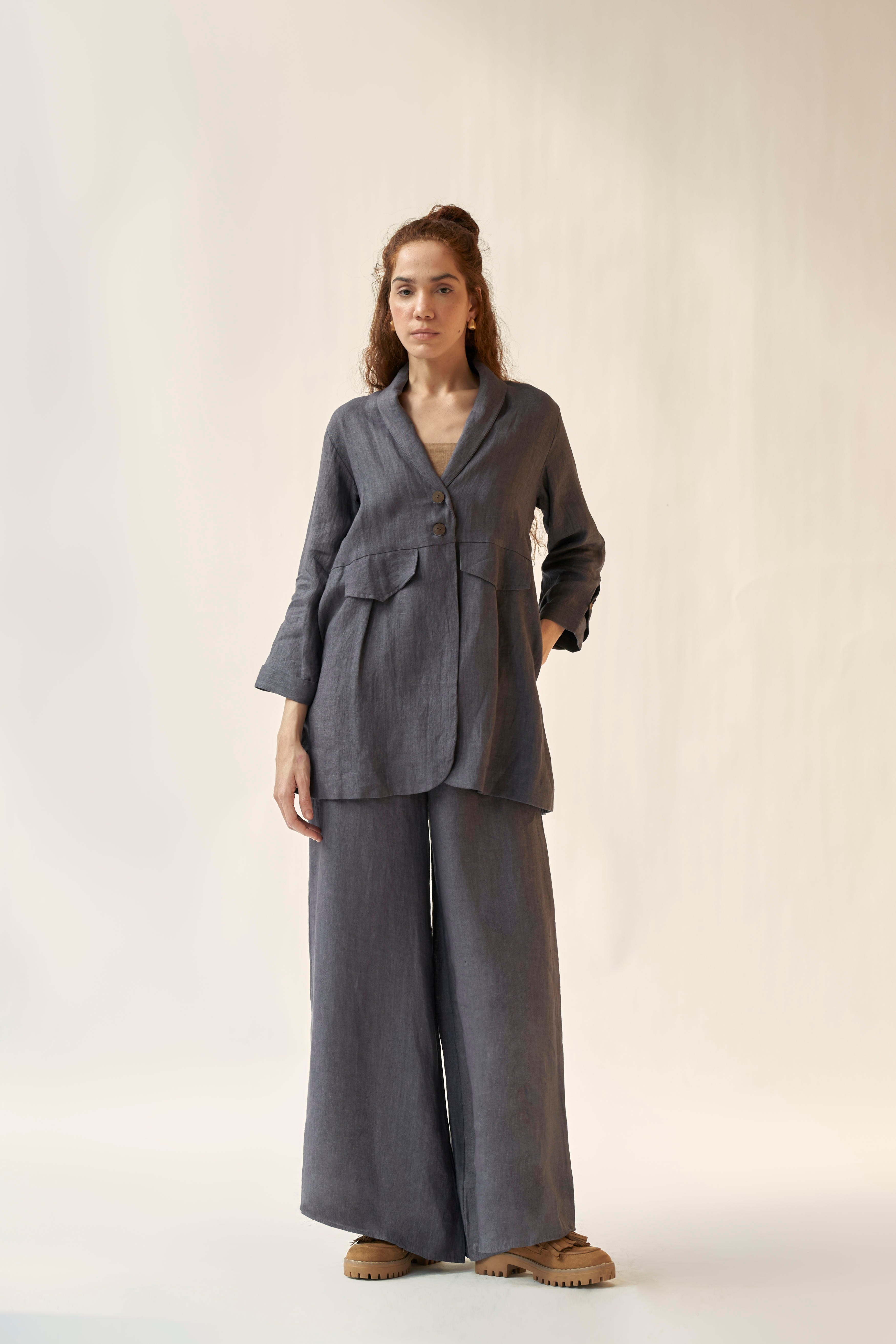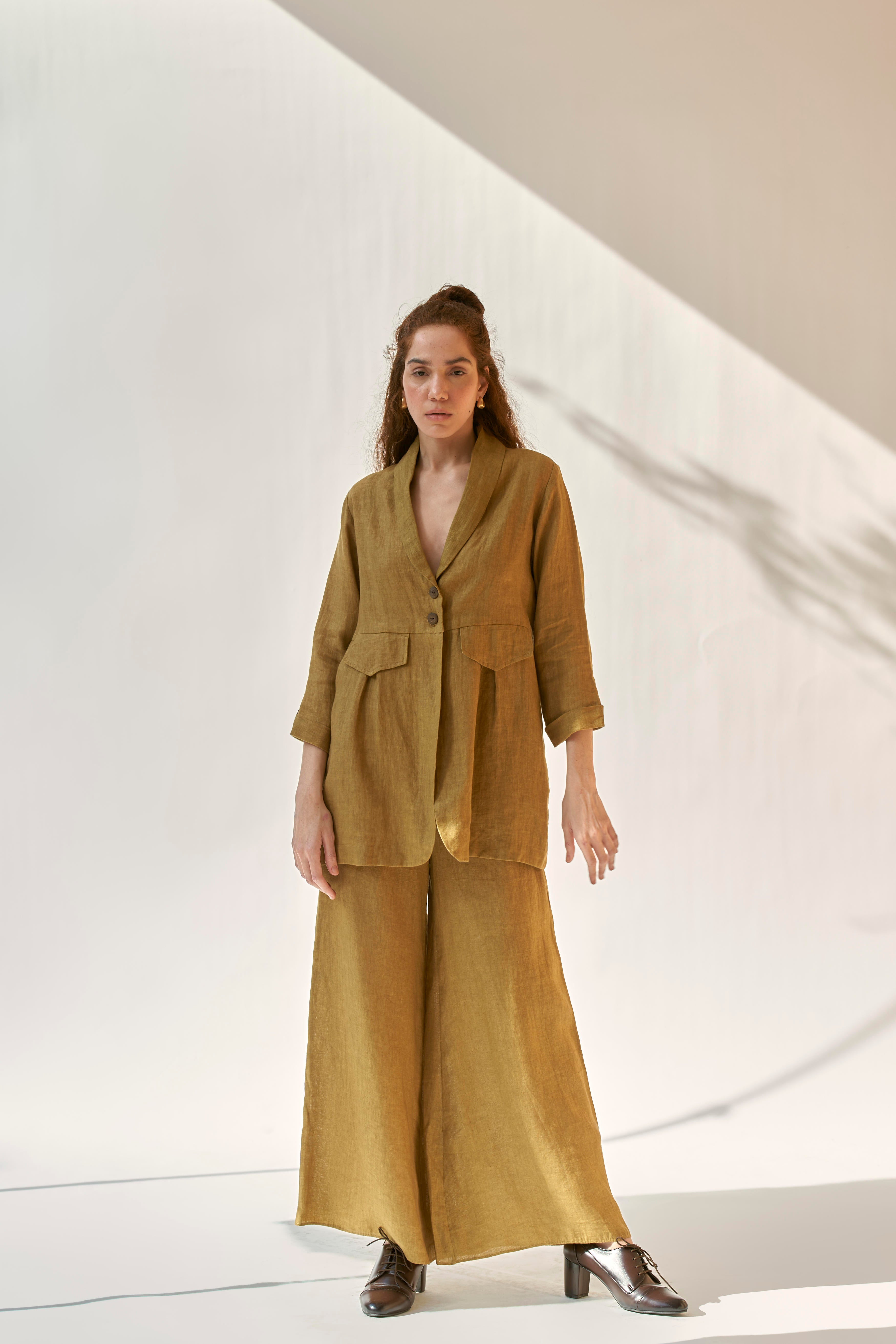 A stylish two piece set consisting of a blazer with classic lapels, featuring a distinctive silhouette & unique cuffs on the sleeves with beautiful wooden buttons accentuating it’s appeal. With attention to its detail, the striking silhouette of the blazer makes it a statement piece for an evening look along with an individualistic style for a formal outfit in the world of classic suits. It is paired with our beloved “Pondi Pants” featuring two pockets on the sides.