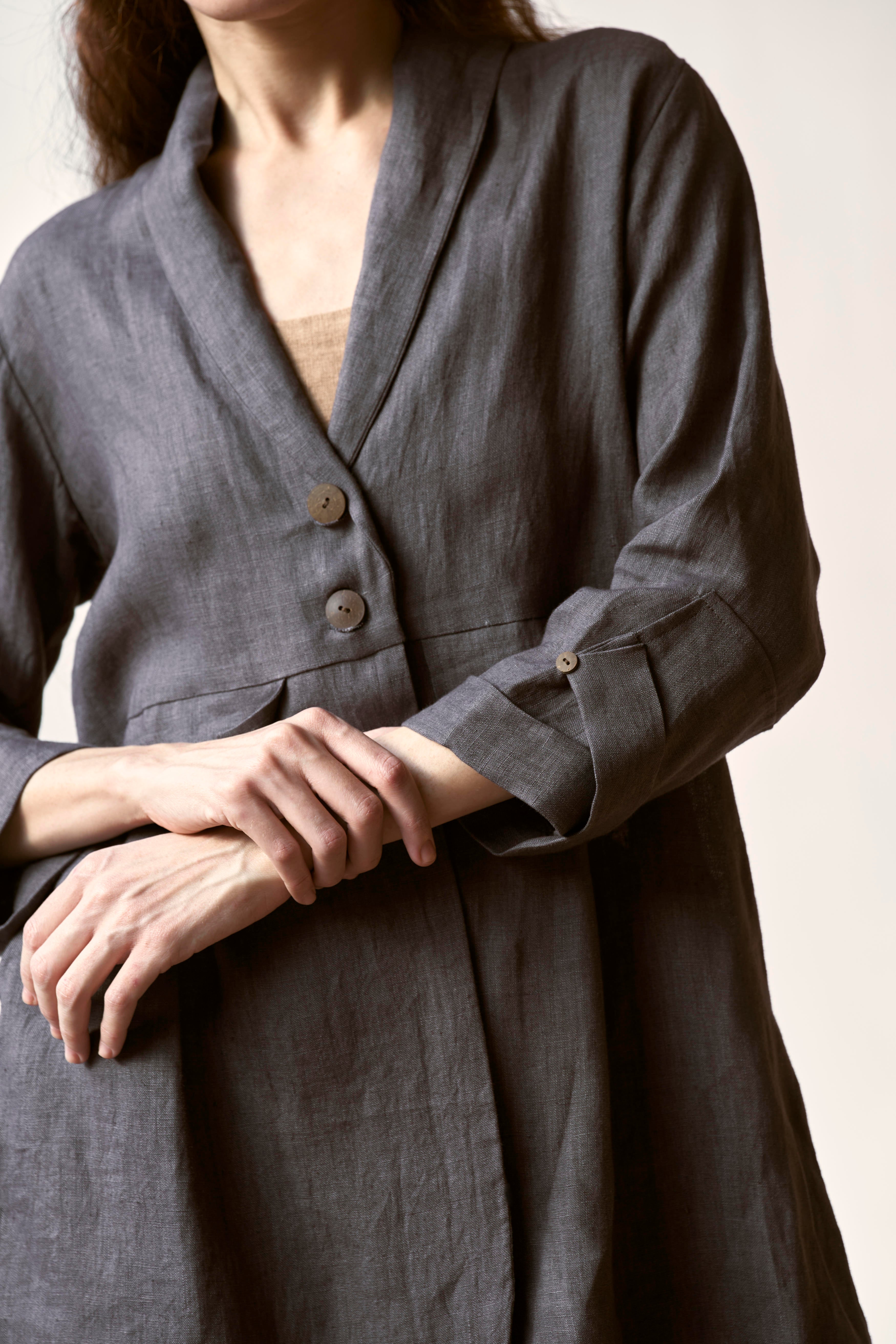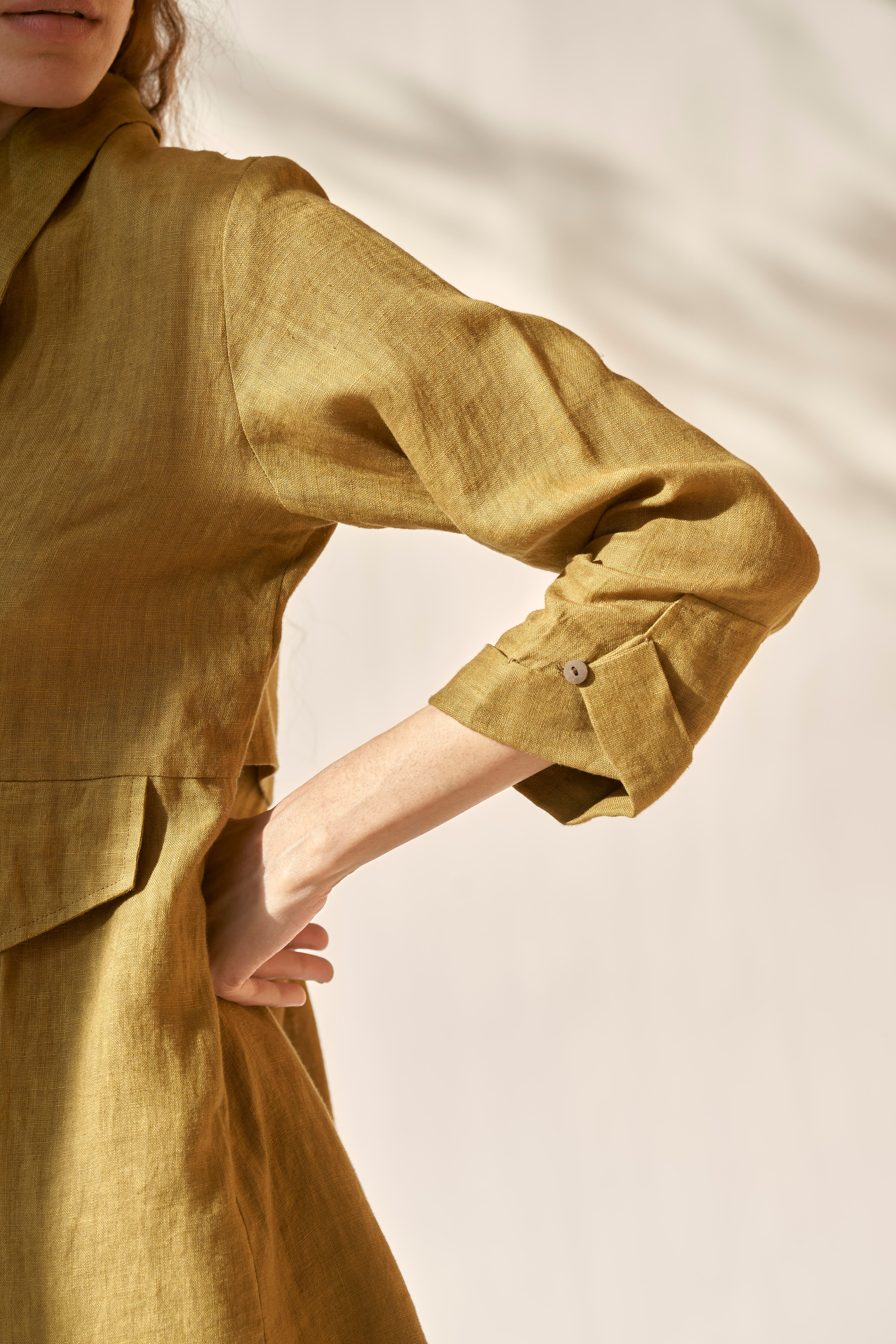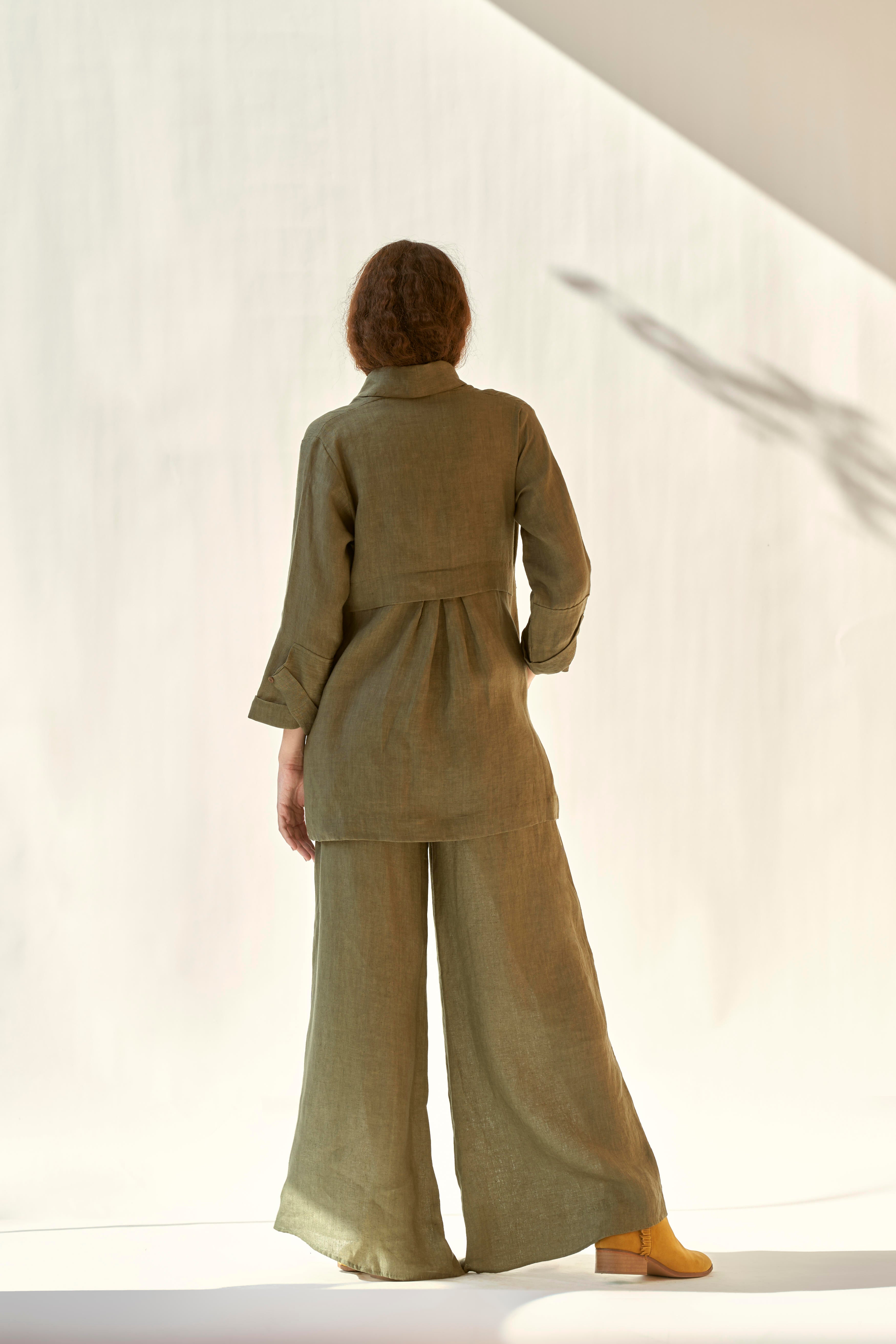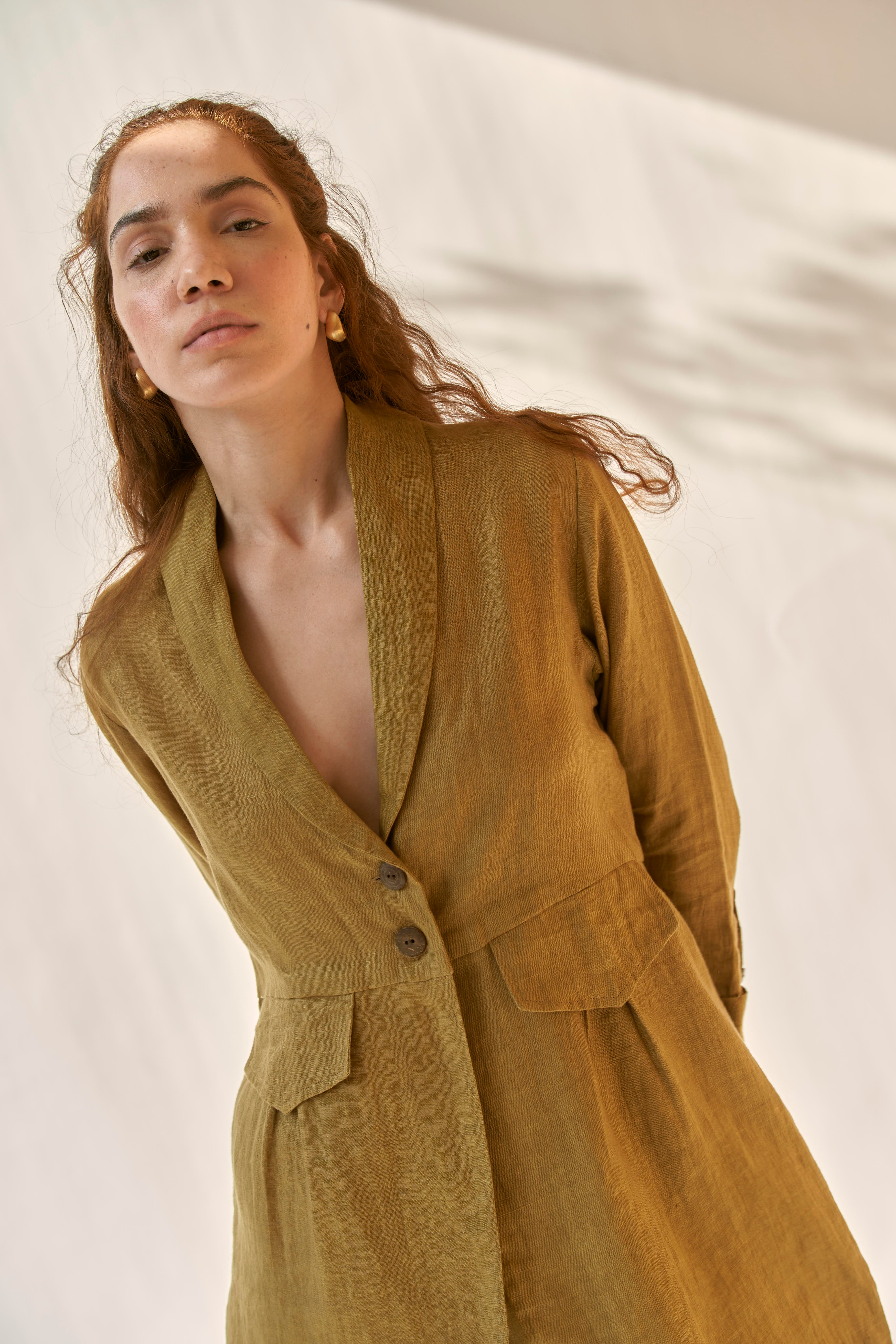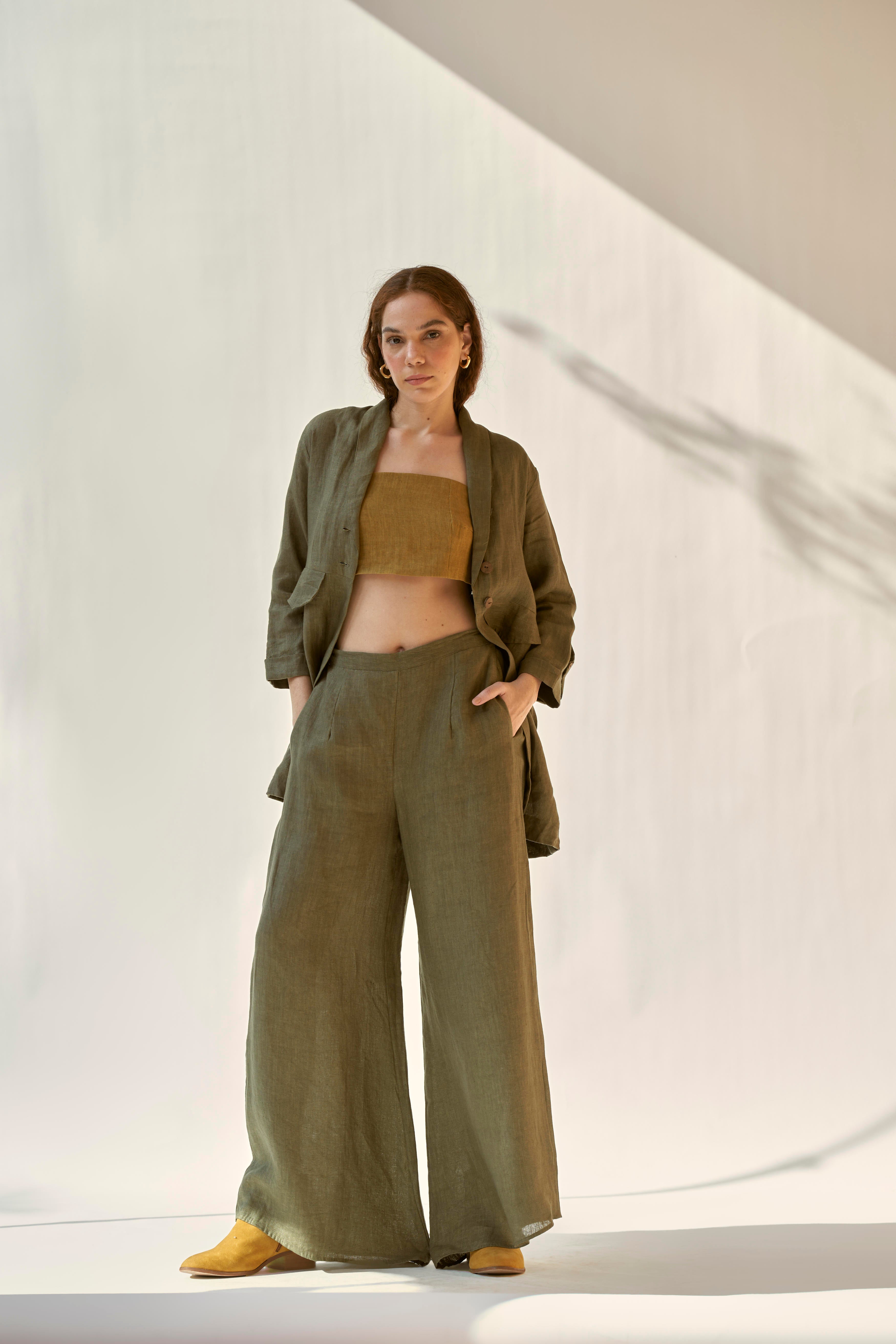 A stylish two piece set consisting of a blazer with classic lapels, featuring a distinctive silhouette & unique cuffs on the sleeves with beautiful wooden buttons accentuating it’s appeal. With attention to its detail, the striking silhouette of the blazer makes it a statement piece for an evening look along with an individualistic style for a formal outfit in the world of classic suits. It is paired with our beloved “Pondi Pants” featuring two pockets on the sides.