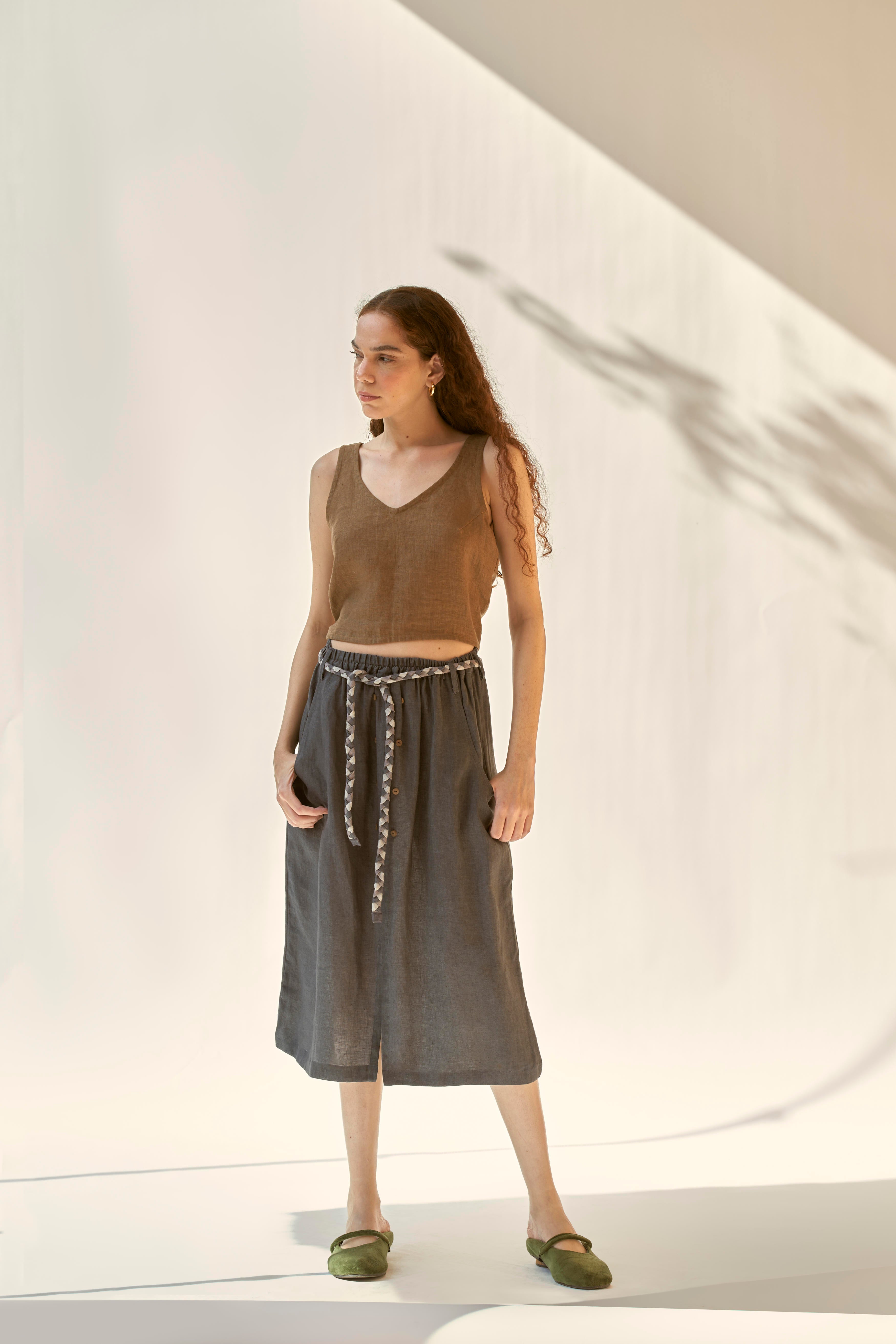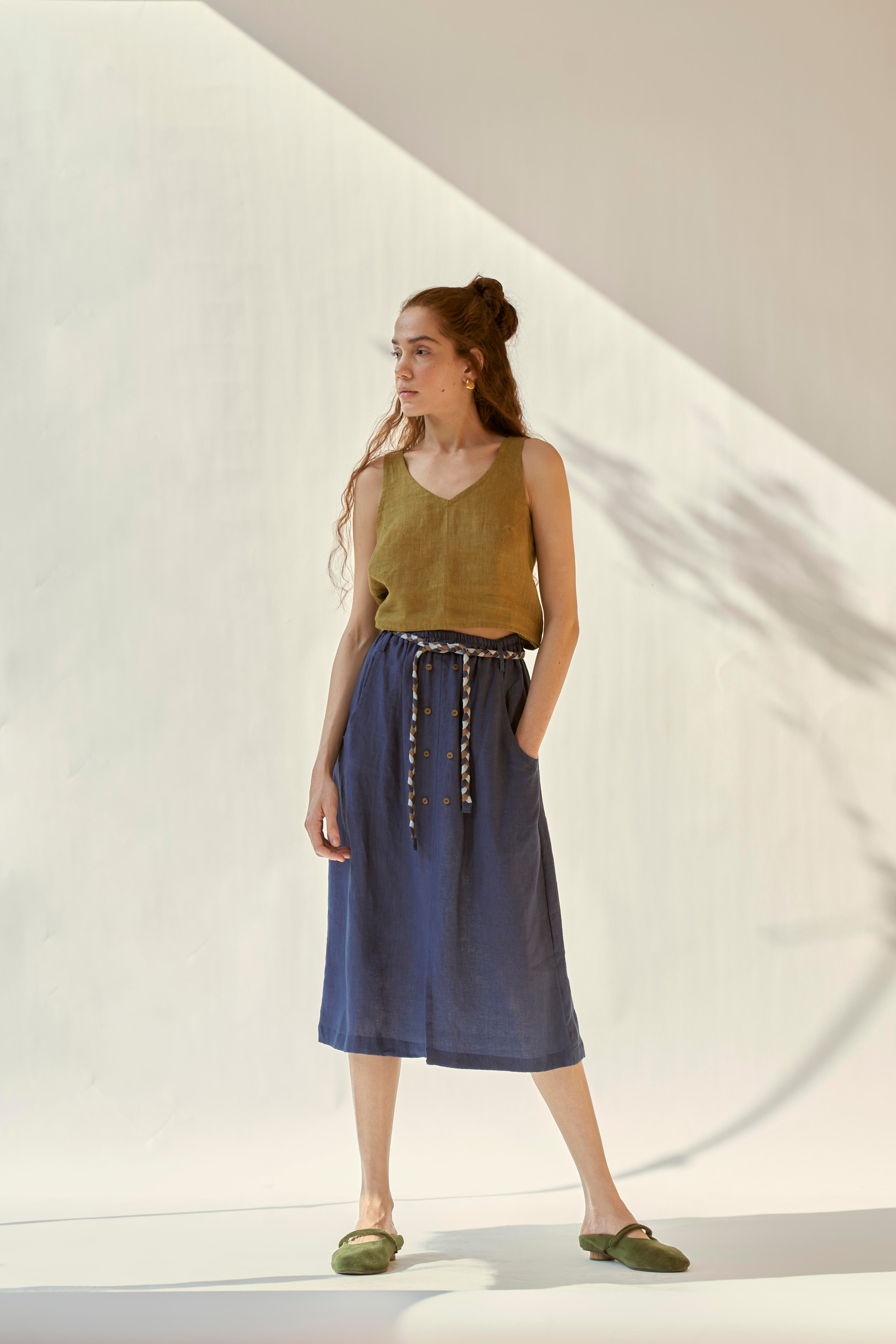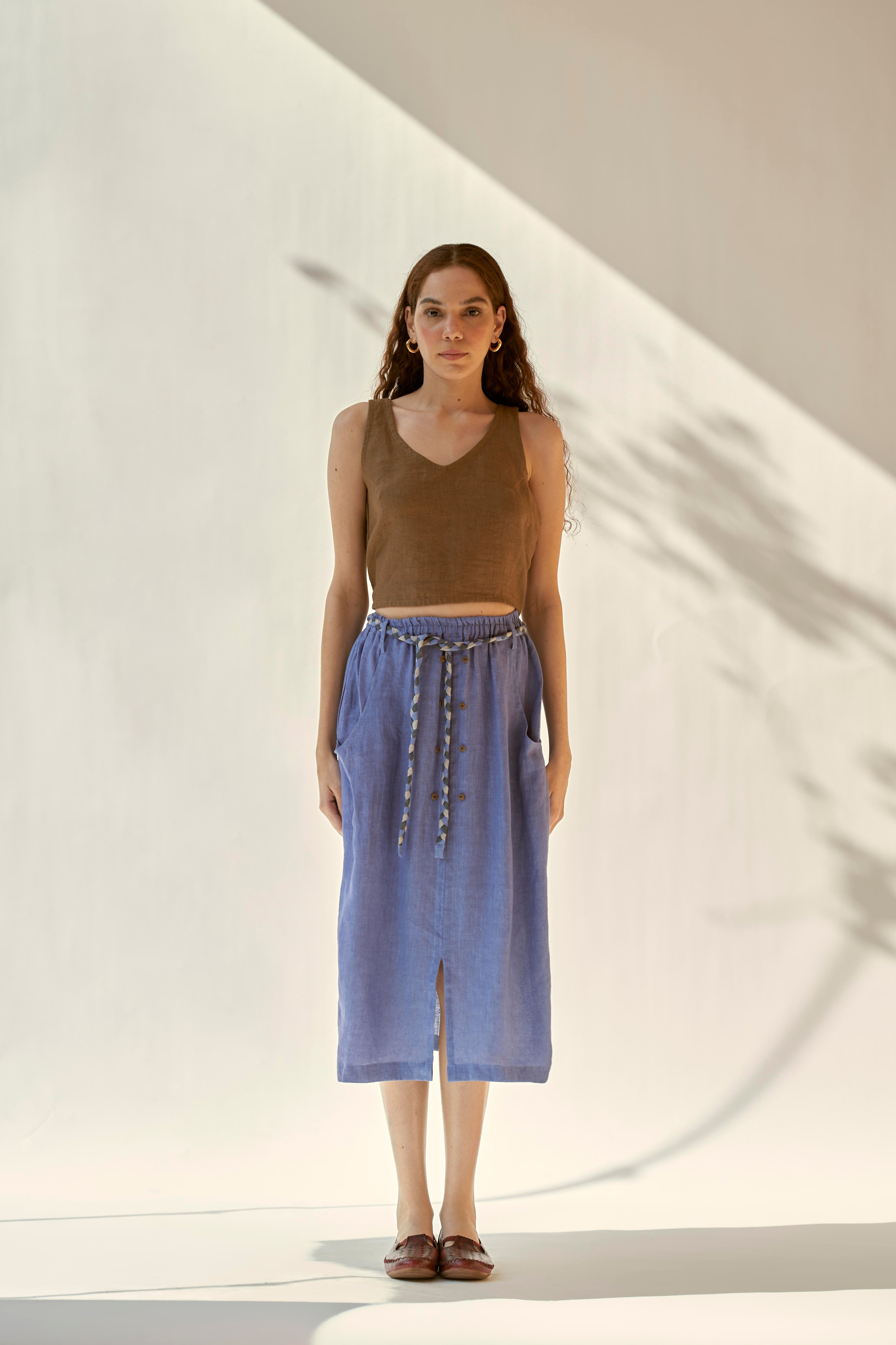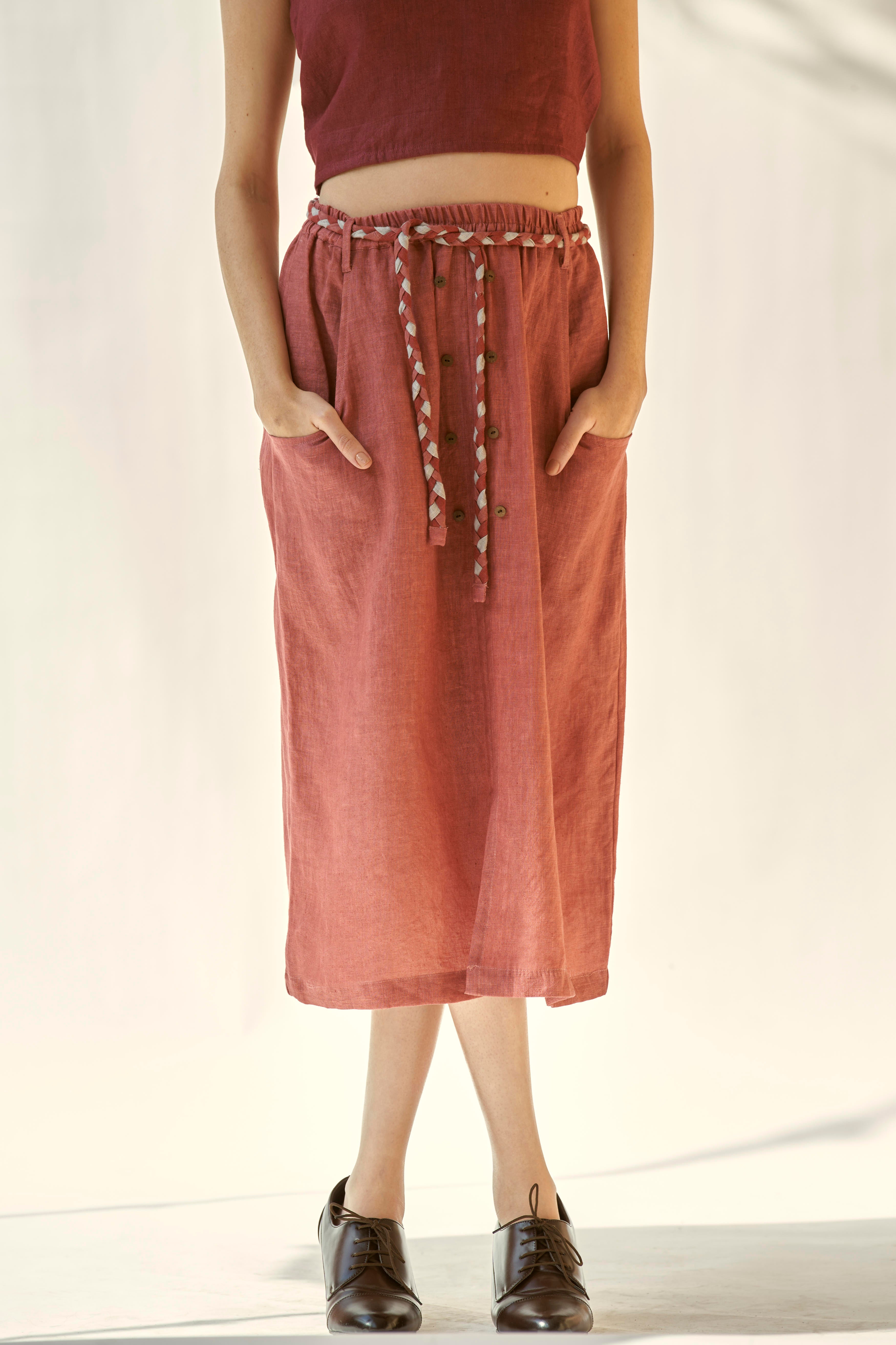 Linen skirt with elasticated waist and beautiful braided belt. The skirt falls to the mid-length and features a small slit at the center front. Paired with a top with a low cut back which gets fastened with a knot. To further add to it’s charm , skirt comes with a small slit at the centre front and two functional pockets.