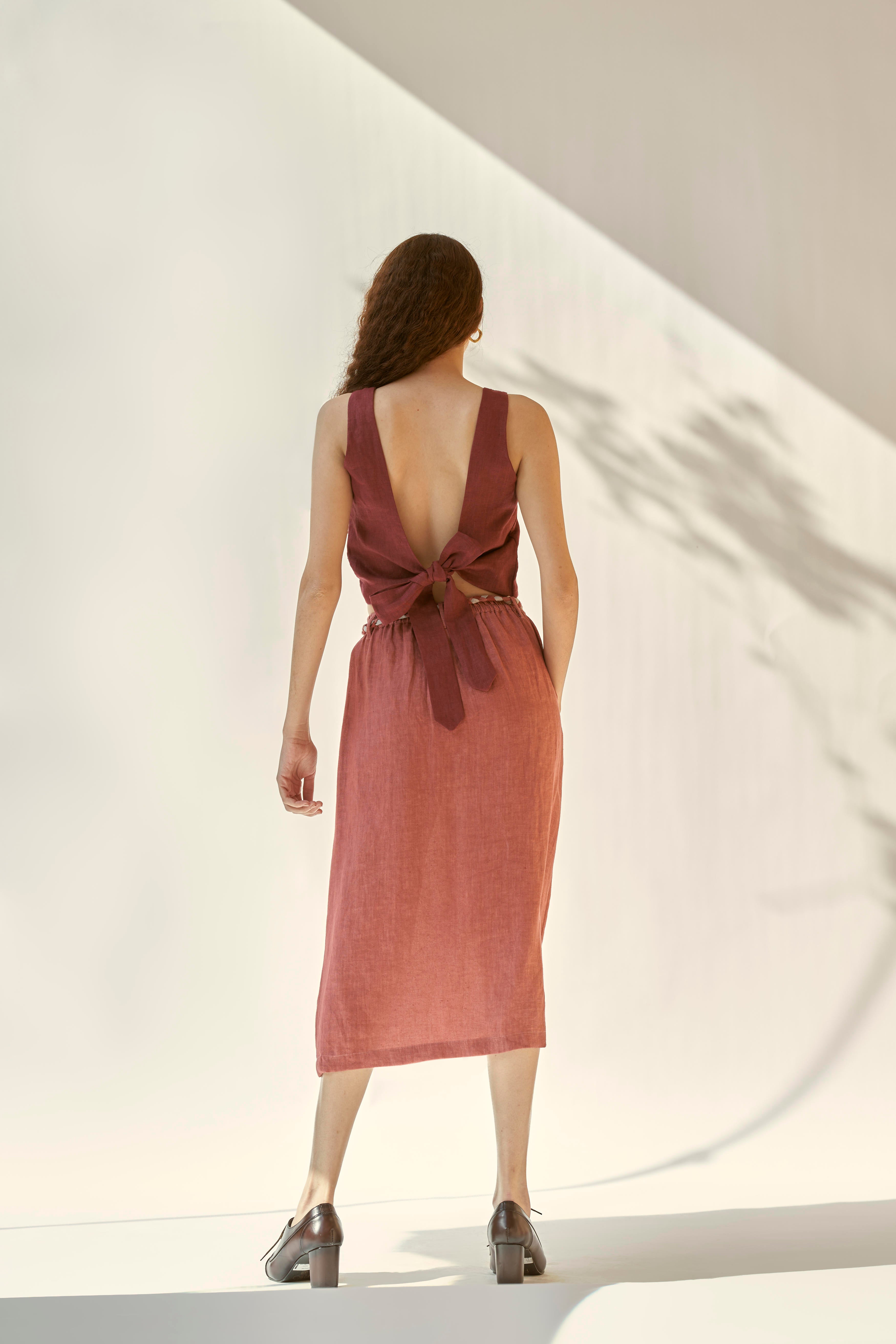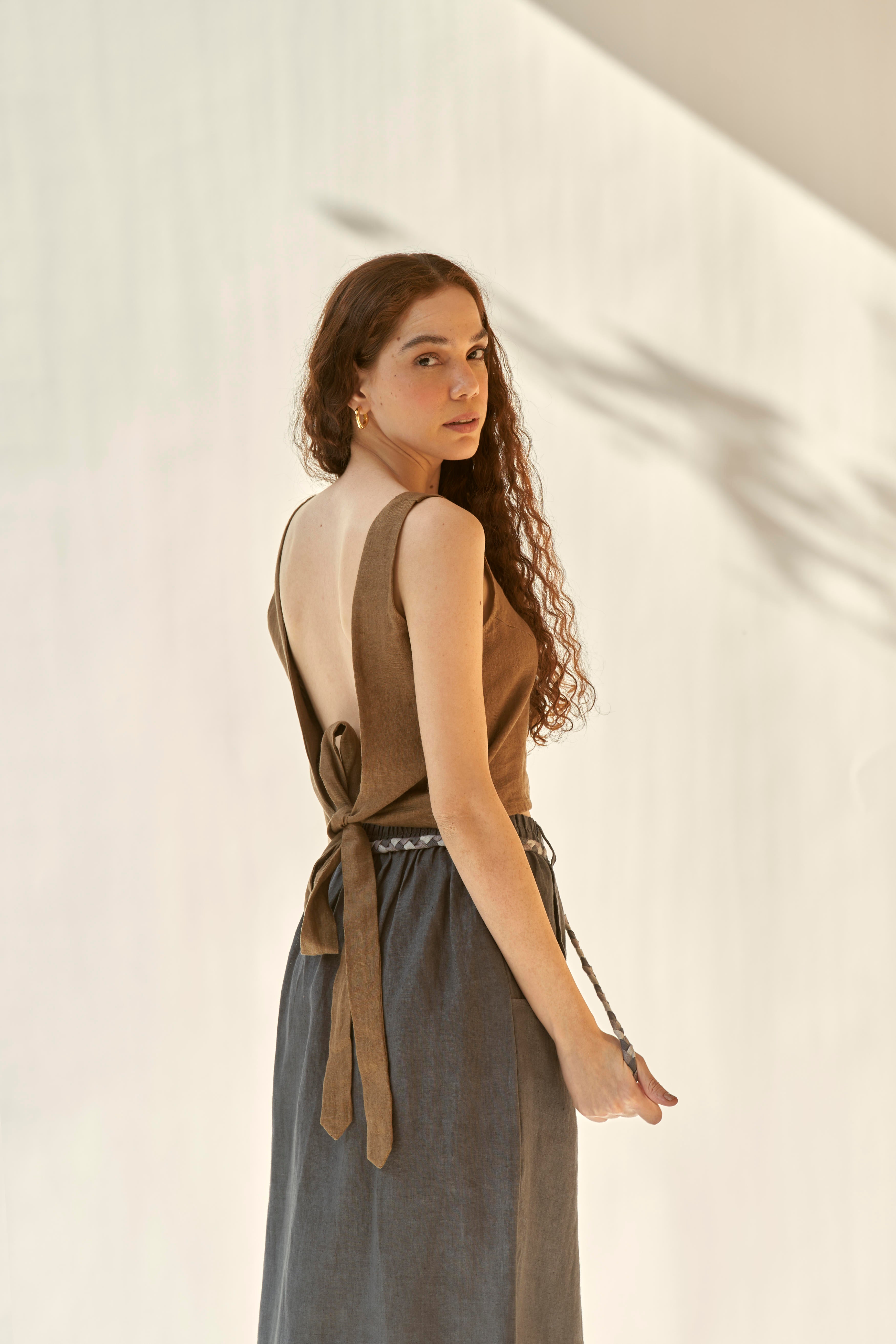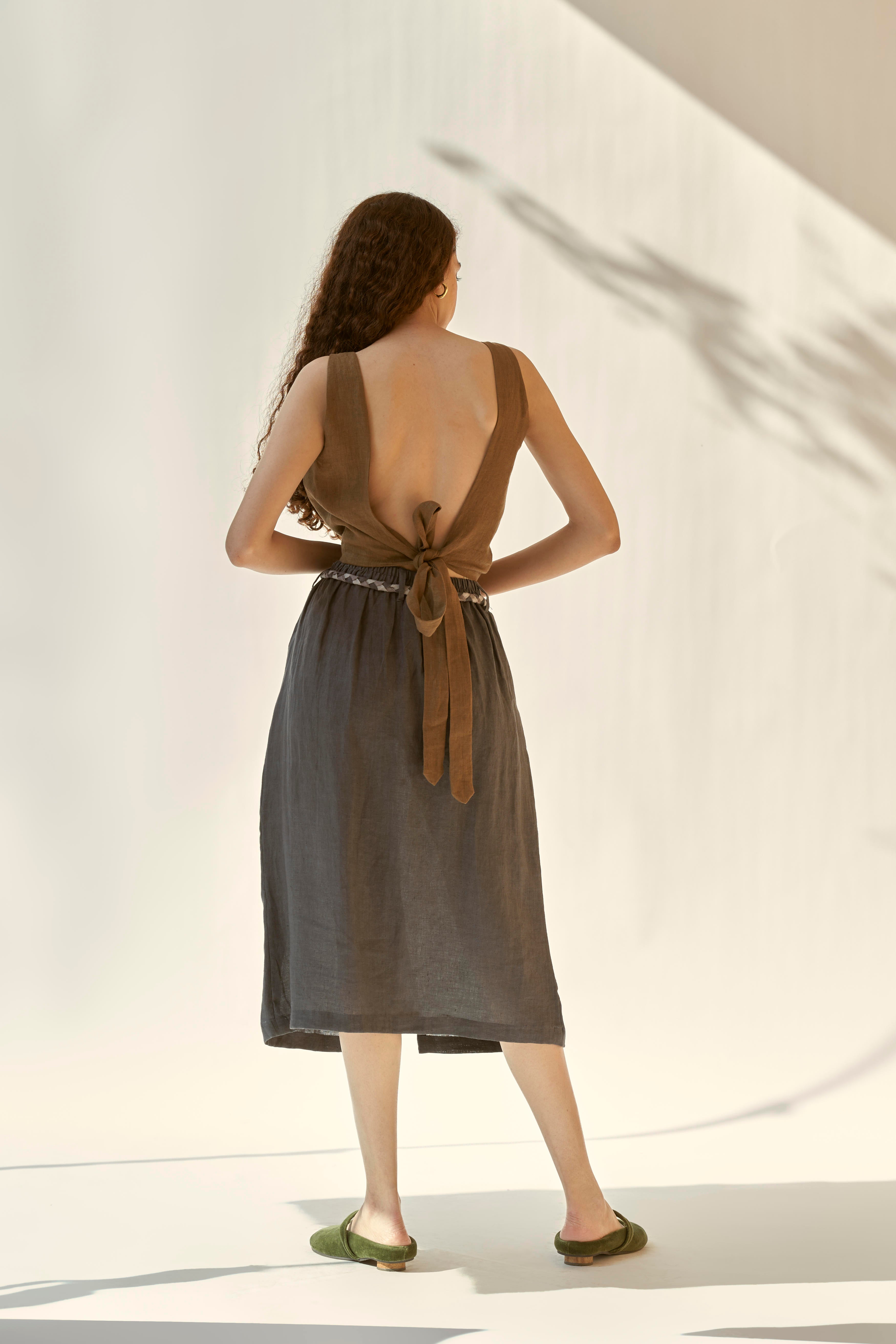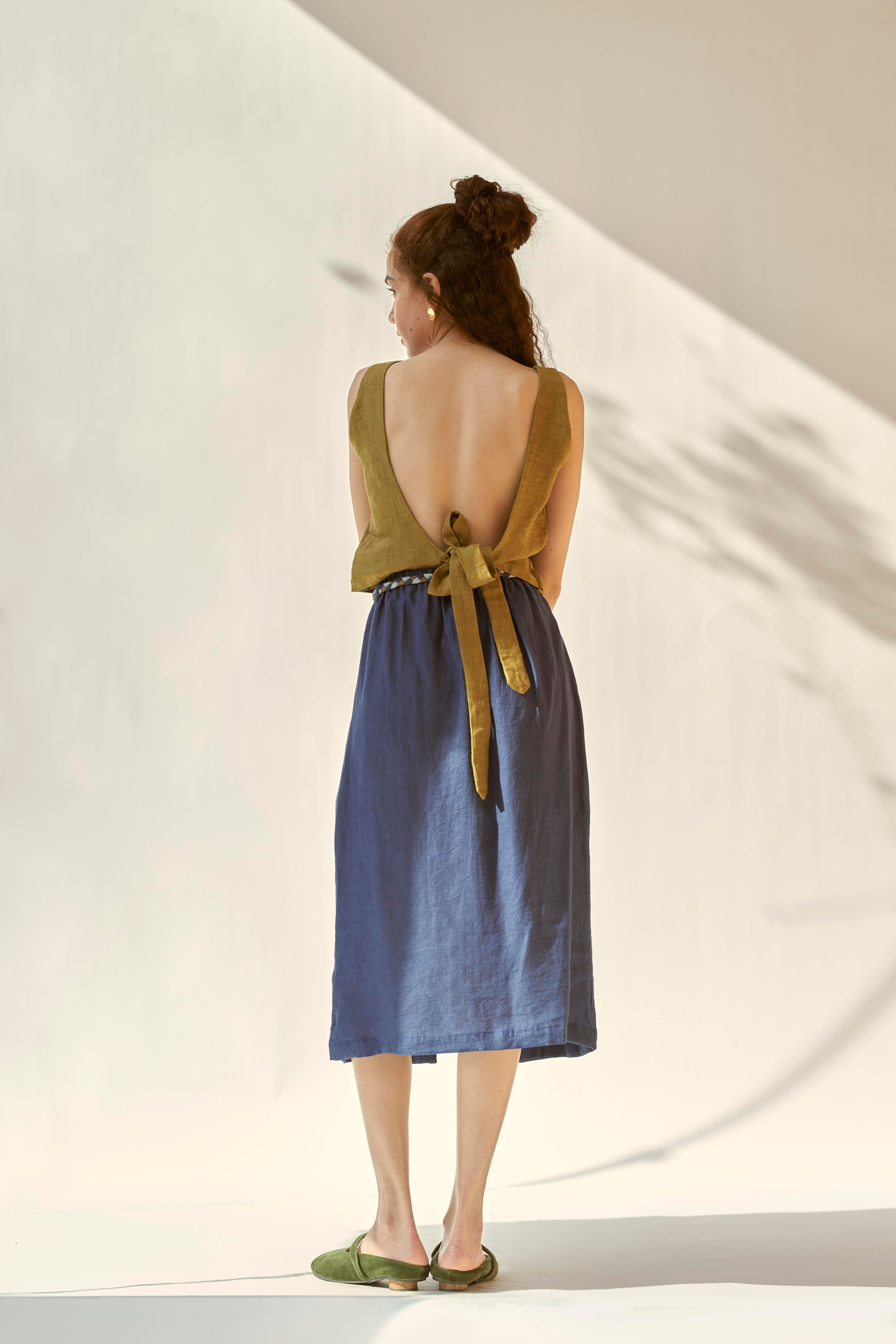 Linen skirt with elasticated waist and beautiful braided belt. The skirt falls to the mid-length and features a small slit at the center front. Paired with a top with a low cut back which gets fastened with a knot. To further add to it’s charm , skirt comes with a small slit at the centre front and two functional pockets.
