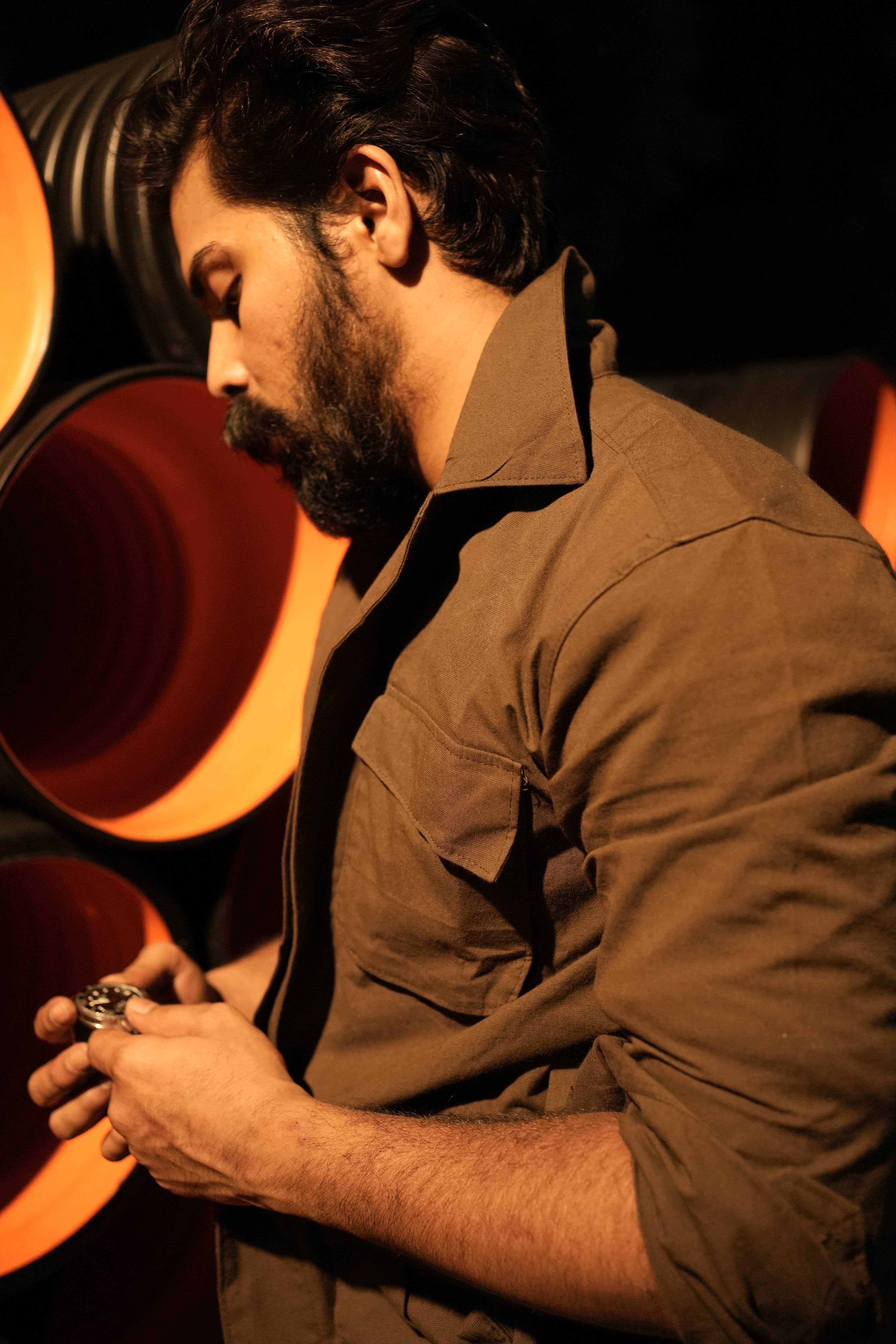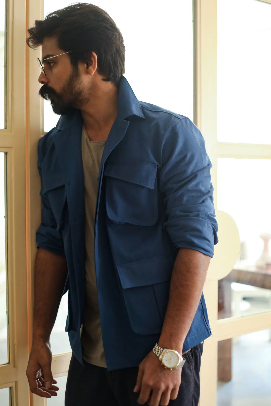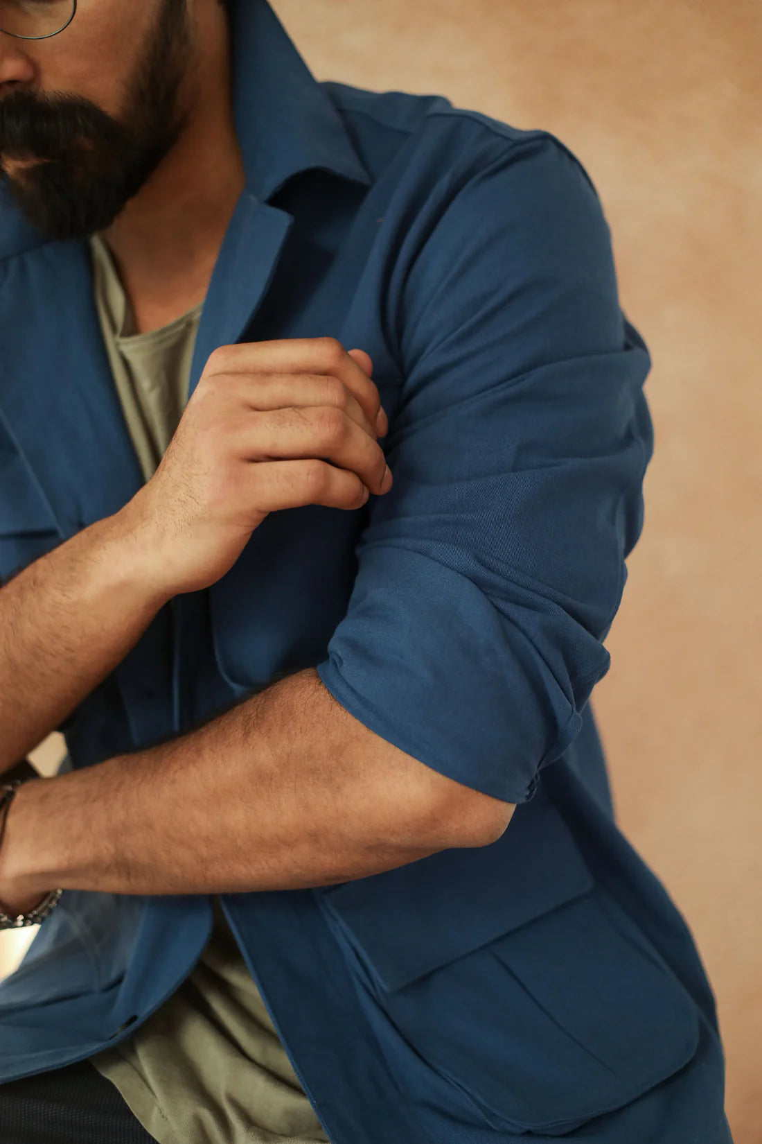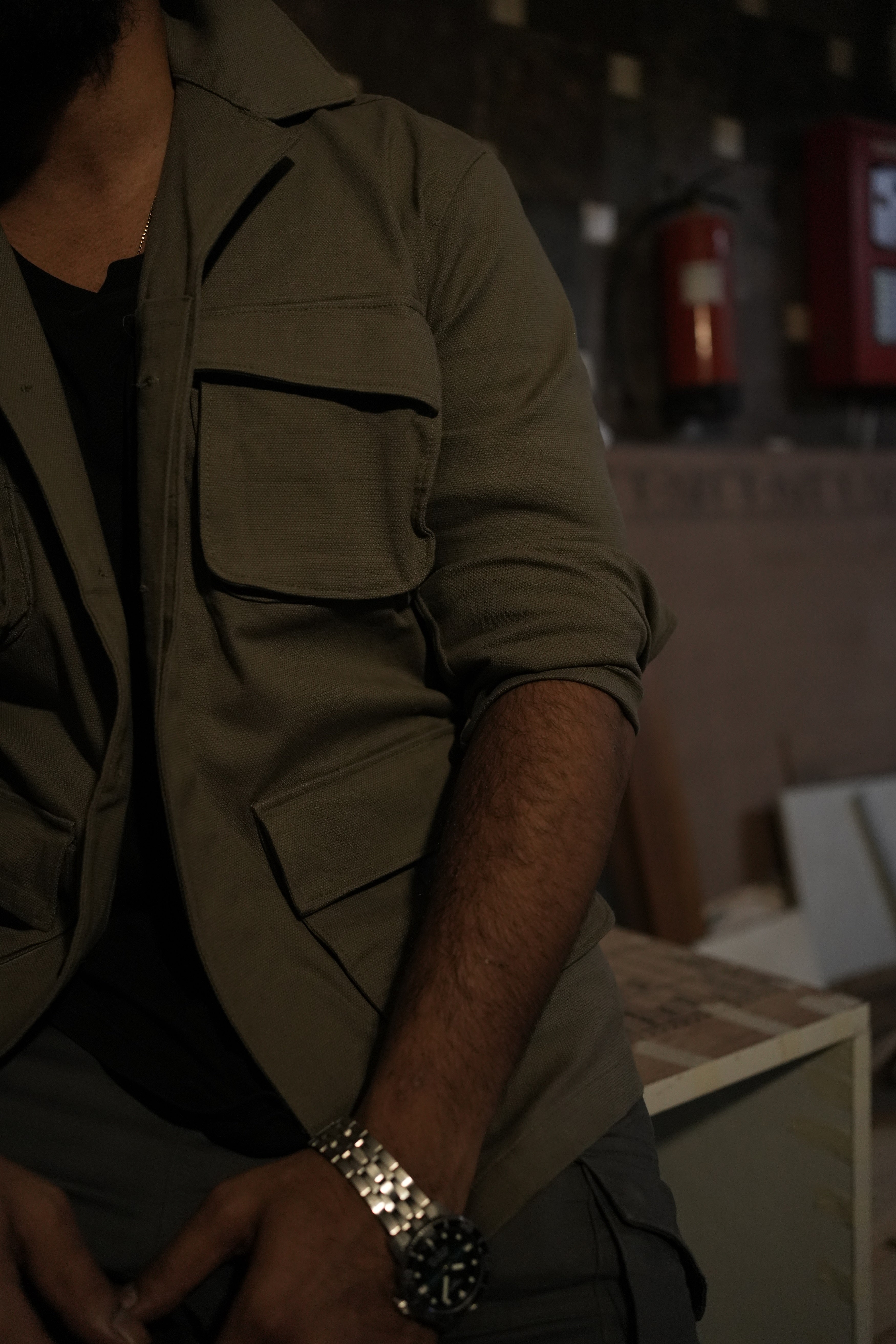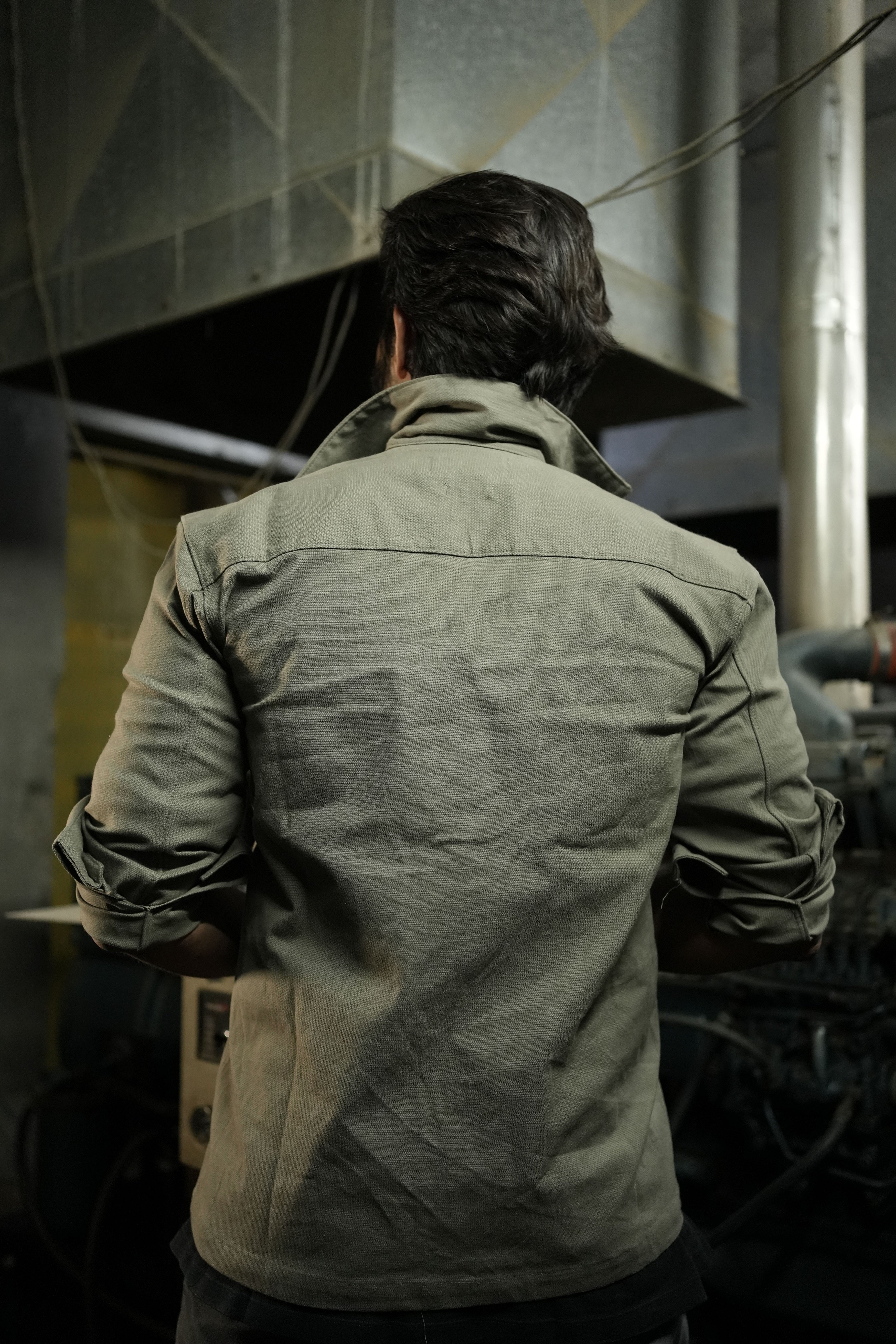 This garment pays homage to the resilience of soldiers who fought in the Vietnam War. Its silhouette reflects the toughness and valor of these warriors, designed to bring both ferocity and calmness to any occasion.​ It is durable with a rugged appeal. It has four spacious box pockets with flaps, inverted pleats, and bellows.​ It sports a relaxed fit complemented by structured cuffs and an angular collar., with a double-layered covered front placket. It is equipped with metal click buttons, free from polyester and elastane.​