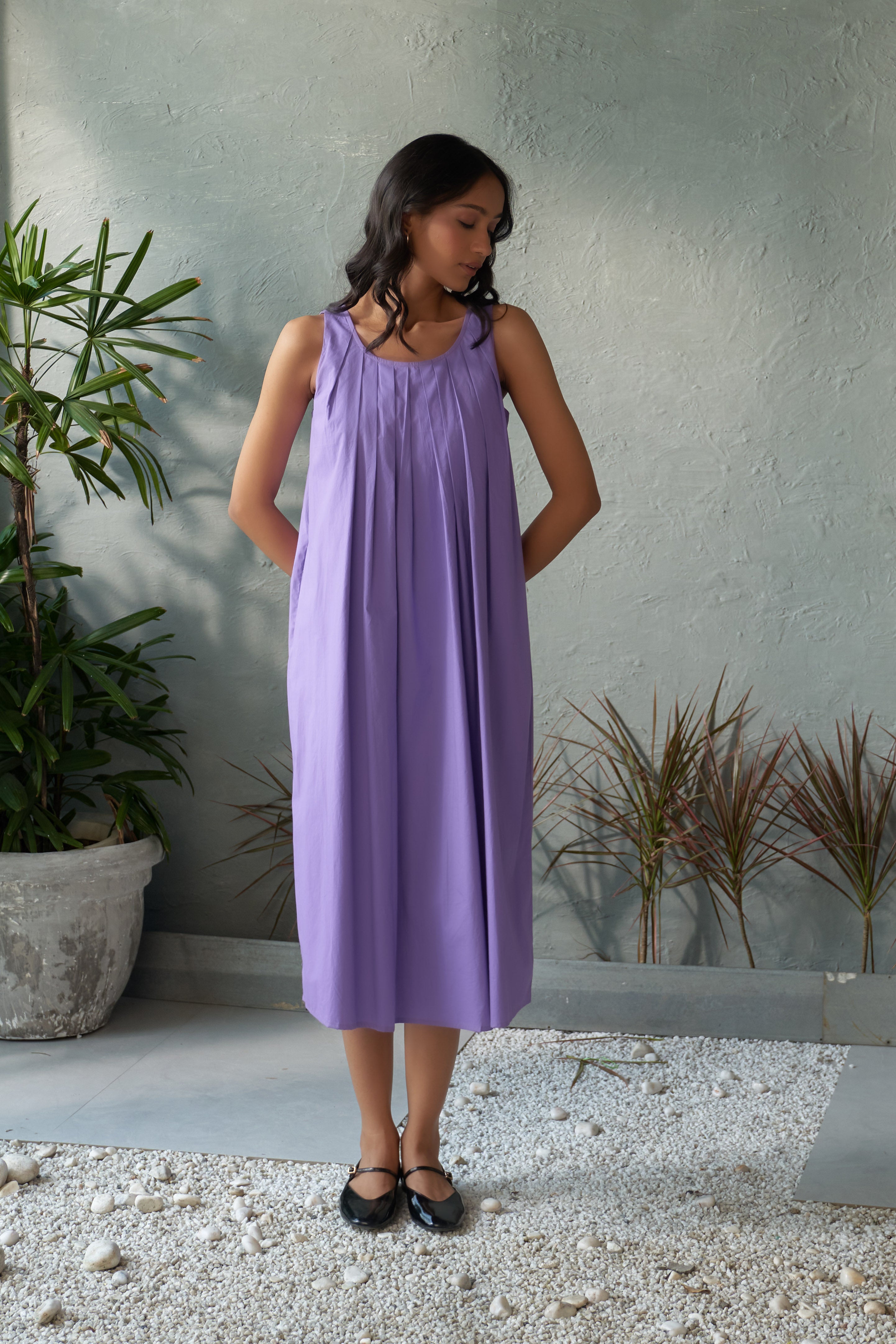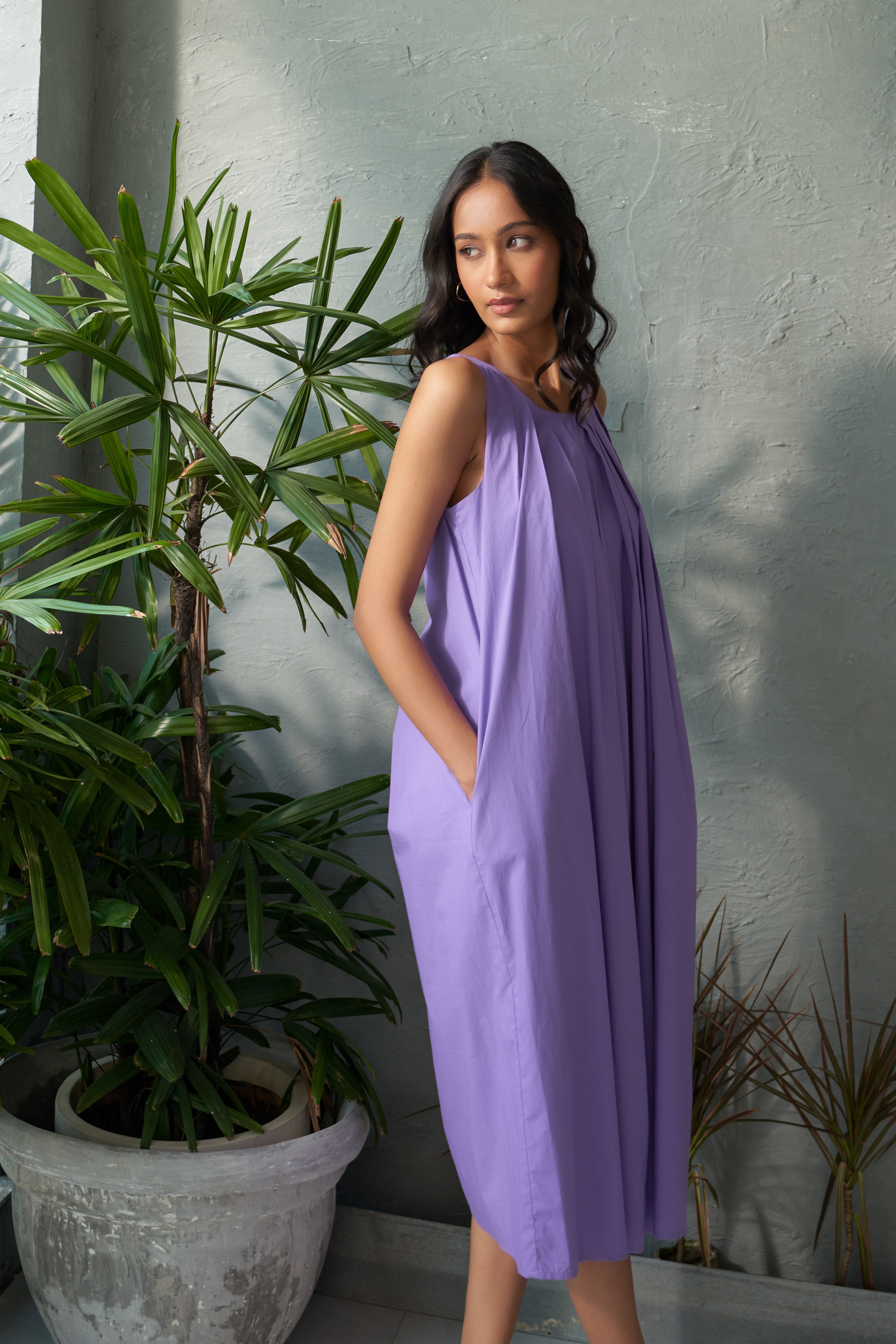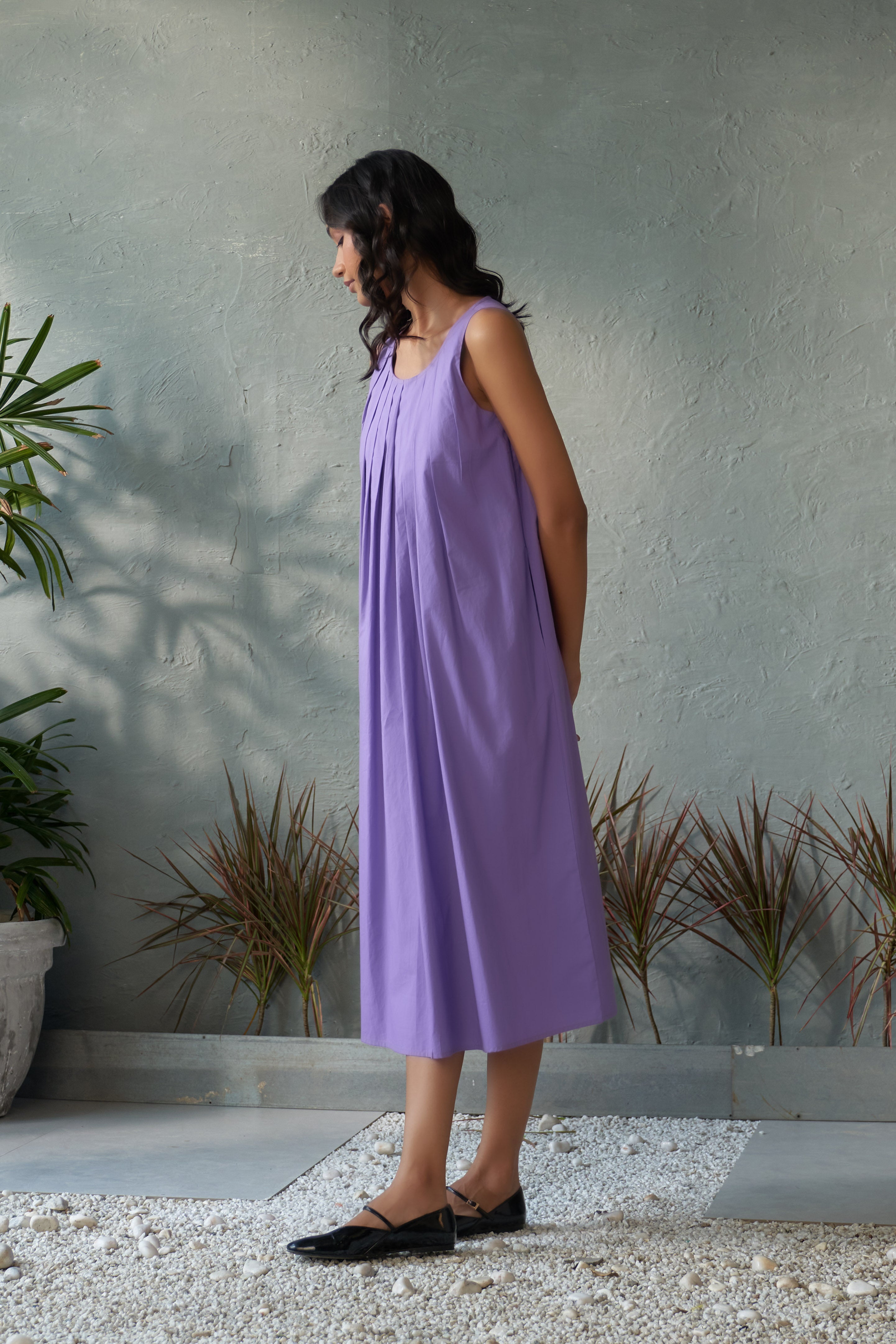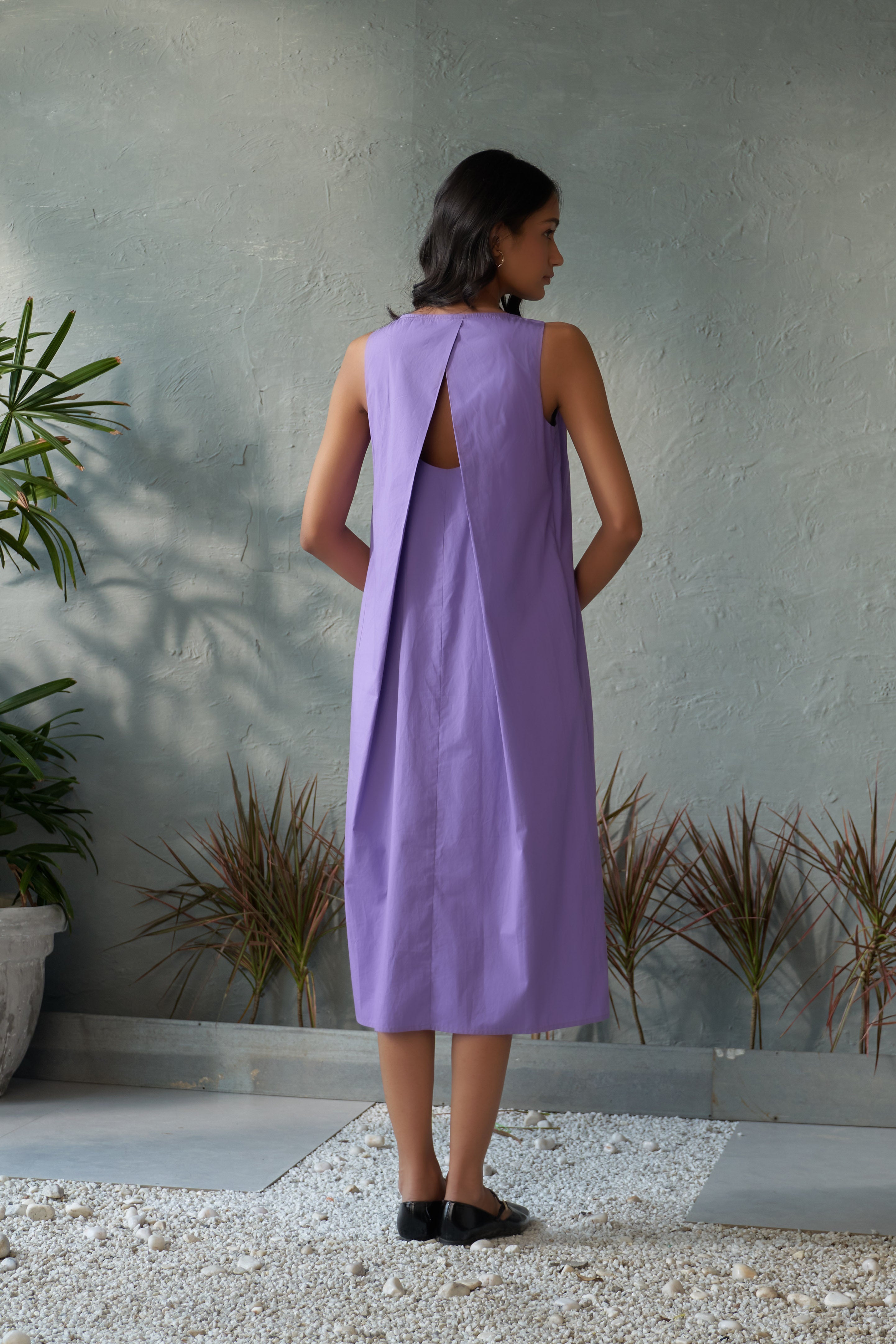Elevate your wardrobe with our sophisticated lavender midi dress, designed with a U scoop neck and distinctive box pleats in the front for a structured yet elegant look. The overlapping back panel with a keyhole detail adds a touch of modern chic and allure. Crafted from high-quality fabric, this dress offers a flattering silhouette that gracefully falls to midi length, perfect for a variety of occasions. Whether for a formal event or a stylish evening out, this versatile dress combines timeless elegance with contemporary design elements.