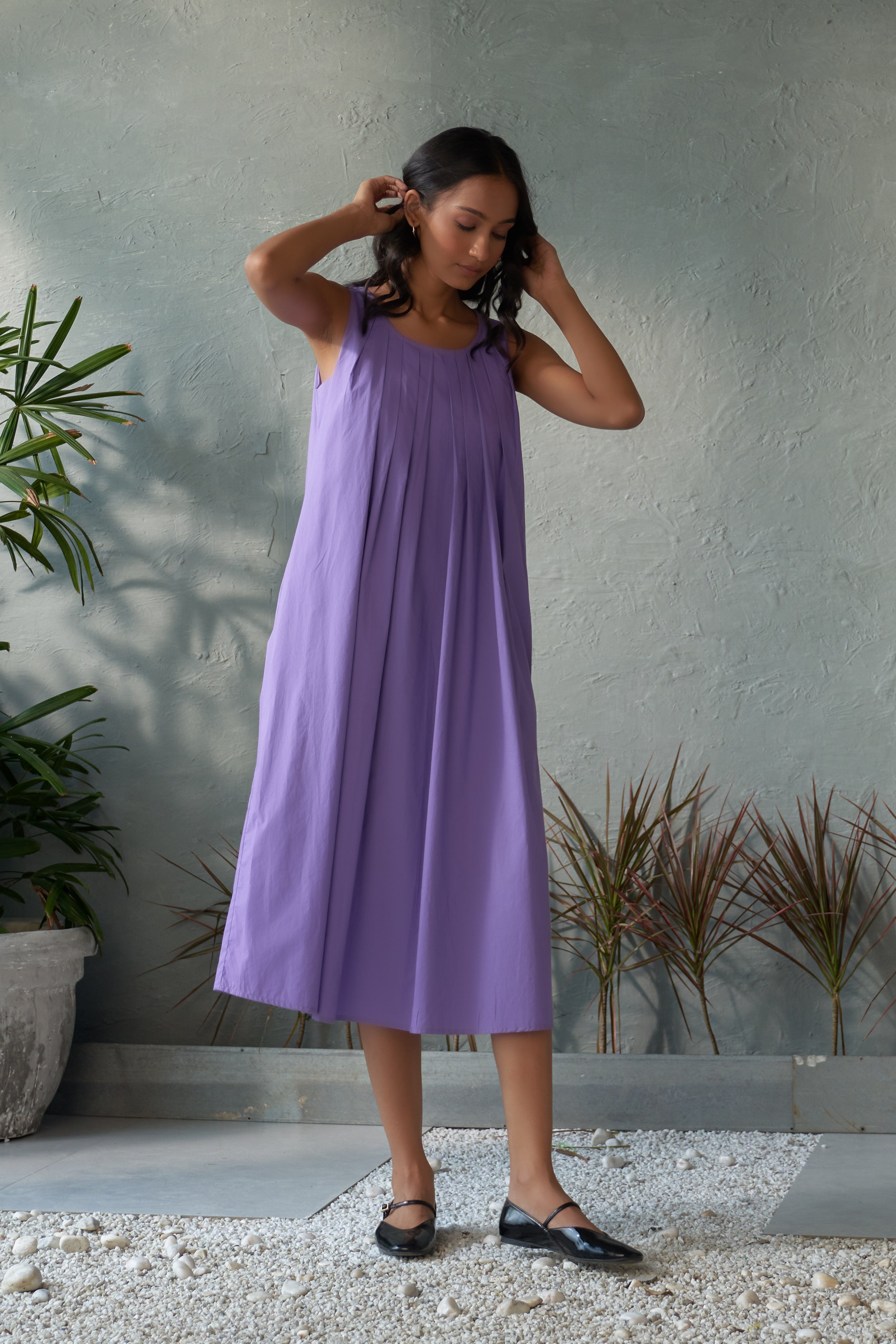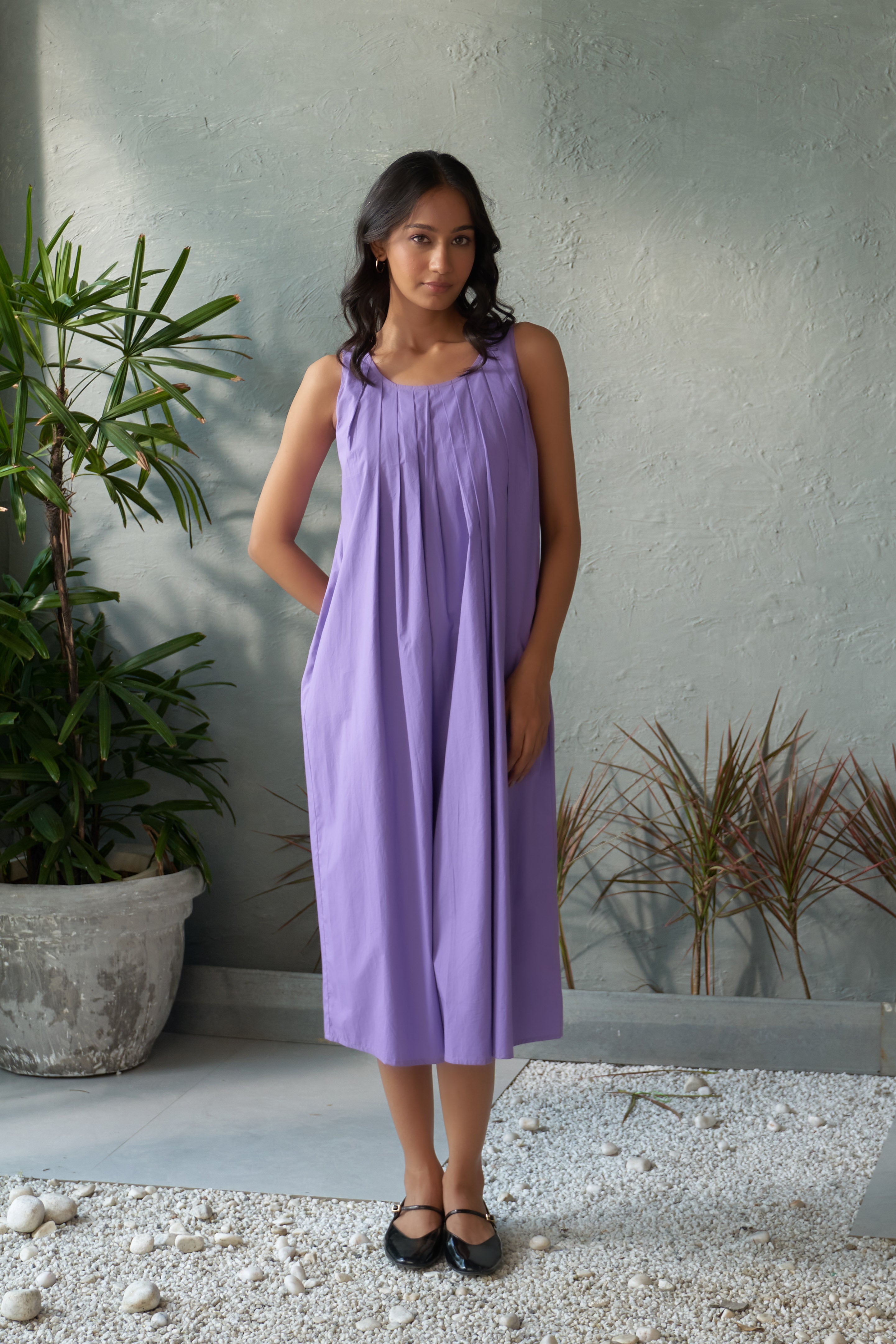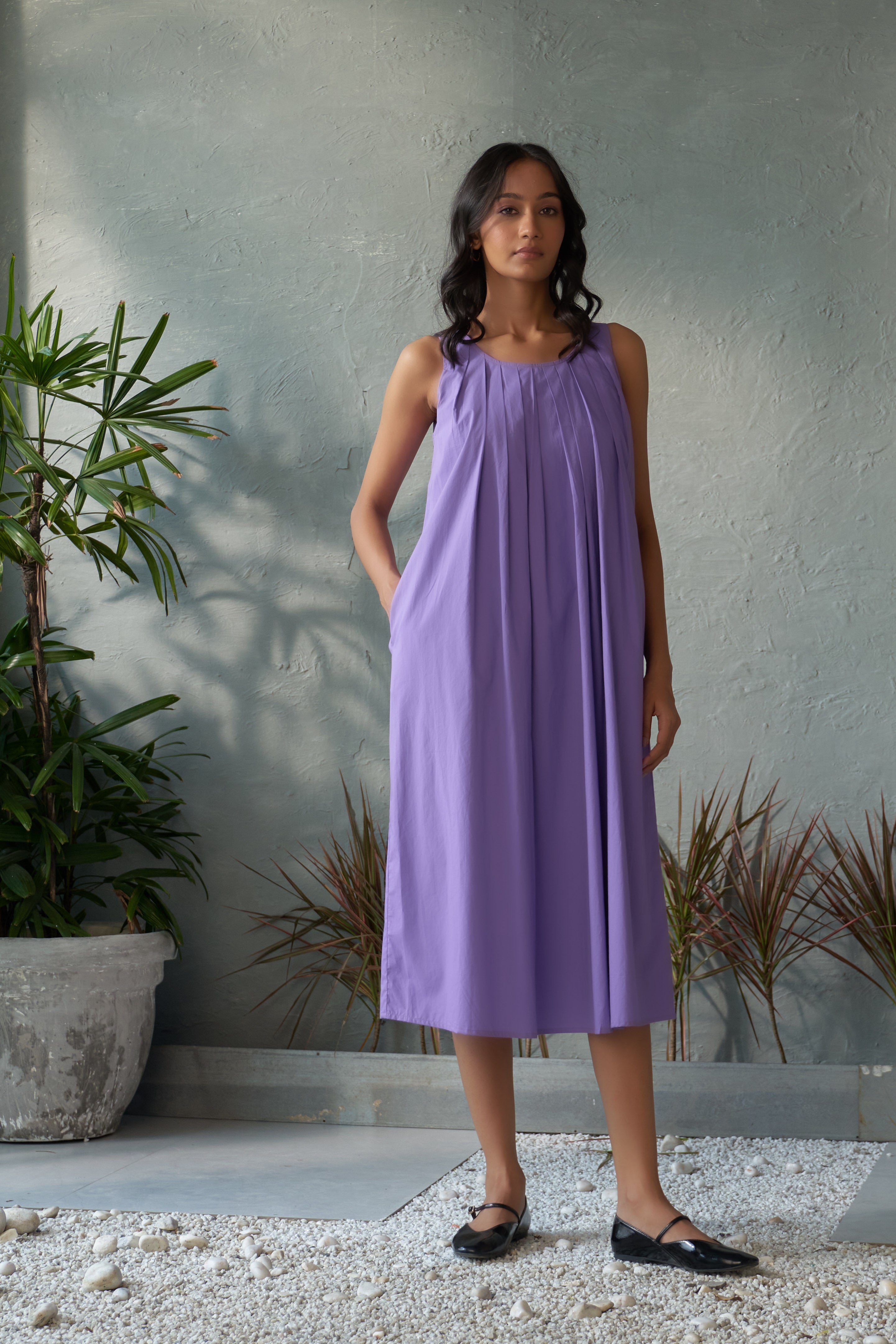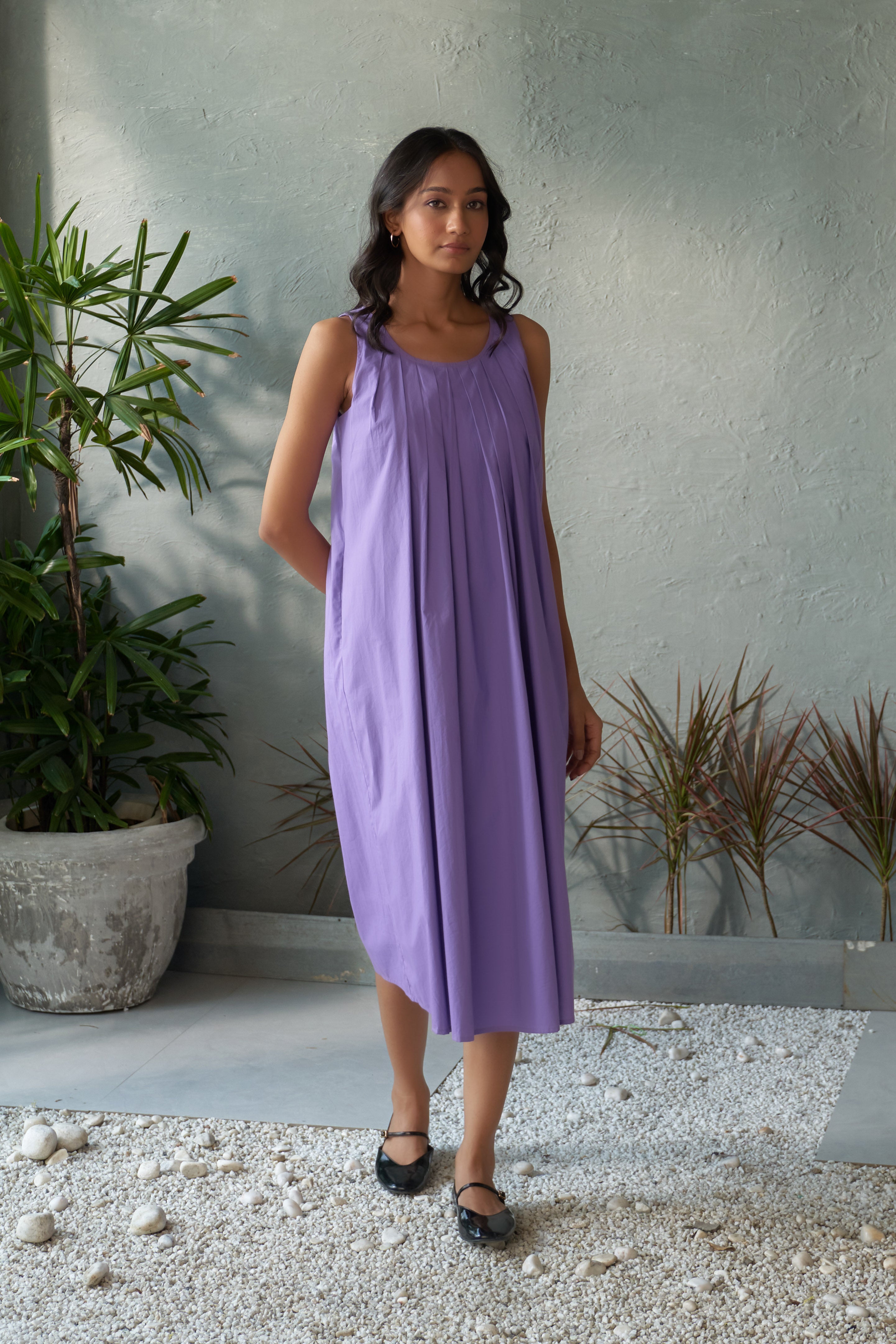 Elevate your wardrobe with our sophisticated lavender midi dress, designed with a U scoop neck and distinctive box pleats in the front for a structured yet elegant look. The overlapping back panel with a keyhole detail adds a touch of modern chic and allure. Crafted from high-quality fabric, this dress offers a flattering silhouette that gracefully falls to midi length, perfect for a variety of occasions. Whether for a formal event or a stylish evening out, this versatile dress combines timeless elegance with contemporary design elements.