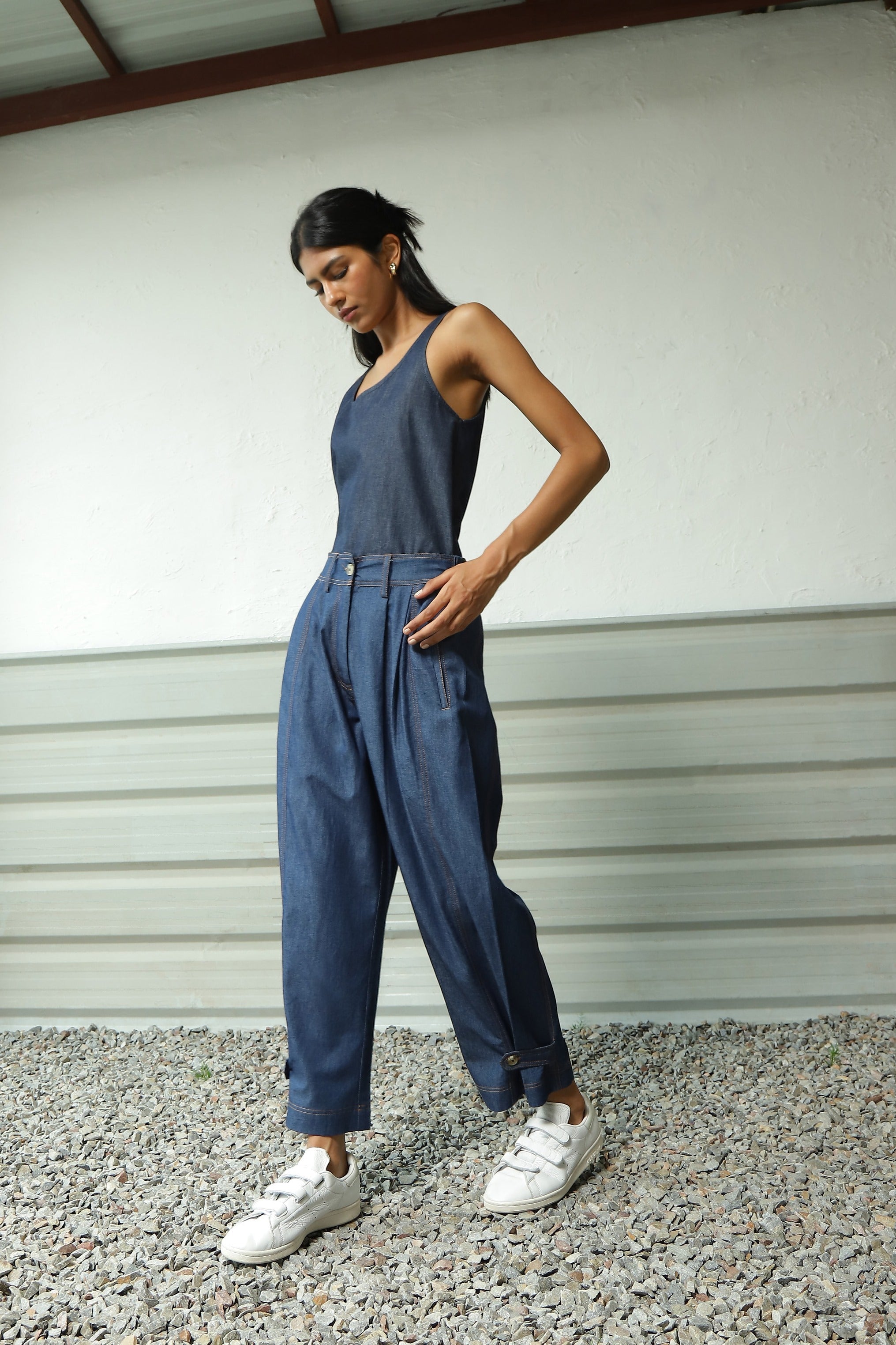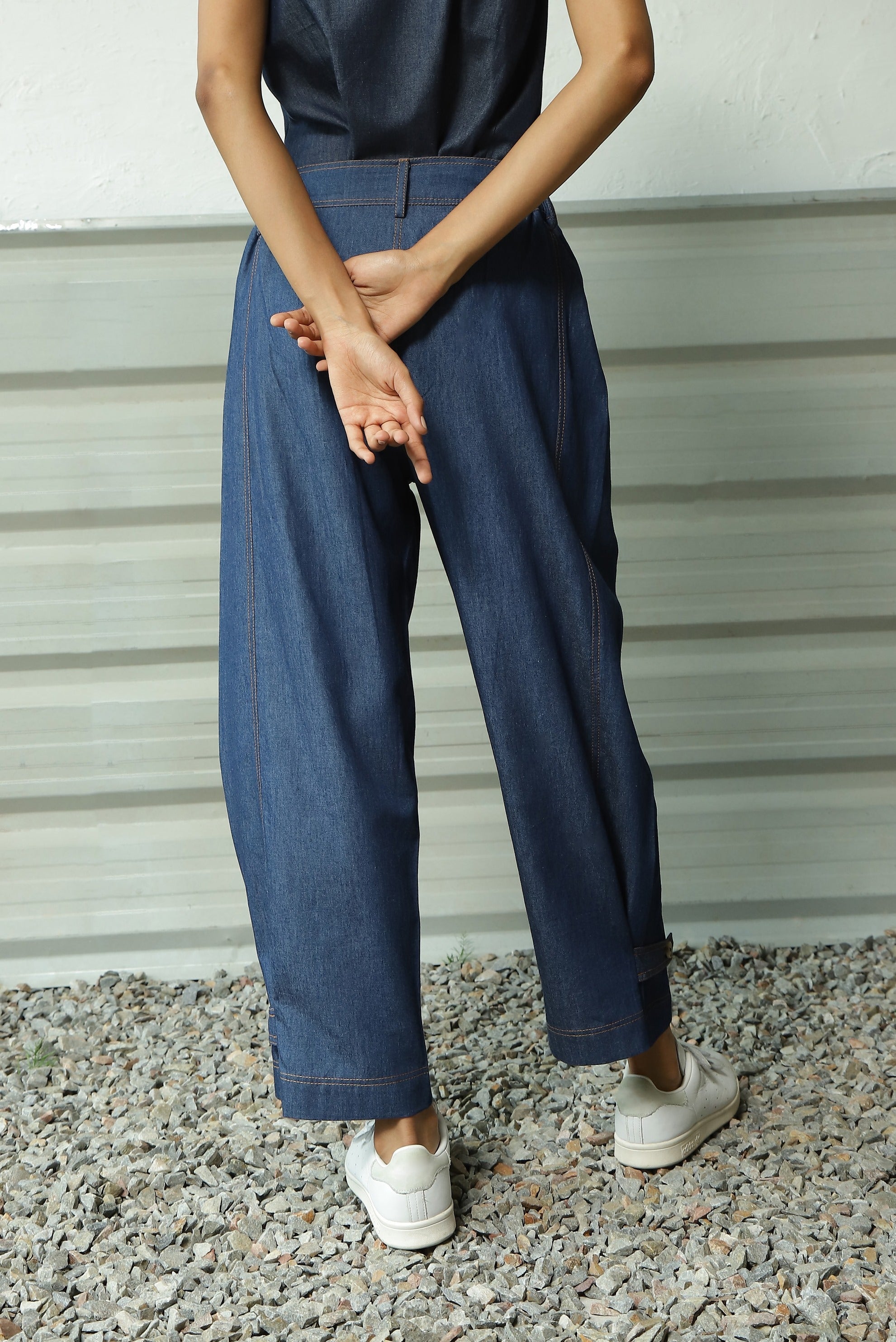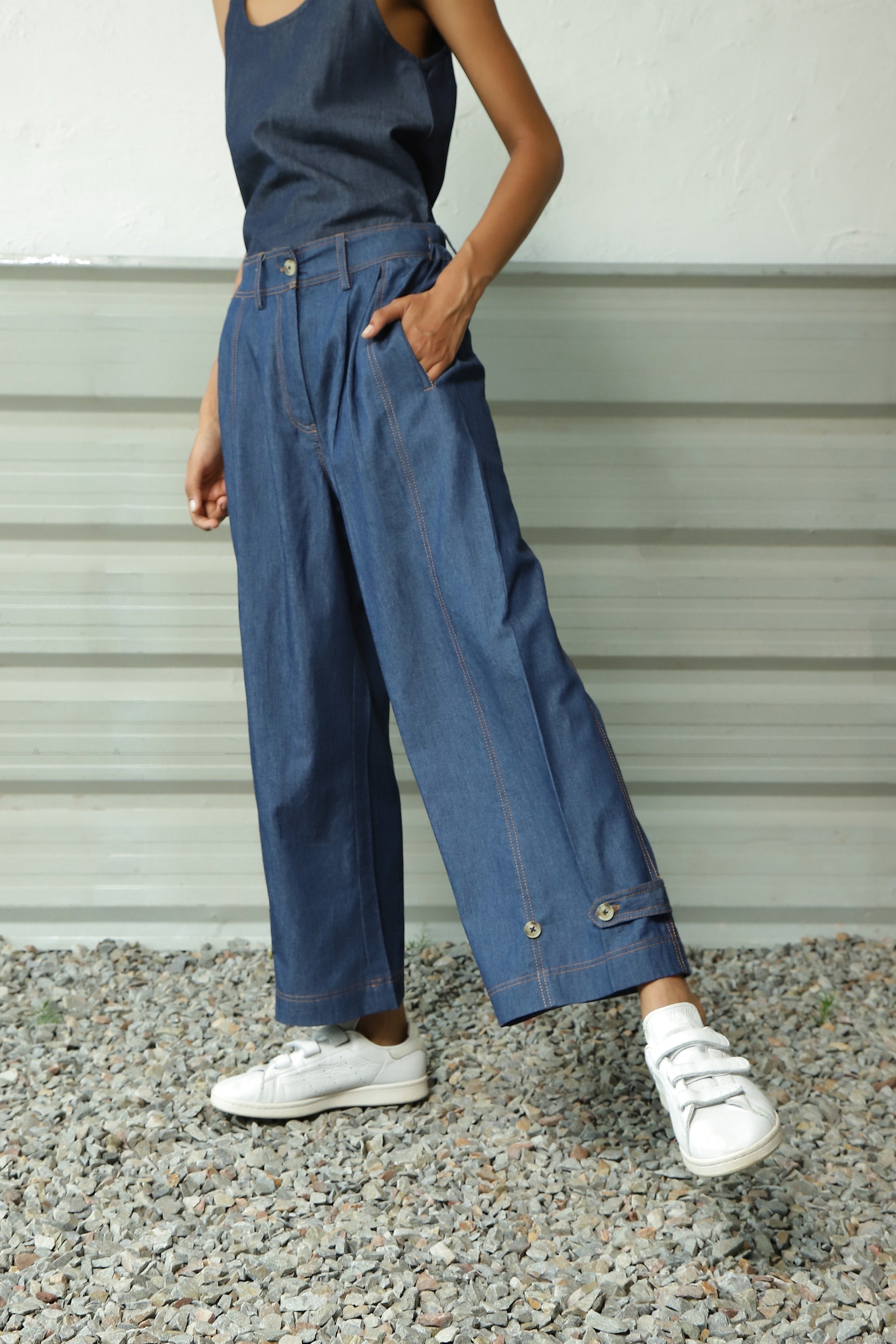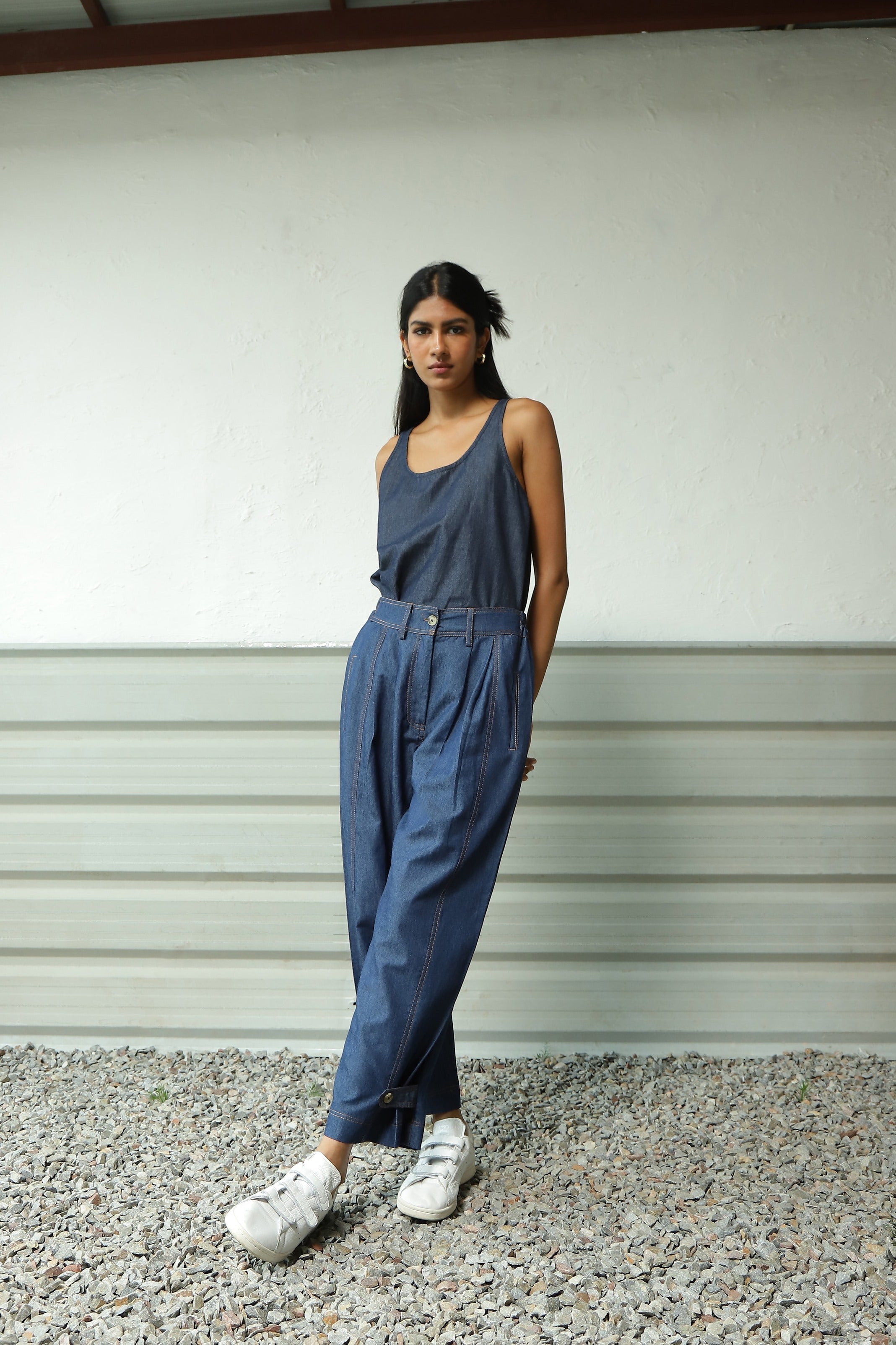 Combination features a Sleeveless Tank in a Breezy A-line Silhouette, complete with a Scoop Neckline. Paired with versatile Pants that seamlessly adapt to your preferences. Style them as Flared Pants or cinch them for a straighter look. These Pants showcase an intricate interplay of loops, double stitch embroidery, side pockets, and subtle pleats. This Go-To Co-ord Set is the ultimate choice for all your explorations and experiences.
