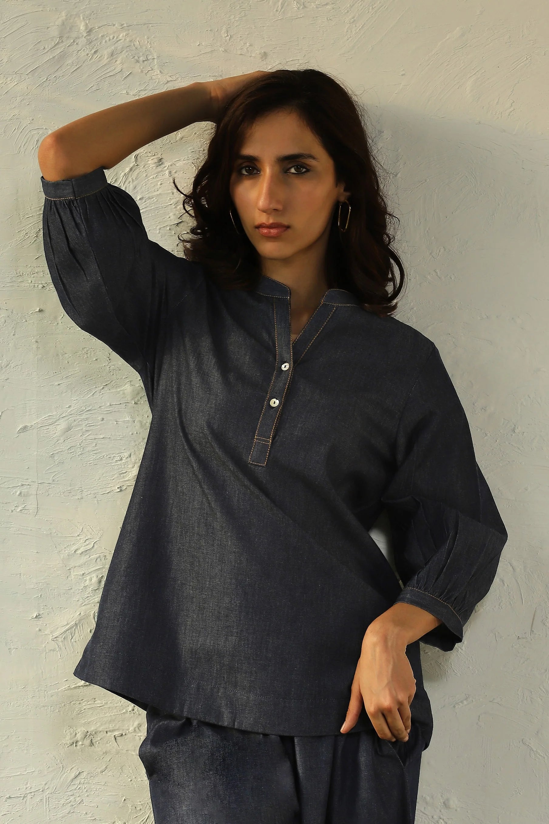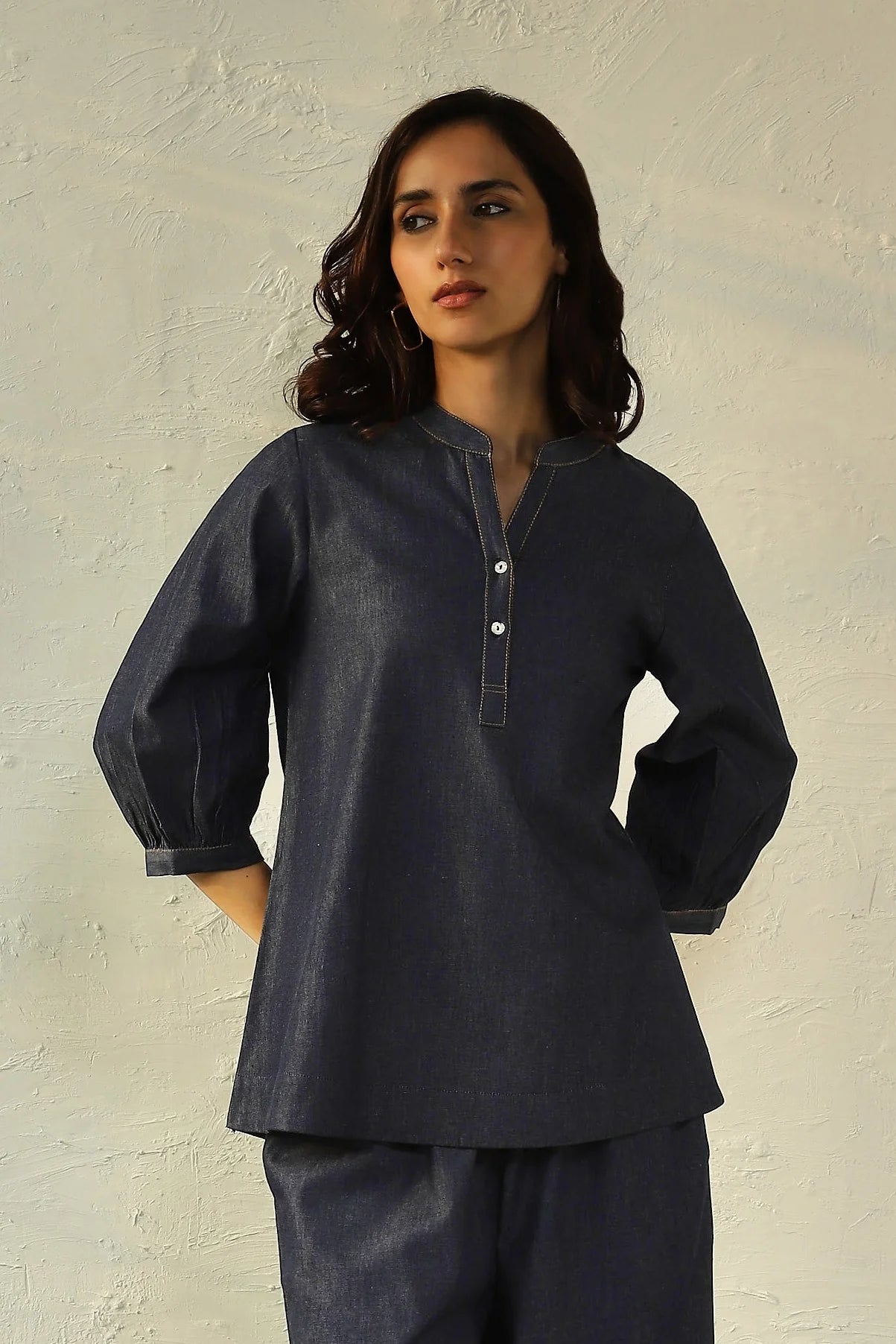 This dark denim blouse is crafted from a soft and lightweight fabric, and shaped for a flowy fit. The silhouette is complemented with gathered sleeves and front placket detailed with bright shell buttons. This versatile top can be paired with any shorts or trousers. For a trendy co-ord look, pair it with our matching denim palazzos as you travel in comfort.