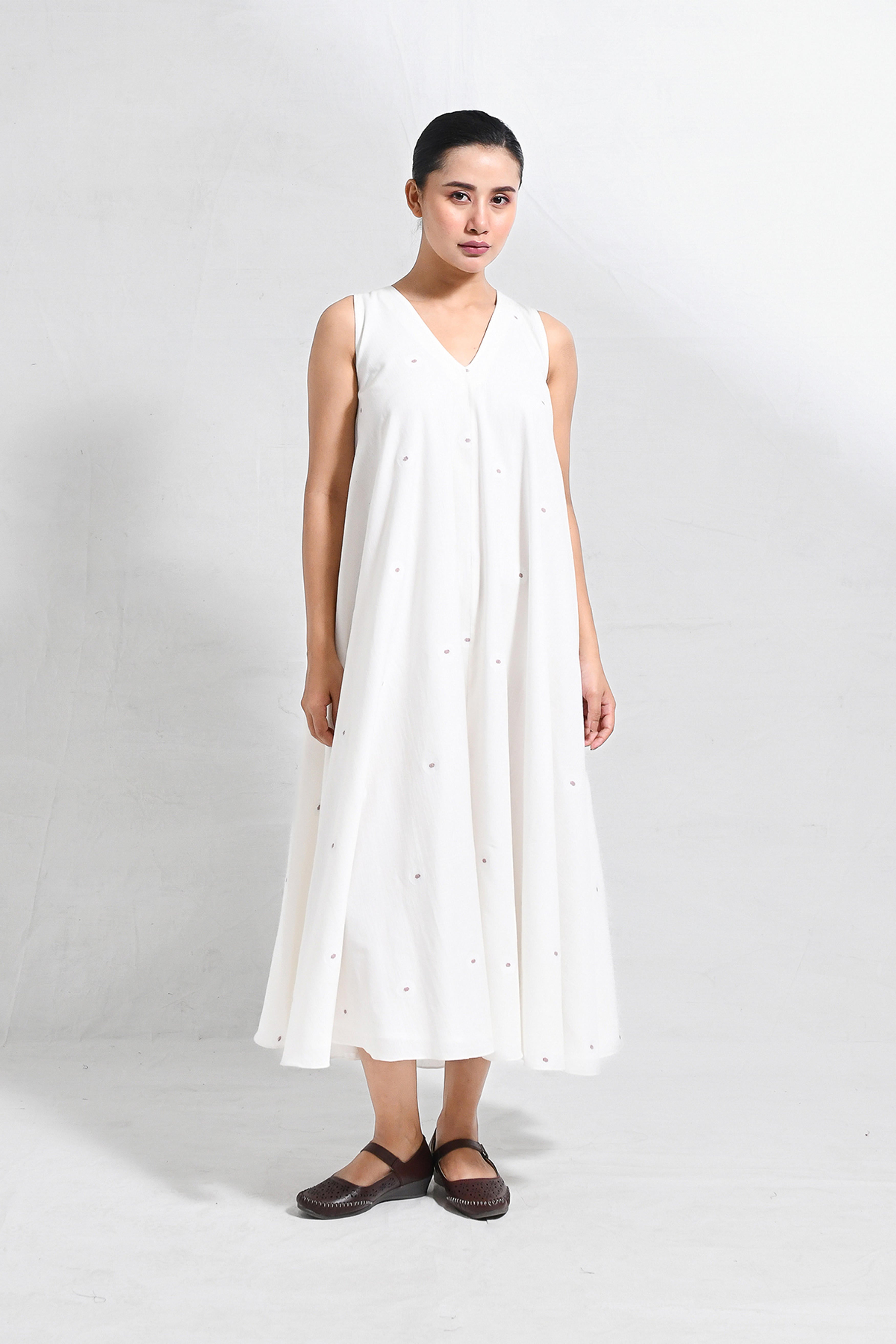 Dervish — A slow swirl of soul and cloth. Crafted in handwoven khadi, it moves not just with you, but through you — like wind, like rhythm, like breath. Handwoven in Bengal Jamdani on the finest khadi offers cotton’s signature softness and comfort. The Ureb cut sleeveless dress features a V-neckline at the front with a graceful flare. This calf-length dress comes with pockets and an attached lining. Model is 5'5, wearing a Size S.