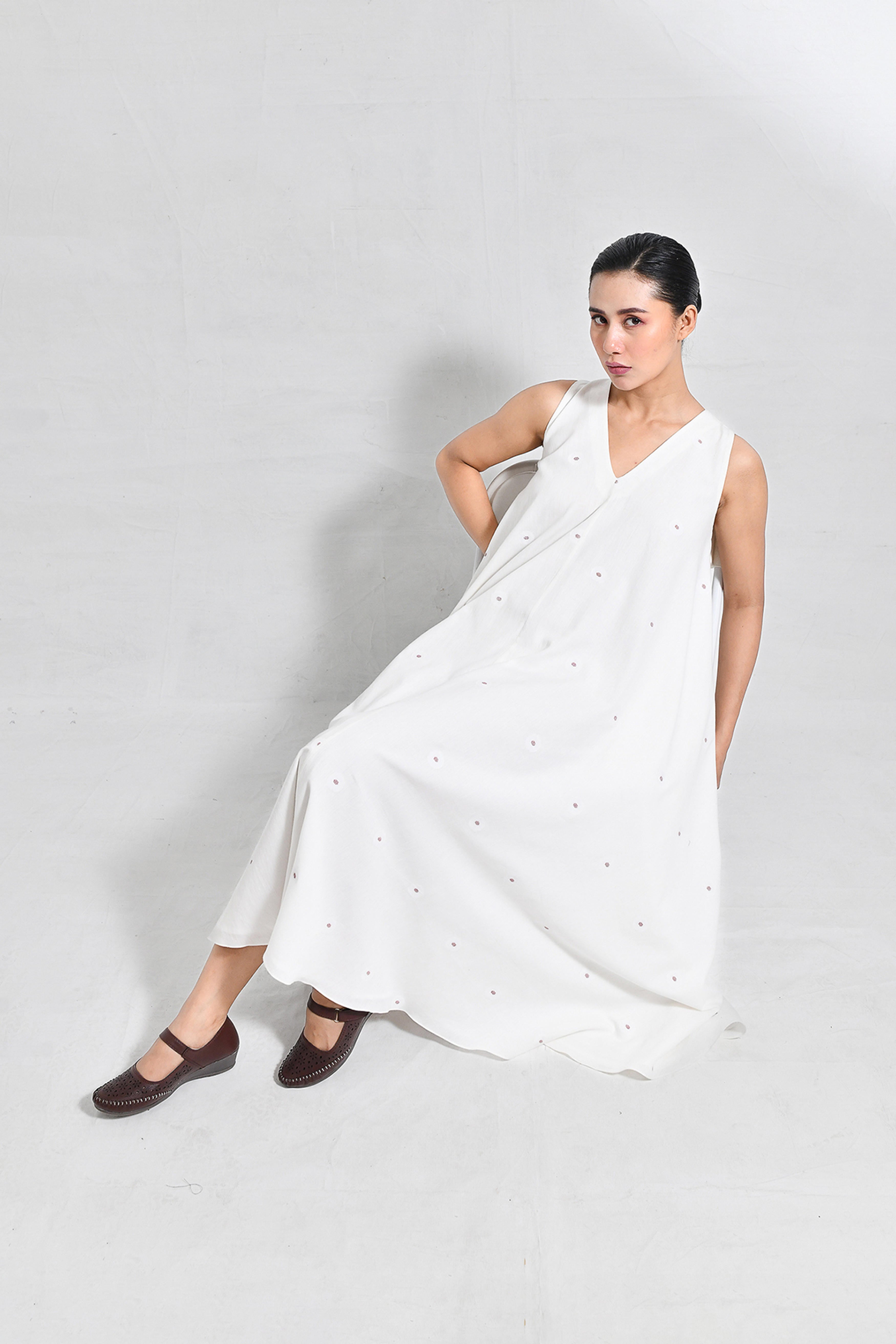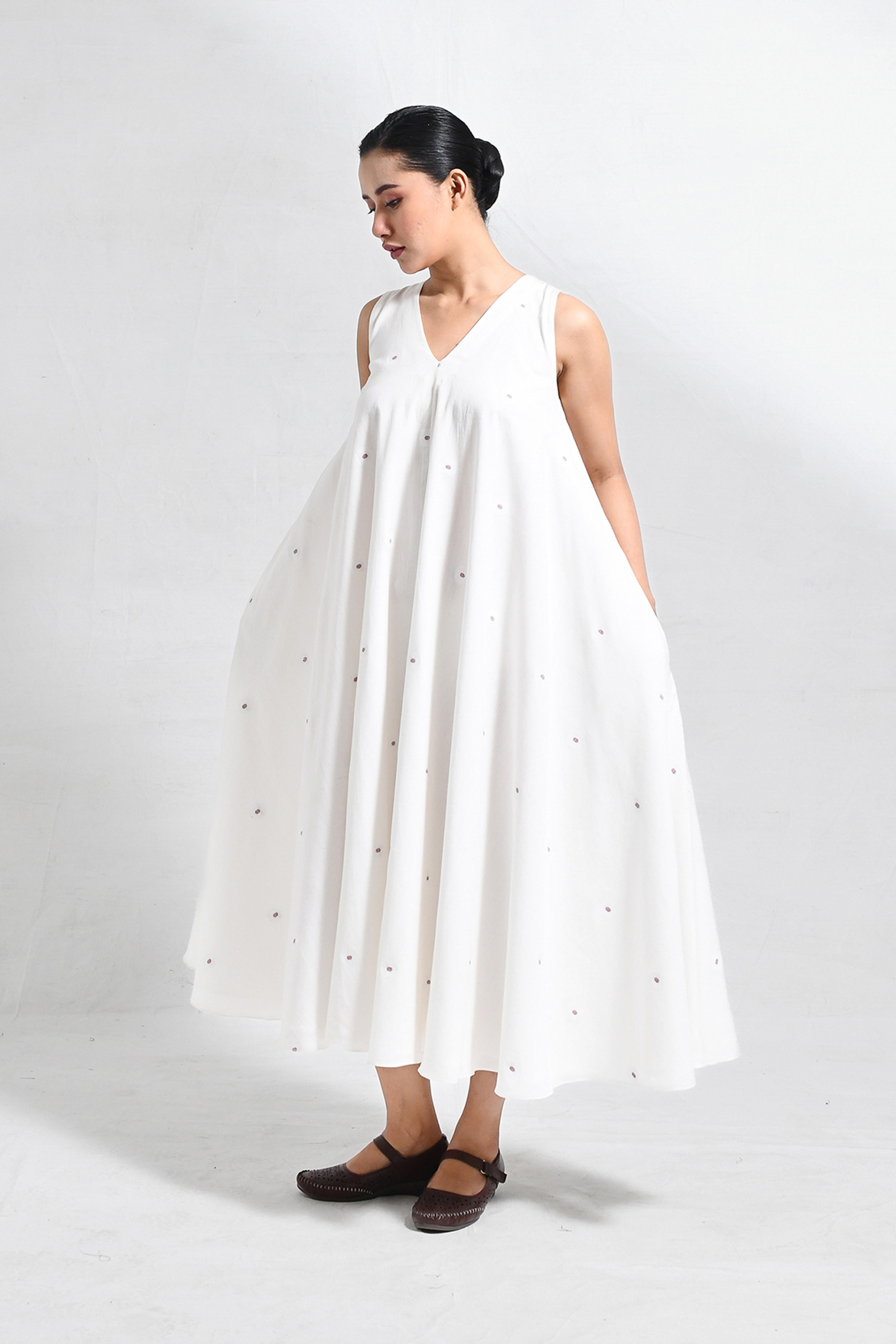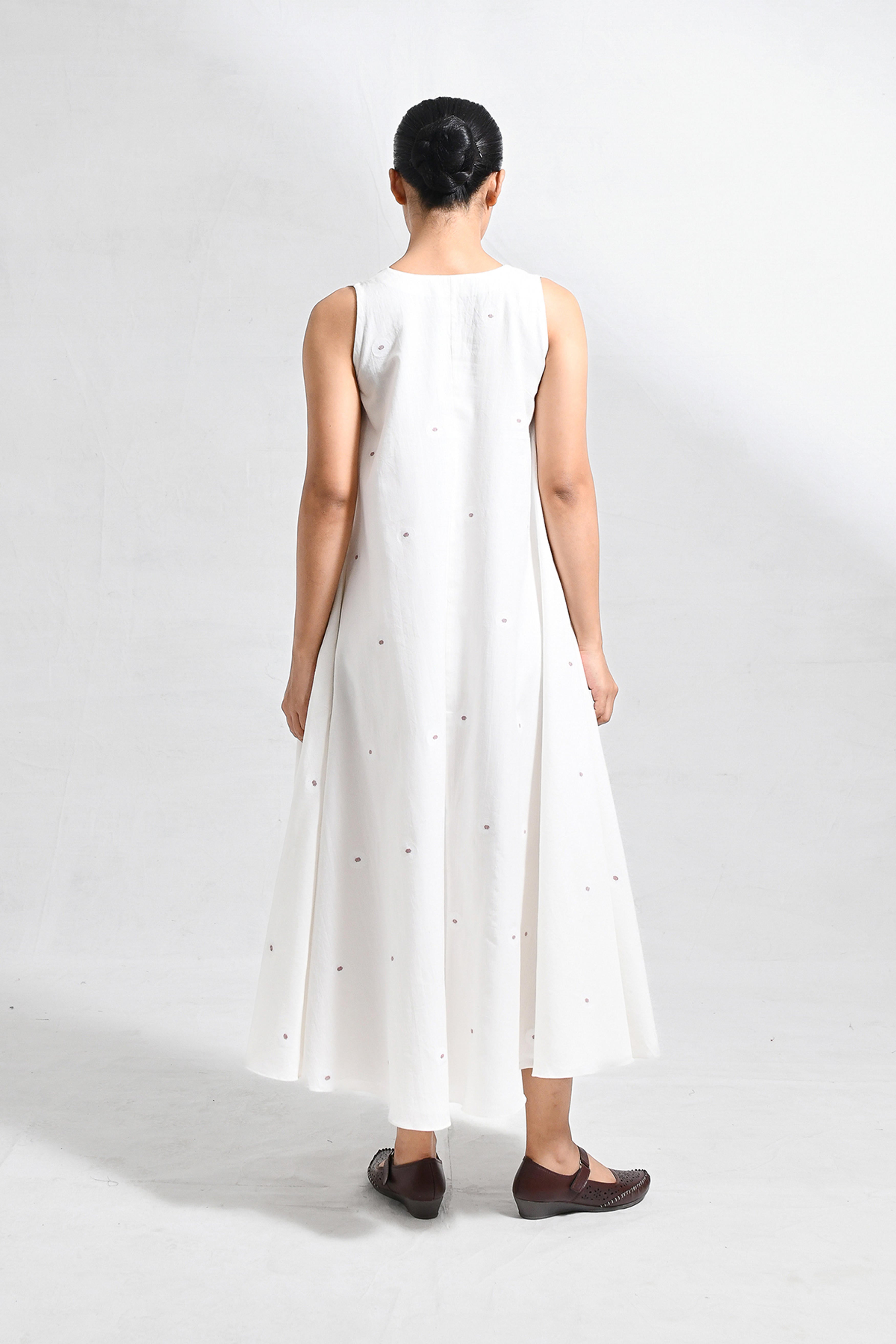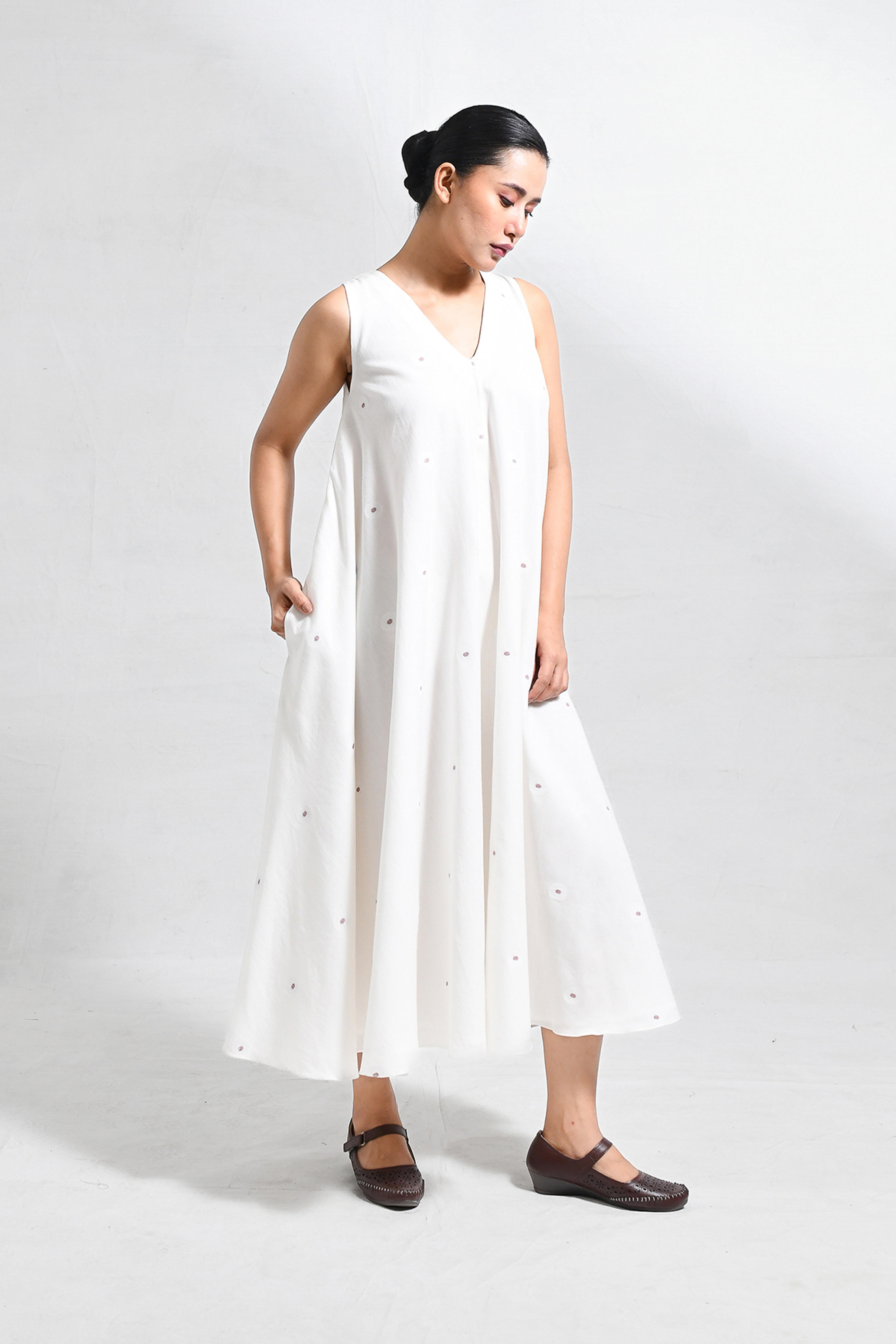 Dervish — A slow swirl of soul and cloth. Crafted in handwoven khadi, it moves not just with you, but through you — like wind, like rhythm, like breath. Handwoven in Bengal Jamdani on the finest khadi offers cotton’s signature softness and comfort. The Ureb cut sleeveless dress features a V-neckline at the front with a graceful flare. This calf-length dress comes with pockets and an attached lining. Model is 5'5, wearing a Size S.