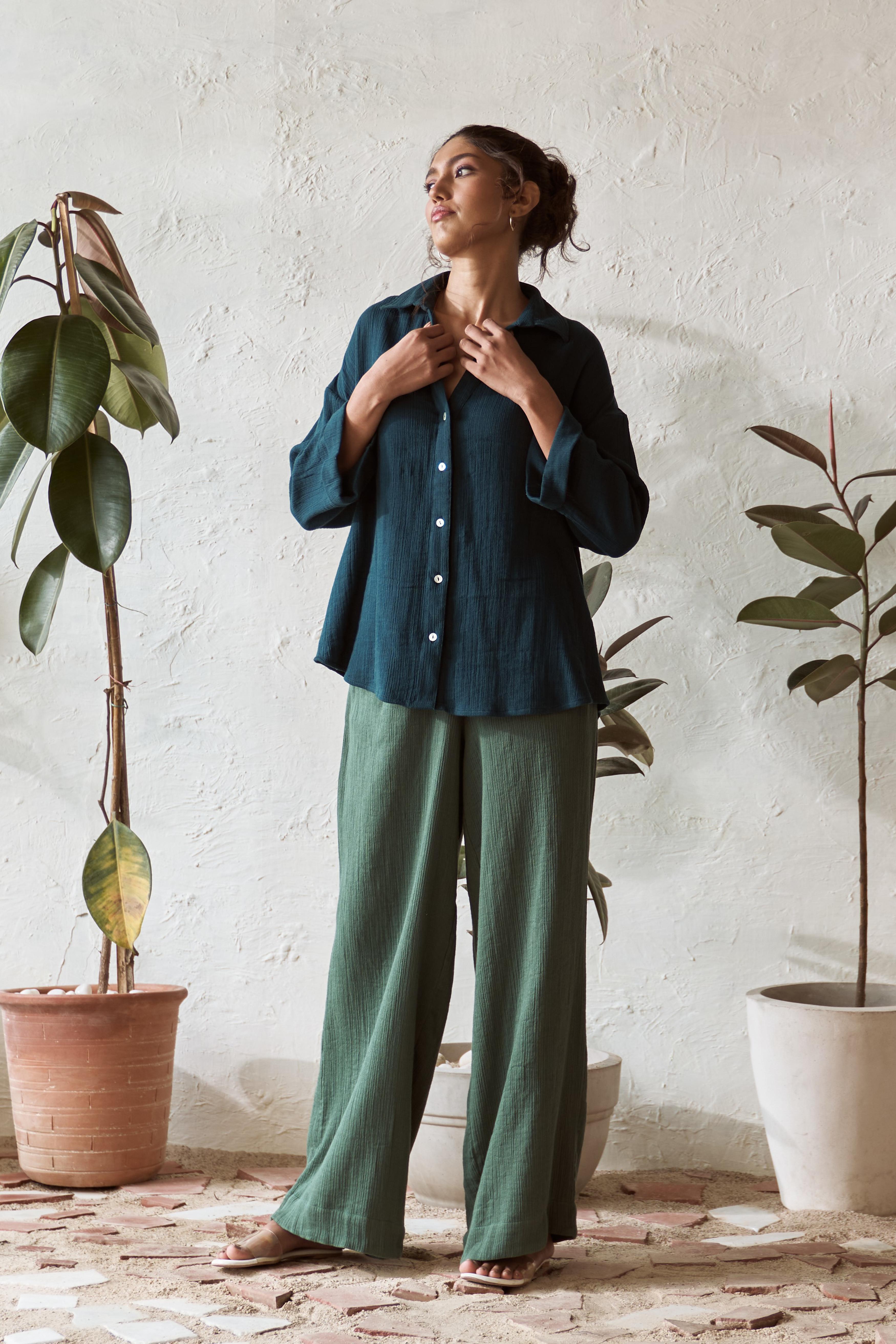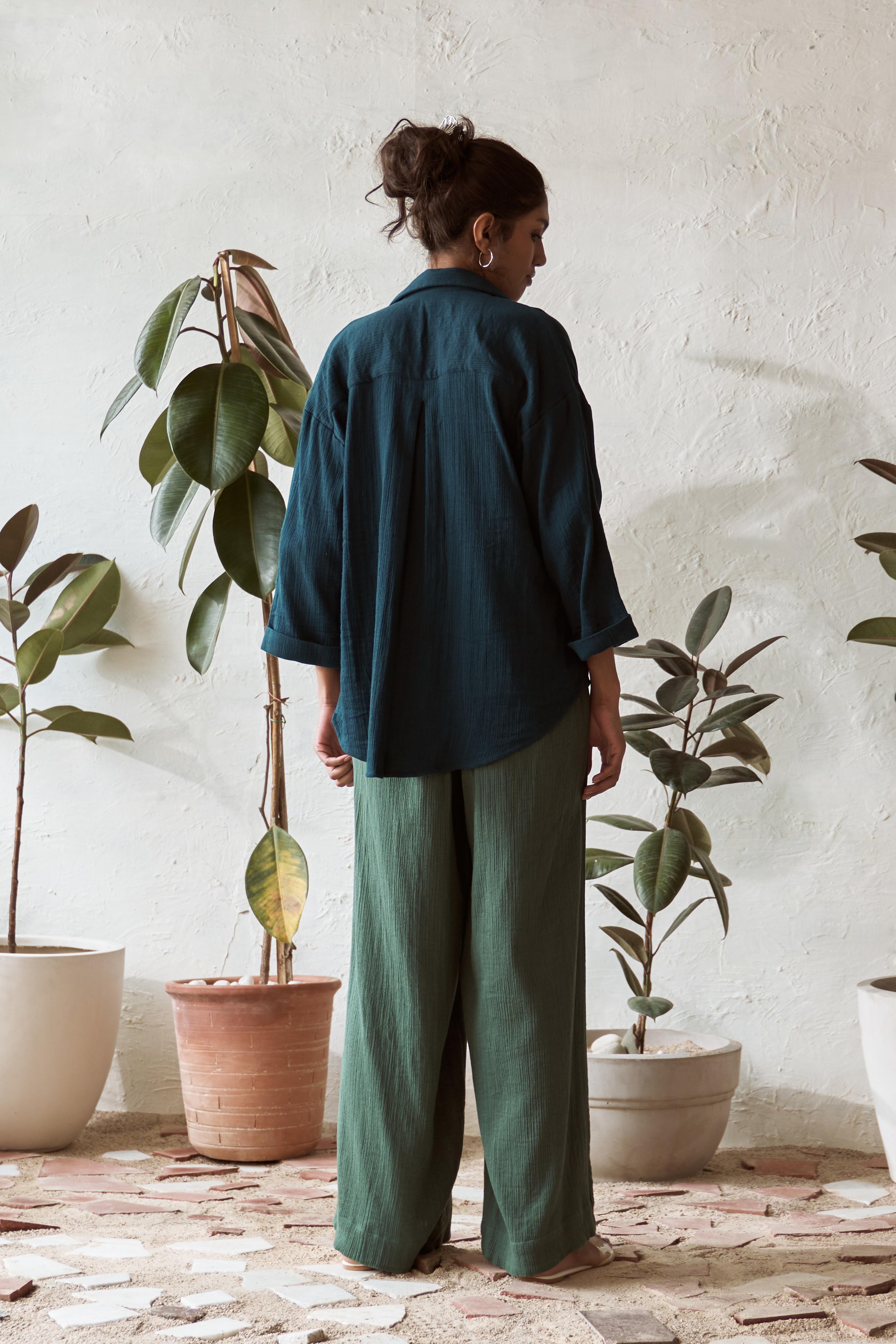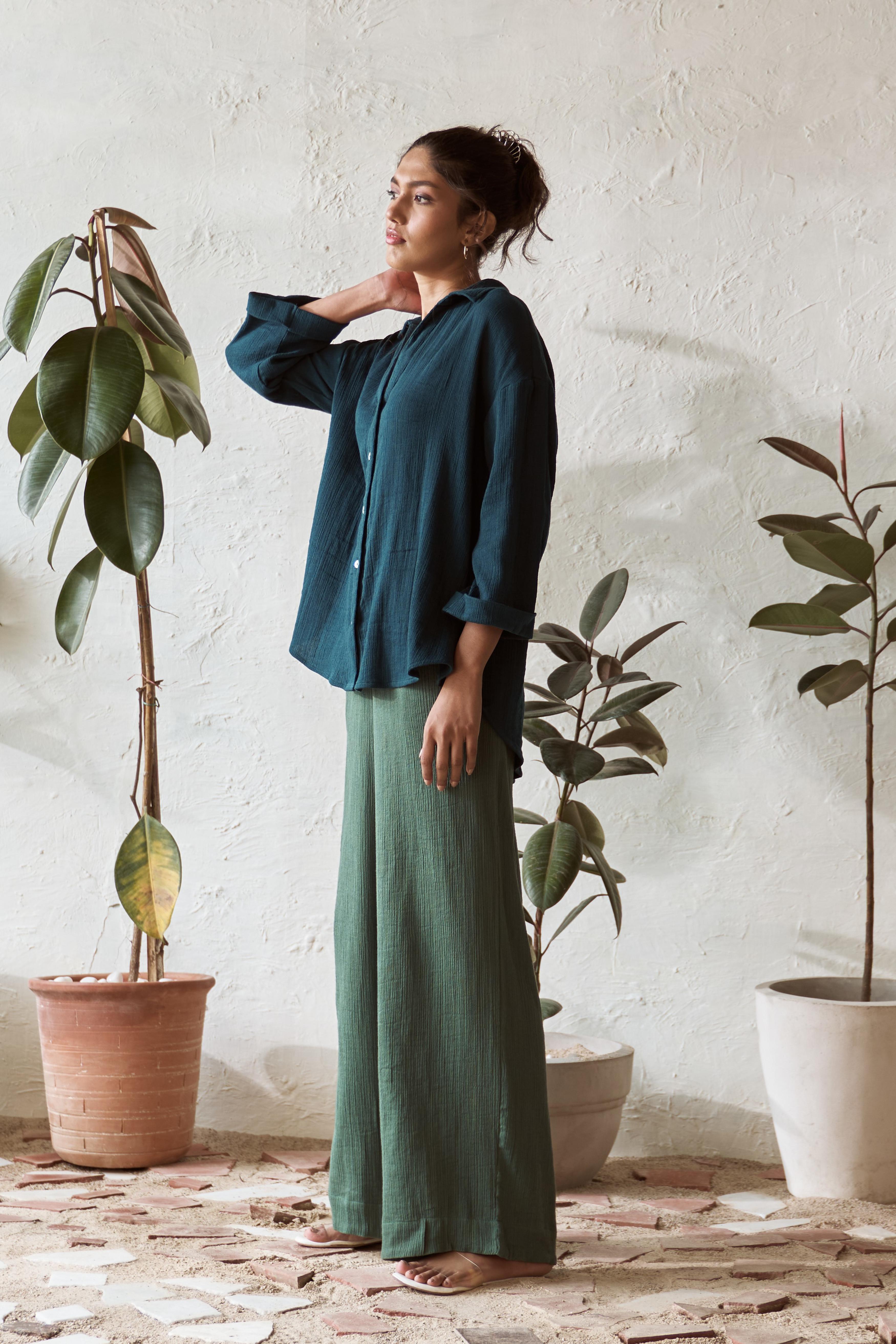 We call it the Dewy Set for its unmatched comfort due to its natural crinkle fabric! The teal blue shirt & a leafy green pant offers, flowing feel and an oversized silhouette. The shirt has a V-neck, gently curved hemline, and exquisite shell buttons. The wide-flared pants that feature a half-elasticated waistband and a broad bottom end fold that adds weight. The perfect blend go-to outfit for you.