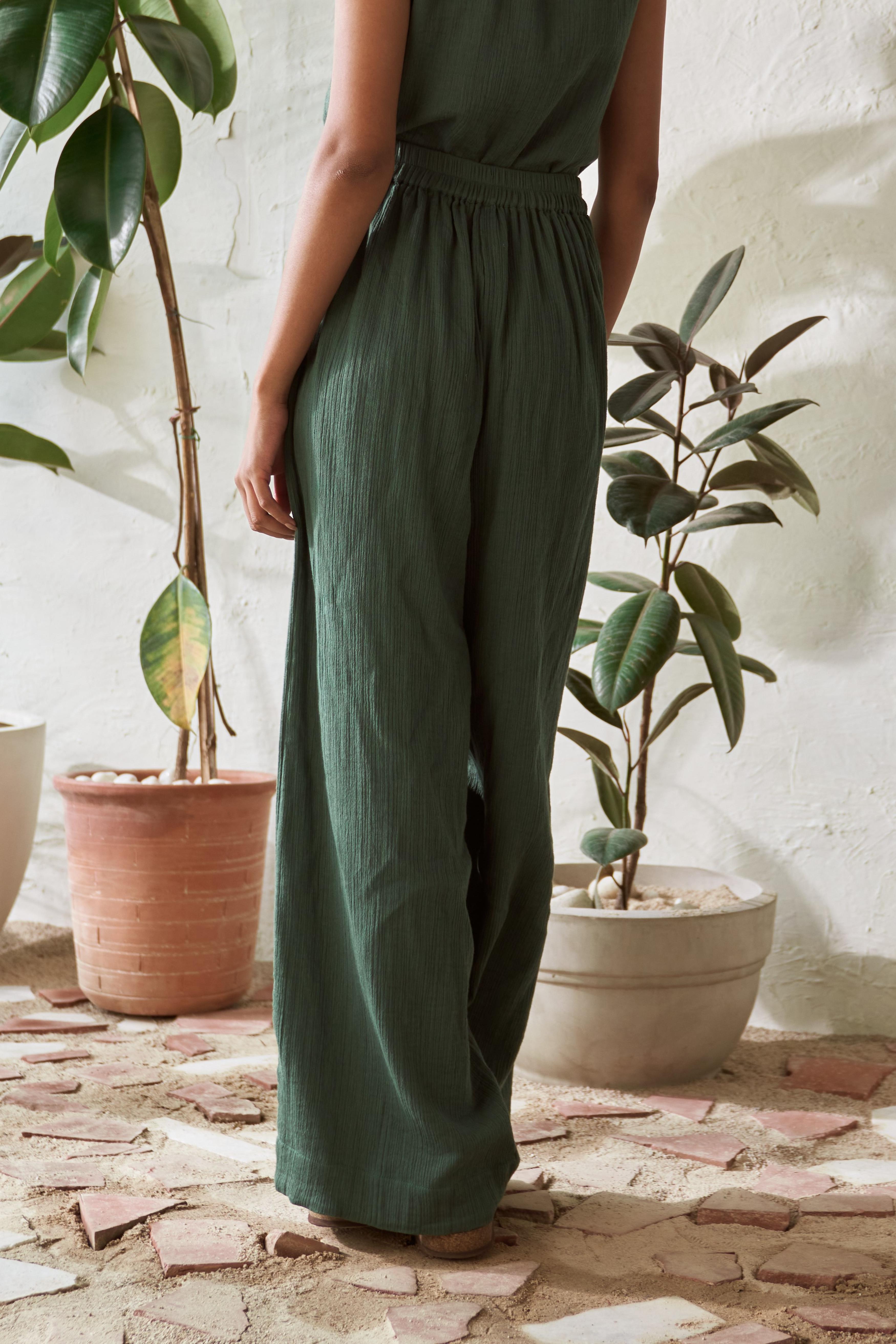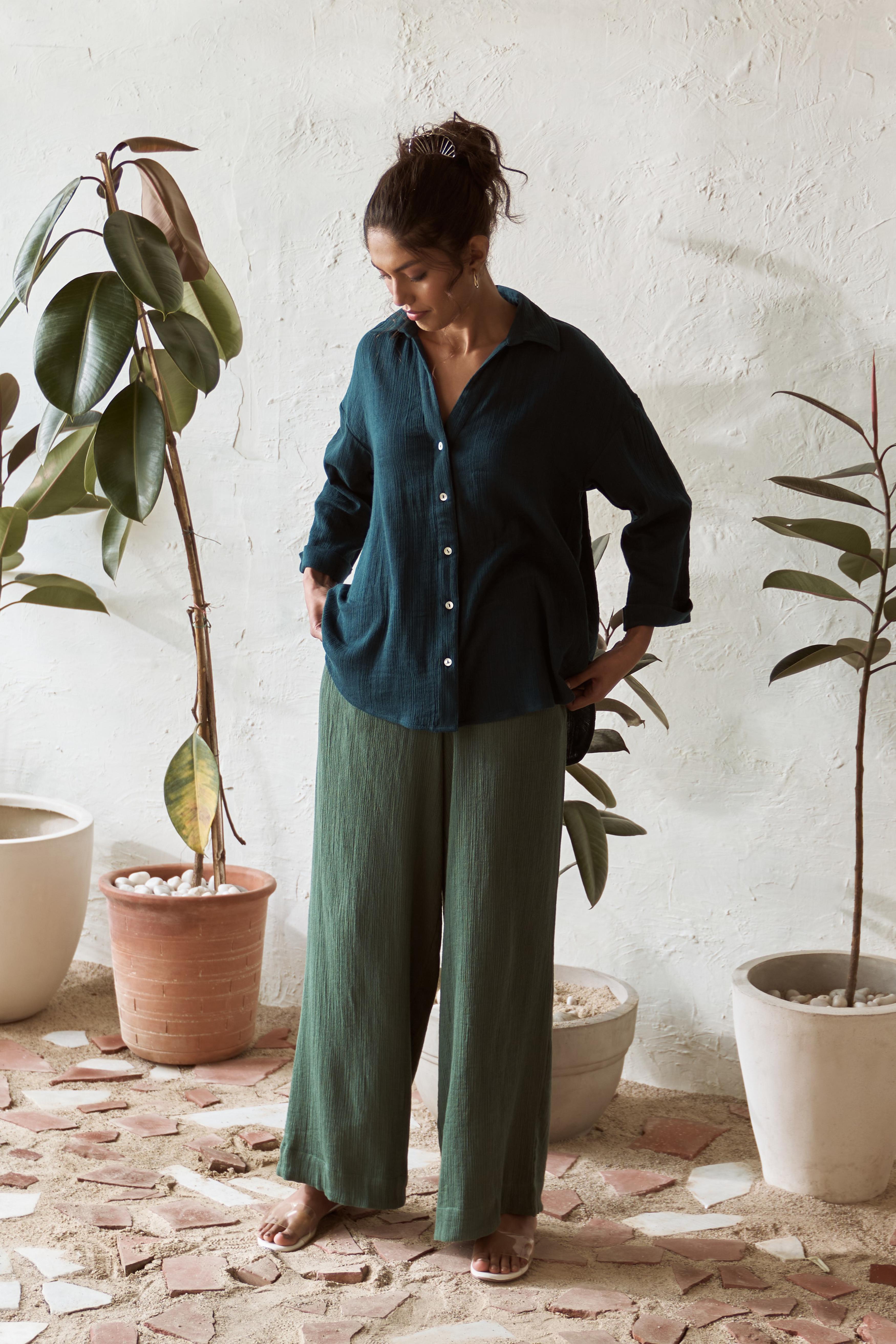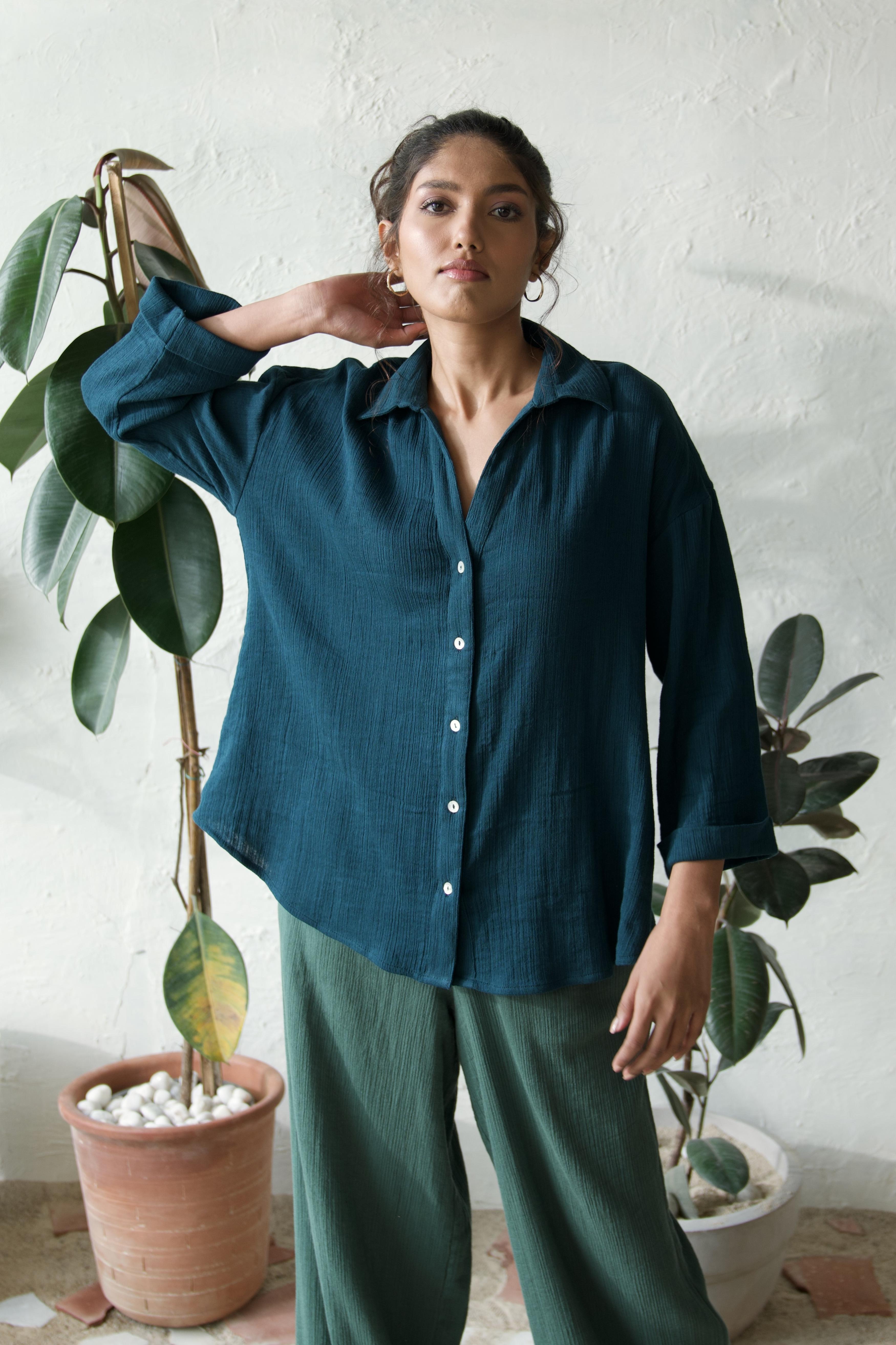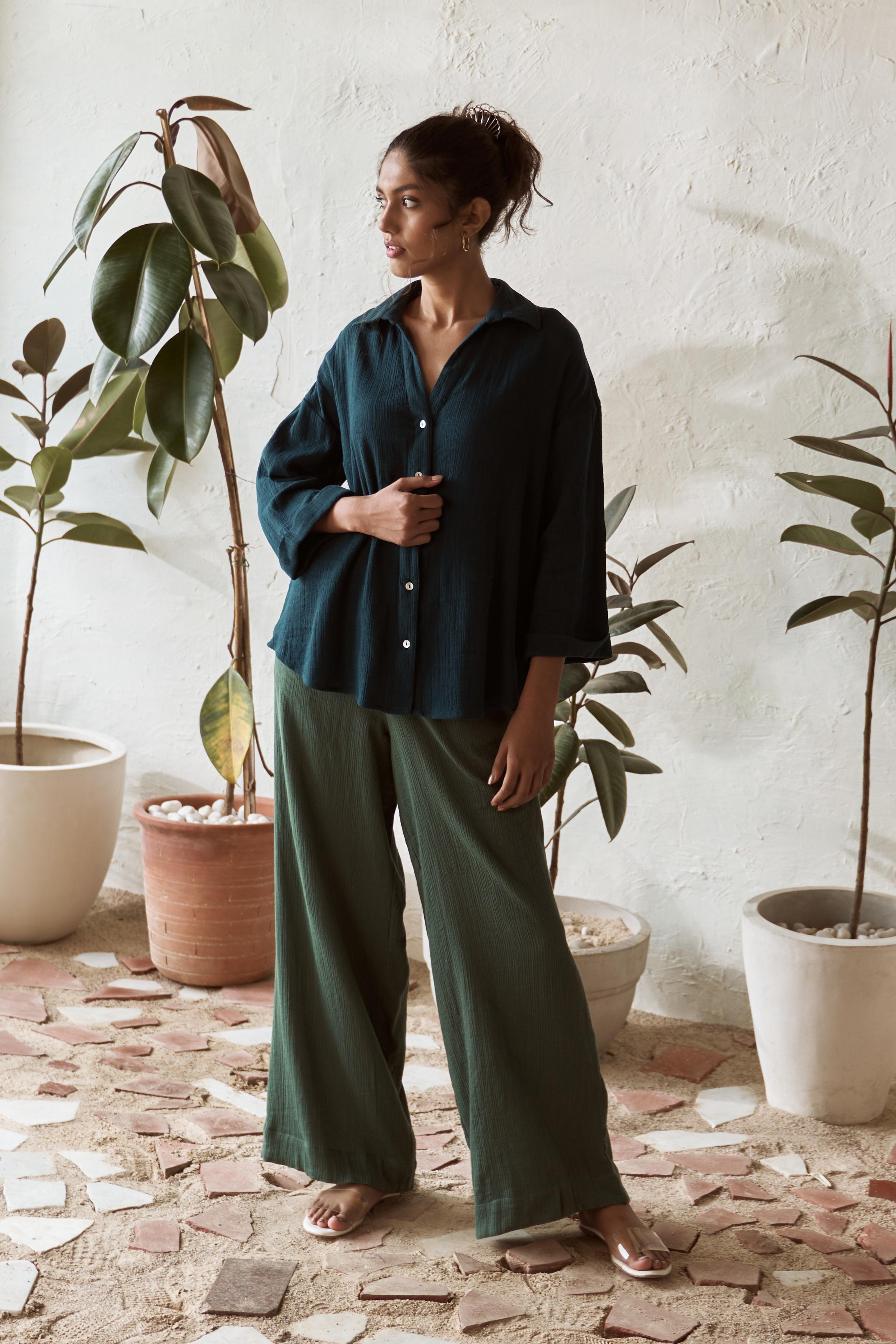 We call it the Dewy Set for its unmatched comfort due to its natural crinkle fabric! The teal blue shirt & a leafy green pant offers, flowing feel and an oversized silhouette. The shirt has a V-neck, gently curved hemline, and exquisite shell buttons. The wide-flared pants that feature a half-elasticated waistband and a broad bottom end fold that adds weight. The perfect blend go-to outfit for you.