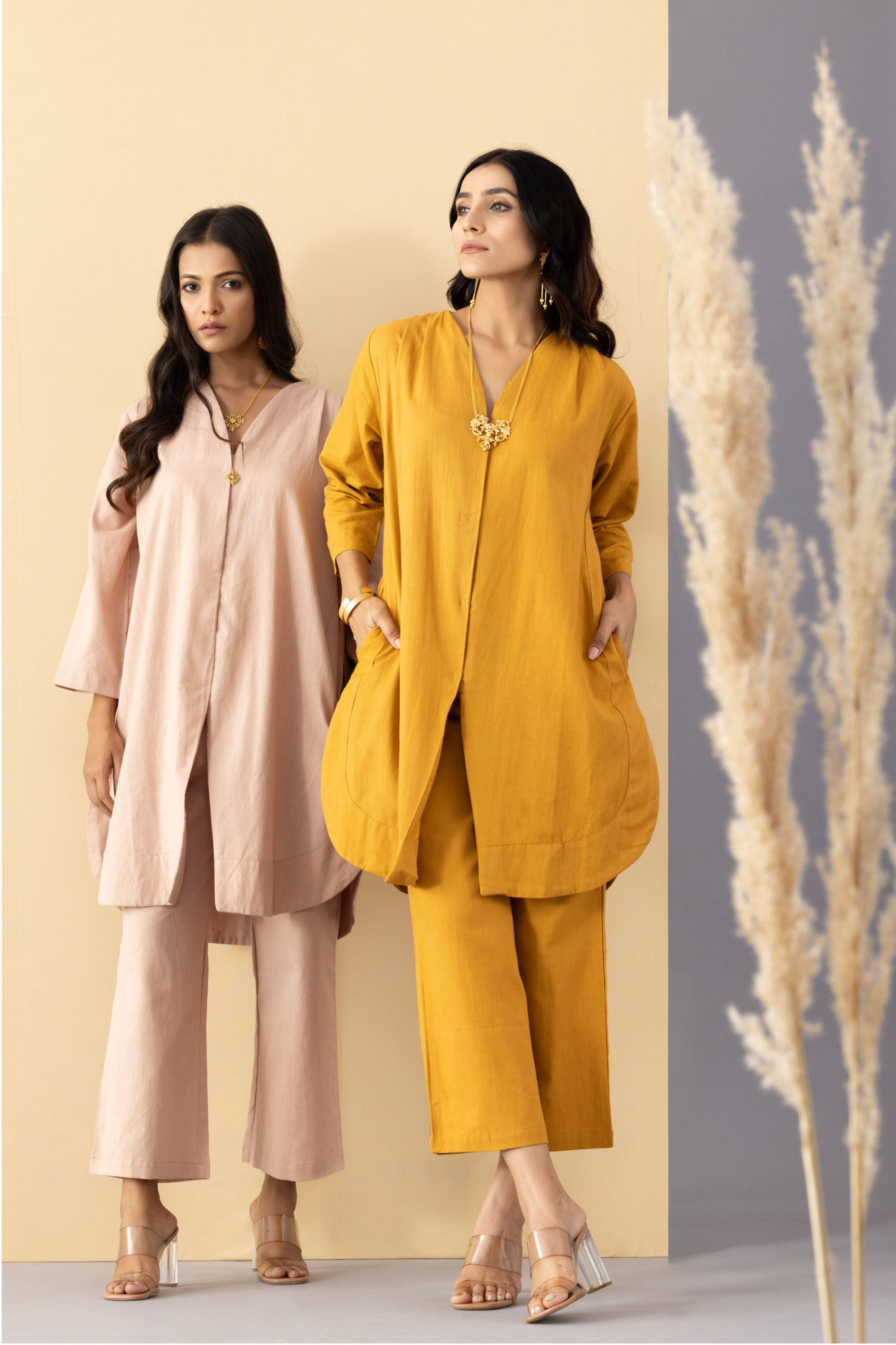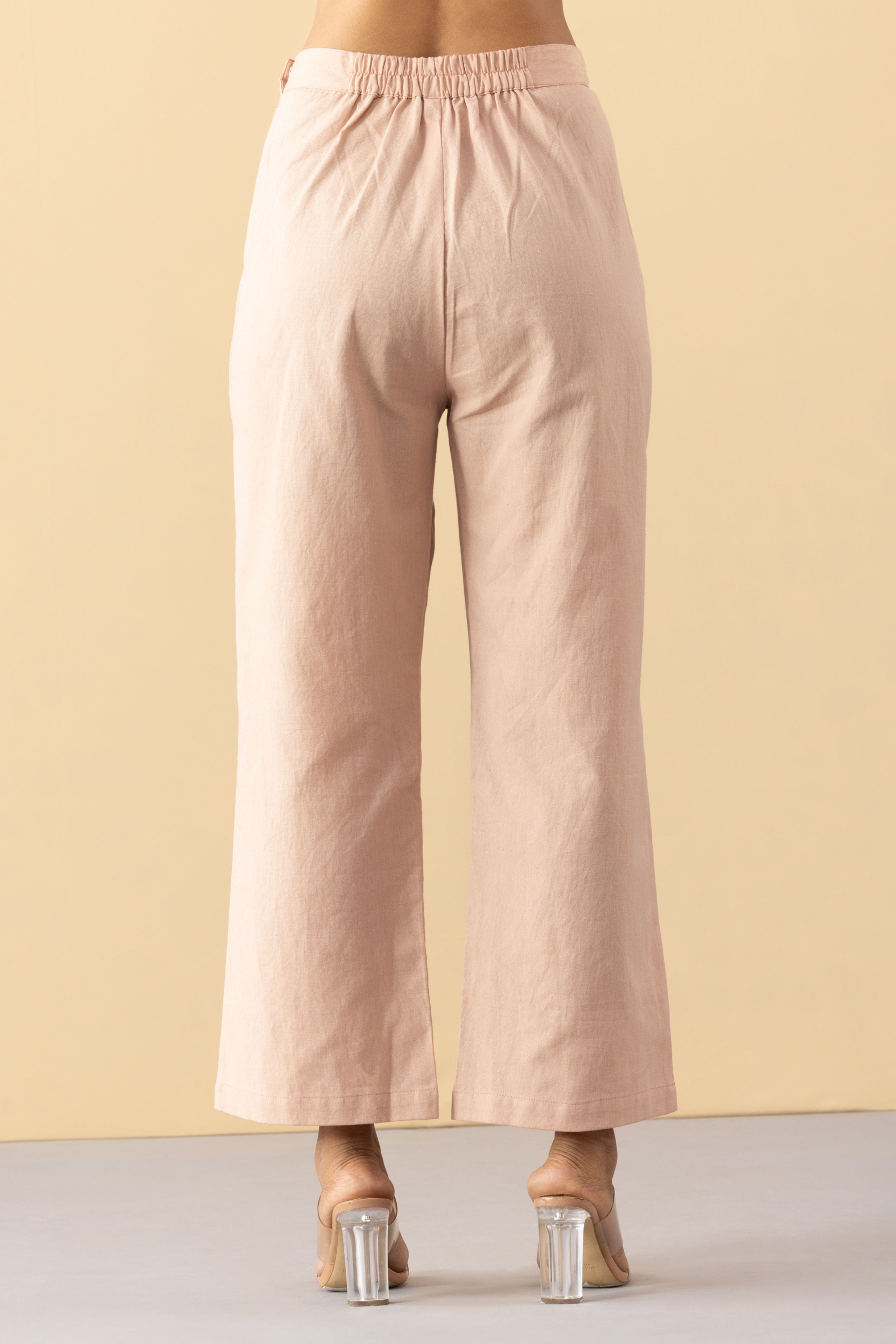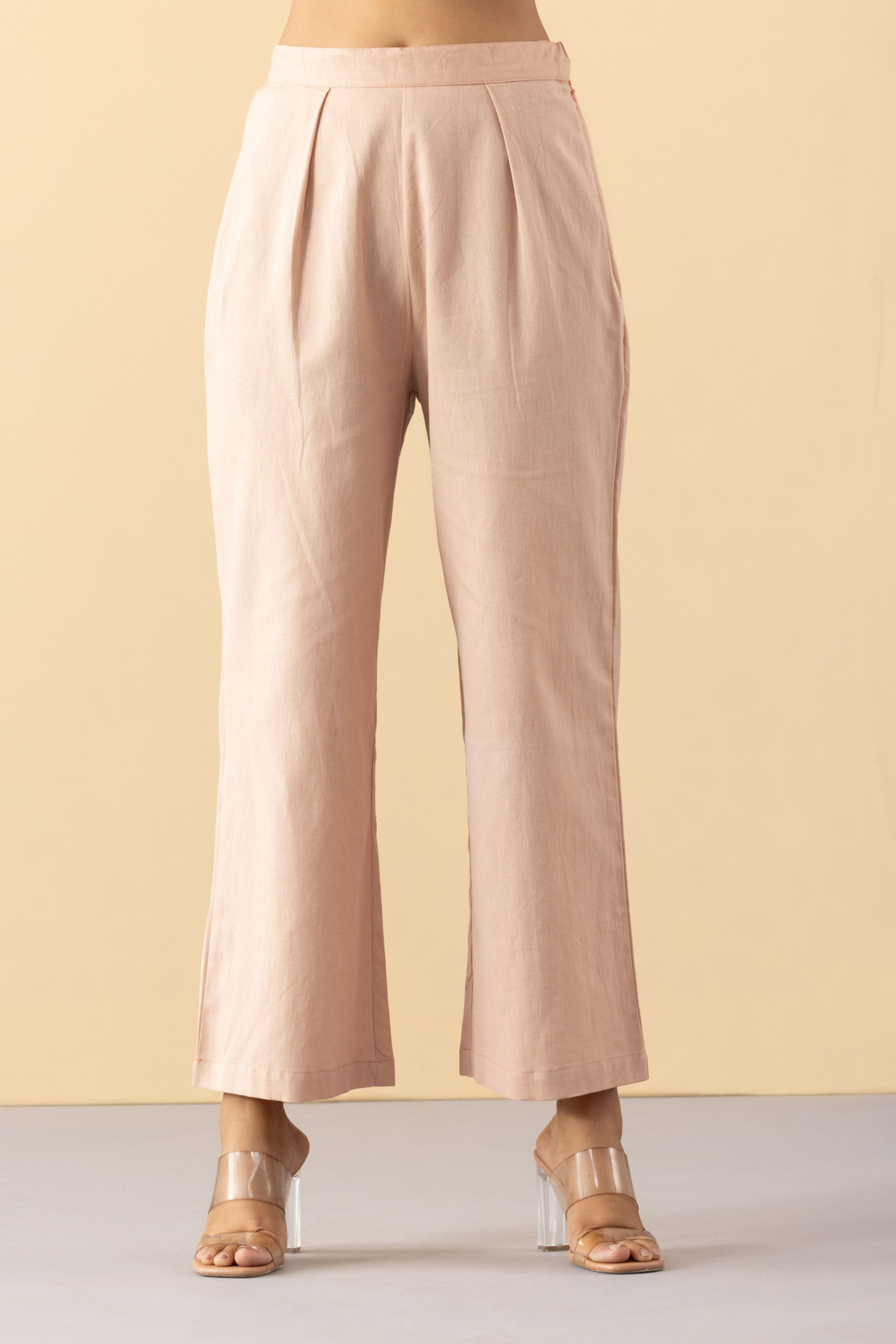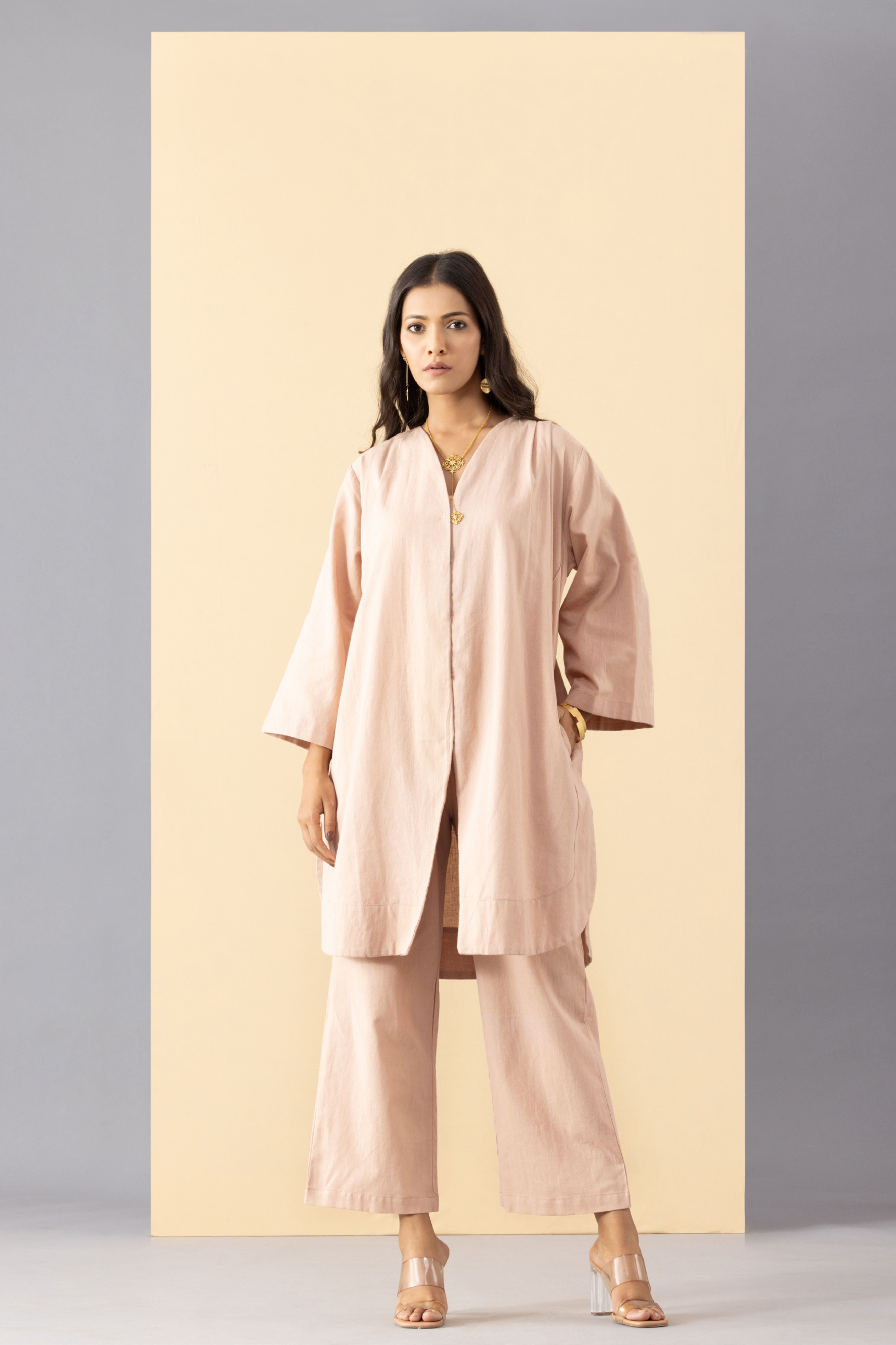 This set comprises of 'Dhriha monochrome tunic' paired with dusty pink khadi pants. Set is crafted in light weight Khadi Cotton. This set is made with breathable, comfort fabric. It is perfect for daily wear or festive occasions for that subtle minimal look. - Straight front opening tunic with side pockets - Pleats on the shoulder - high waist pants with side zipper and back elastic - Oversized fit - Model is wearing size S - This is a textile fabric. The subtle imperfections in the weave, texture and colors are a natural outcome of handcrafted textiles and not a defect.