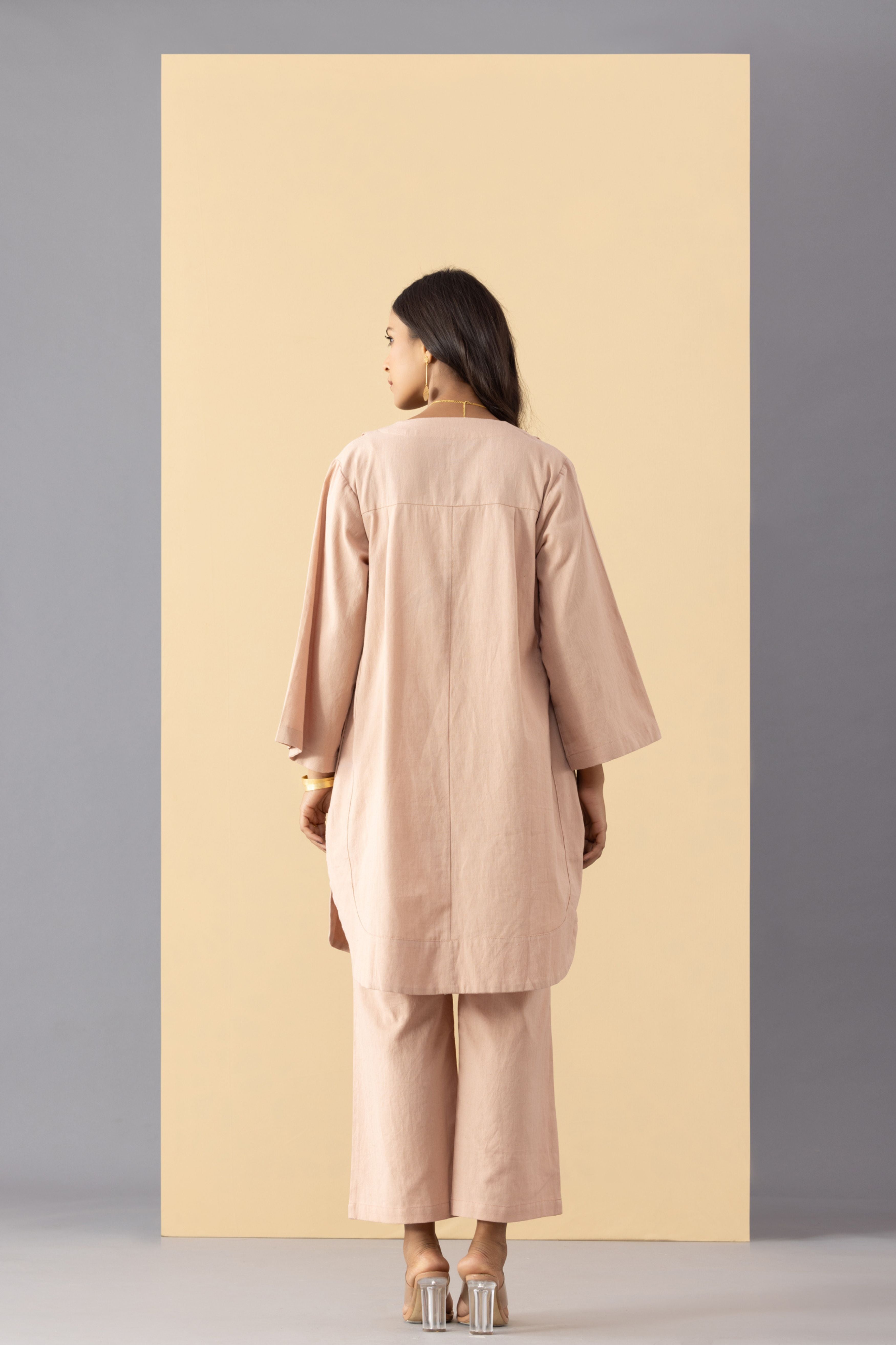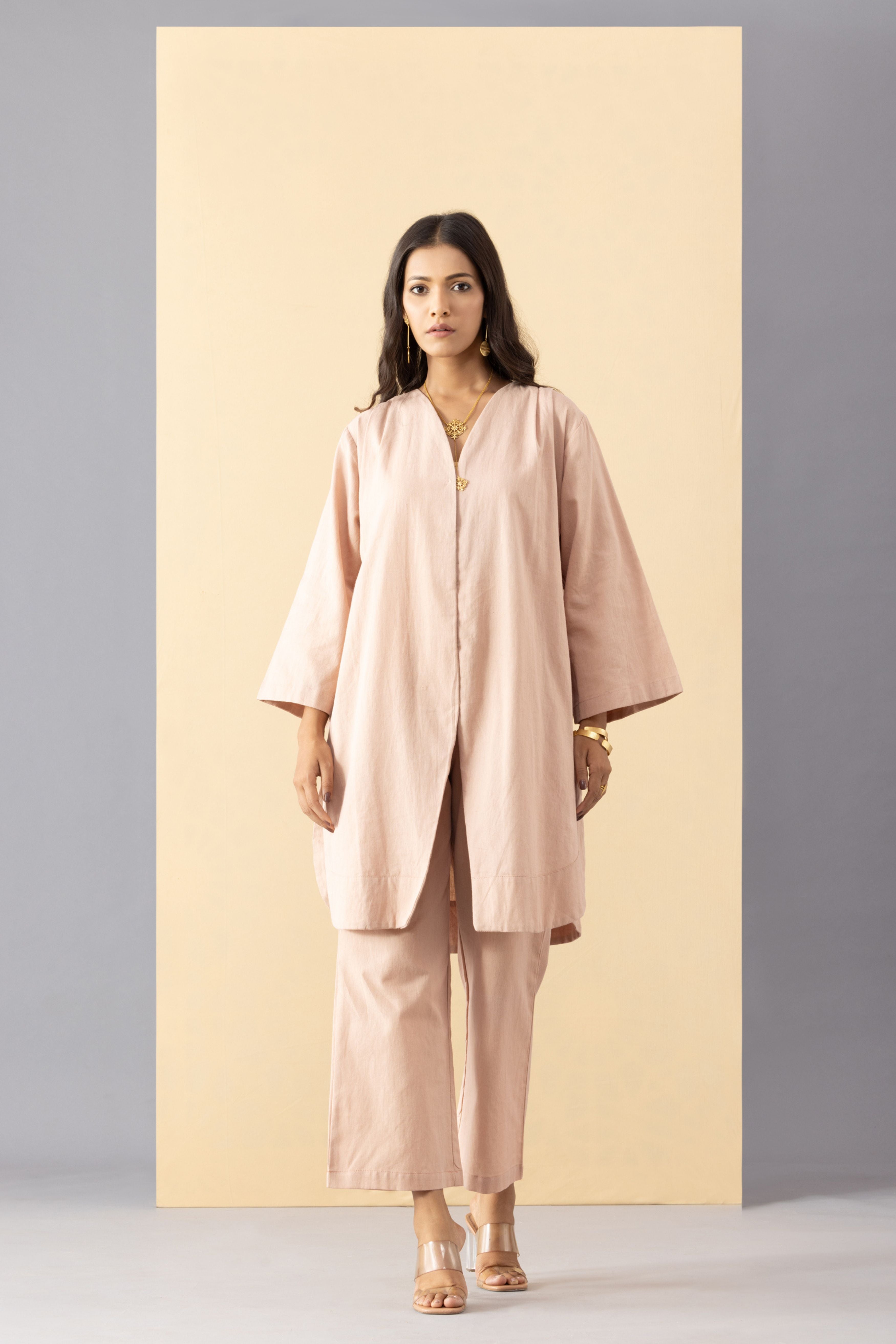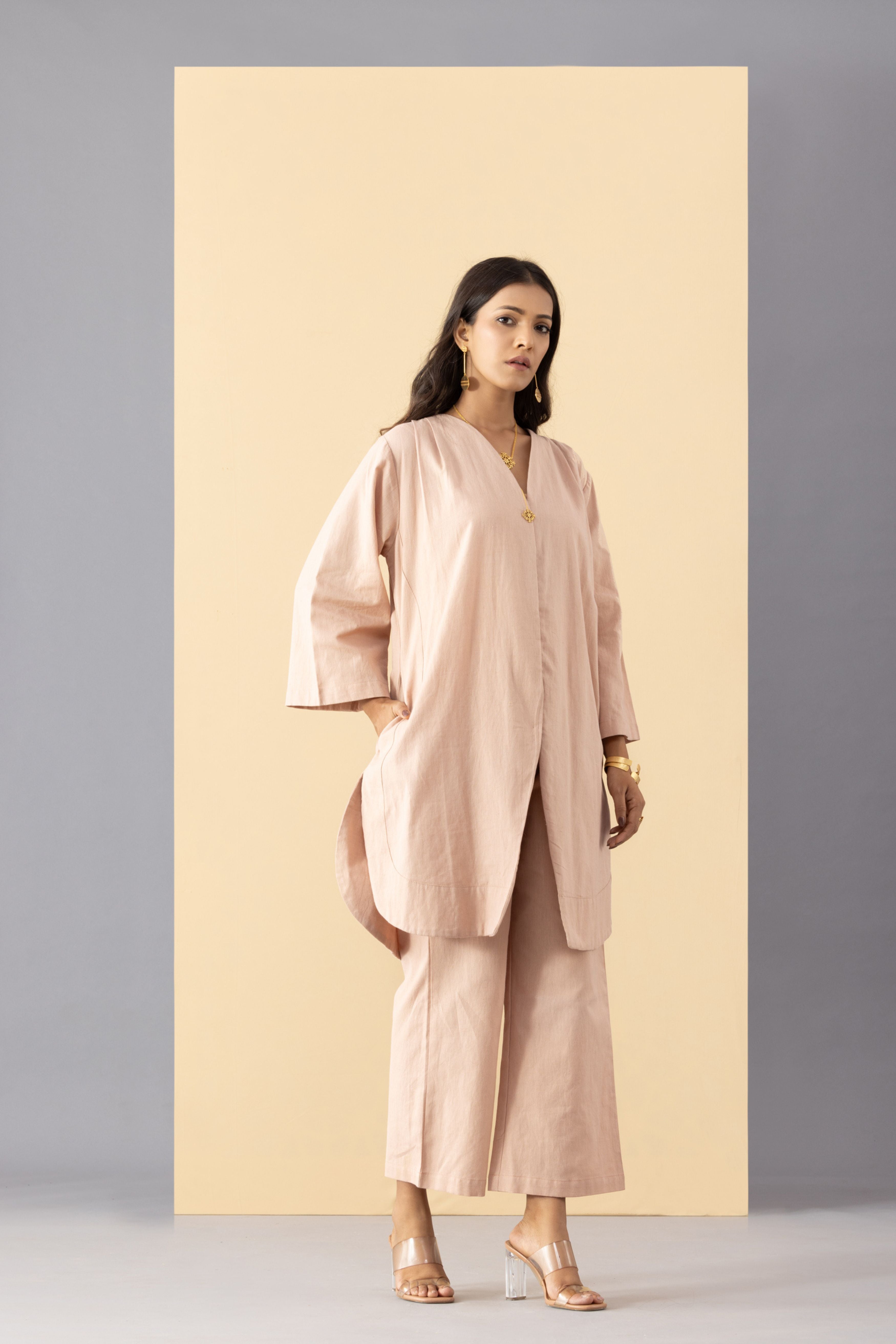 This single monotone dusty pink tunic is crafted in light weight Khadi Cotton. Designed to be worn with our dusty pink khadi pants . This tunic is made with breathable, comfort fabric. It is perfect for daily wear or festive occasions for that subtle minimal look. - Straight front opening tunic with side pockets - Pleats on the shoulder - Oversized fit - Model is wearing size S - This is a textile fabric. The subtle imperfections in the weave, texture and colors are a natural outcome of handcrafted textiles and not a defect.