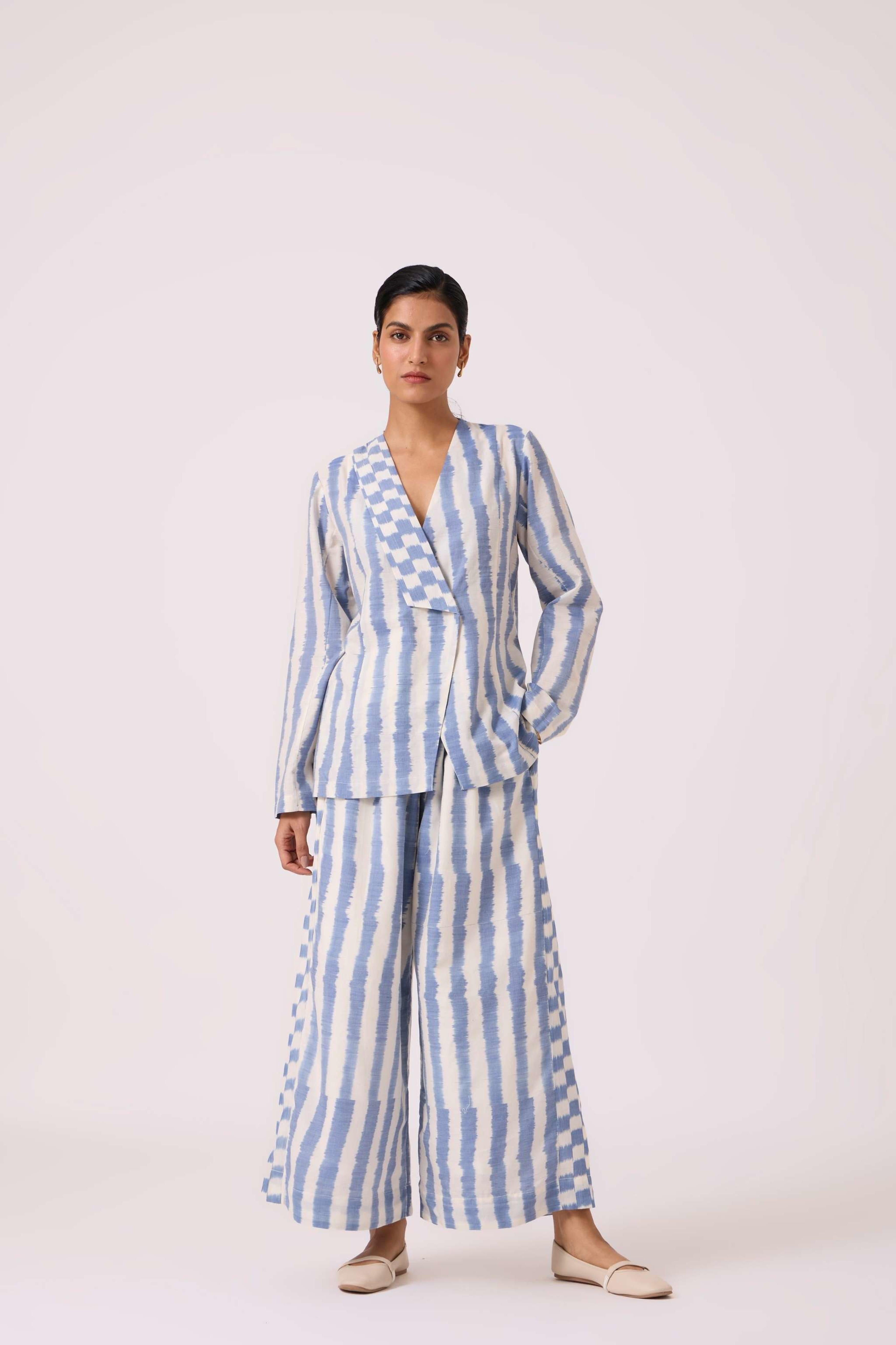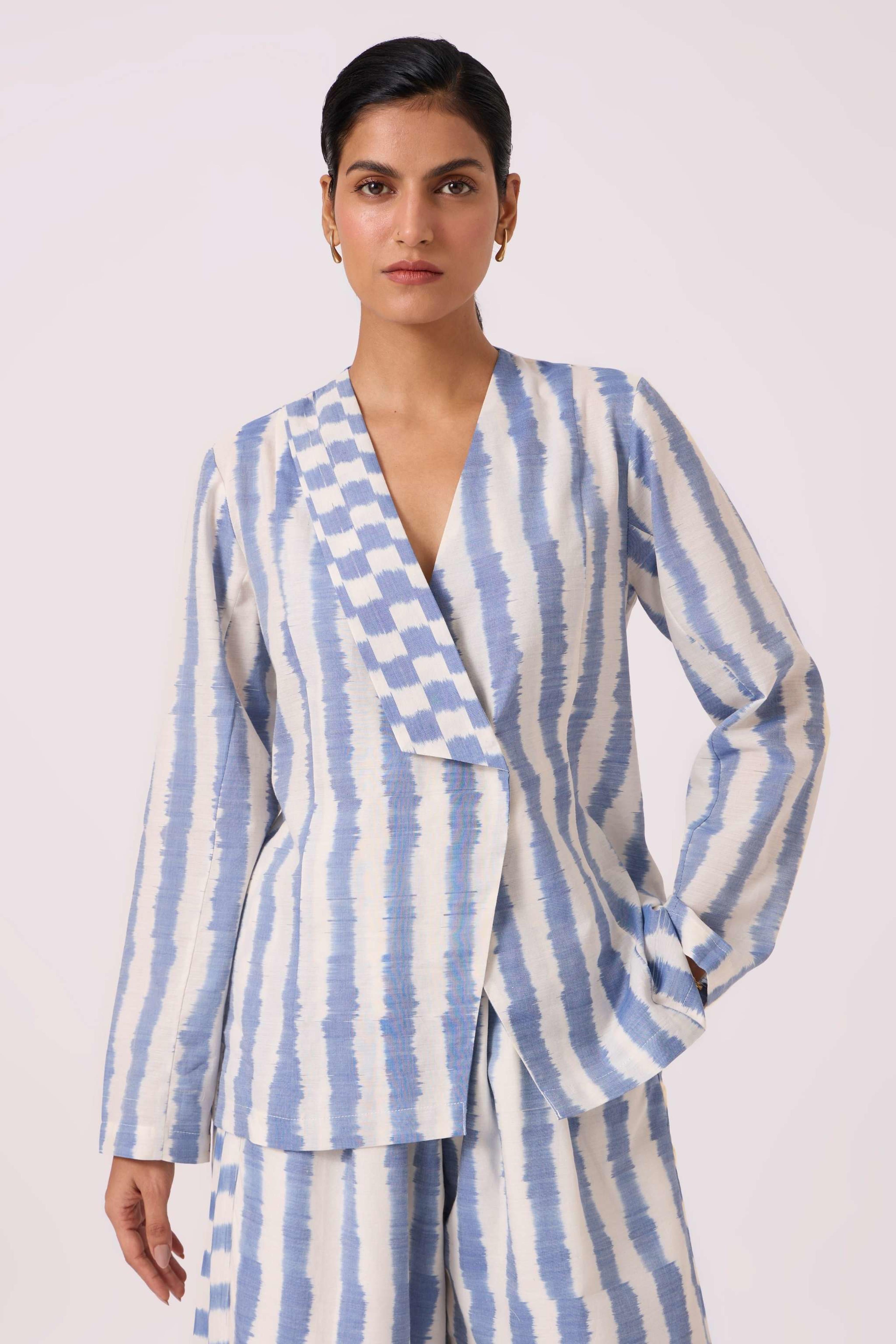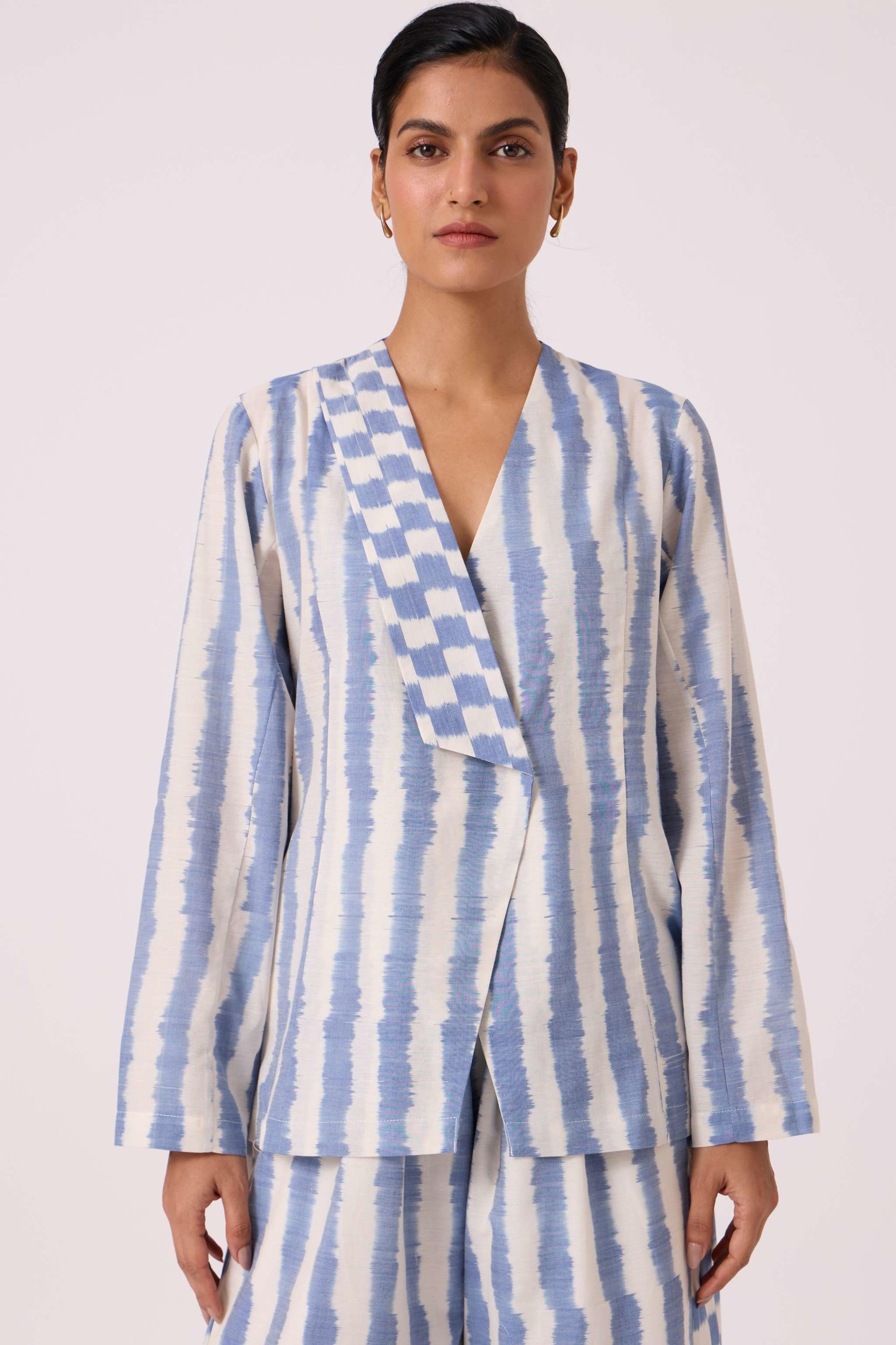 This is a *single-breasted, slim-fit jacket* with a unique *draped asymmetric collar* and *full sleeves*. It is made from a studio-developed *Ikat design* that has been *handwoven by artisans in Telangana*. The text notes that any slight irregularities in the fabric are a natural characteristic of the handmade process. For sizing, the model Chhavi, who is 5'6", is wearing an XS.