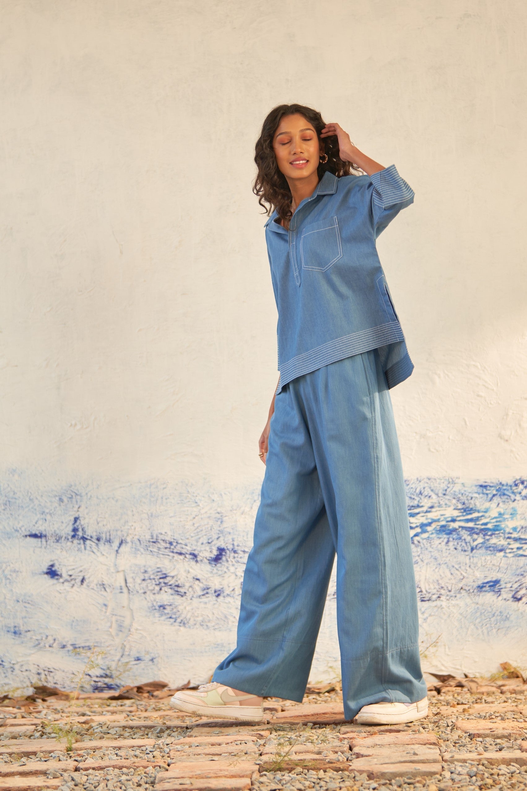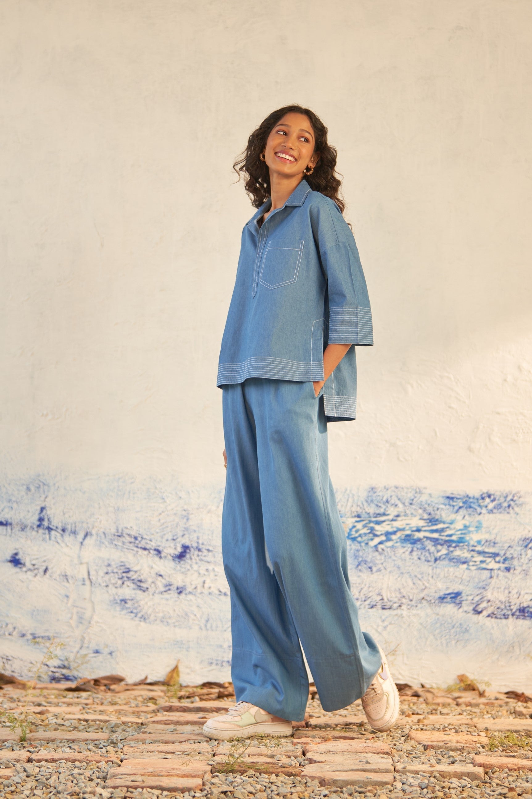 Experience the epitome of comfort with this leisurewear-inspired ensemble. The elbow-sleeved top boasts a relaxed shape and features a collared neckline with a deep V-neck and a patch pocket detailed with white stitching. Paired with pants featuring wide, full-length legs adorned with stylish broad folds at the bottom, this set ensures a comfortable fit with its elasticated waistband.