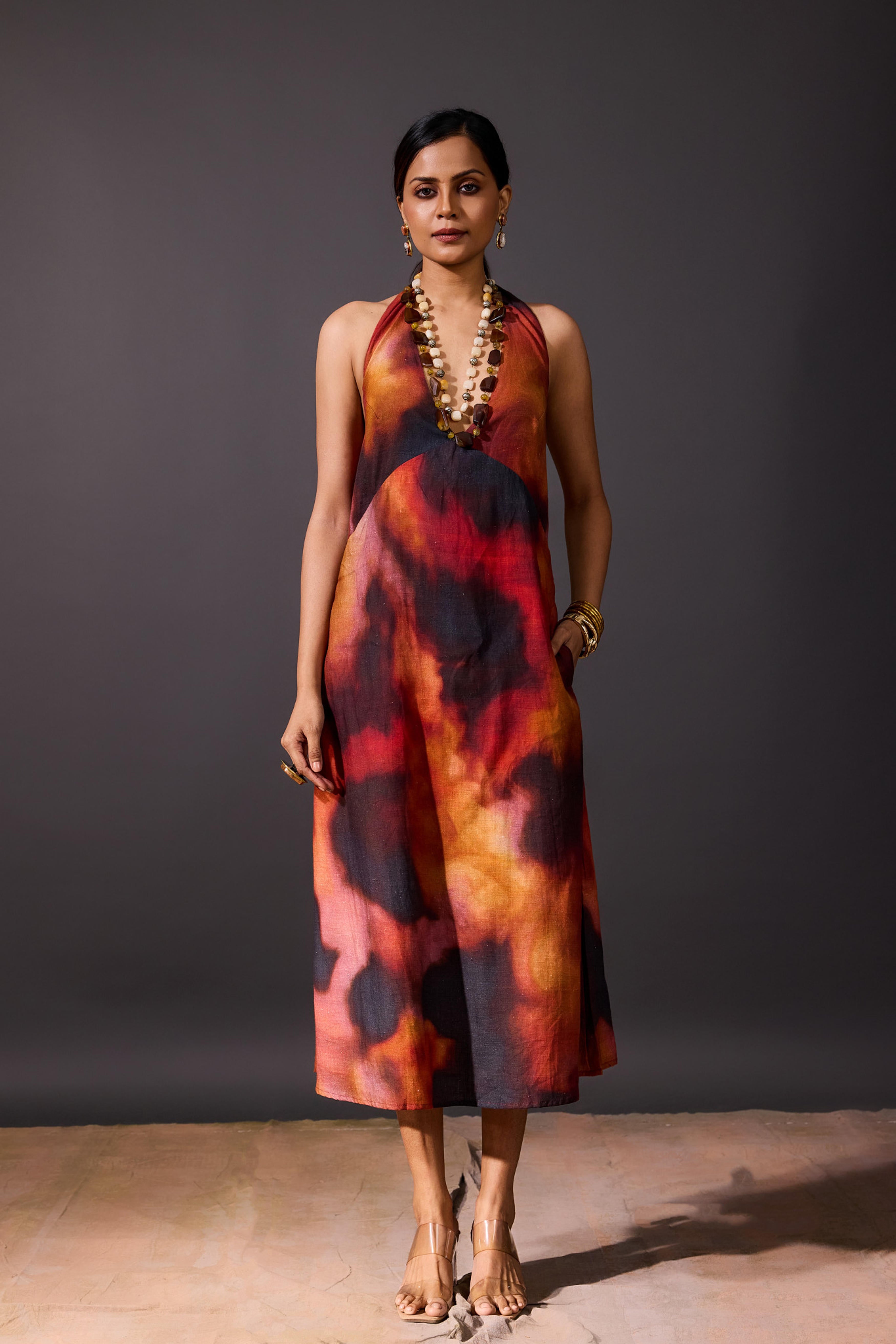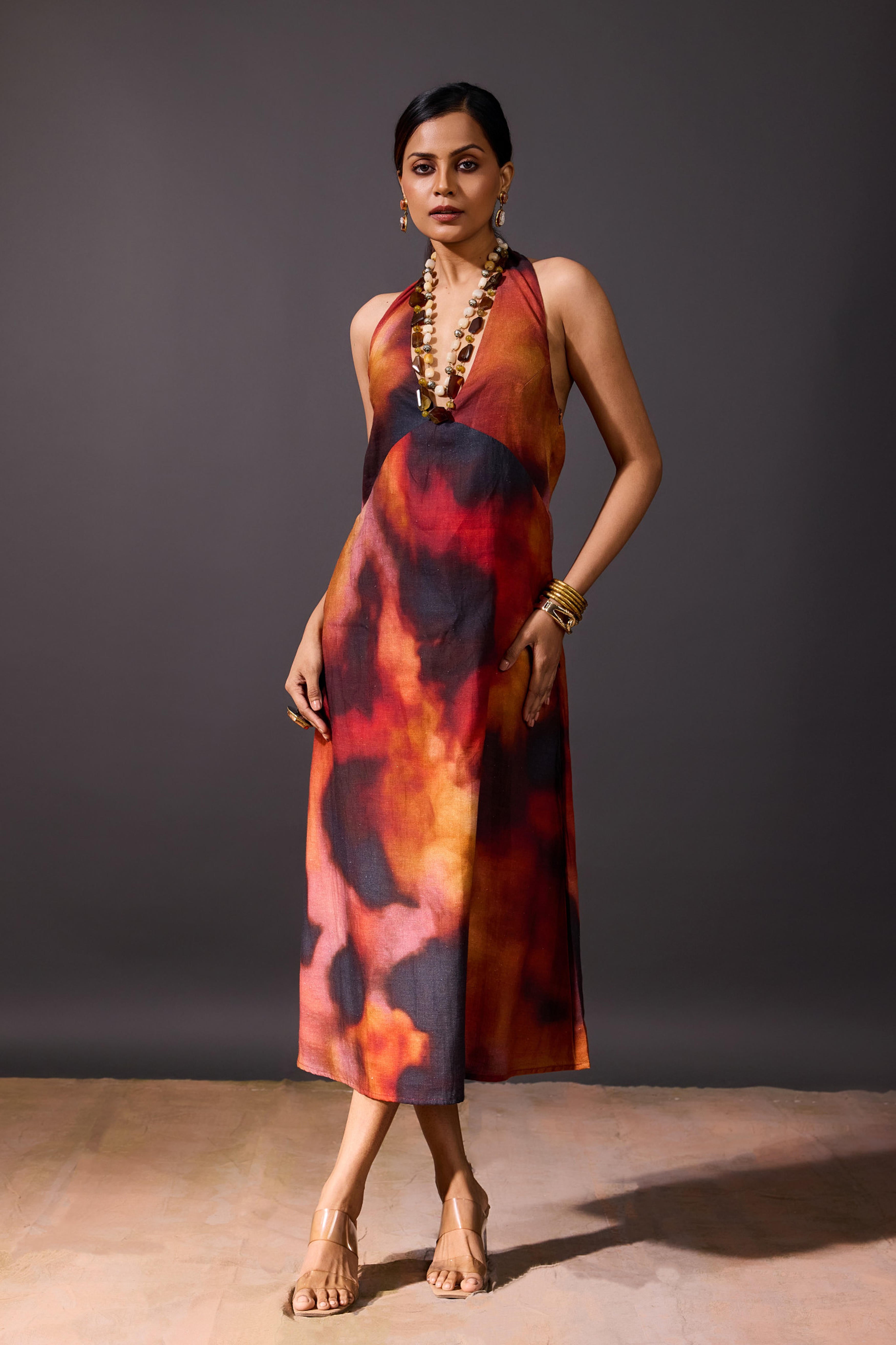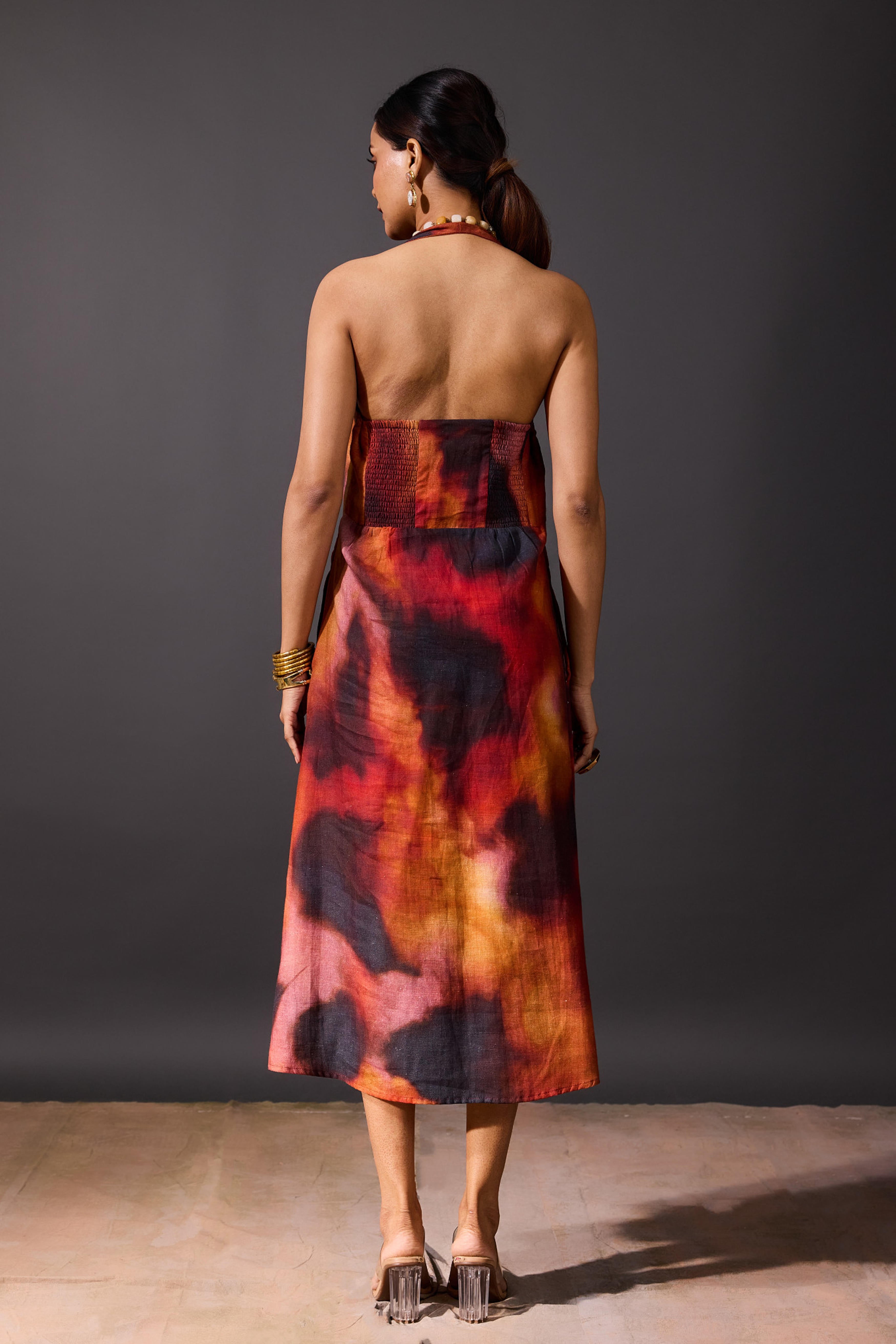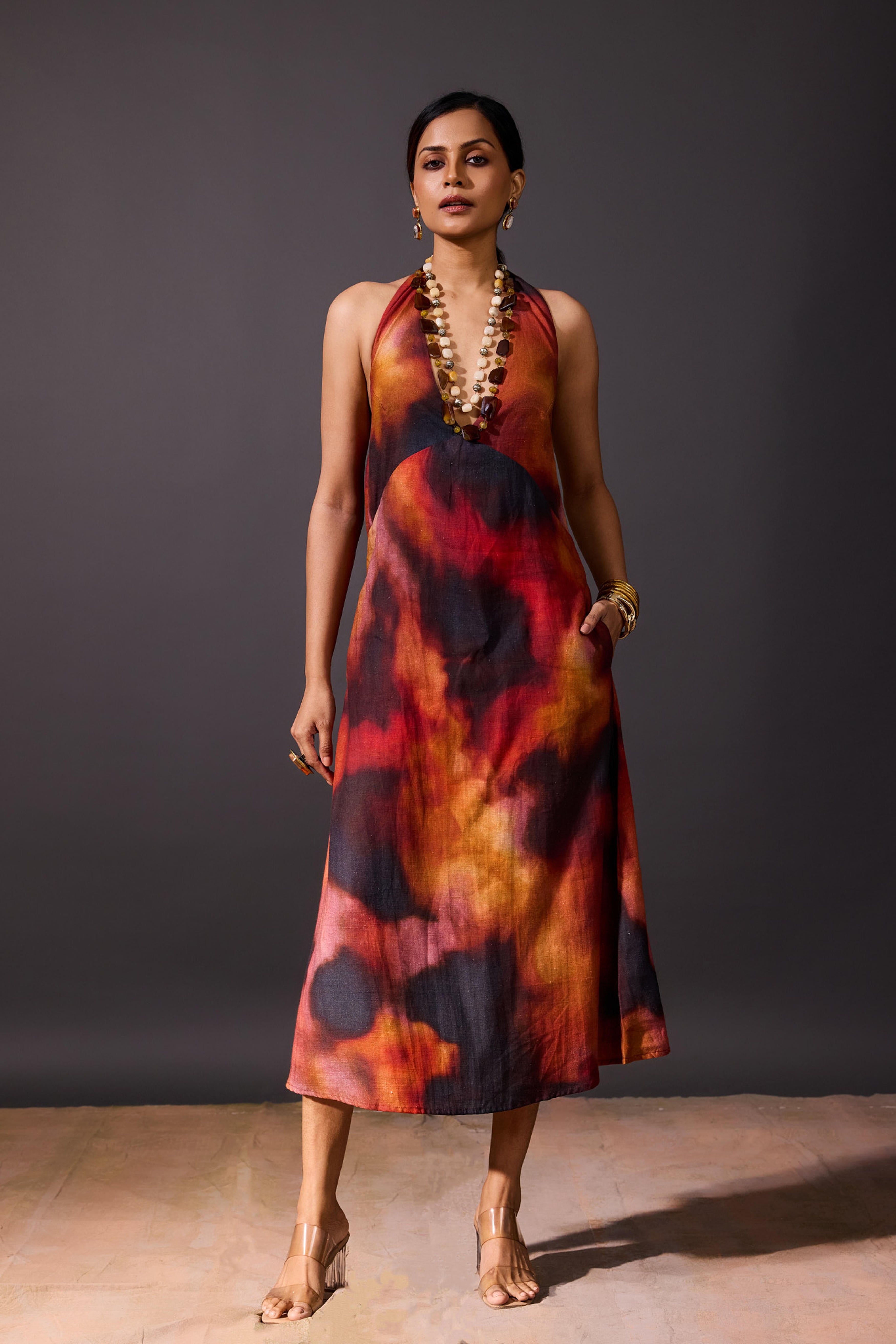 The Divya Dress in Inferno is a free-spirited yet sophisticated halter midi crafted in 100% linen. Its fluid silhouette and bias-cut paneling in fiery Inferno hues of deep red, burnt orange, and black create a natural flow with every step. The halter neckline adds a sensuous charm, while the smocked back ensures comfort and flexibility. Lightweight and breathable, it’s perfect for festive gatherings, sundown evenings, or seaside getaways. Pair it with chunky bangles and statement necklaces for a bold festive mood, or keep it simple with delicate accents for quiet elegance.