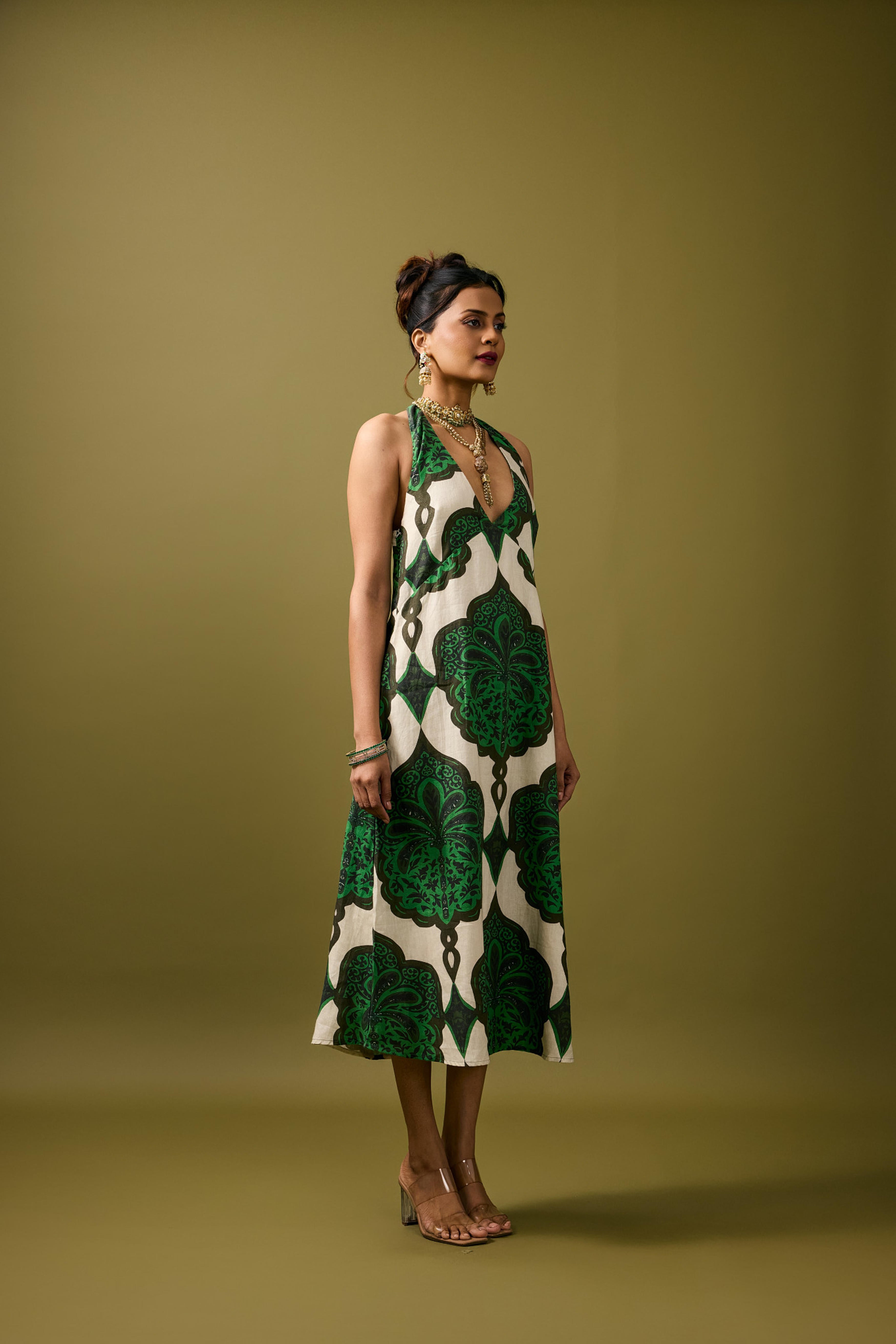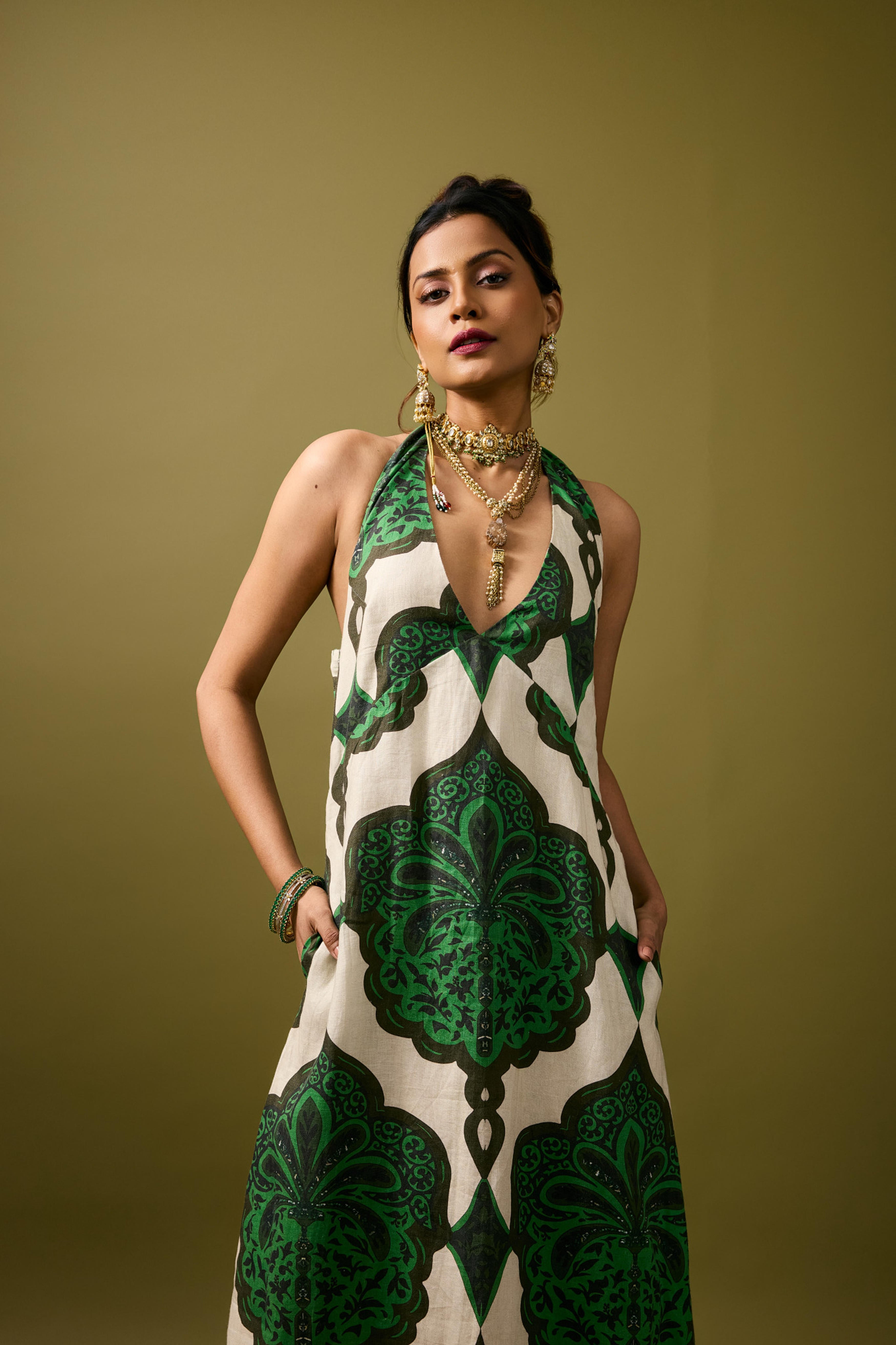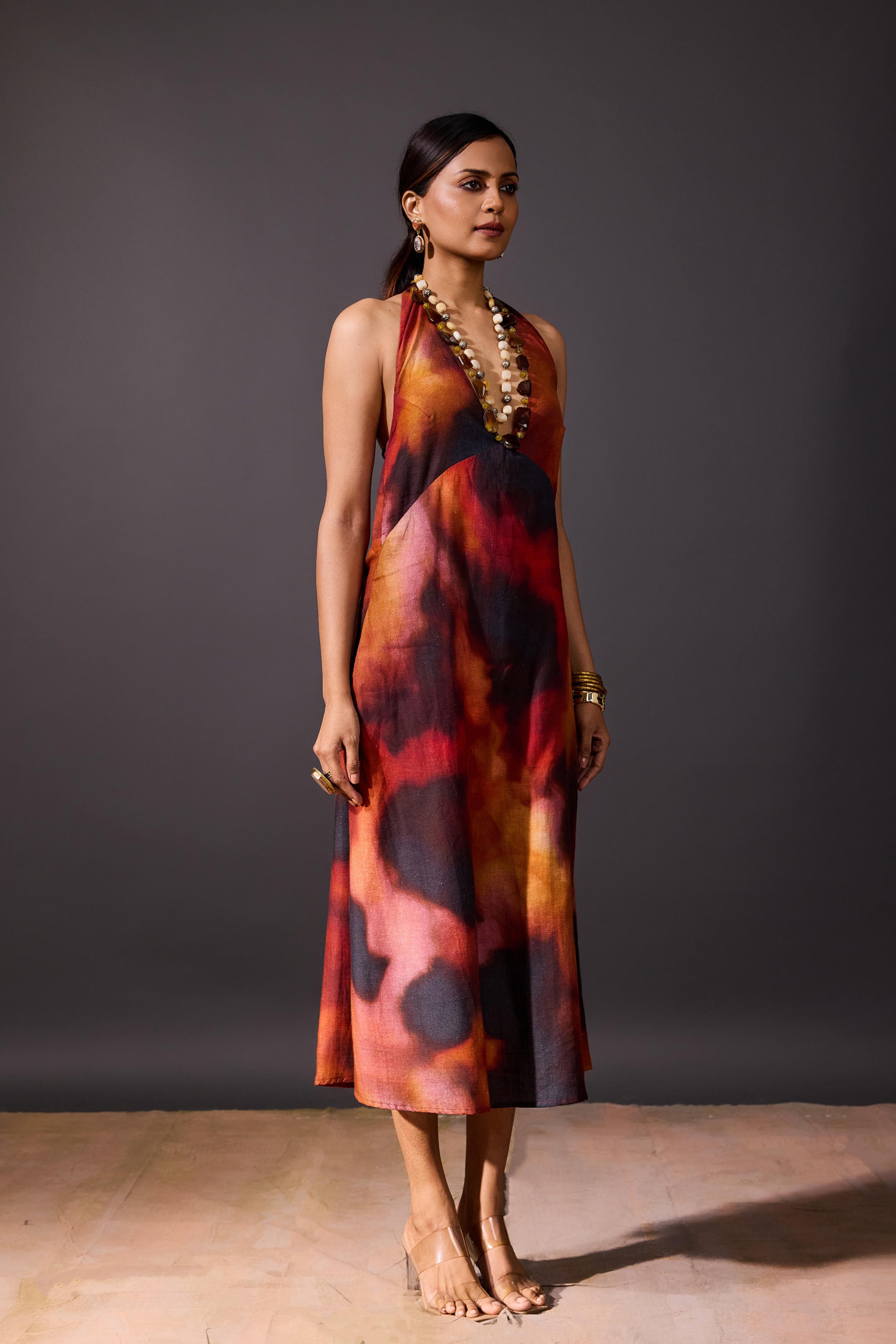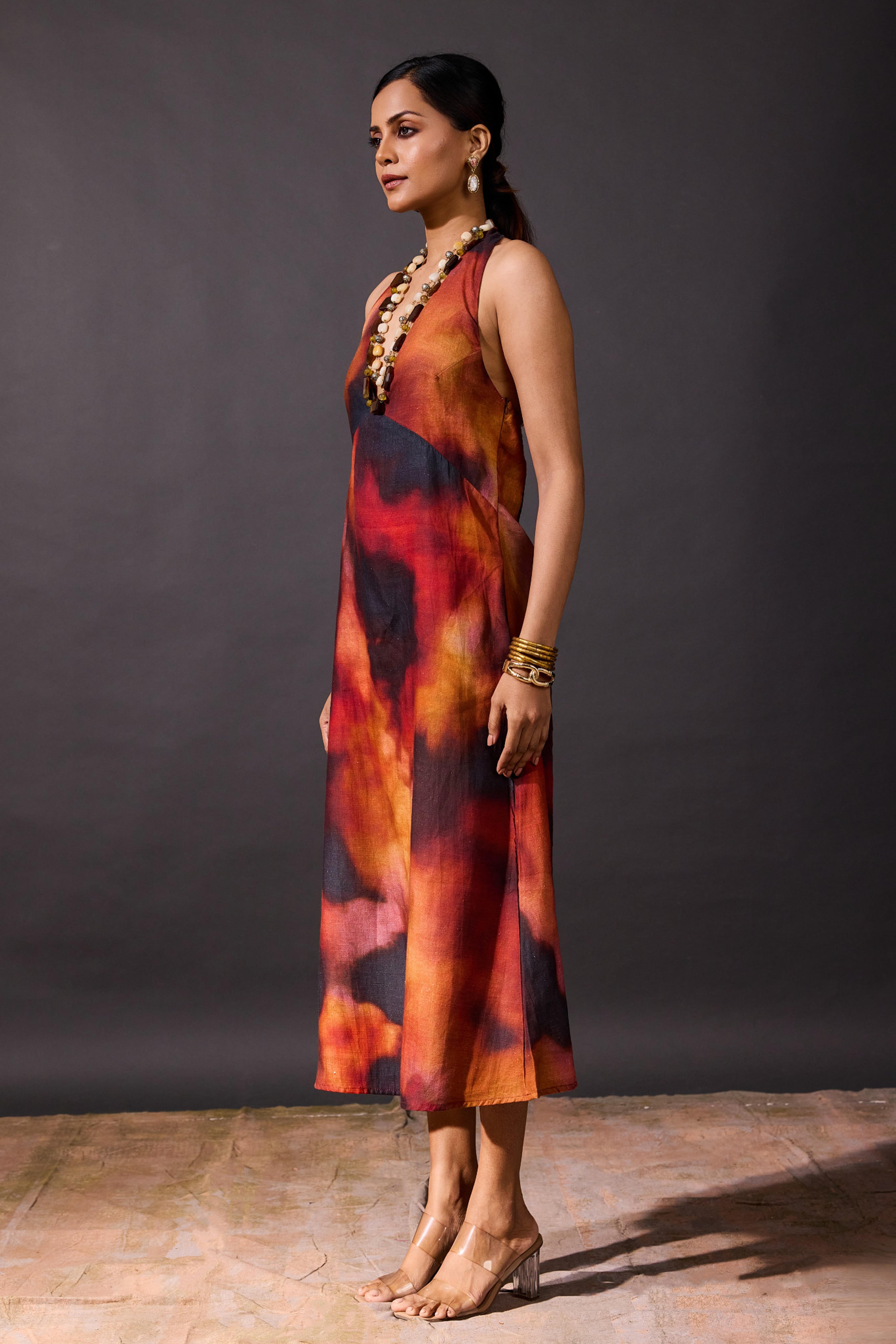 The Divya Dress in Inferno is a free-spirited yet sophisticated halter midi crafted in 100% linen. Its fluid silhouette and bias-cut paneling in fiery Inferno hues of deep red, burnt orange, and black create a natural flow with every step. The halter neckline adds a sensuous charm, while the smocked back ensures comfort and flexibility. Lightweight and breathable, it’s perfect for festive gatherings, sundown evenings, or seaside getaways. Pair it with chunky bangles and statement necklaces for a bold festive mood, or keep it simple with delicate accents for quiet elegance.
