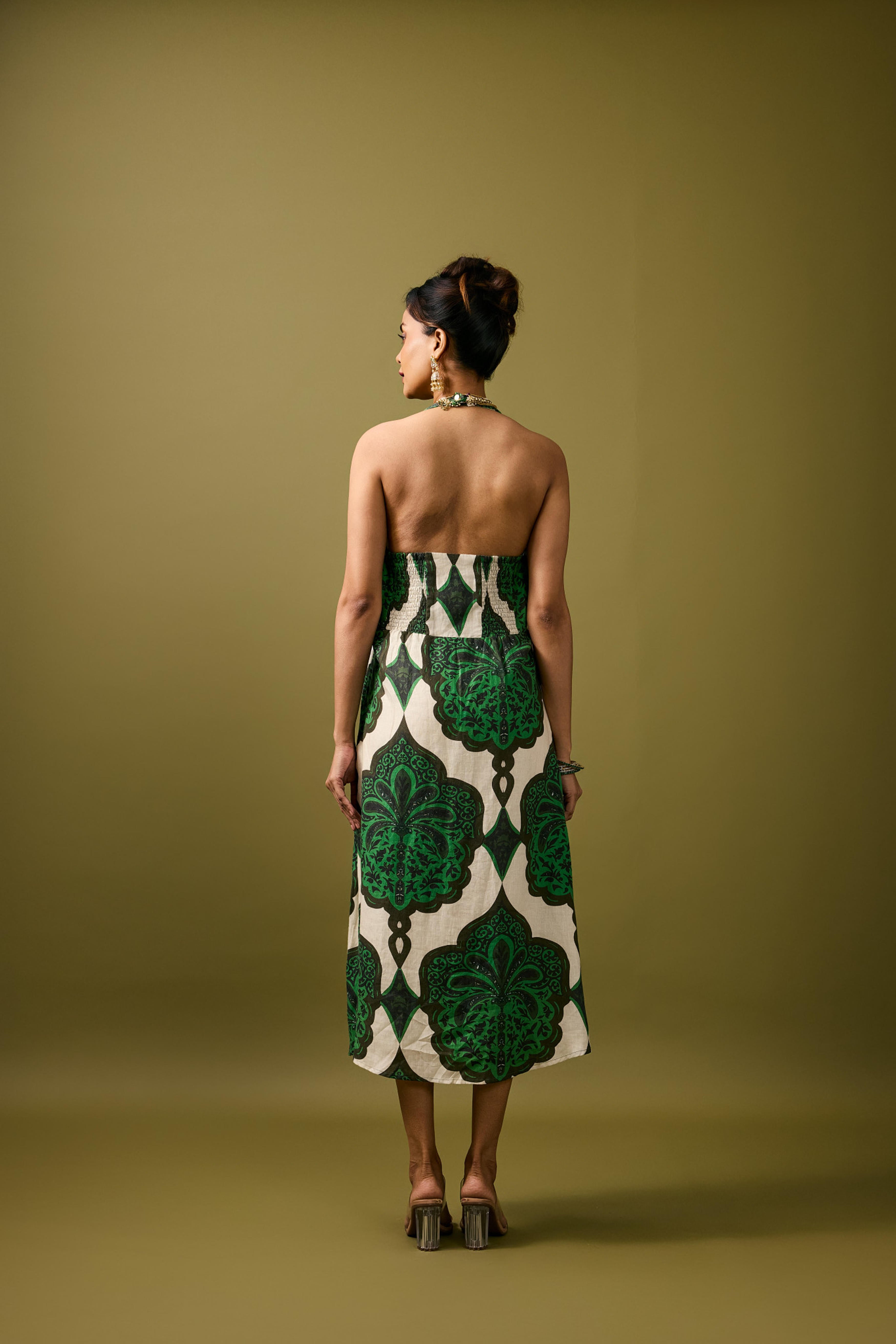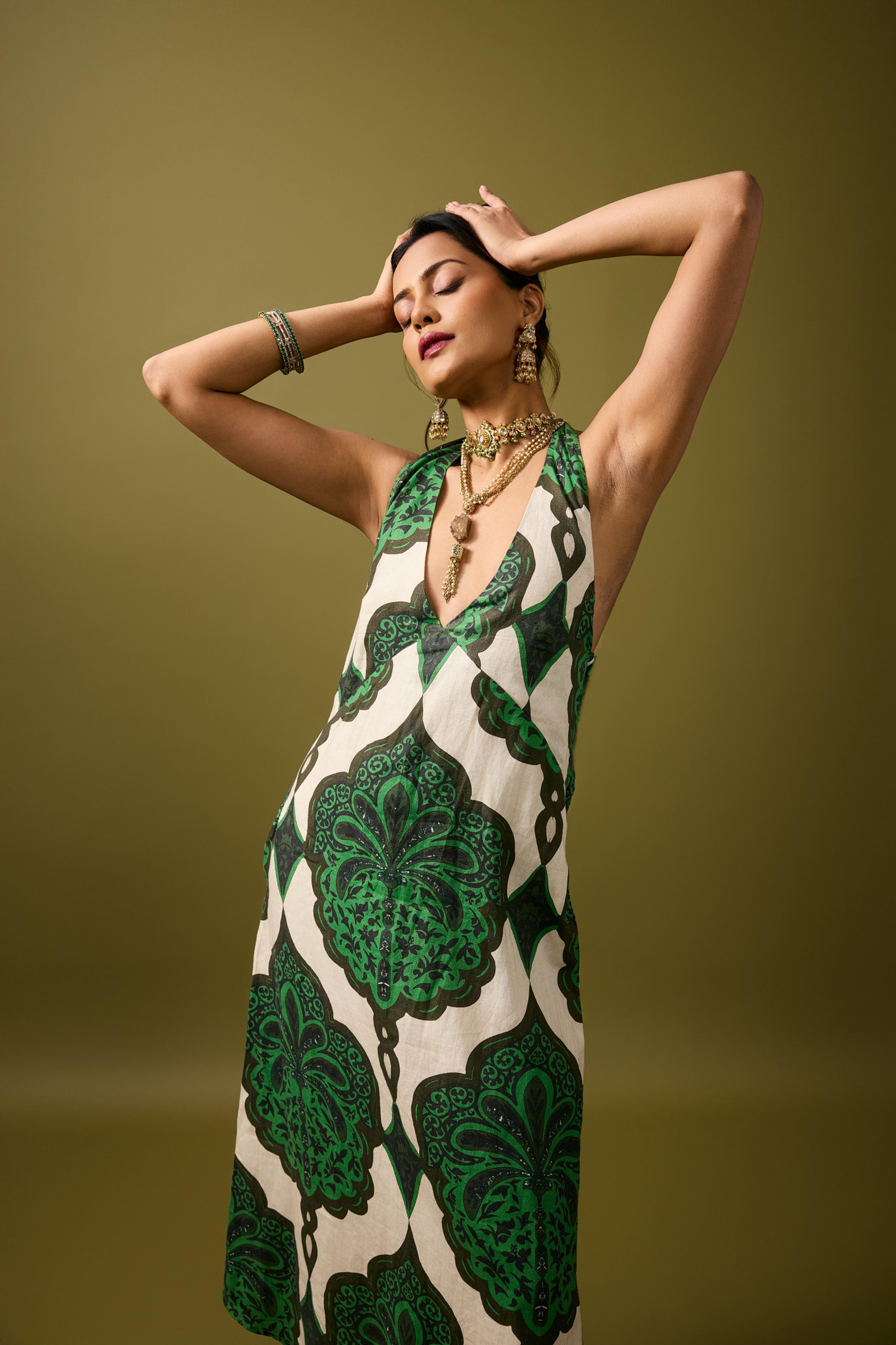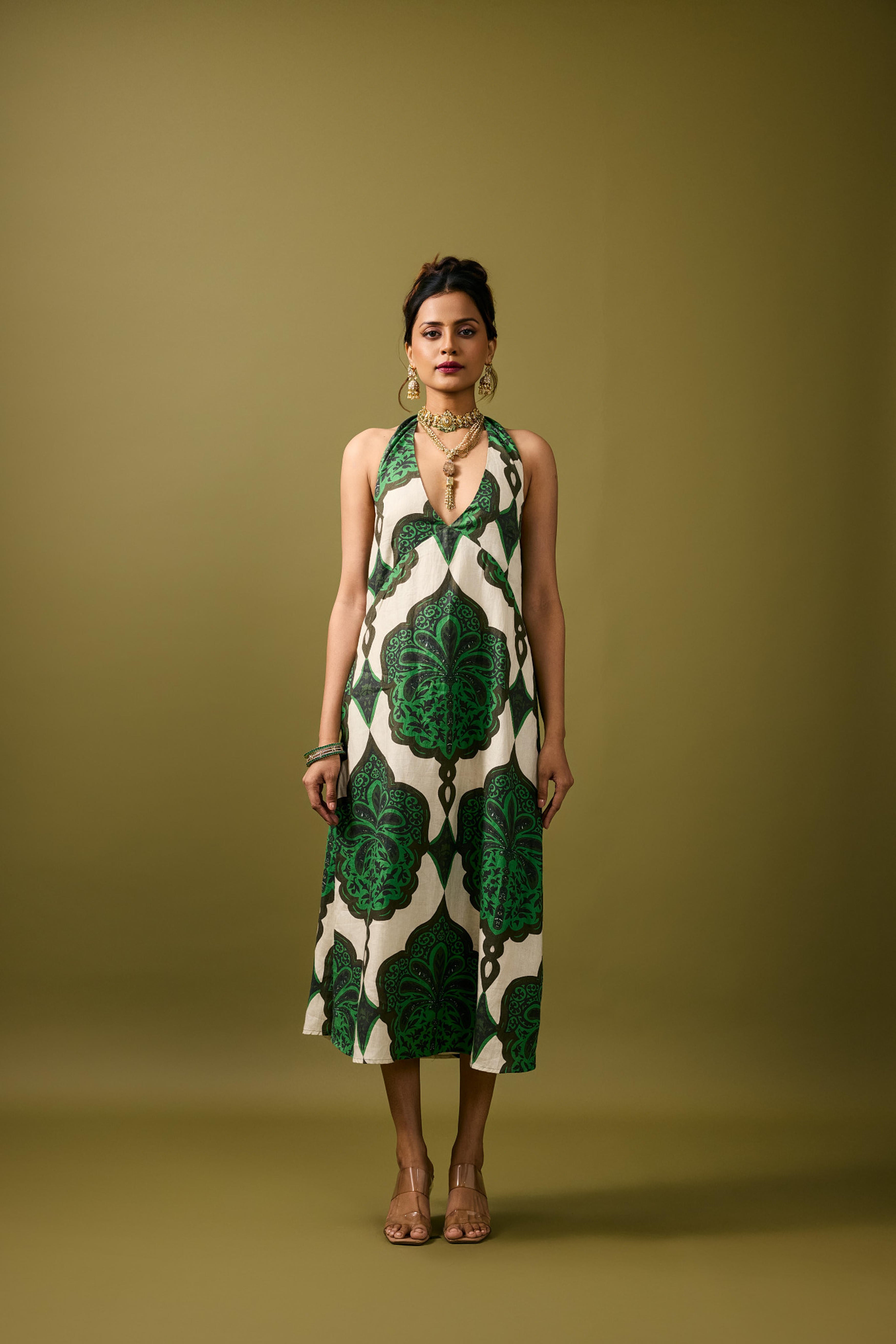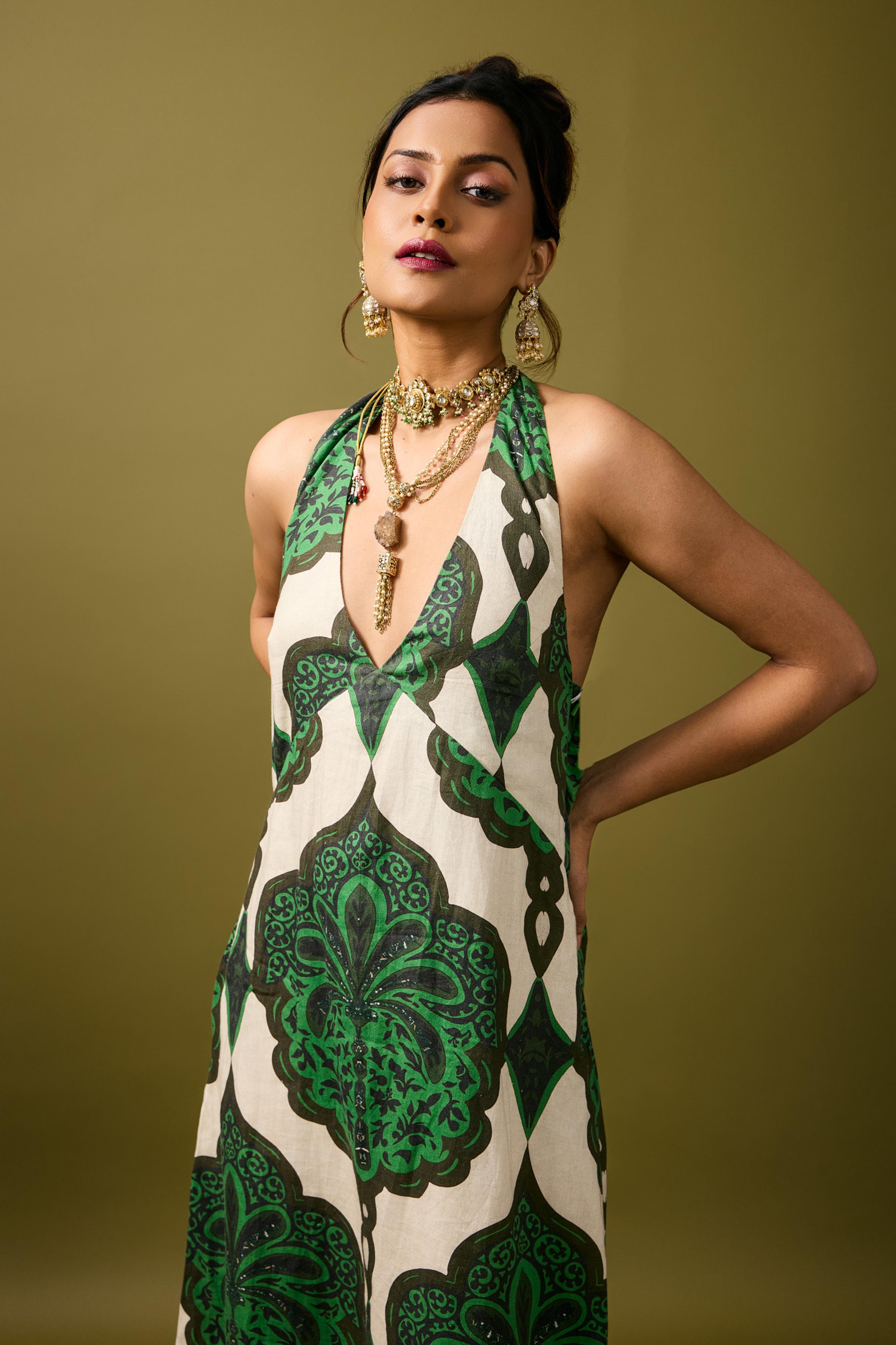 The Divya Dress in Inferno is a free-spirited yet sophisticated halter midi crafted in 100% linen. Its fluid silhouette and bias-cut paneling in fiery Inferno hues of deep red, burnt orange, and black create a natural flow with every step. The halter neckline adds a sensuous charm, while the smocked back ensures comfort and flexibility. Lightweight and breathable, it’s perfect for festive gatherings, sundown evenings, or seaside getaways. Pair it with chunky bangles and statement necklaces for a bold festive mood, or keep it simple with delicate accents for quiet elegance.