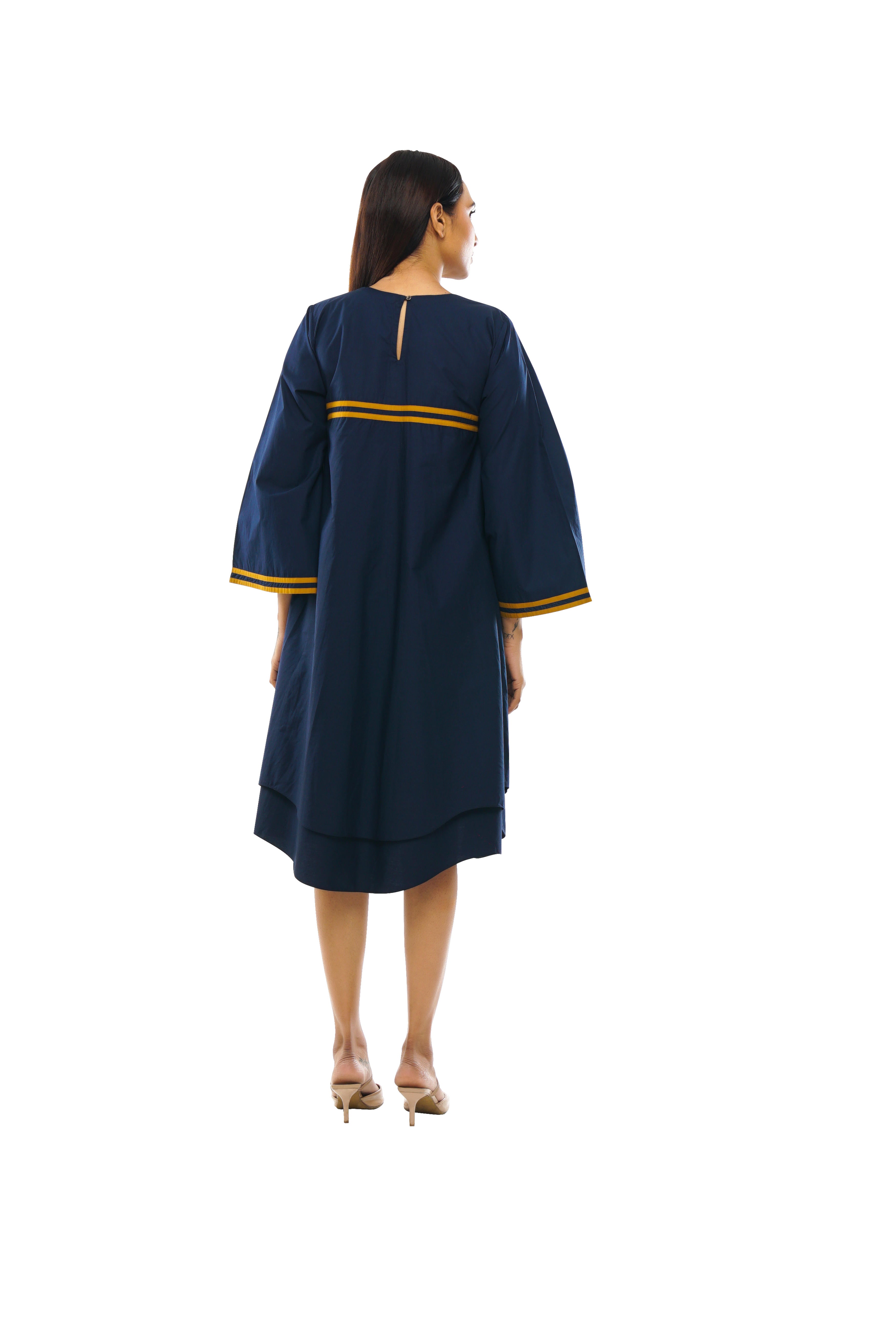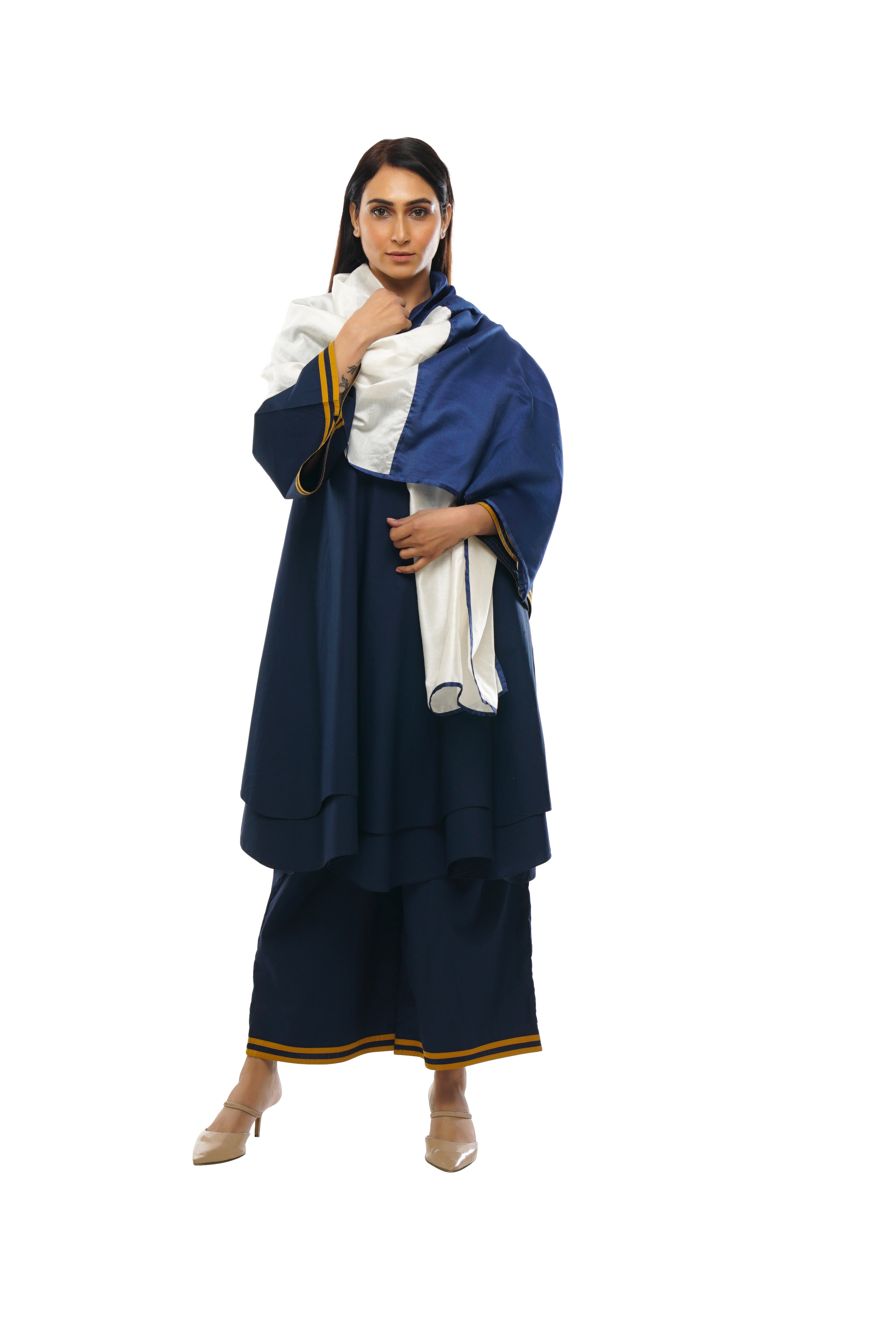 This breezy co-ord set features a unique double-layered flared dress in rich navy blue with mustard patti detailing on the chest and sleeves. A 5-inch keyhole back adds subtle drama, while the relaxed silhouette offers all-day comfort. Paired with cropped pants, it's a perfect blend of structure and flow.