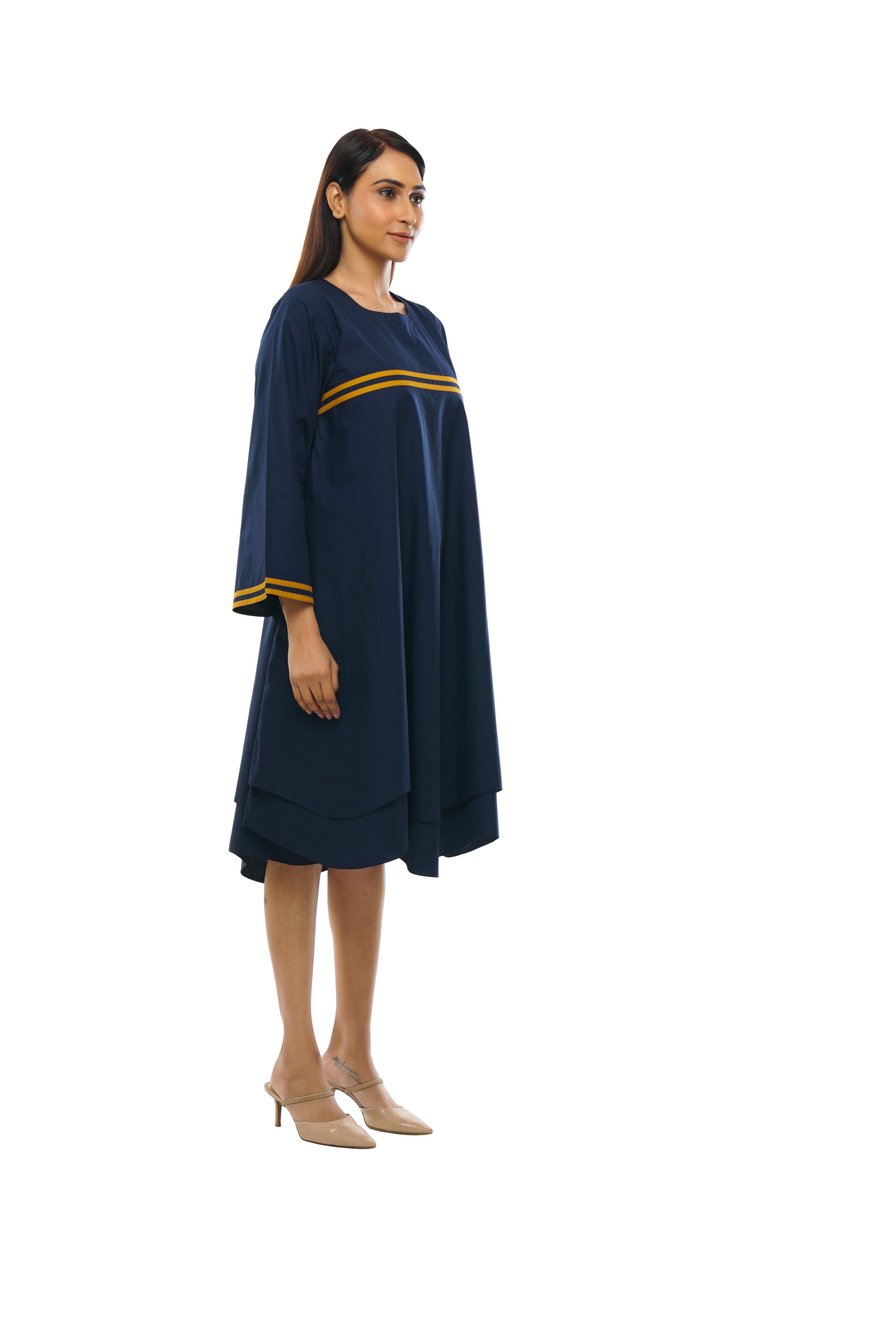 Elevate your everyday elegance with this navy blue co-ord set. The flared double-layered dress is finished with mustard accents and a keyhole back, offering a refined yet playful vibe. The addition of a soft white dupatta completes the look, making it ideal for casual brunches or semi-formal get-togethers.
