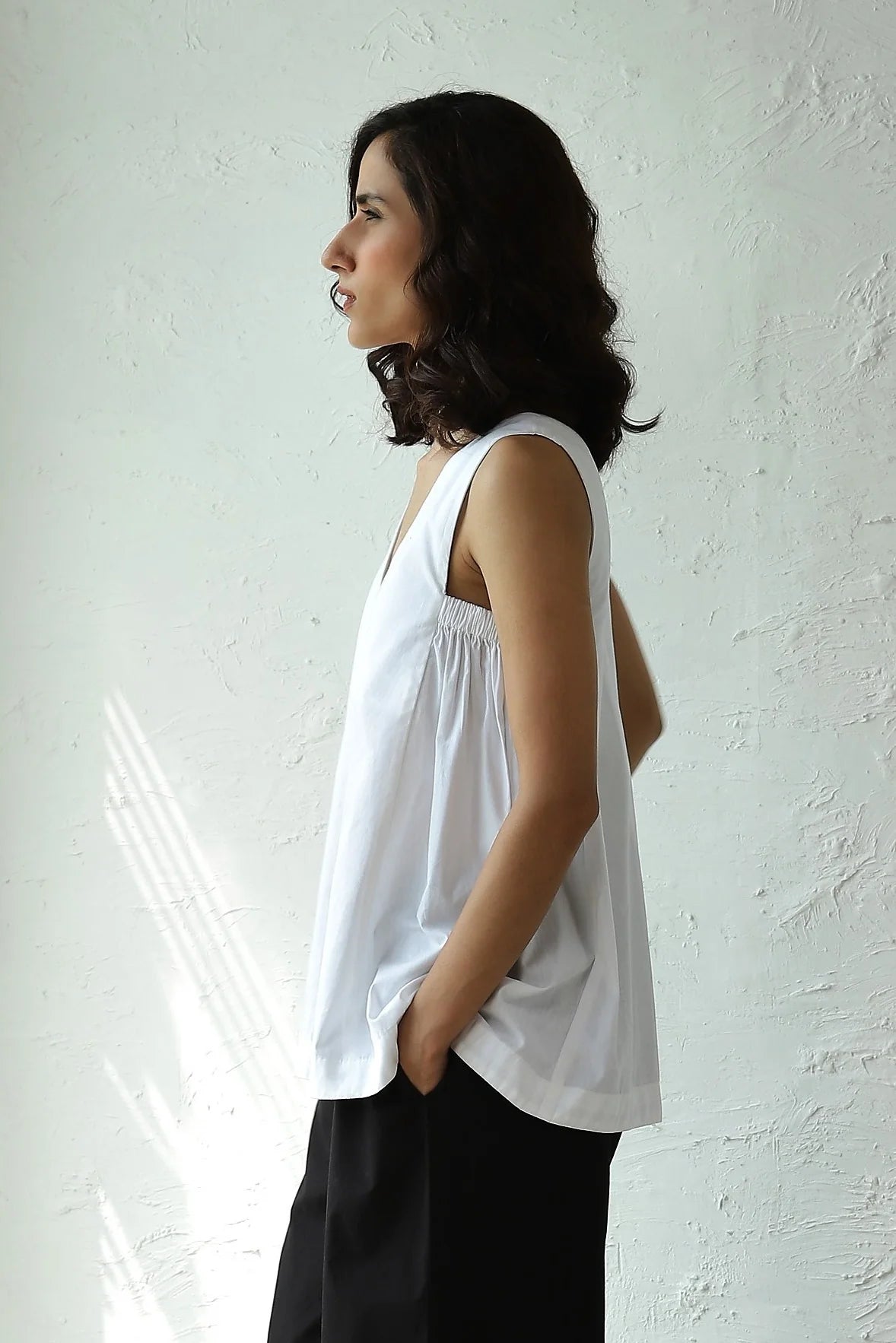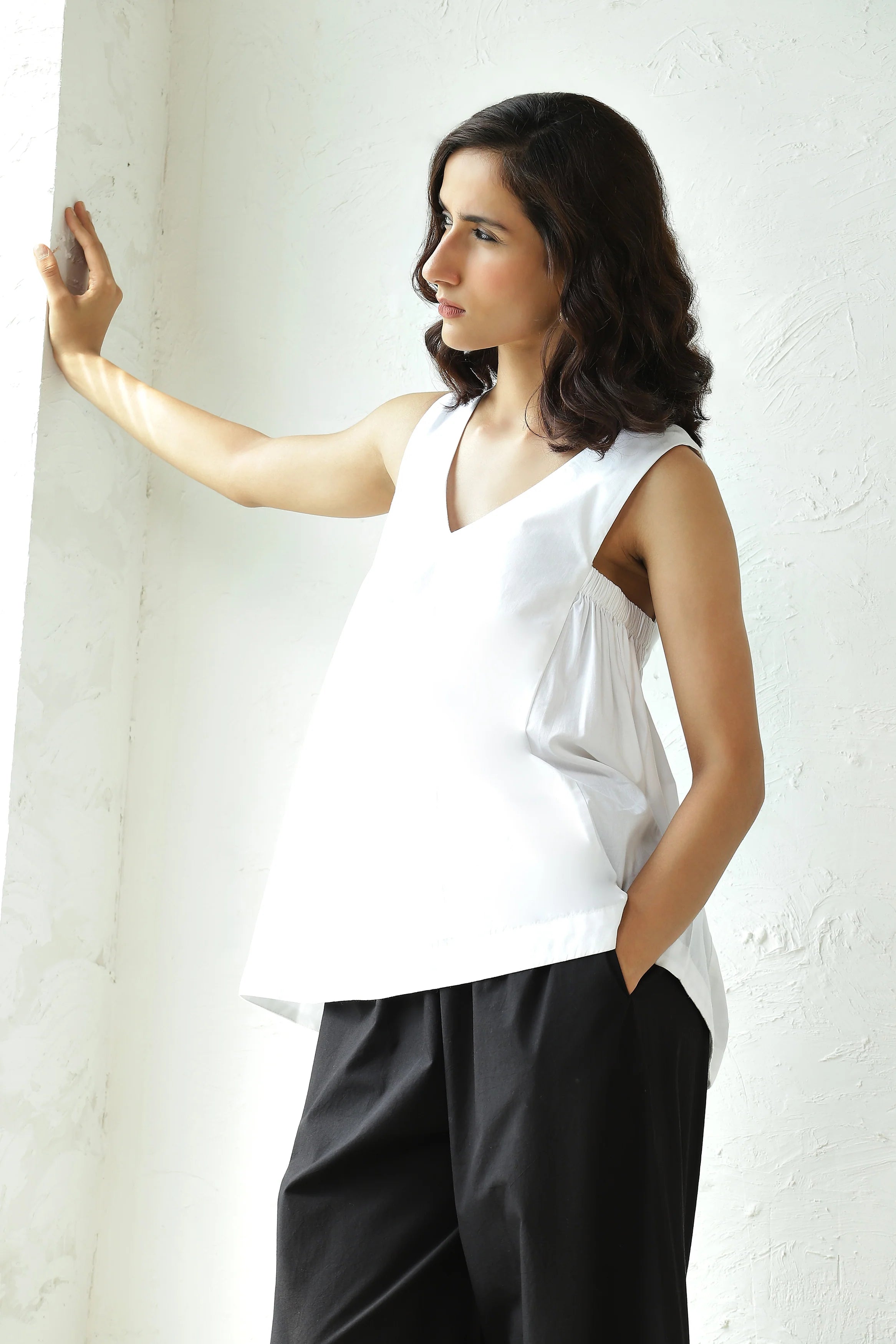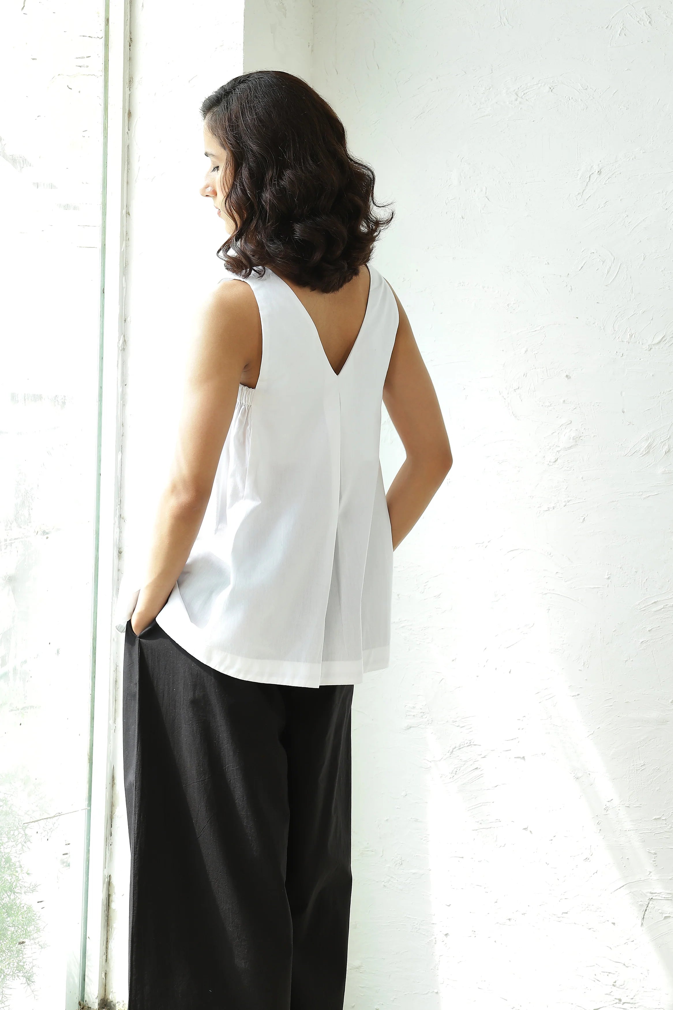 Day-to-Night Elegance' White Sleeveless Top – Your Versatile Wardrobe Essential. Made from crisp cotton poplin, its breezy A-line silhouette features a flattering V-neckline, front inward pleat, and elasticated side panels for subtle gathering. From day to night, effortlessly transition by pairing it with the coordinating trousers for a polished ensemble.