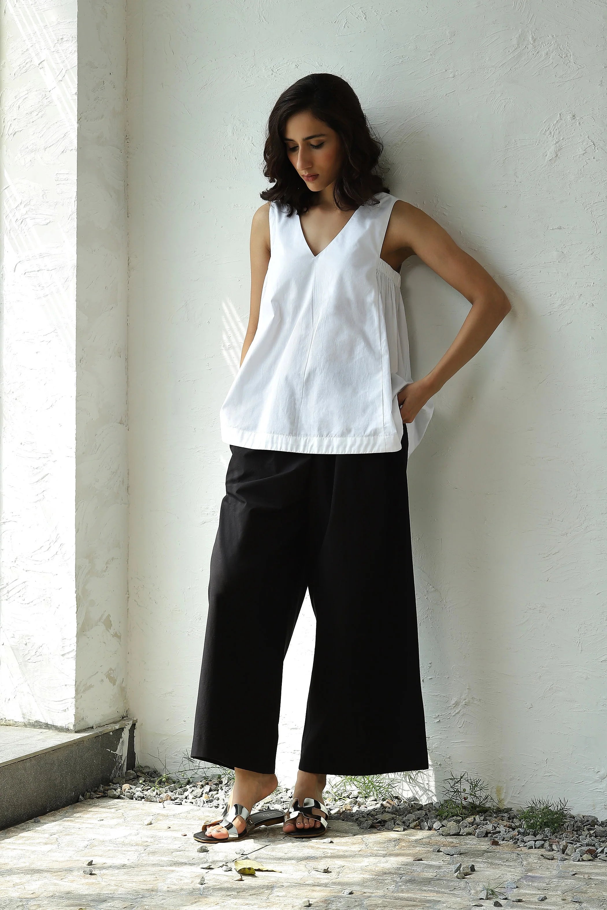 Day-to-Night Elegance' White Sleeveless Top – Your Versatile Wardrobe Essential. Made from crisp cotton poplin, its breezy A-line silhouette features a flattering V-neckline, front inward pleat, and elasticated side panels for subtle gathering. From day to night, effortlessly transition by pairing it with the coordinating trousers for a polished ensemble.