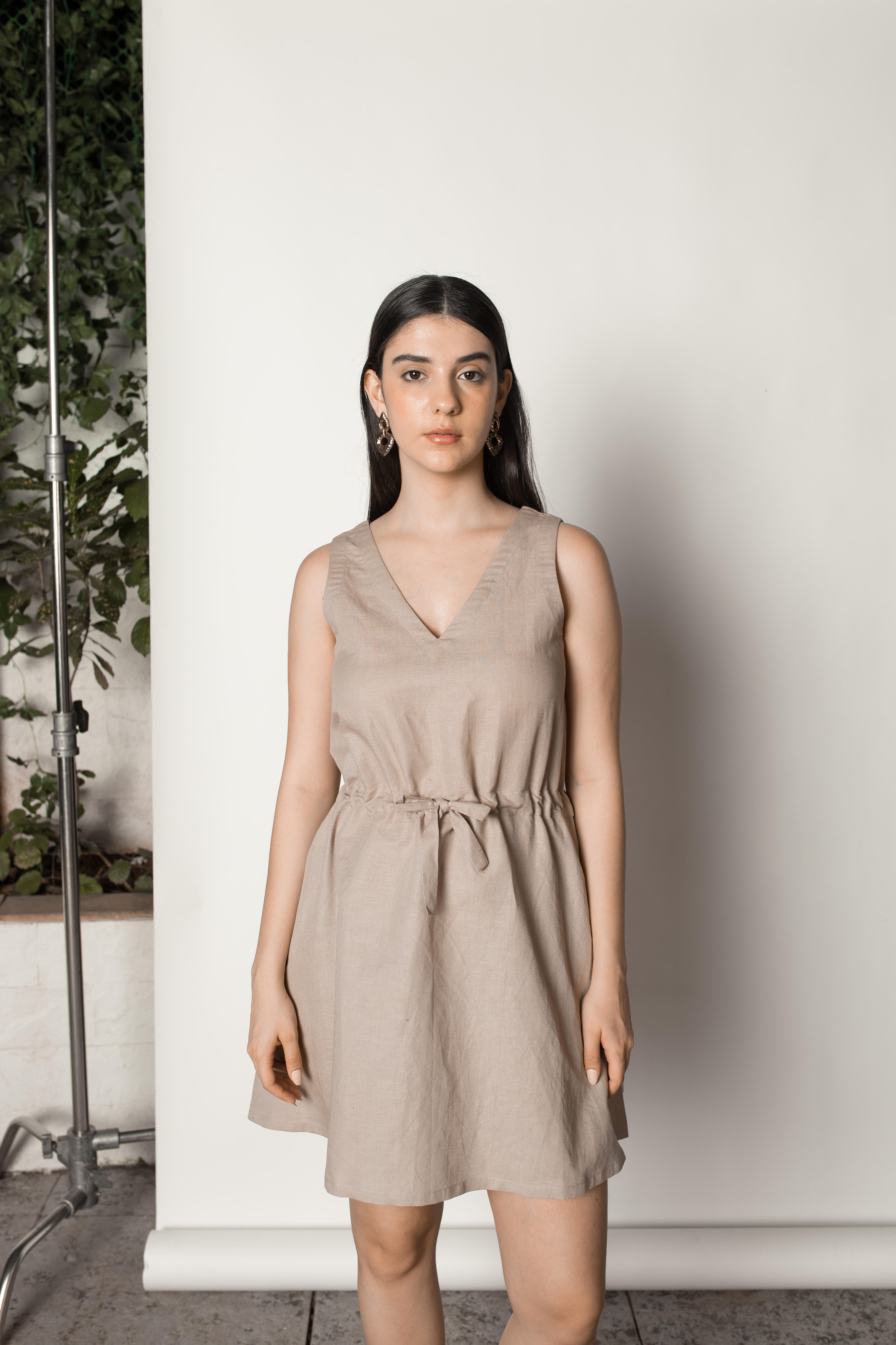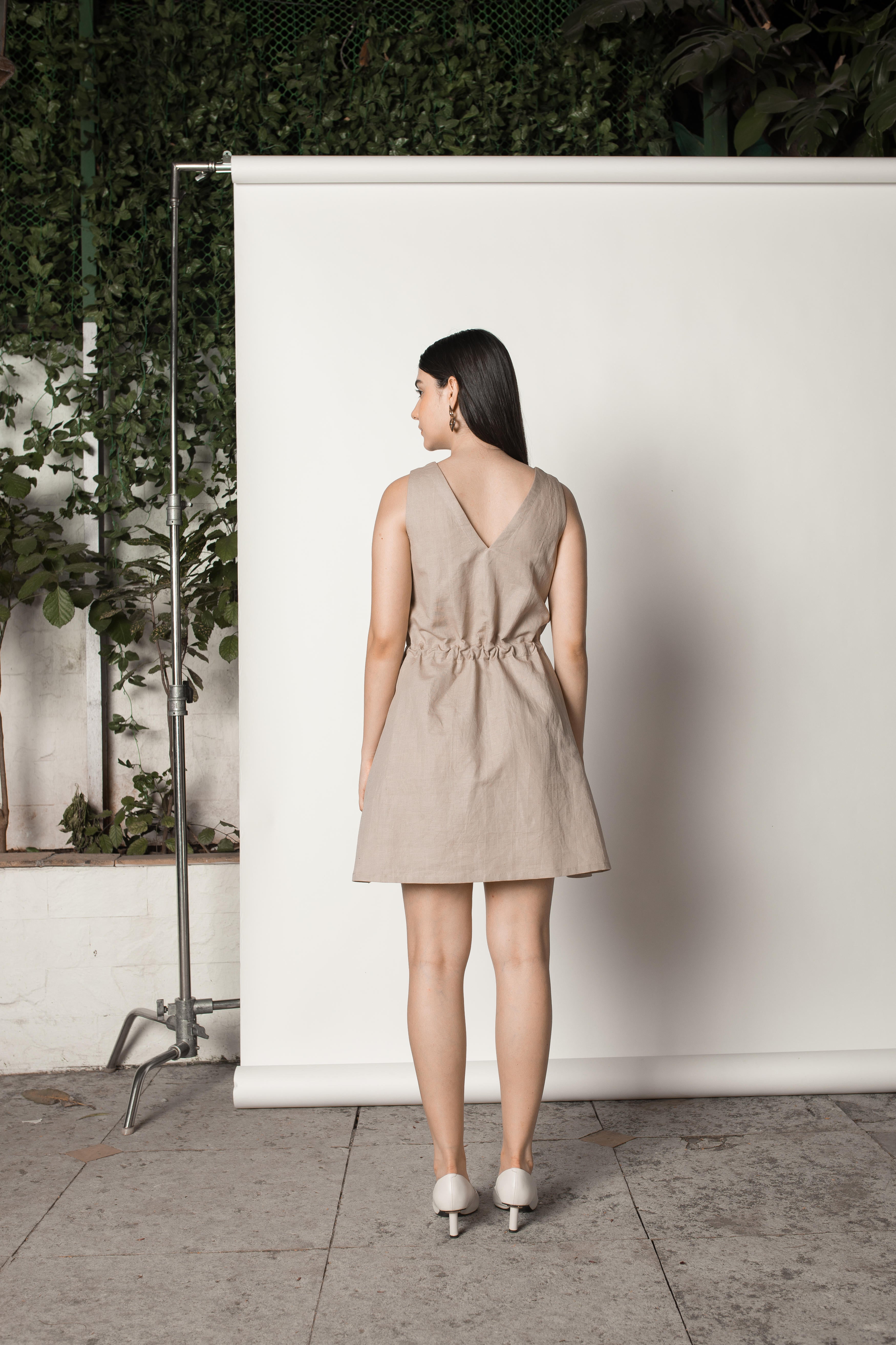 This mini hemline is a key cut for your playful mood. This dress is enhanced by the drawstring detail at the bodice which flares our to an A-line skirt. Design details include the front and back V-neck, side seam pockets and sleeveless silhouette that allows for layering.