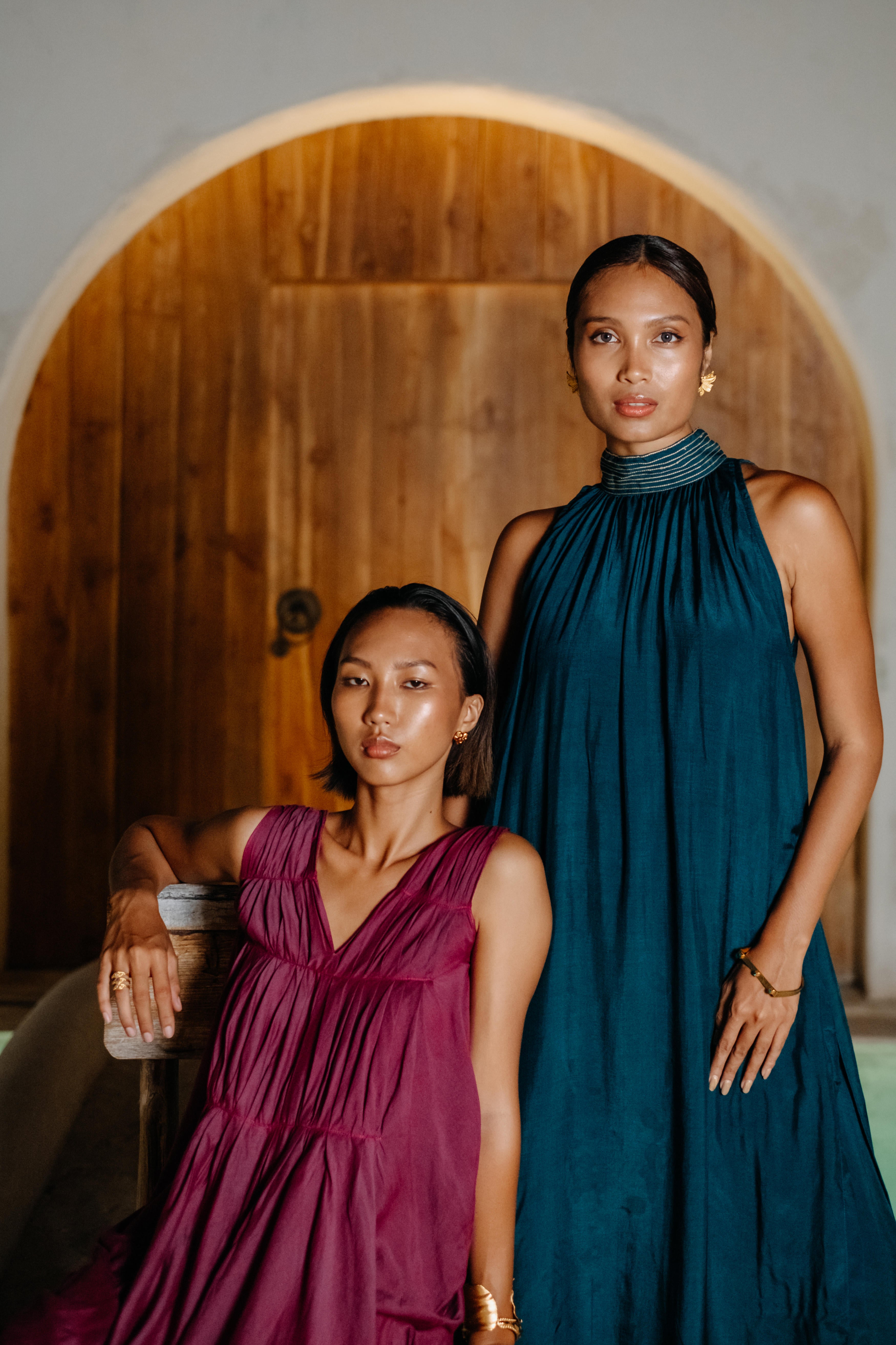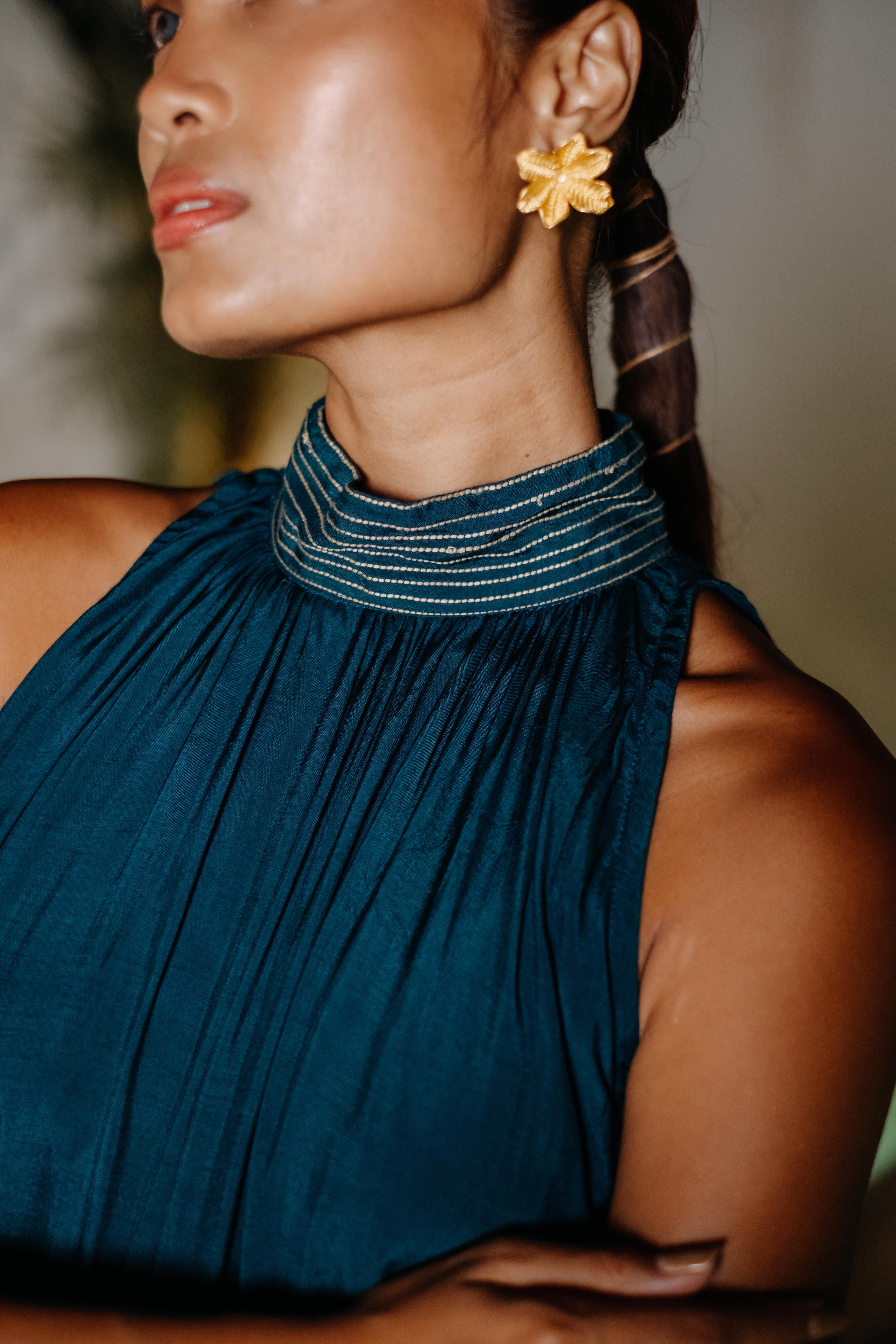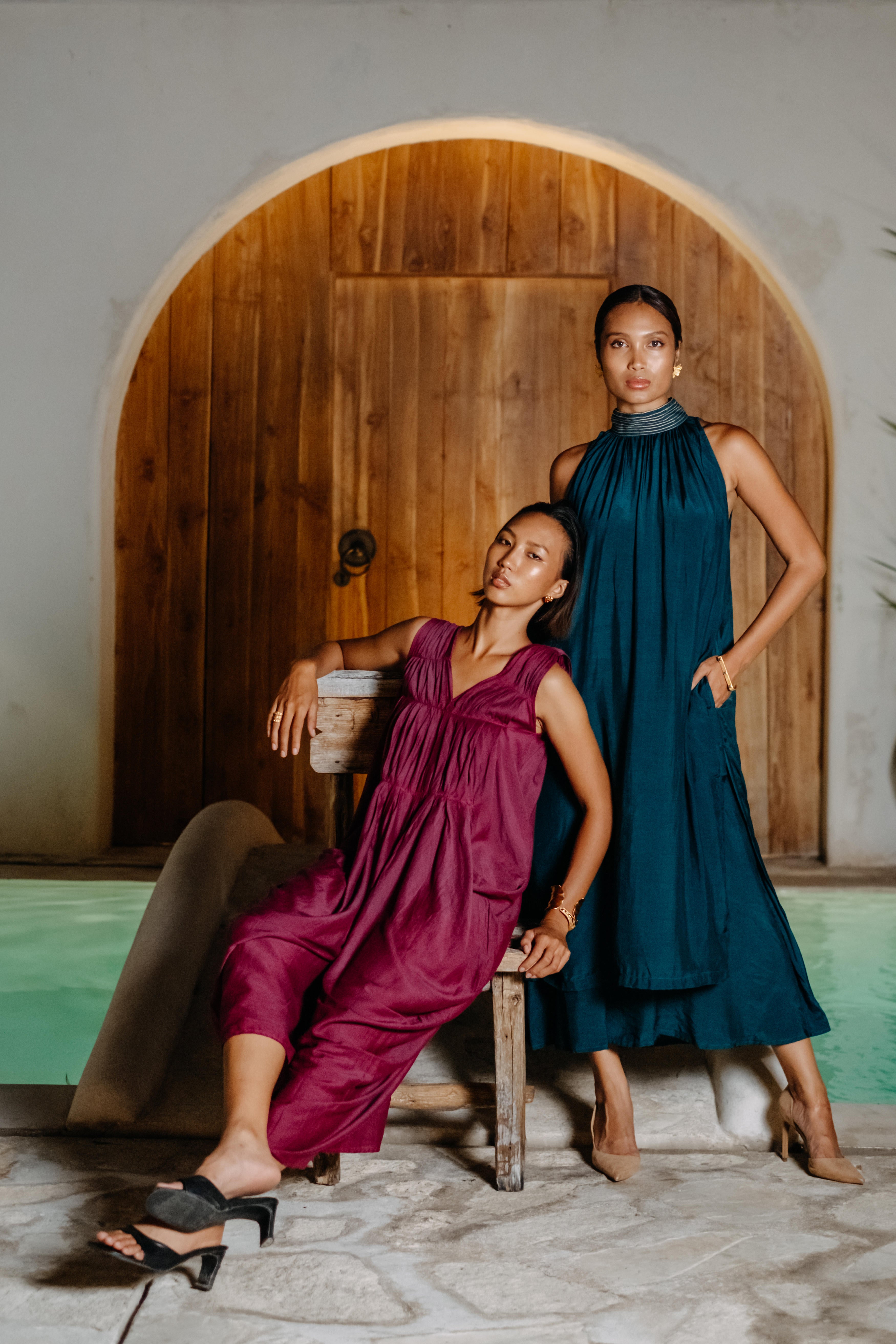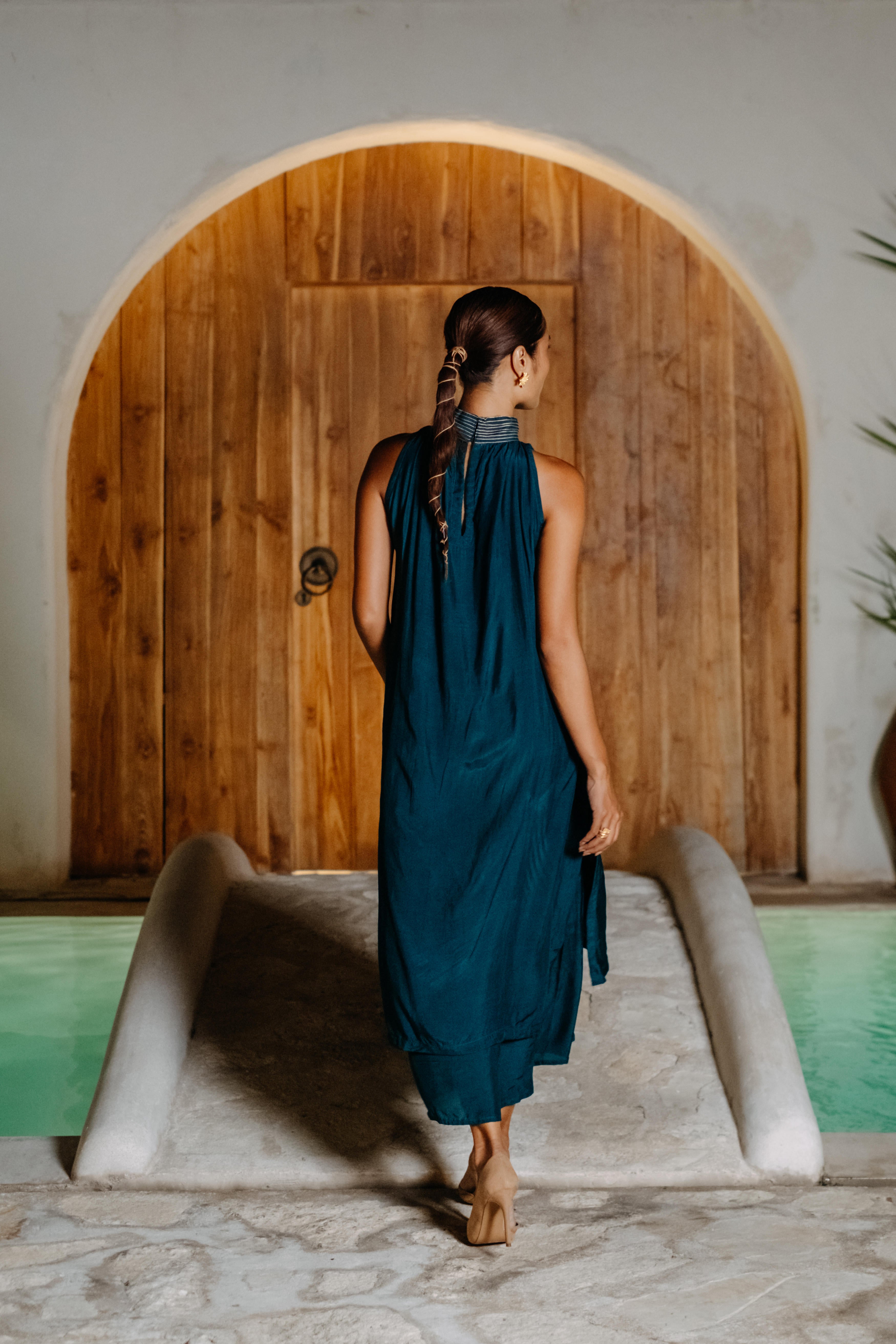 A Layered Midi Dress featuring a halter style neck with keyhole at the back and side inseam pockets. The neck of the dress is highlighted with the contrast stitch detailing. Float through the season in our drift away dress. This product will be exclusively handcrafted for you, making the pattern/texture/color slightly vary from the image shown, due to multiple artisan led techniques and processes involved. Color may also slightly vary due to photographic lighting sources. Length : 51"