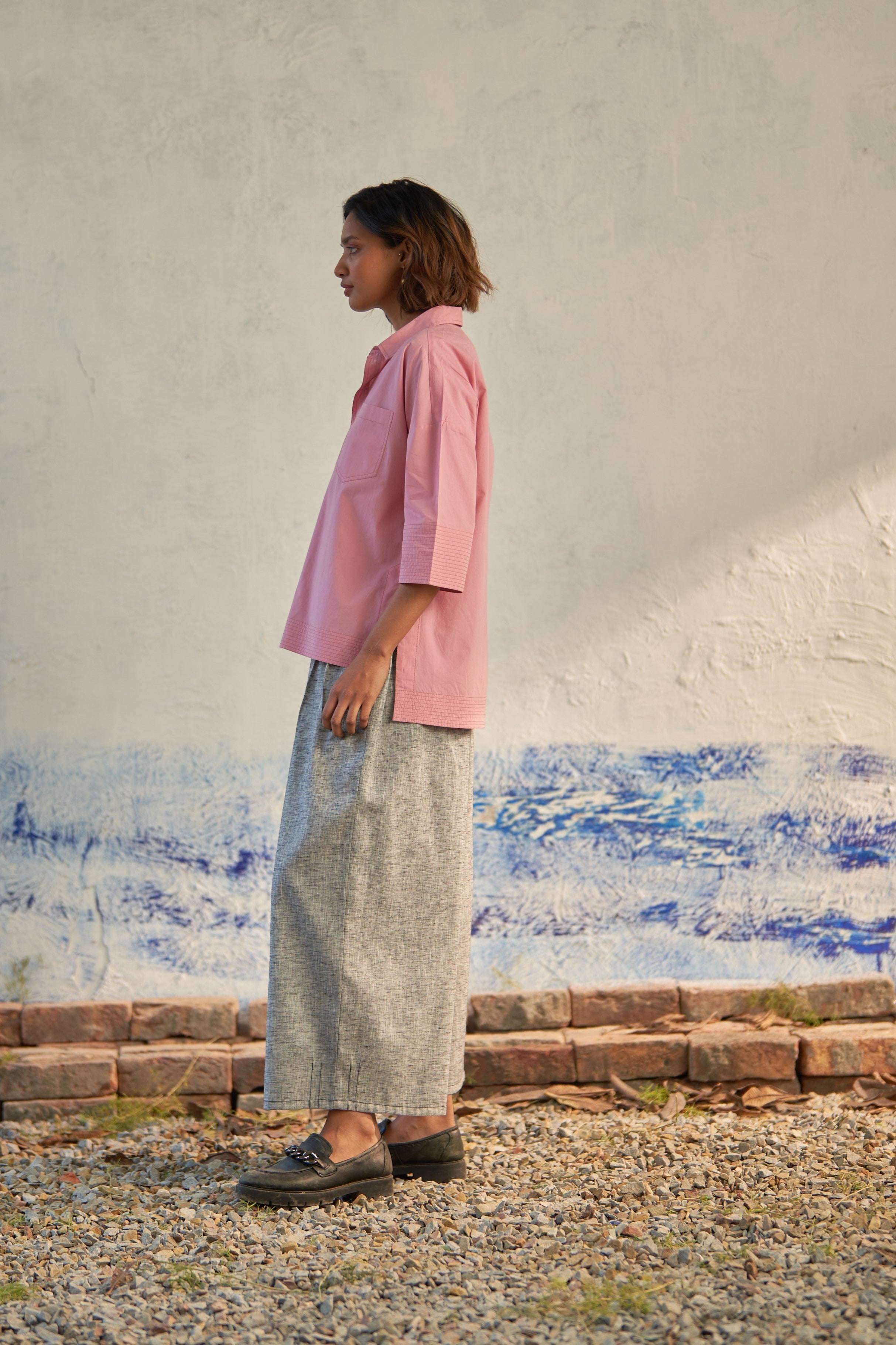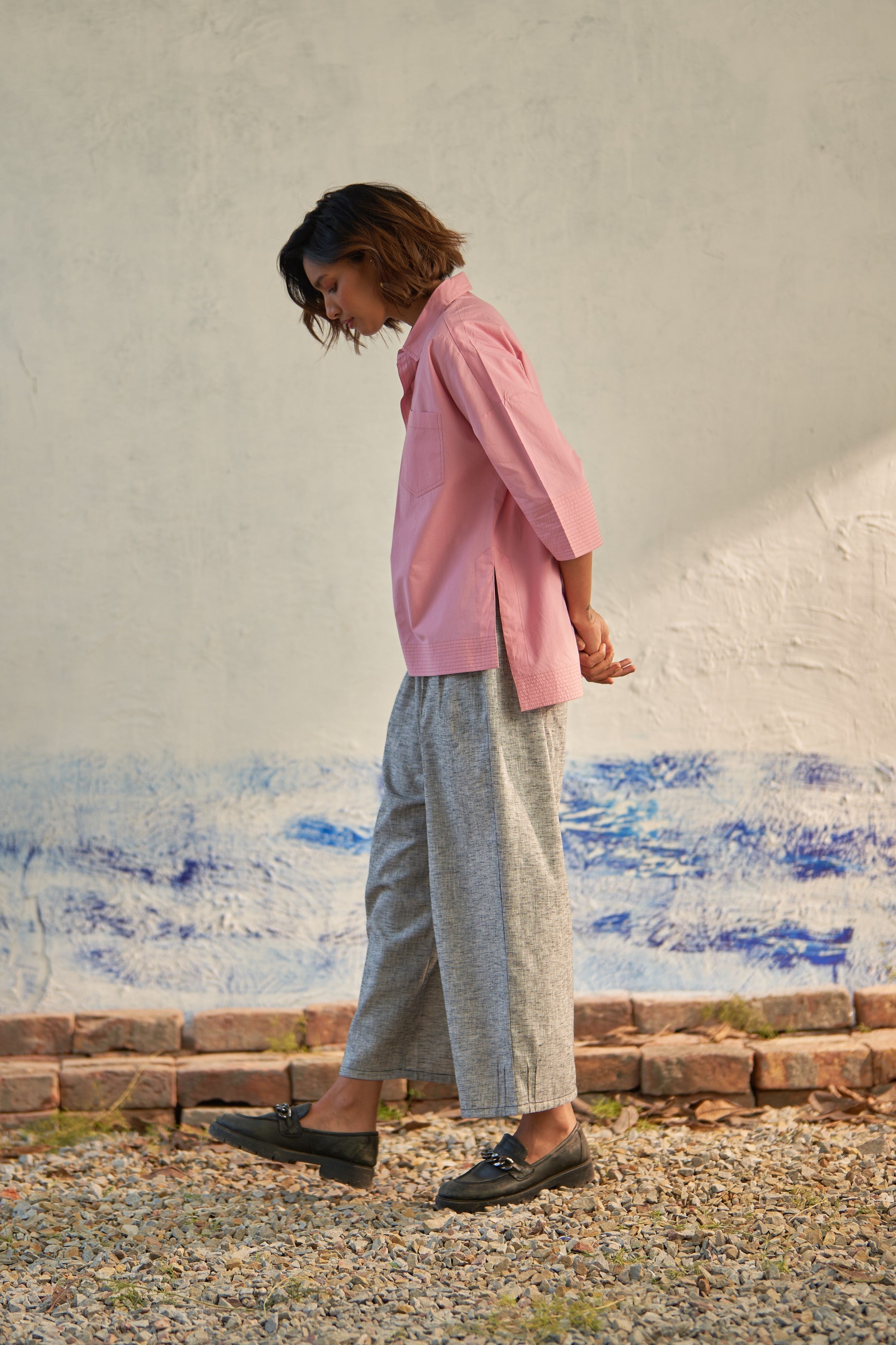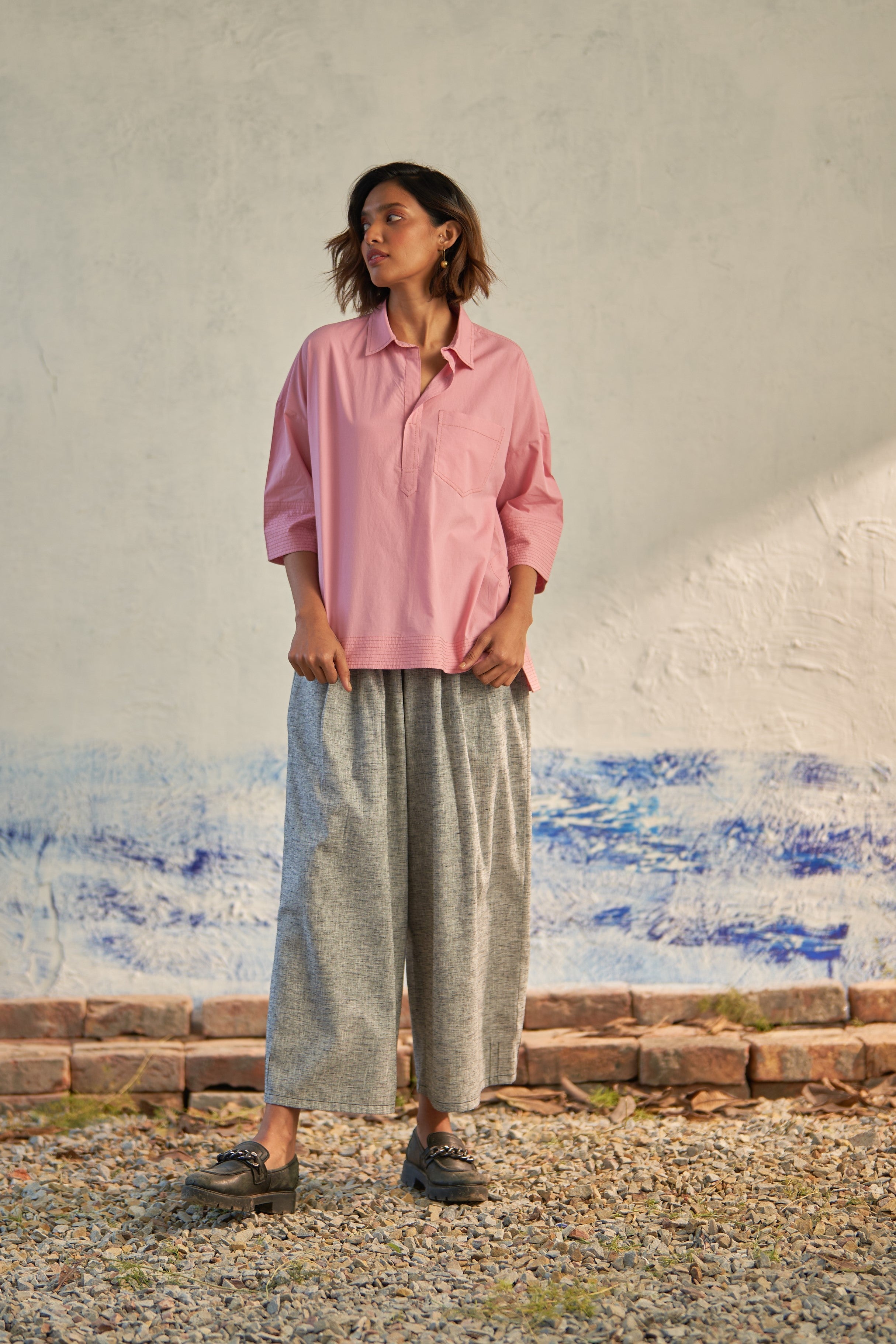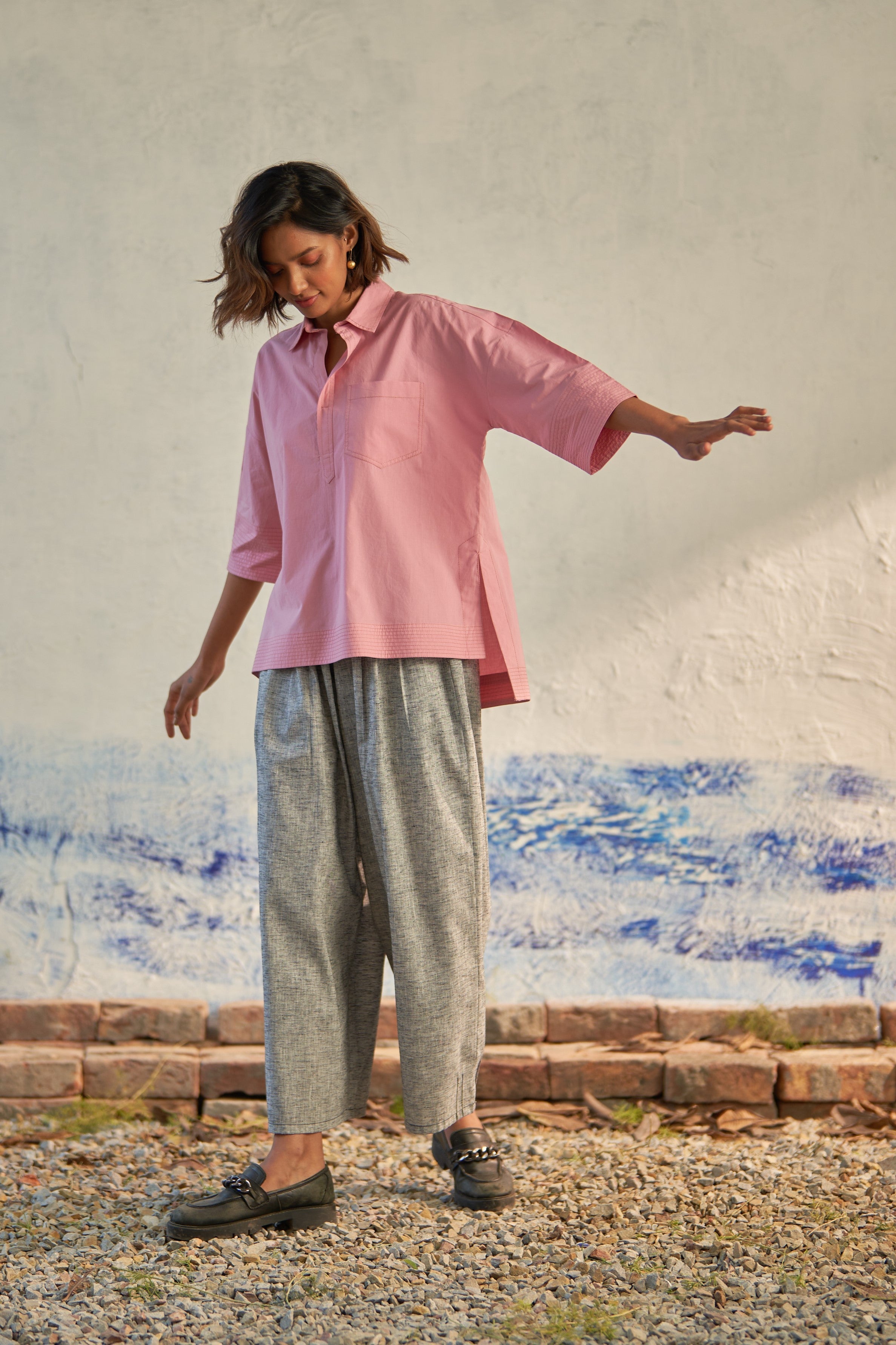Gear up for your adventures with this travel duo, perfect for long drives or quick rides. The top features a stylish collared neckline with a deep V-neck and a handy chest pocket adorned with intricate stitching details. Paired with our elasticated box pleat trousers, these bottoms offer both style and comfort with a half elasticated waist and button. The surface detailing includes inverted box pleats, adding an extra dimension to your ensemble. Ready for any journey, whether near or far.