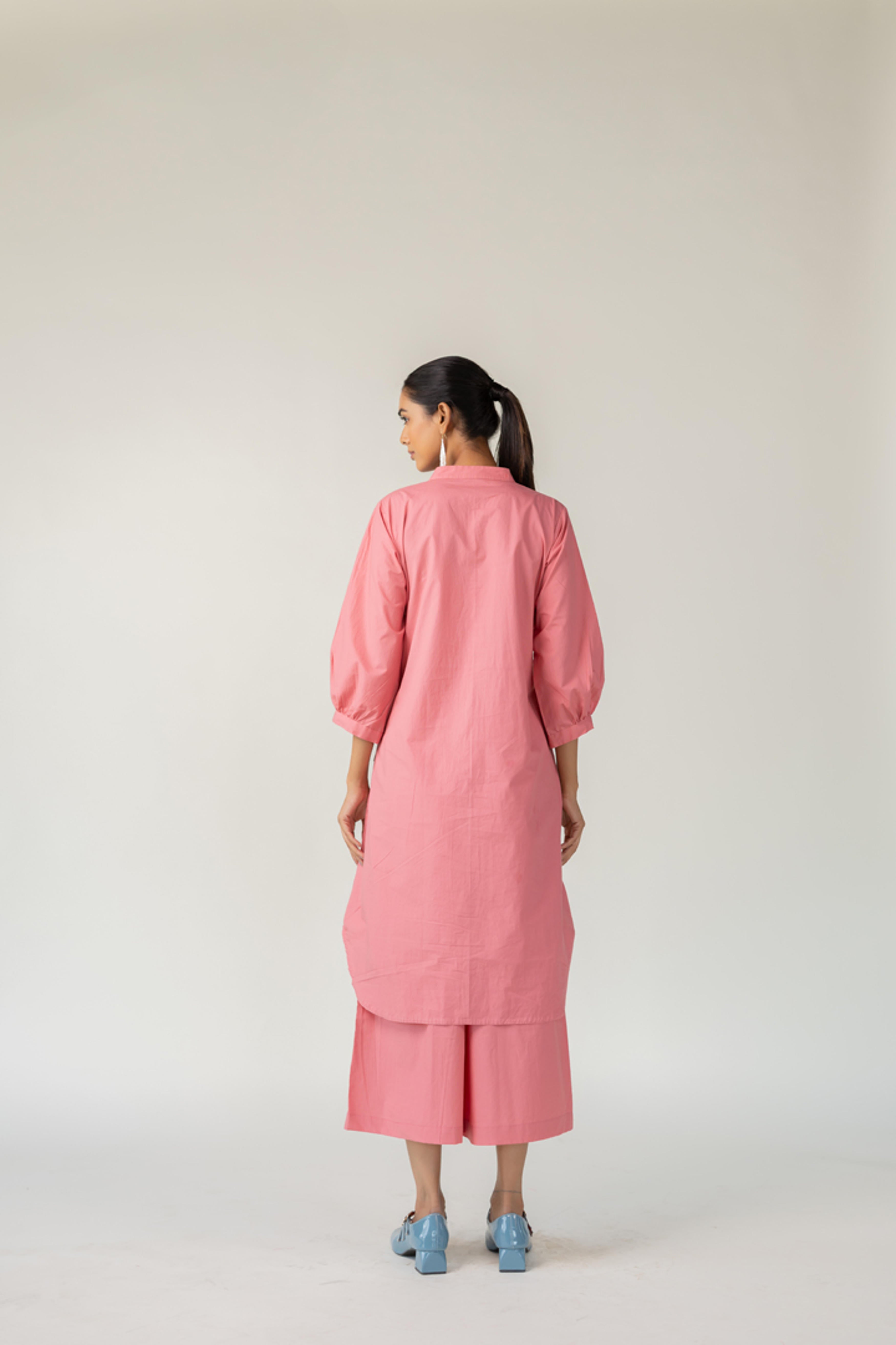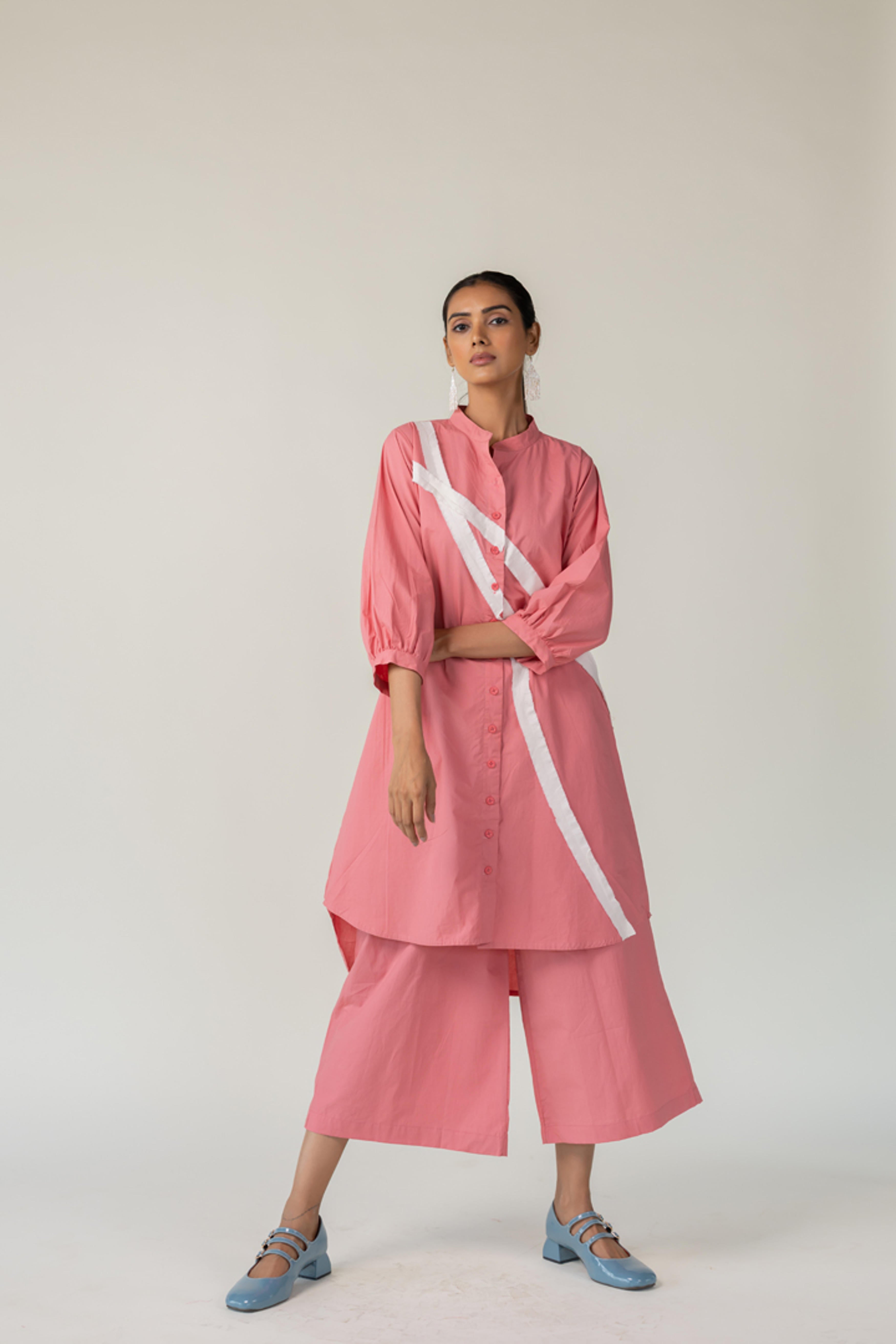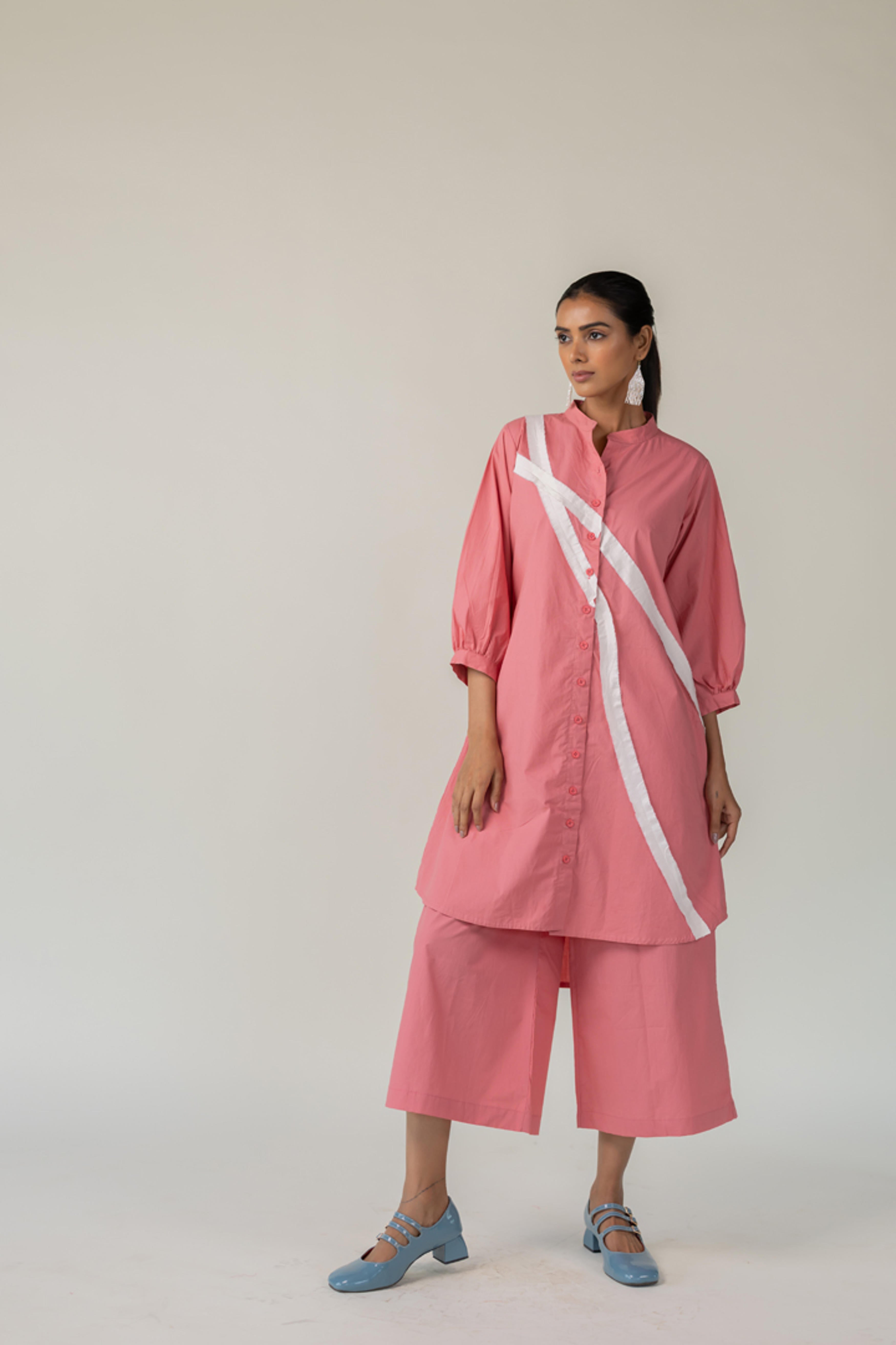 Effortlessly blending structure with playfulness, the Dusky Bloom Buttondown Tunic is crafted in breathable cotton and designed for bold, contemporary dressing. The button-down tunic features a standout diagonal white stripe detail that adds modern geometry to the soft rose base. This Tunic offers both comfort and visual interest ? perfect for day-to-evening transitions. Length Tunic Front - 38" Tunic Back - 42"
