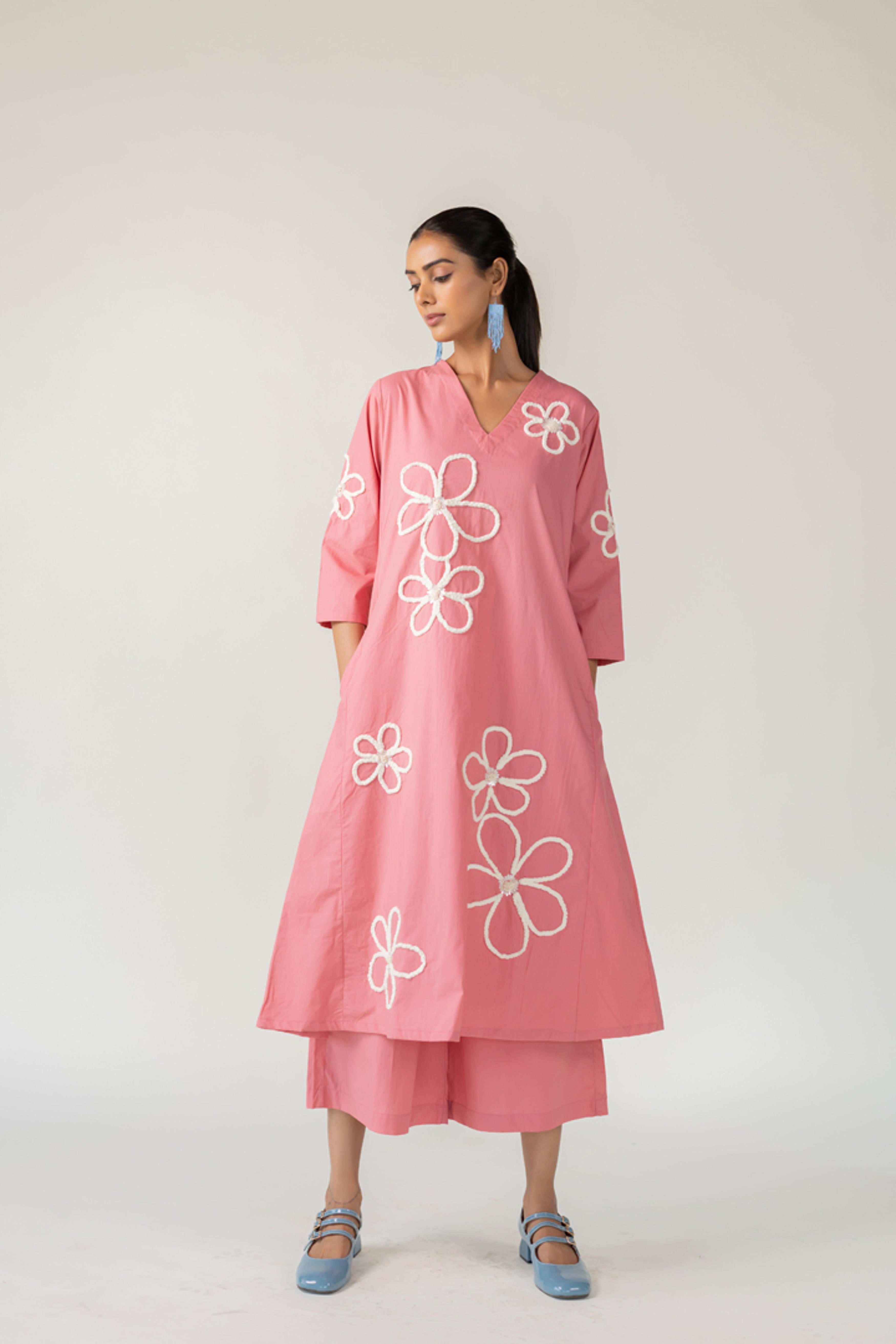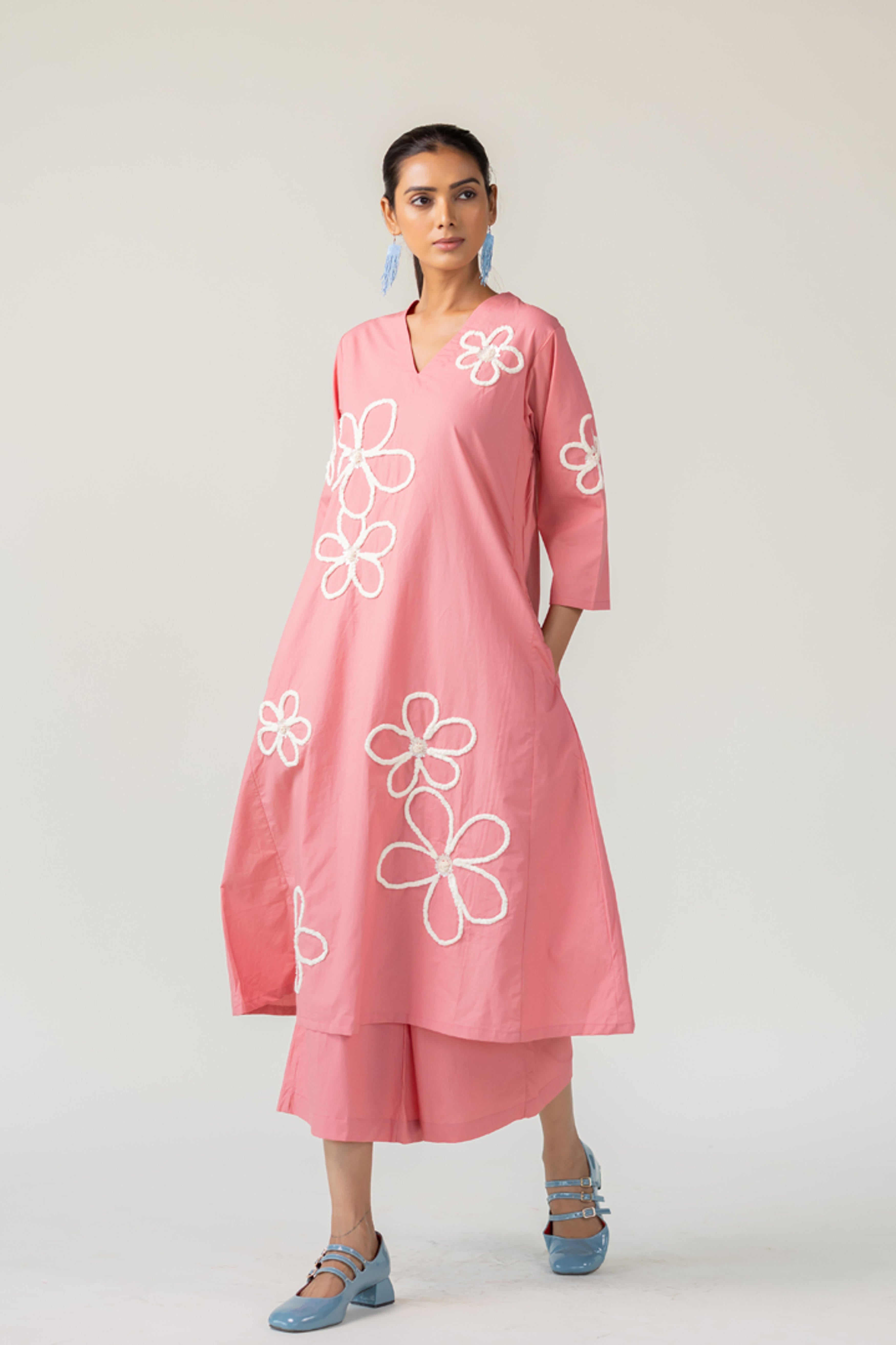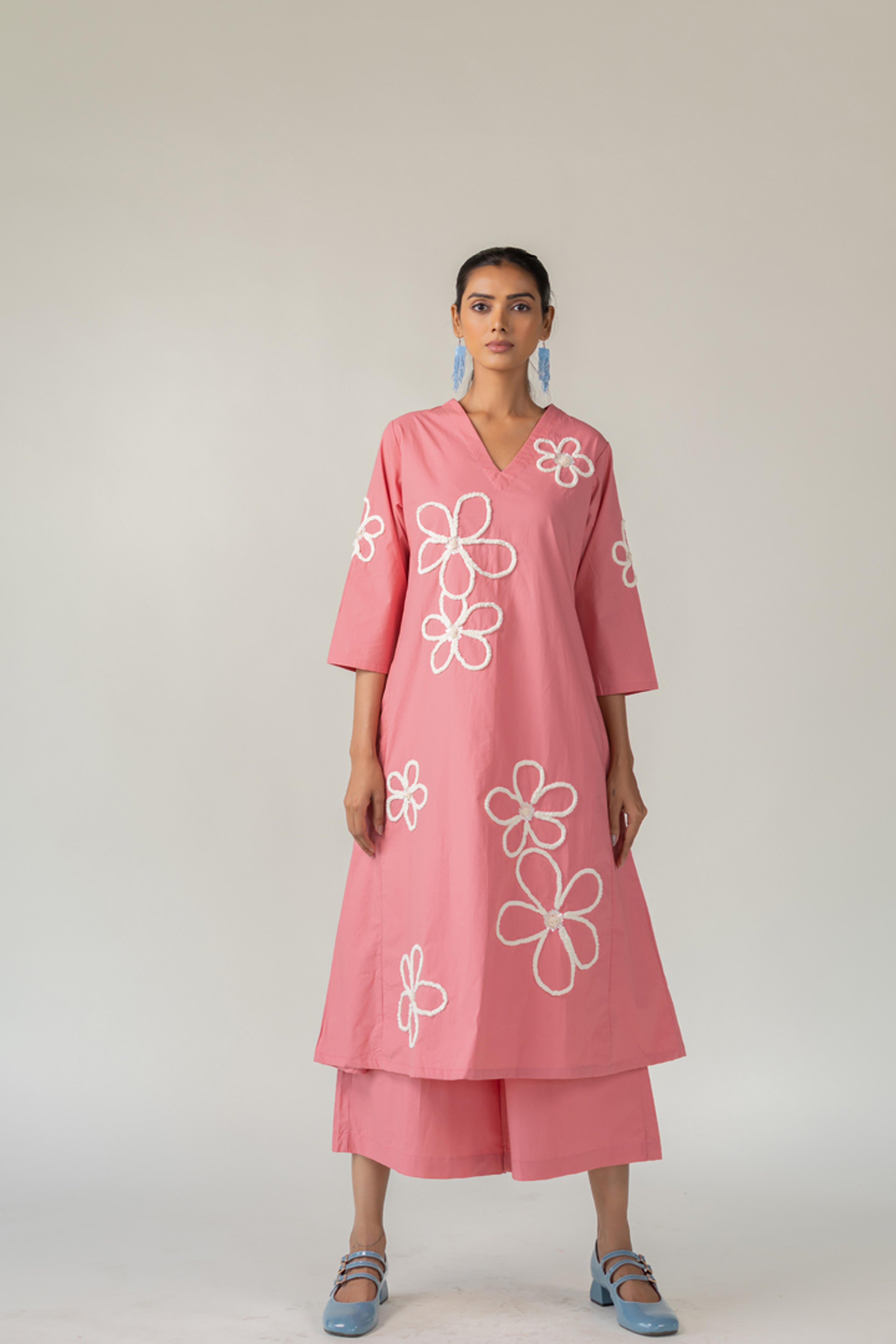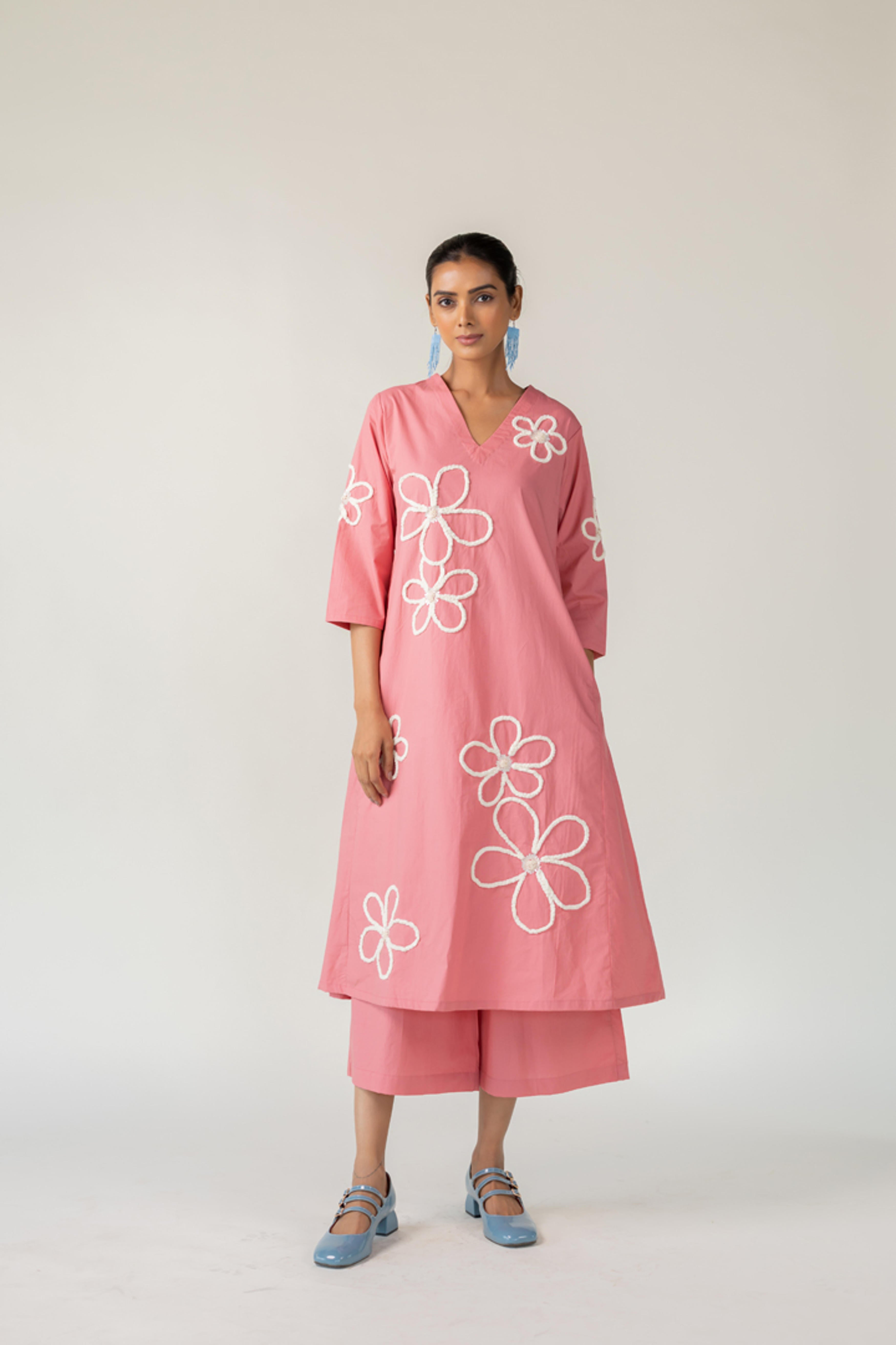 Bring a sense of whimsy and charm to your wardrobe with our Dusky Bloom Kurta Co-Ord. Crafted from breathable cotton poplin in a delightful blush pink tone, this relaxed-fit co-ord is adorned with oversized white embroidered daisies ? giving it a playful, retro-inspired feel. The tunic features a deep V neckline and pairs with roomy culottes for maximum comfort and movement. Length Kurta - 46" Pants - 36"