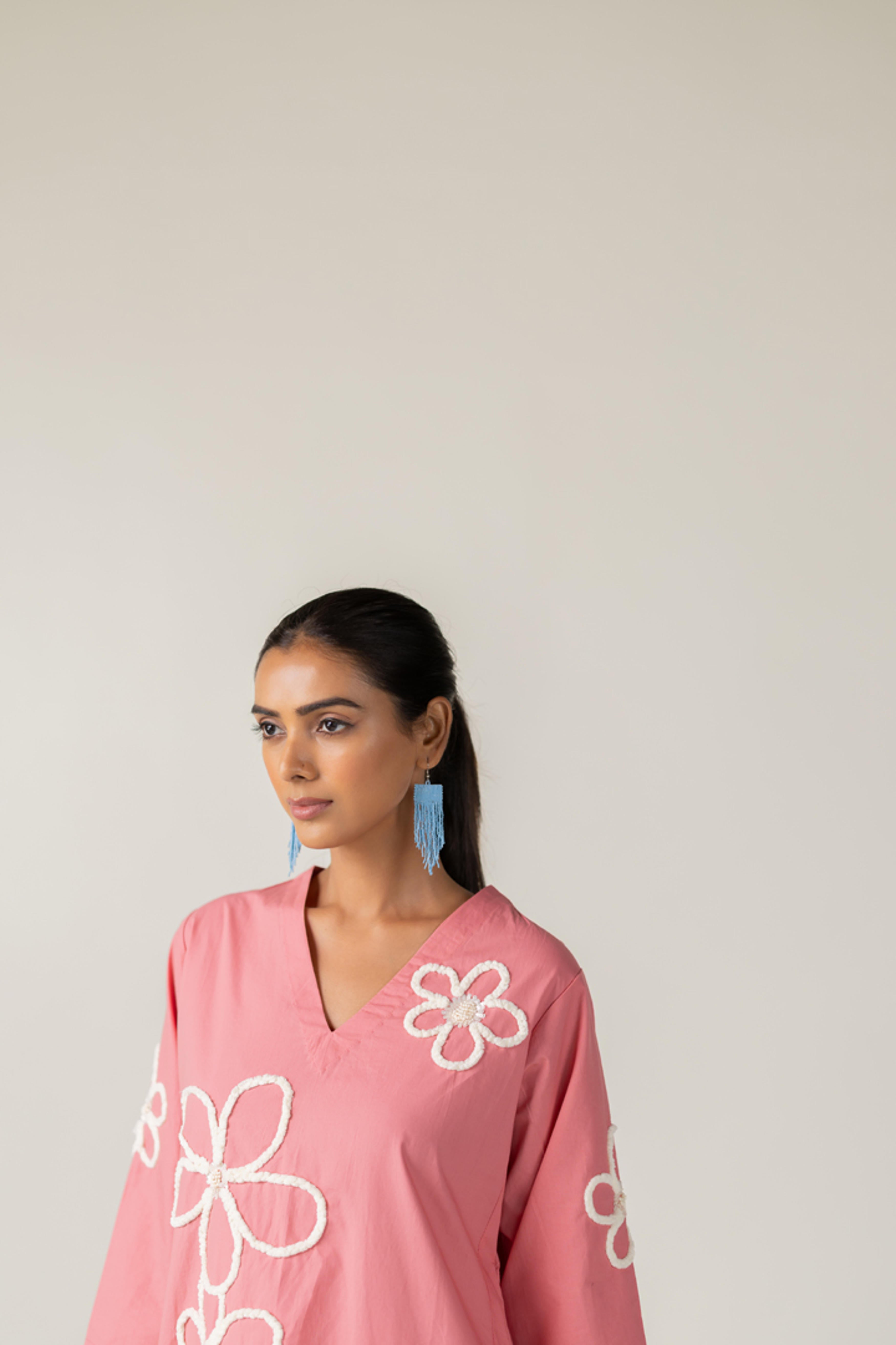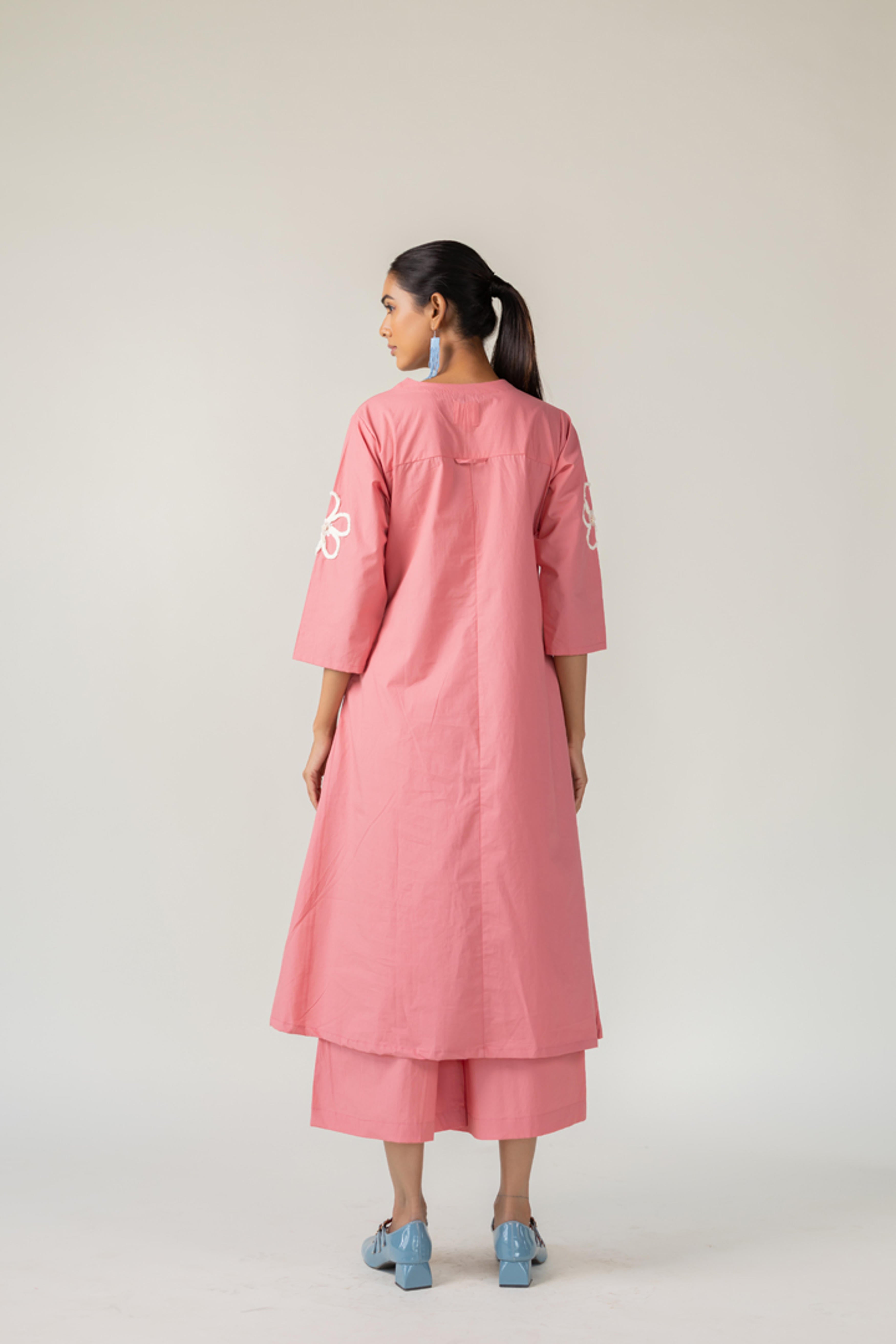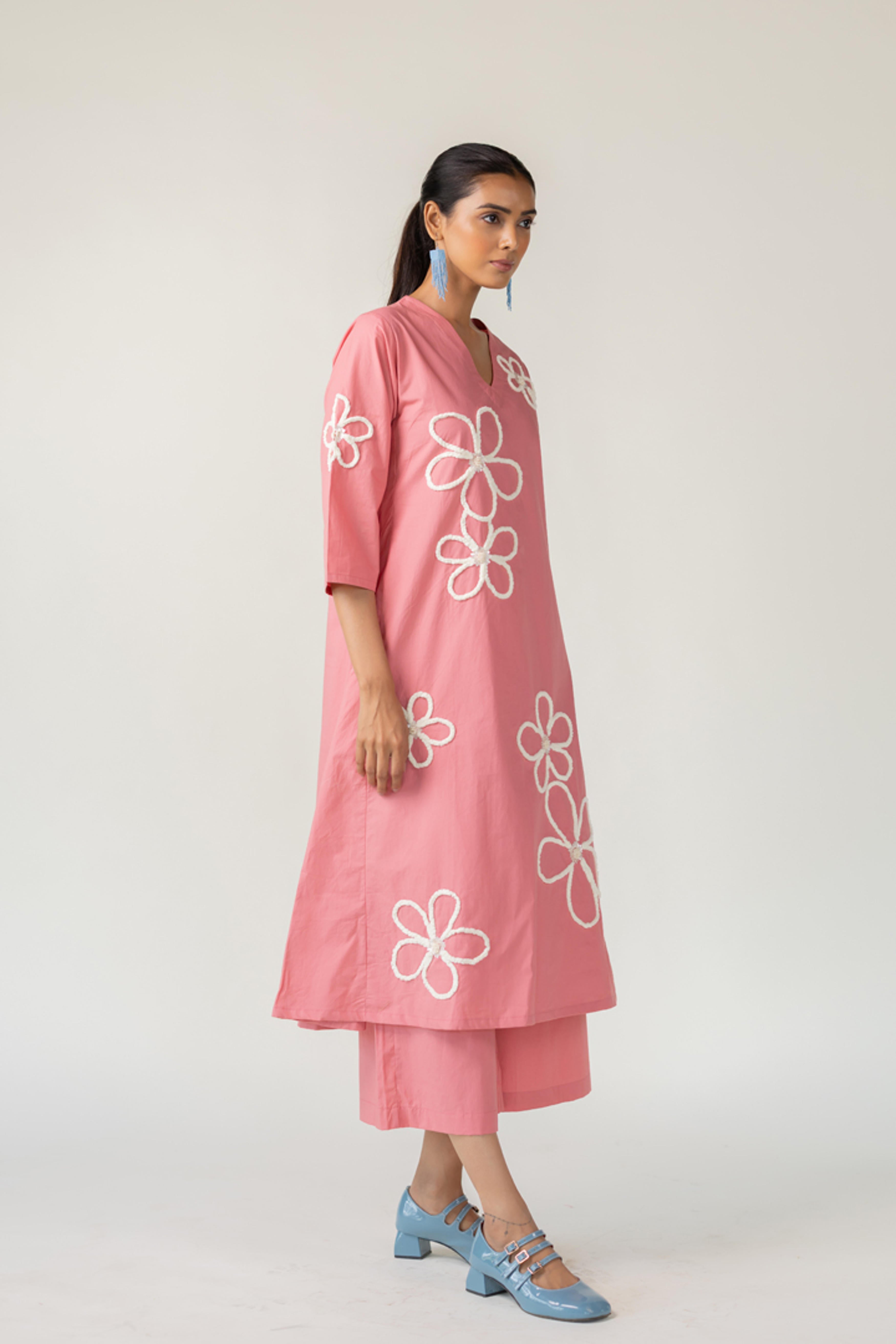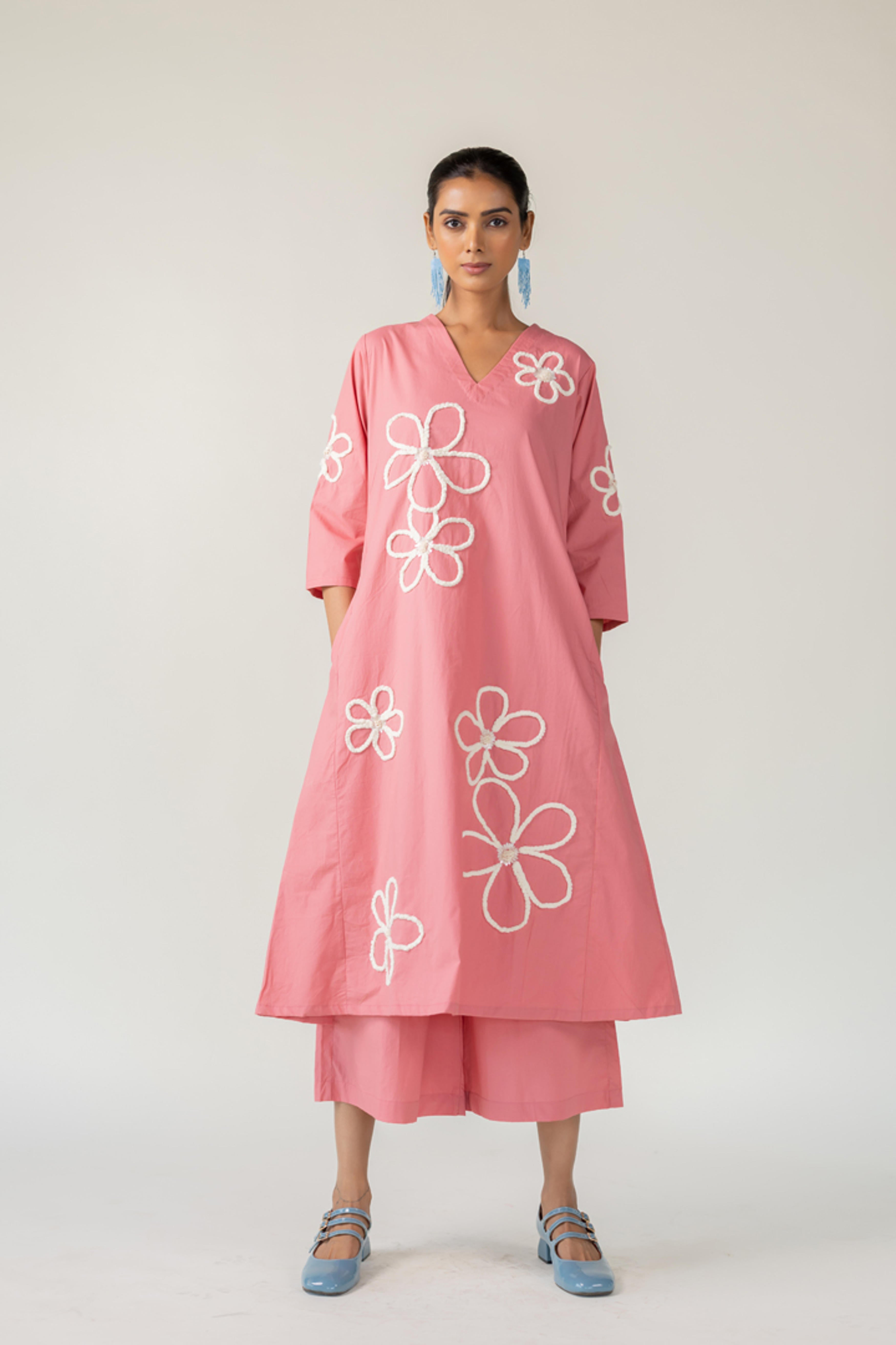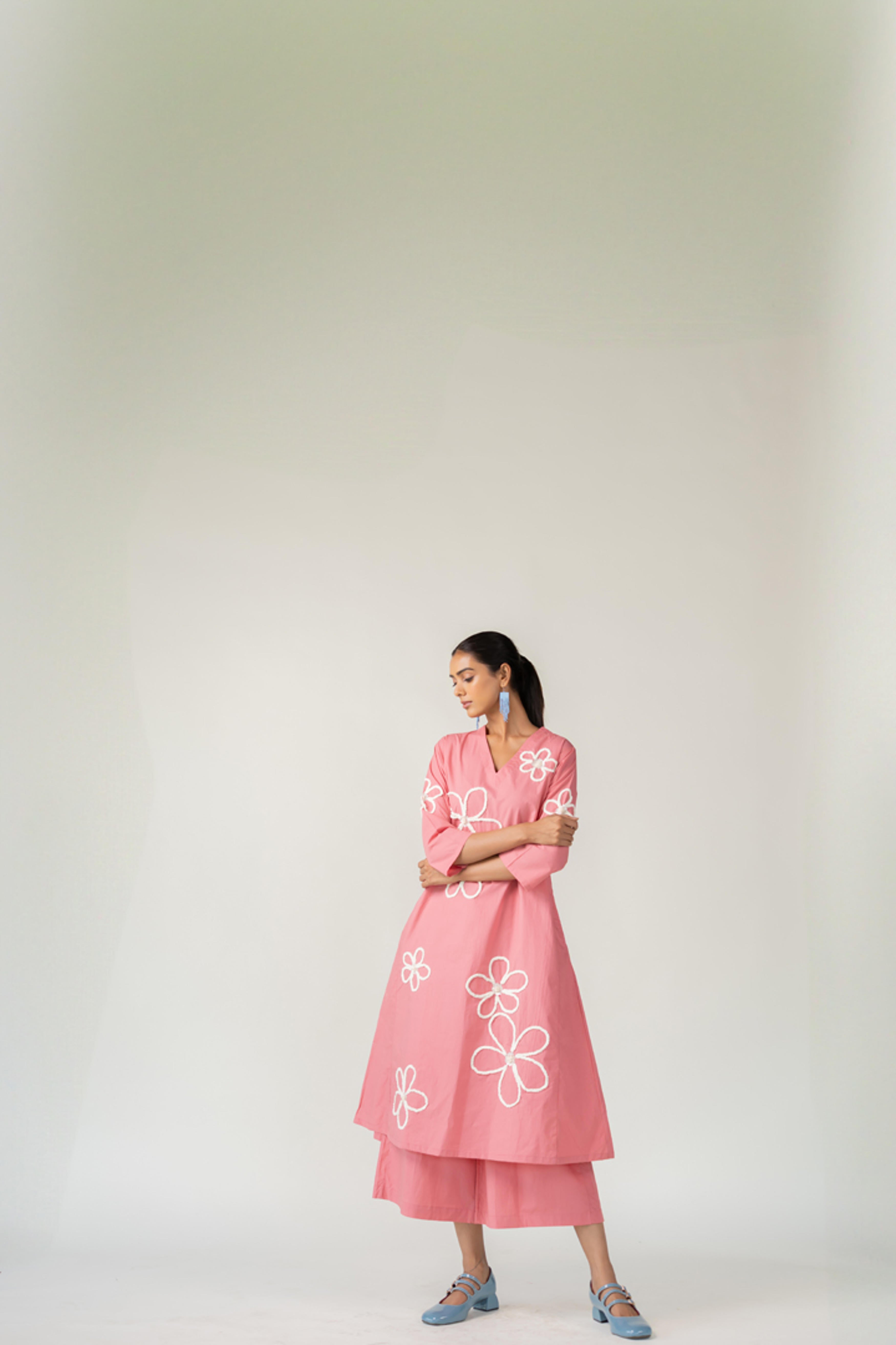 Bring a sense of whimsy and charm to your wardrobe with our Dusky Bloom Kurta Co-Ord. Crafted from breathable cotton poplin in a delightful blush pink tone, this relaxed-fit co-ord is adorned with oversized white embroidered daisies ? giving it a playful, retro-inspired feel. The tunic features a deep V neckline and pairs with roomy culottes for maximum comfort and movement. Length Kurta - 46" Pants - 36"