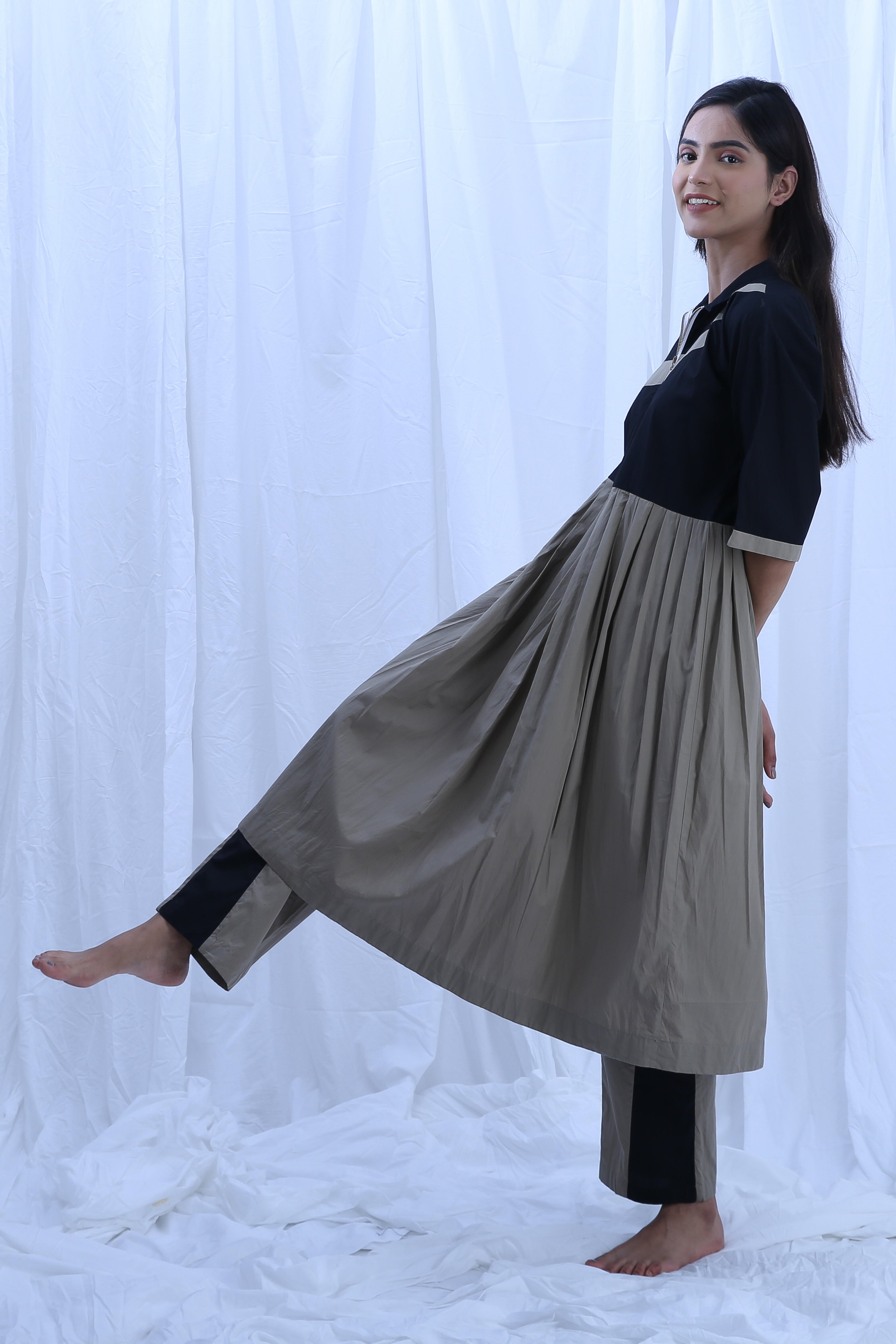 This chic Poplin Cotton set comes in Clary Sage with stylish Black patterns. The Dress Length is 44 inches and the Bottom Length is 38 inches, creating a flattering silhouette. Our model, who is 5'8" tall, is wearing a size S.